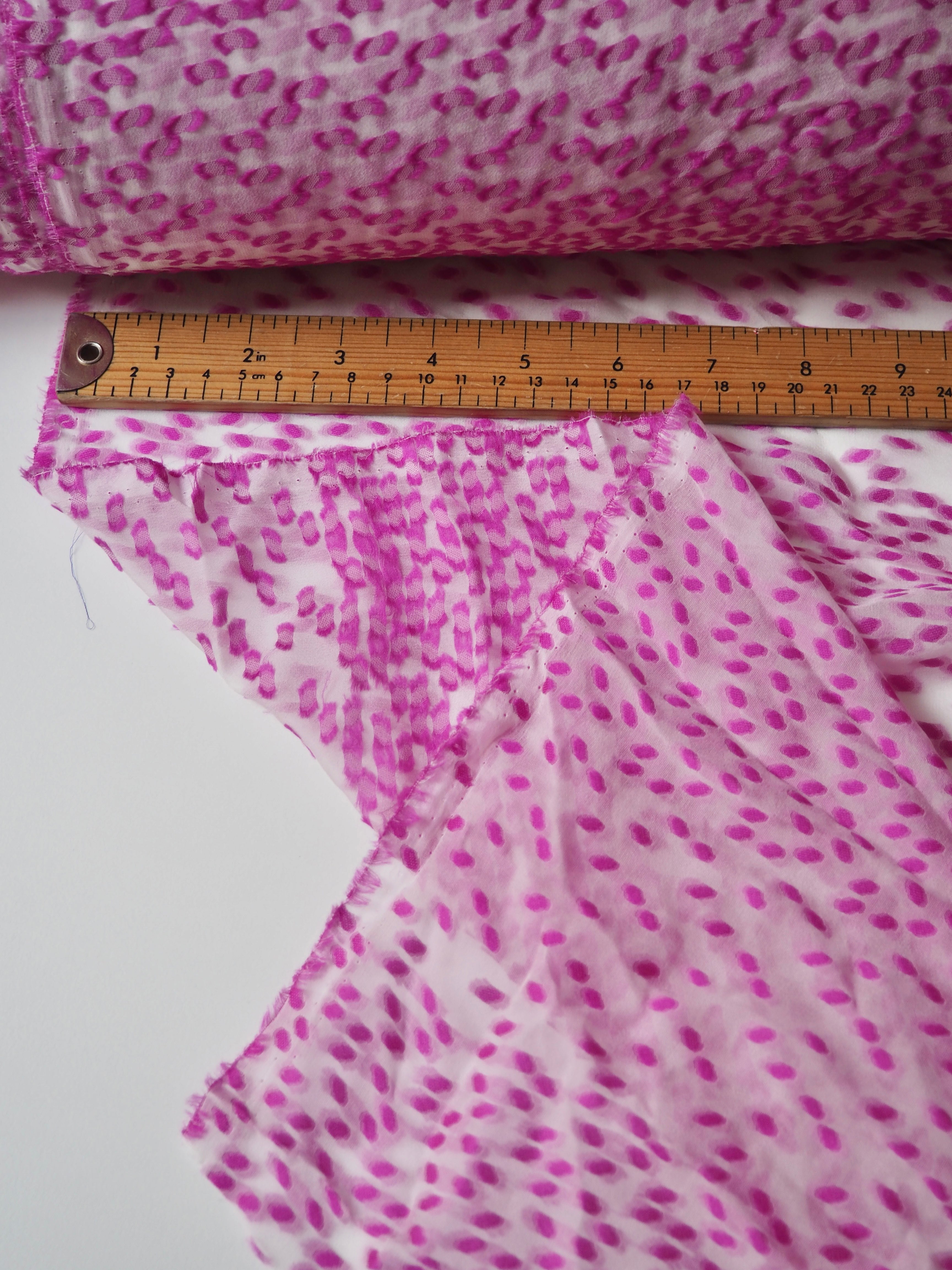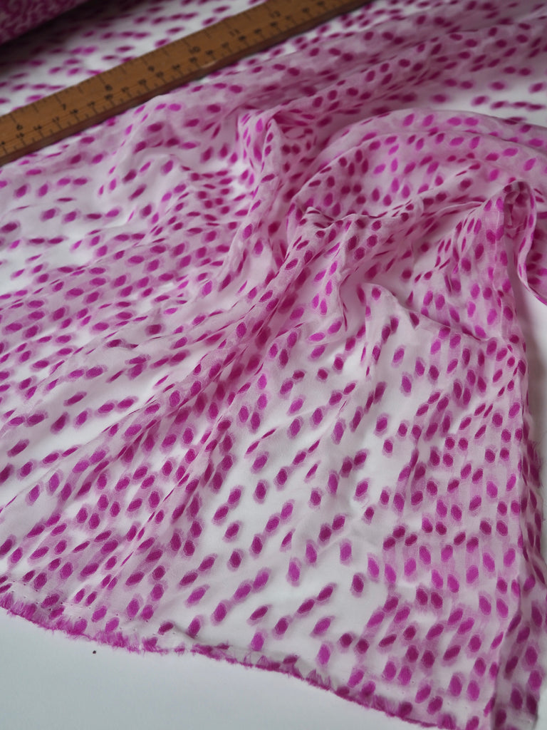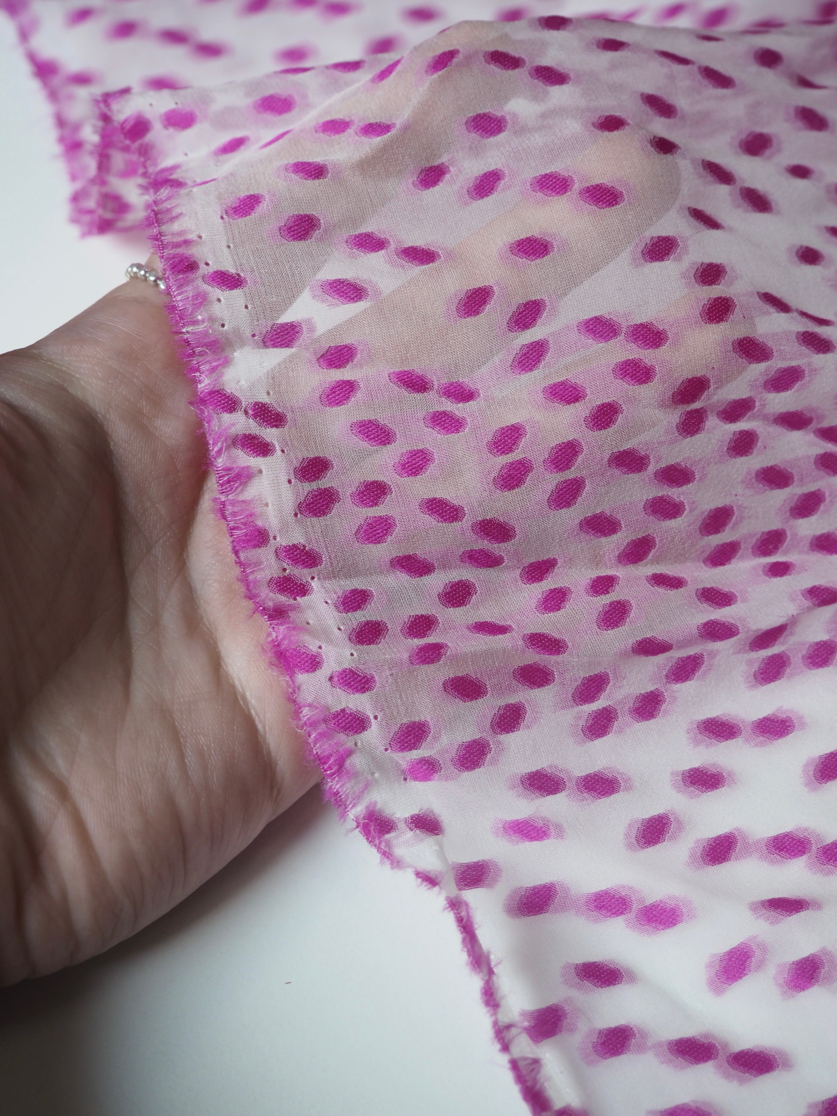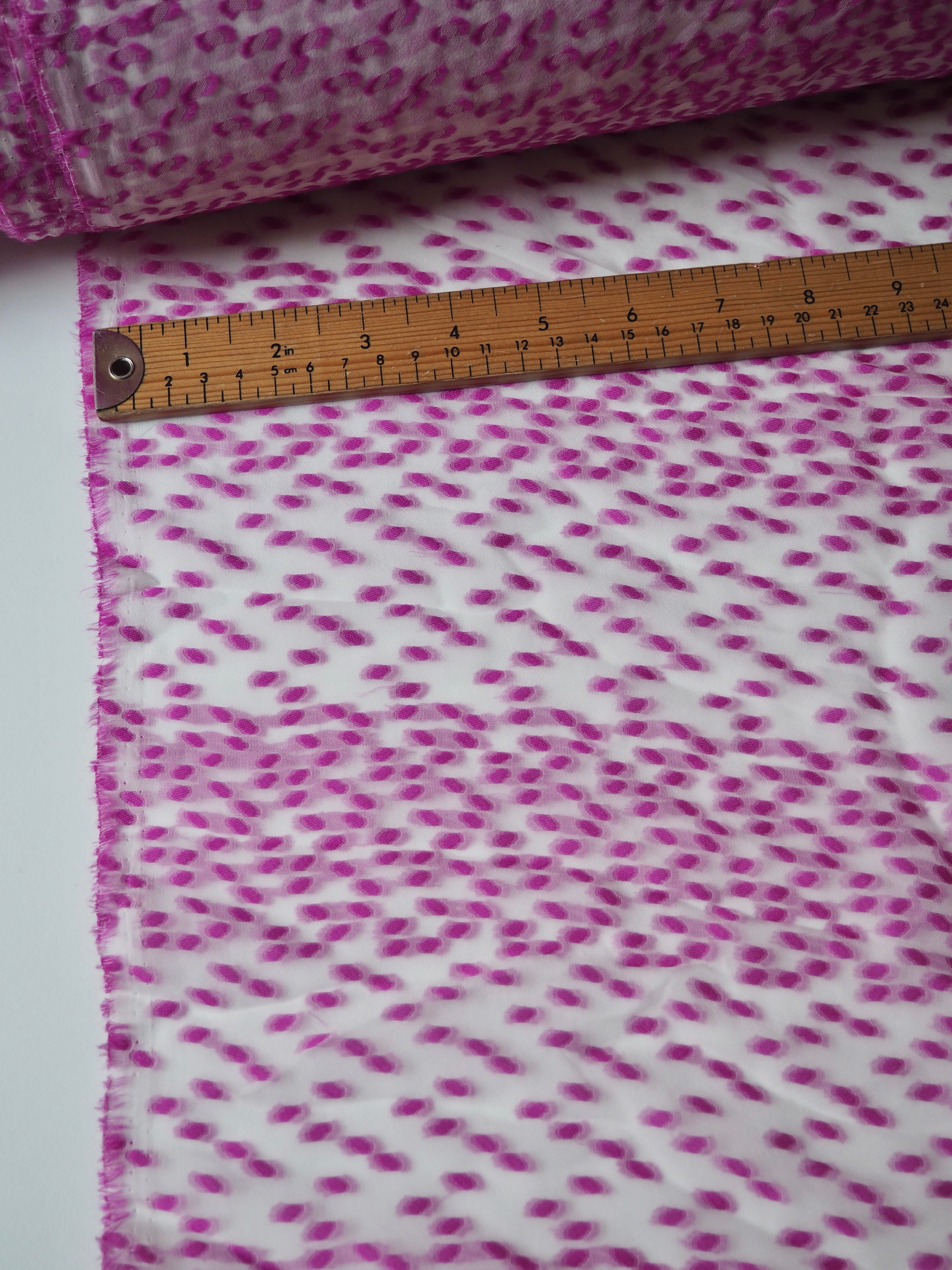 This ex-designer fabric is a beautiful chiffon. It's a jacquard, with a spotted weave that looks like falling snow. The main fabric is silk and the spots are viscose. Lightweight with a gorgeous airy drape. Has an incredible soft silk/viscose handle. Would look amazing as a blouse or as the overlay of a dress!