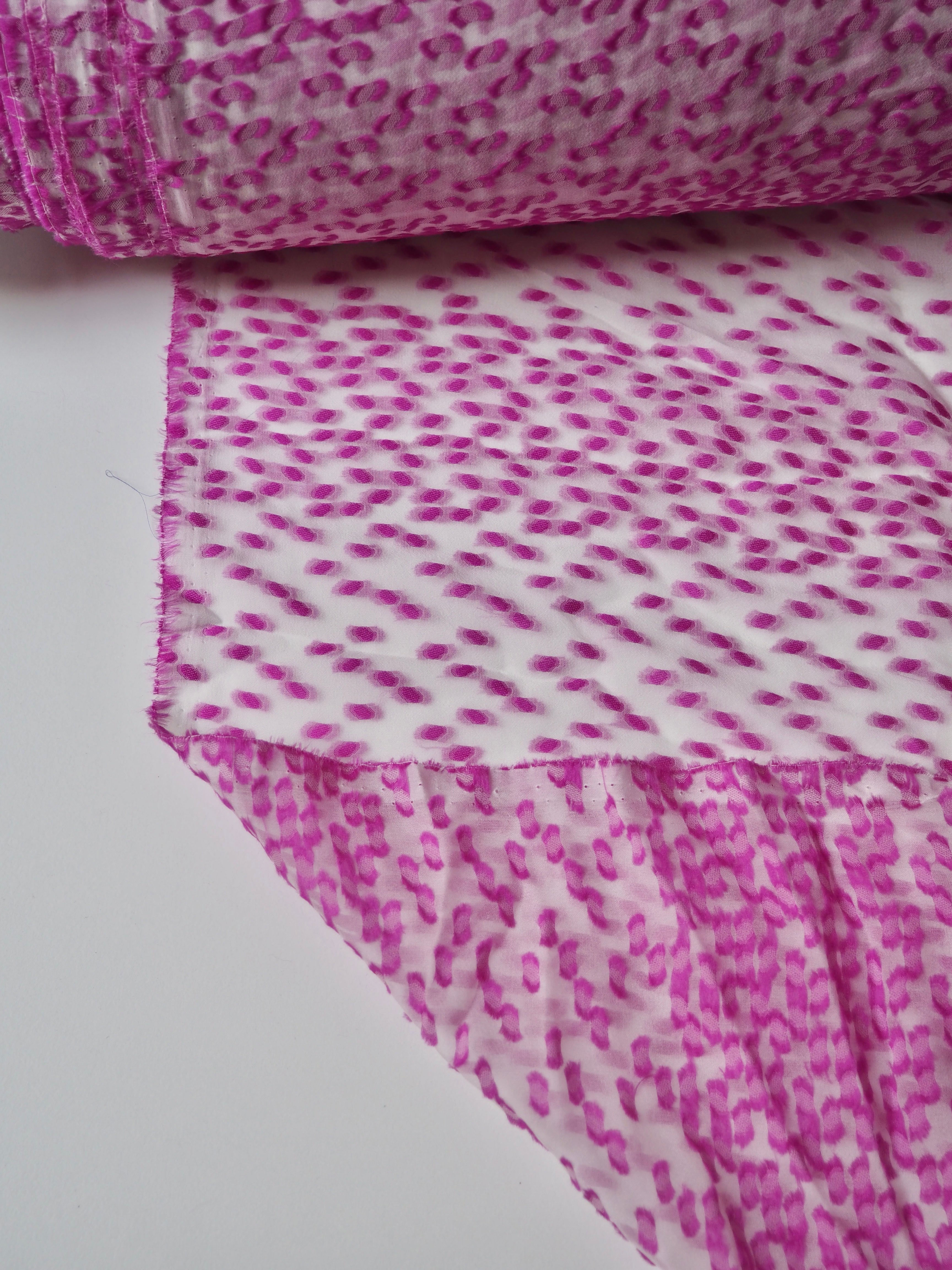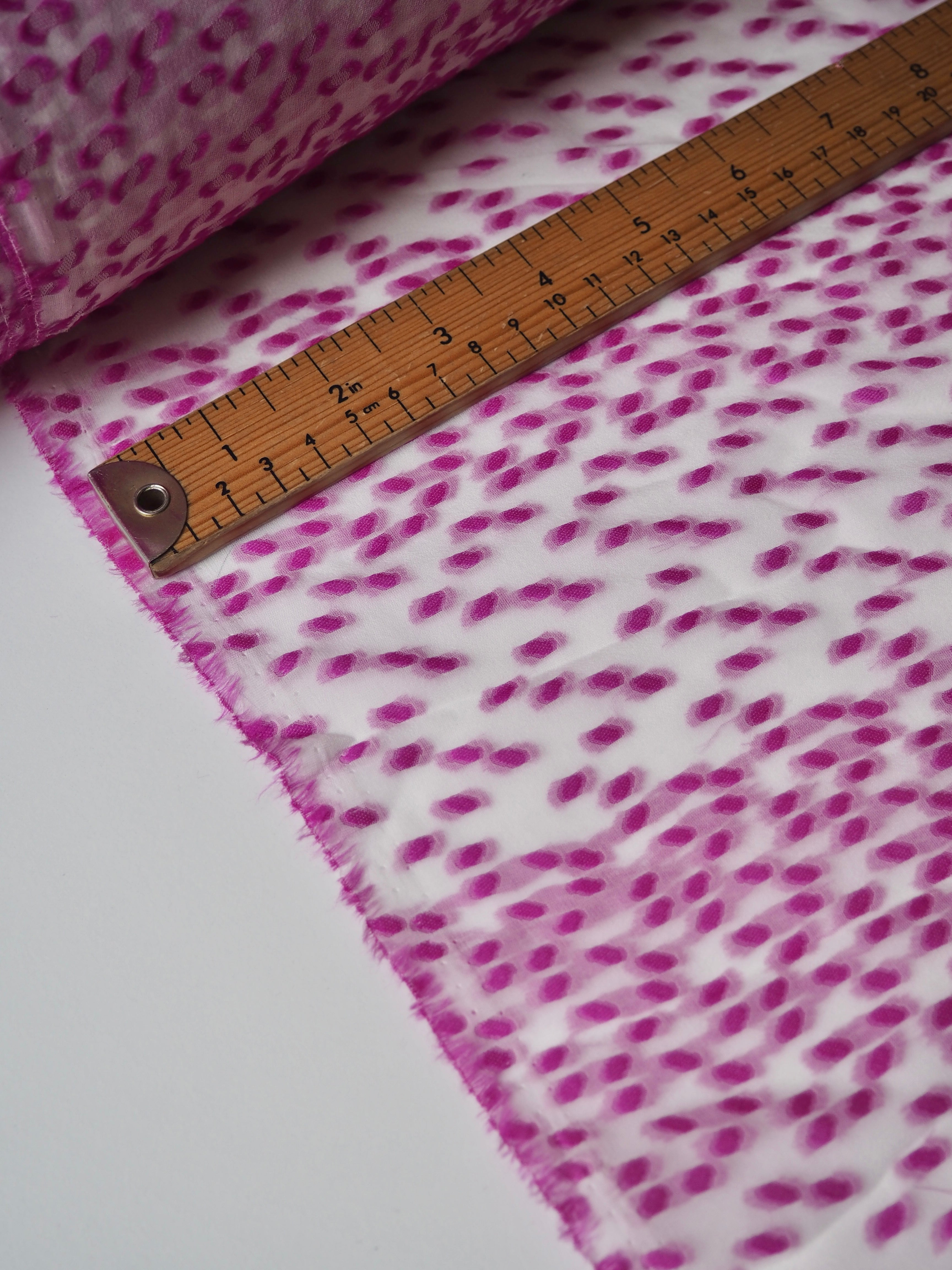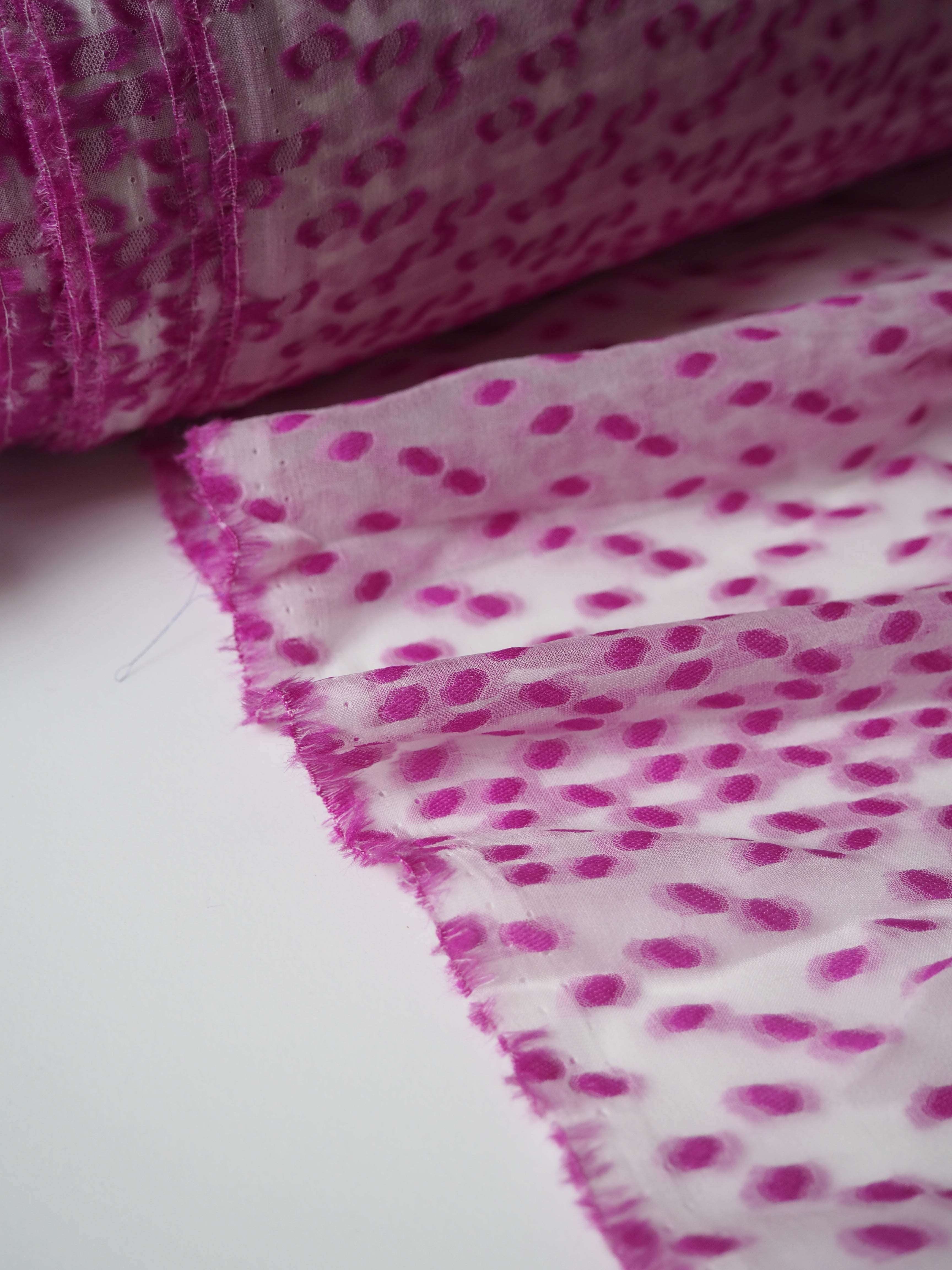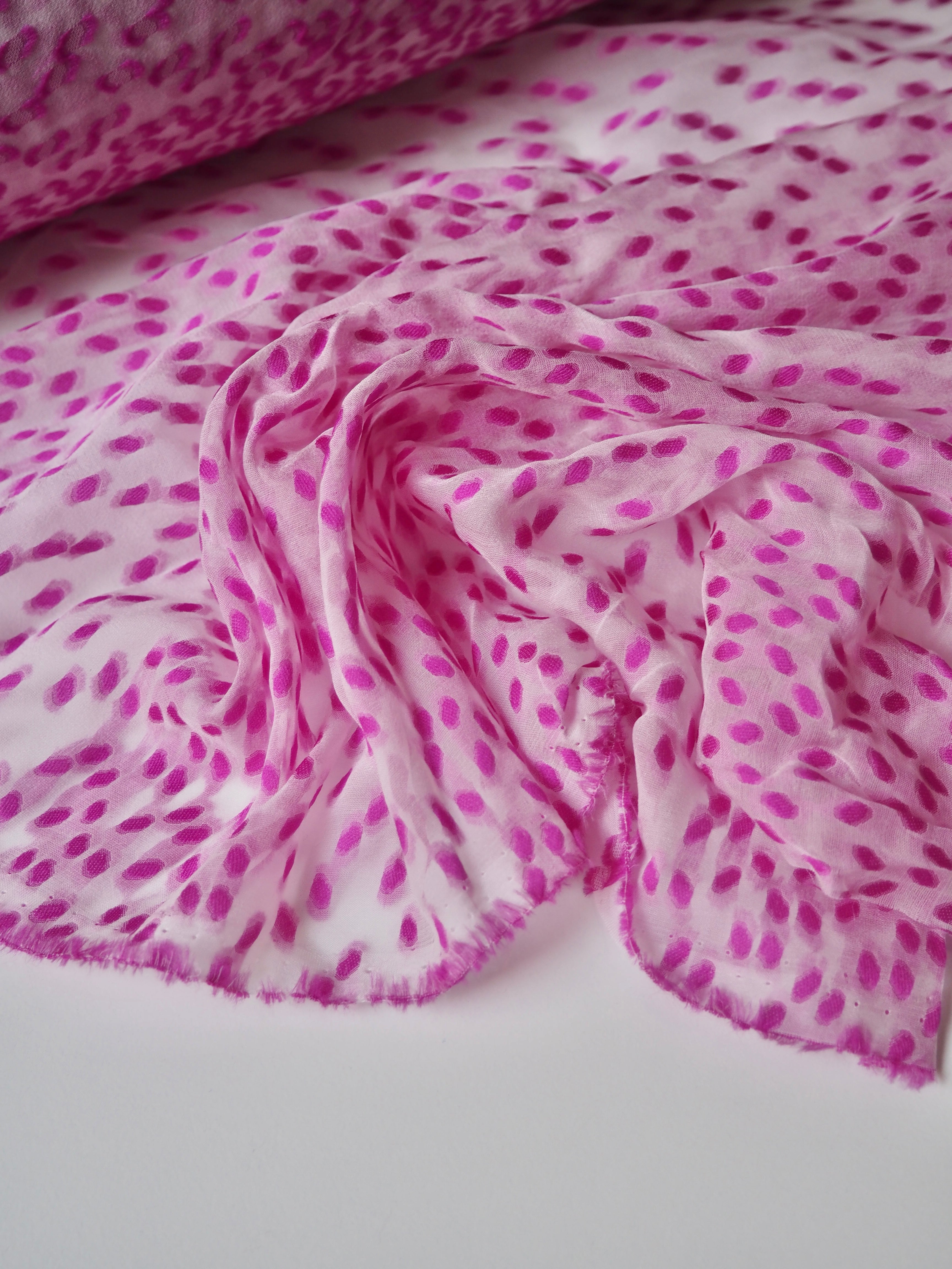 This ex-designer fabric is a beautiful chiffon. It's a jacquard, with a spotted weave that looks like falling snow. The main fabric is silk and the spots are viscose. Lightweight with a gorgeous airy drape. Has an incredible soft silk/viscose handle. Would look amazing as a blouse or as the overlay of a dress!