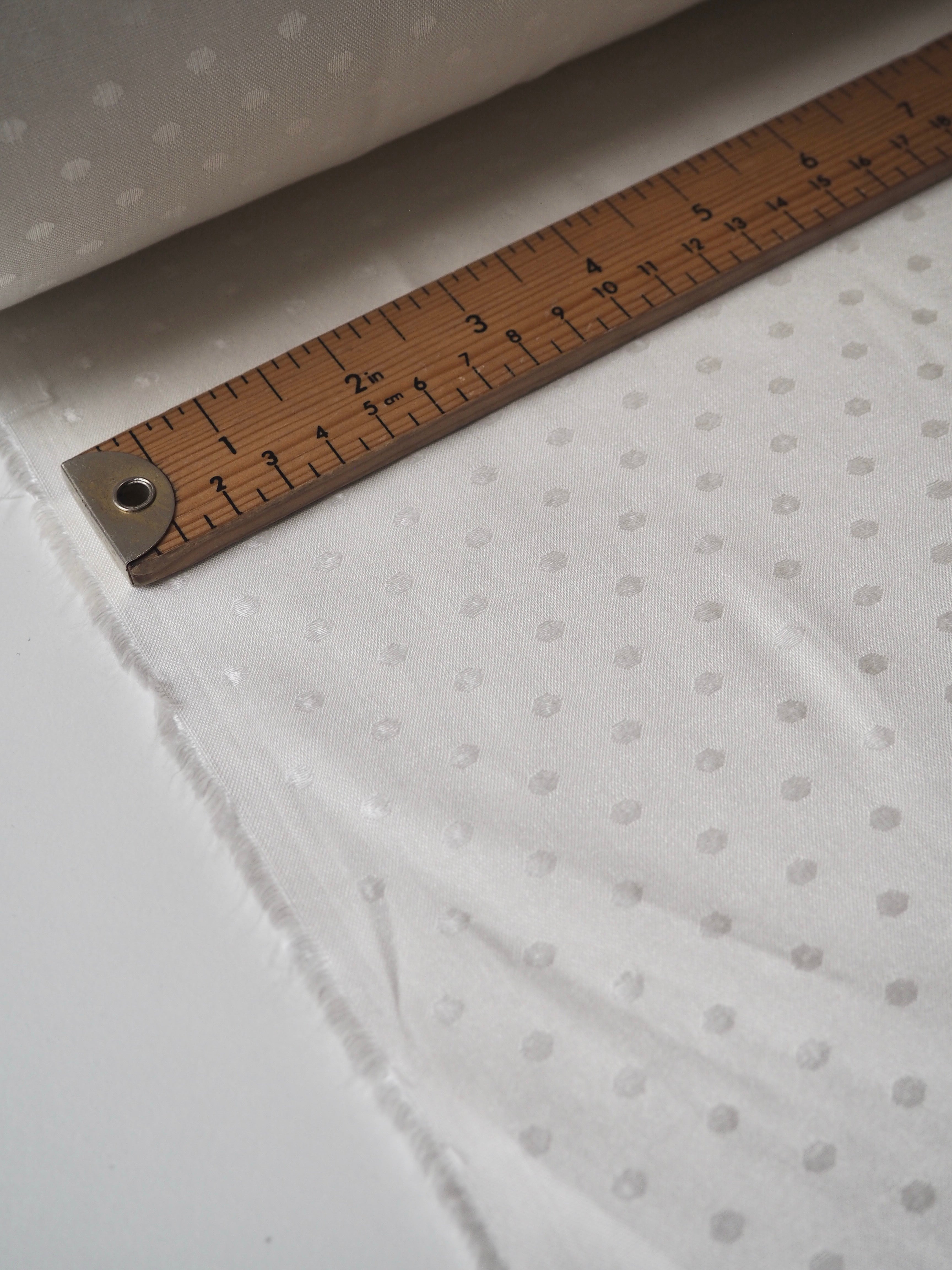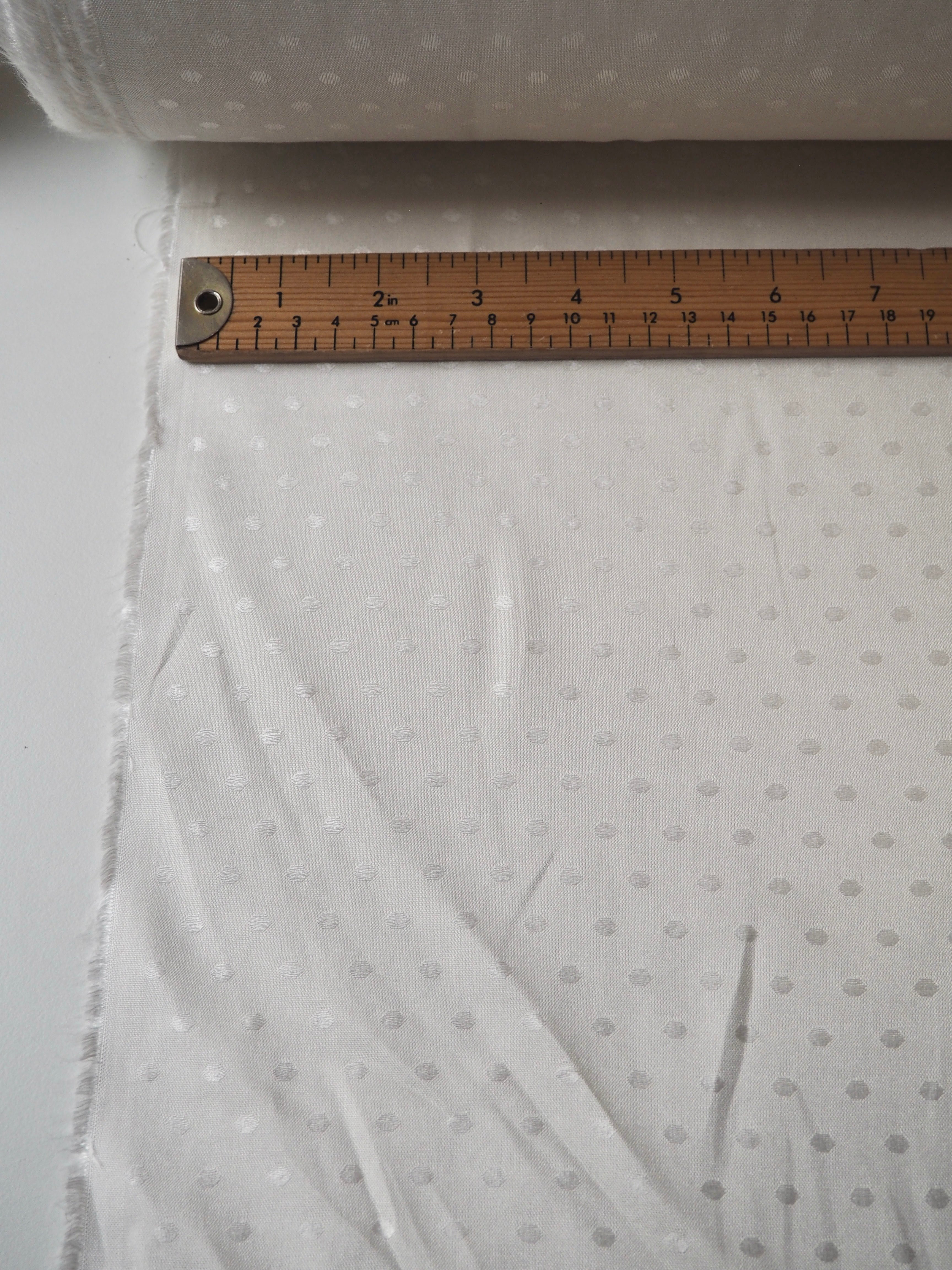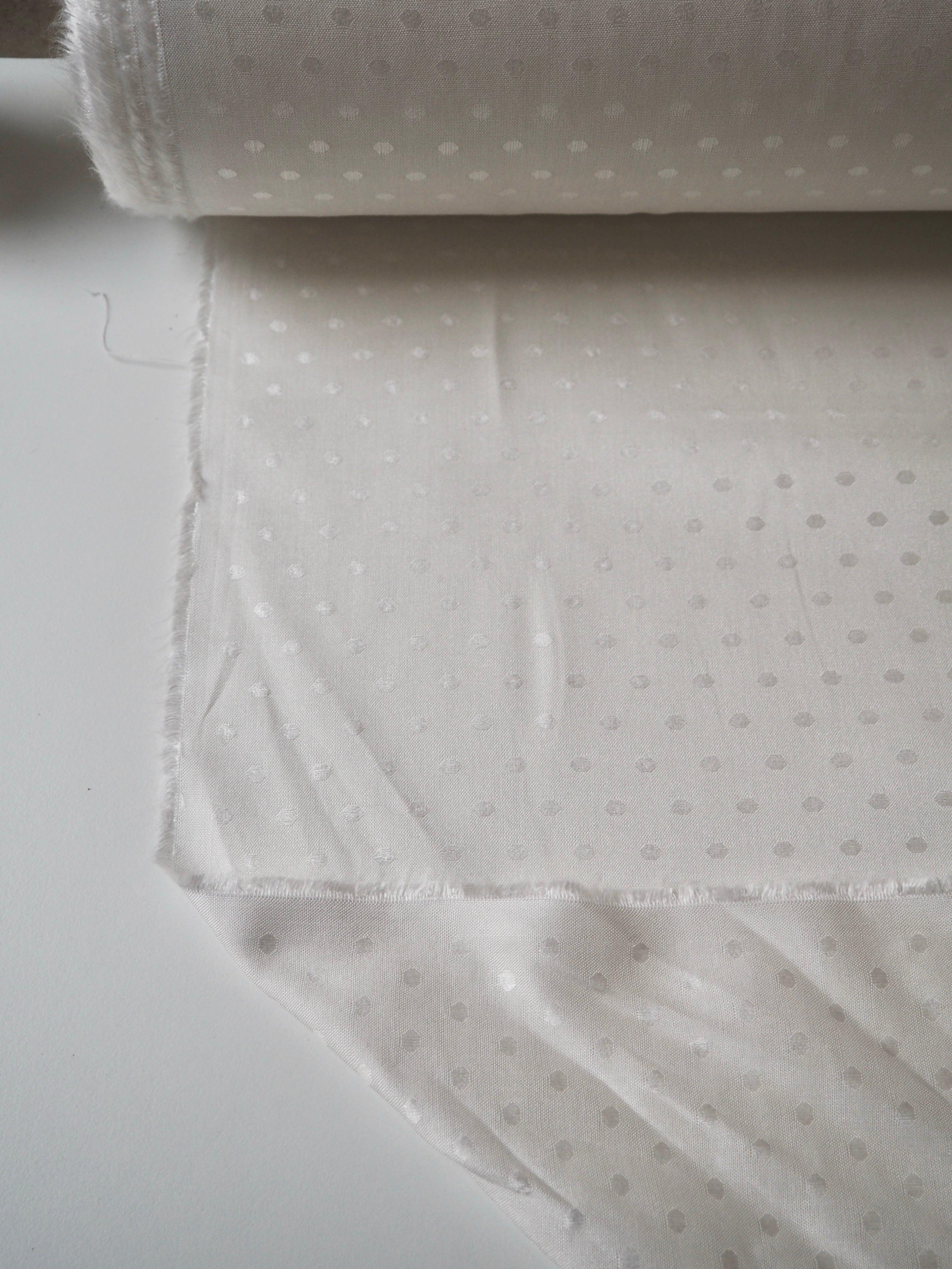 This ex-designer fabric is a viscose jacquard. It's in such a lovely whiter ivory shade, with a dotted pattern woven into the cloth. One side has a brighter satin finish, and the other has a slightly duller side that's just as beautiful. Has a fantastic soft handle. Lightweight with wonderful drape and incredible movement. Slightly sheer due to colour. Ideal for lining or making a garment both!