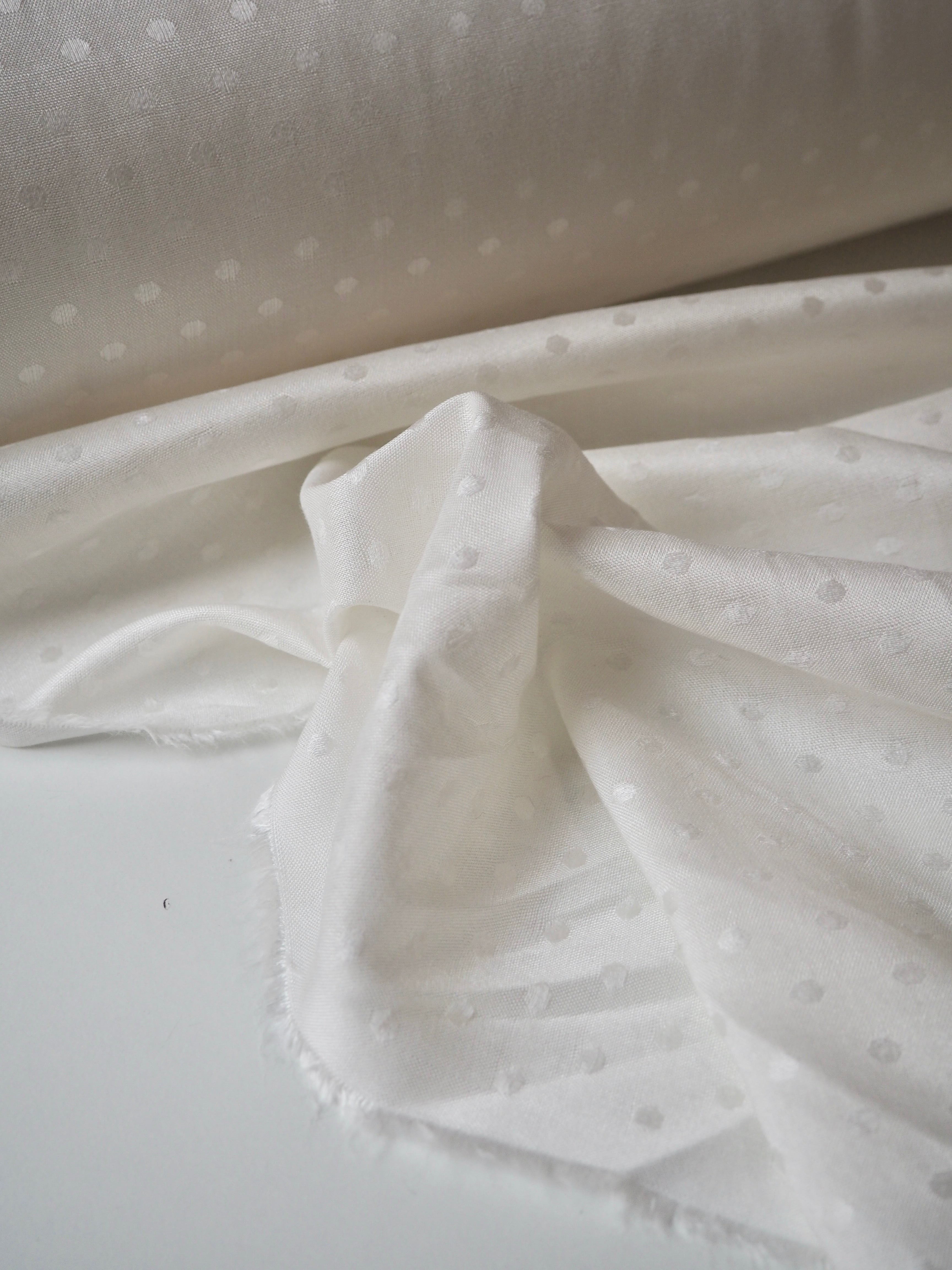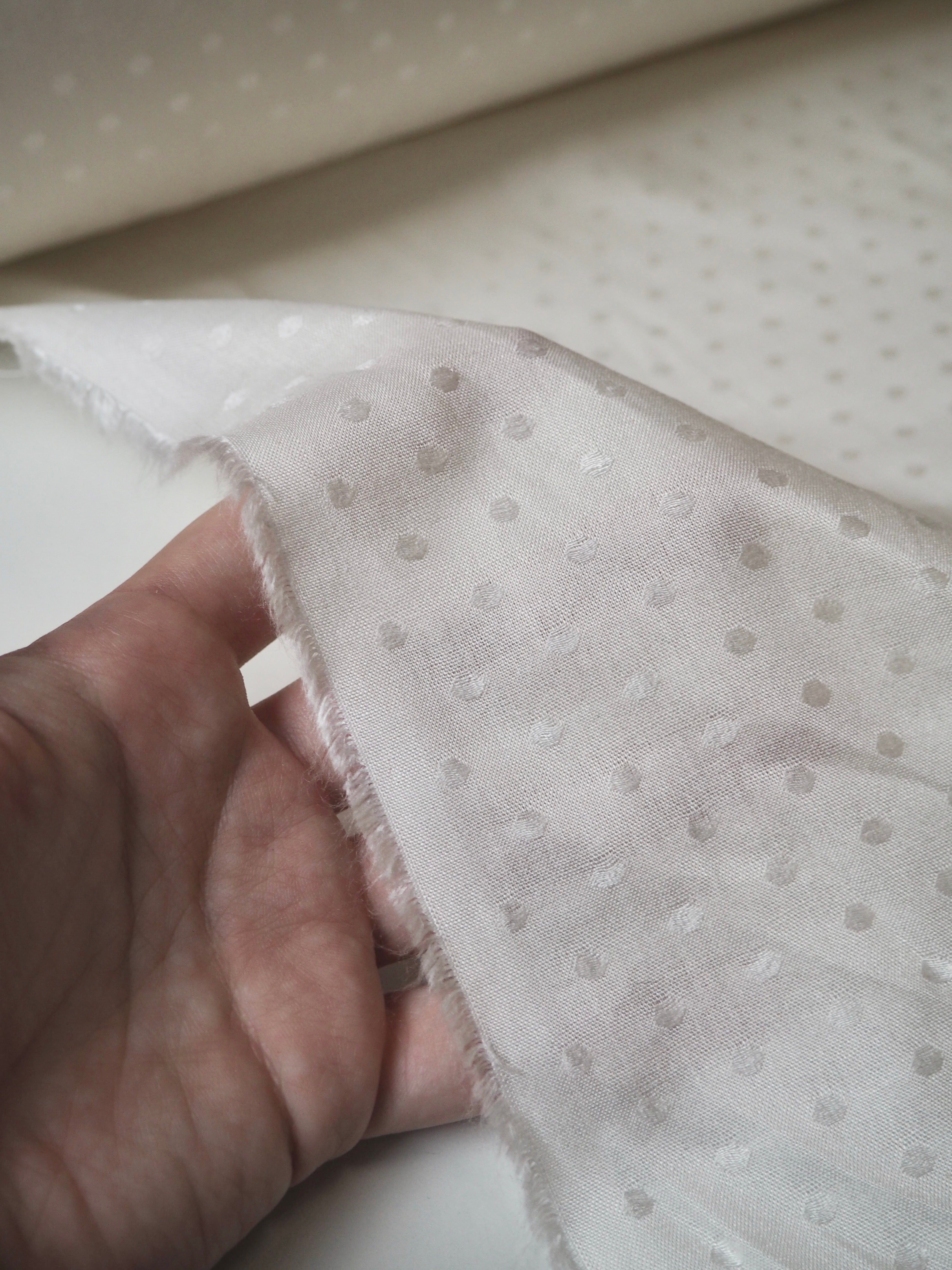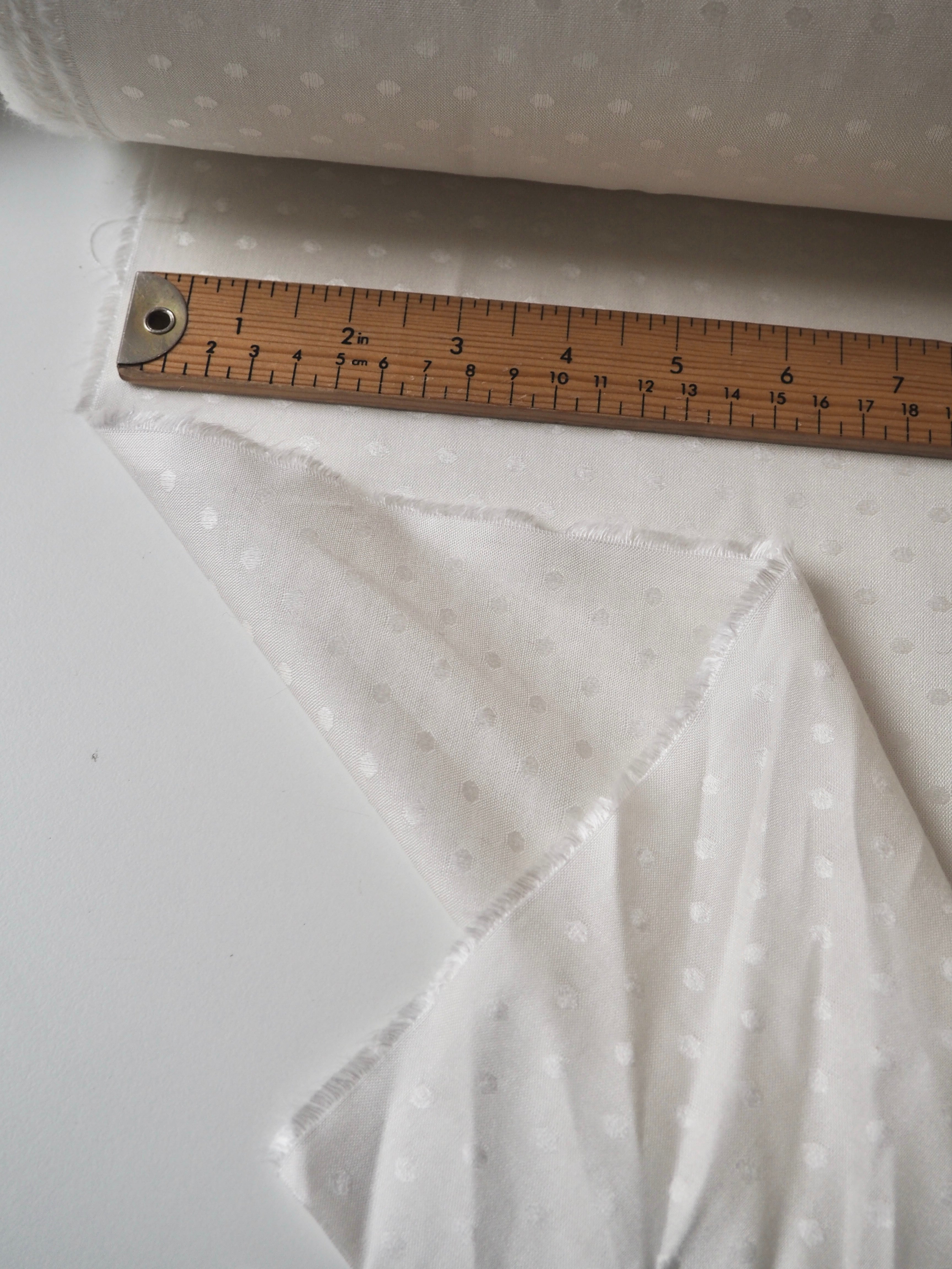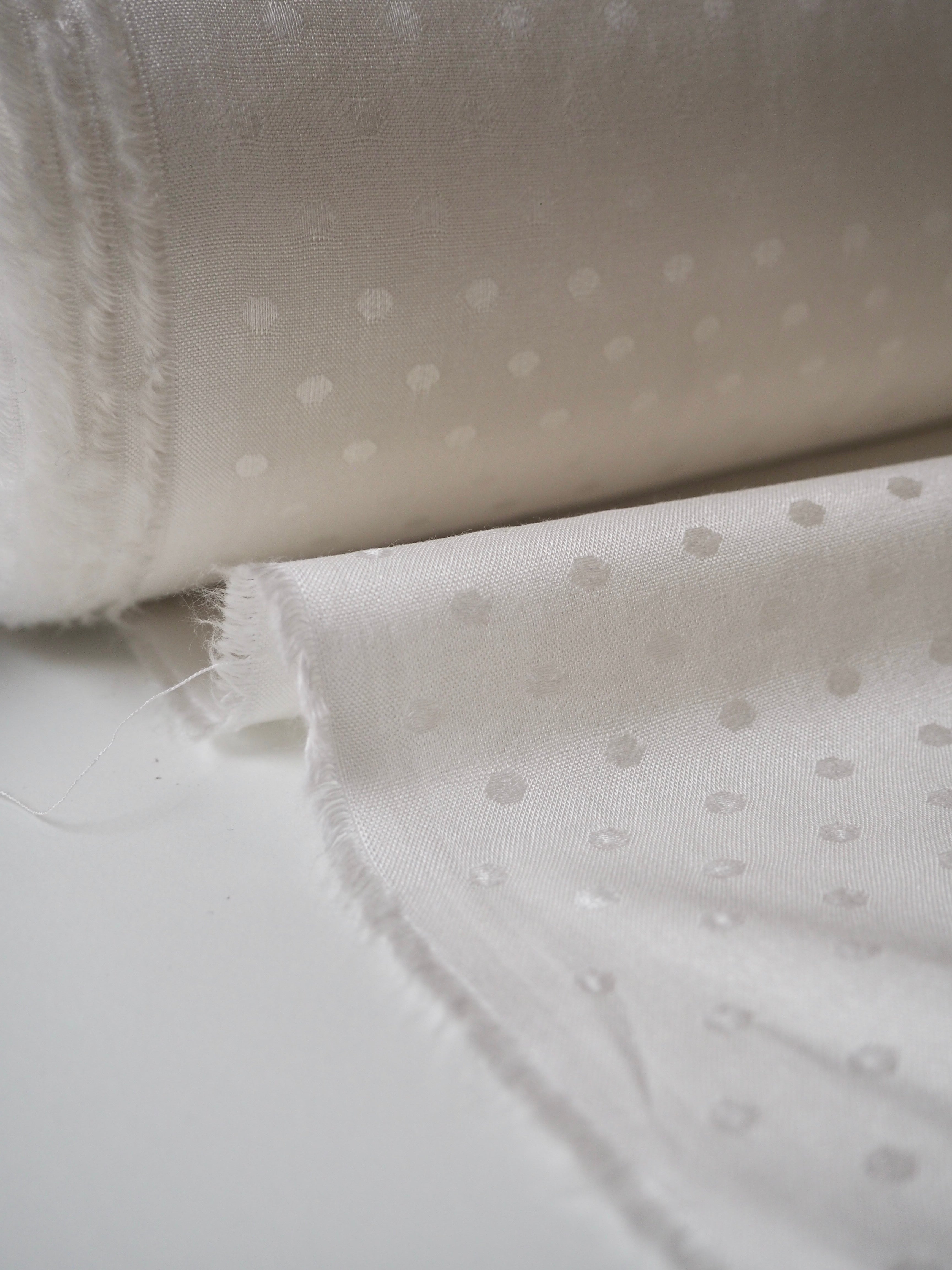 This ex-designer fabric is a viscose jacquard. It's in such a lovely whiter ivory shade, with a dotted pattern woven into the cloth. One side has a brighter satin finish, and the other has a slightly duller side that's just as beautiful. Has a fantastic soft handle. Lightweight with wonderful drape and incredible movement. Slightly sheer due to colour. Ideal for lining or making a garment both!