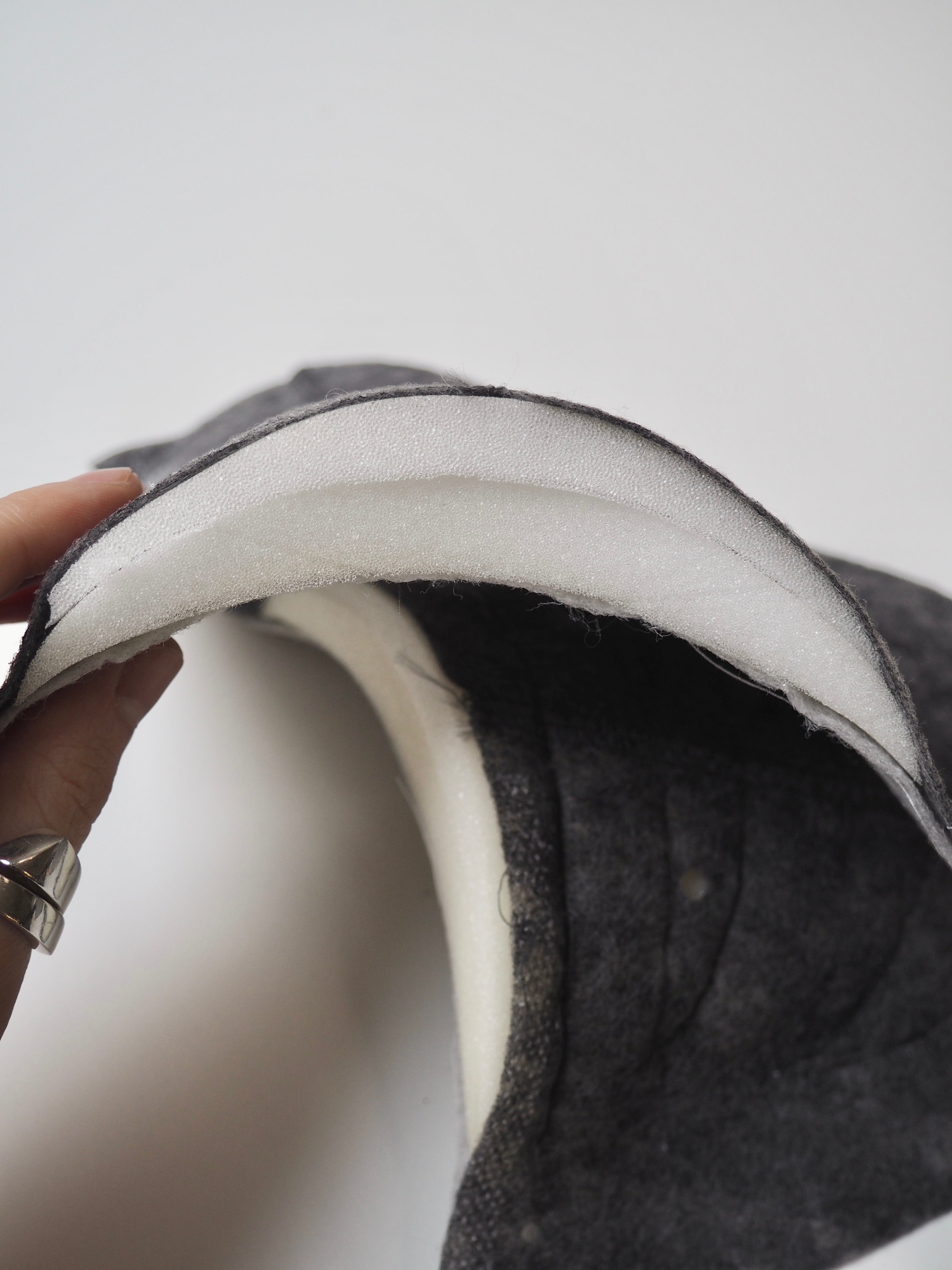 This ex-designer trim is a pair of shoulder pads. They are a great thickness, made up of a two layers of felt around two layers of foam in the centre. The layers have been basted together to easily take out the padding, to accommodate the thickness you would like. They are an elongated triangular shape which could also be adjusted for the desired fit and effect. Versatile for an 80's power shoulder jacket, down to a staple winter coat!