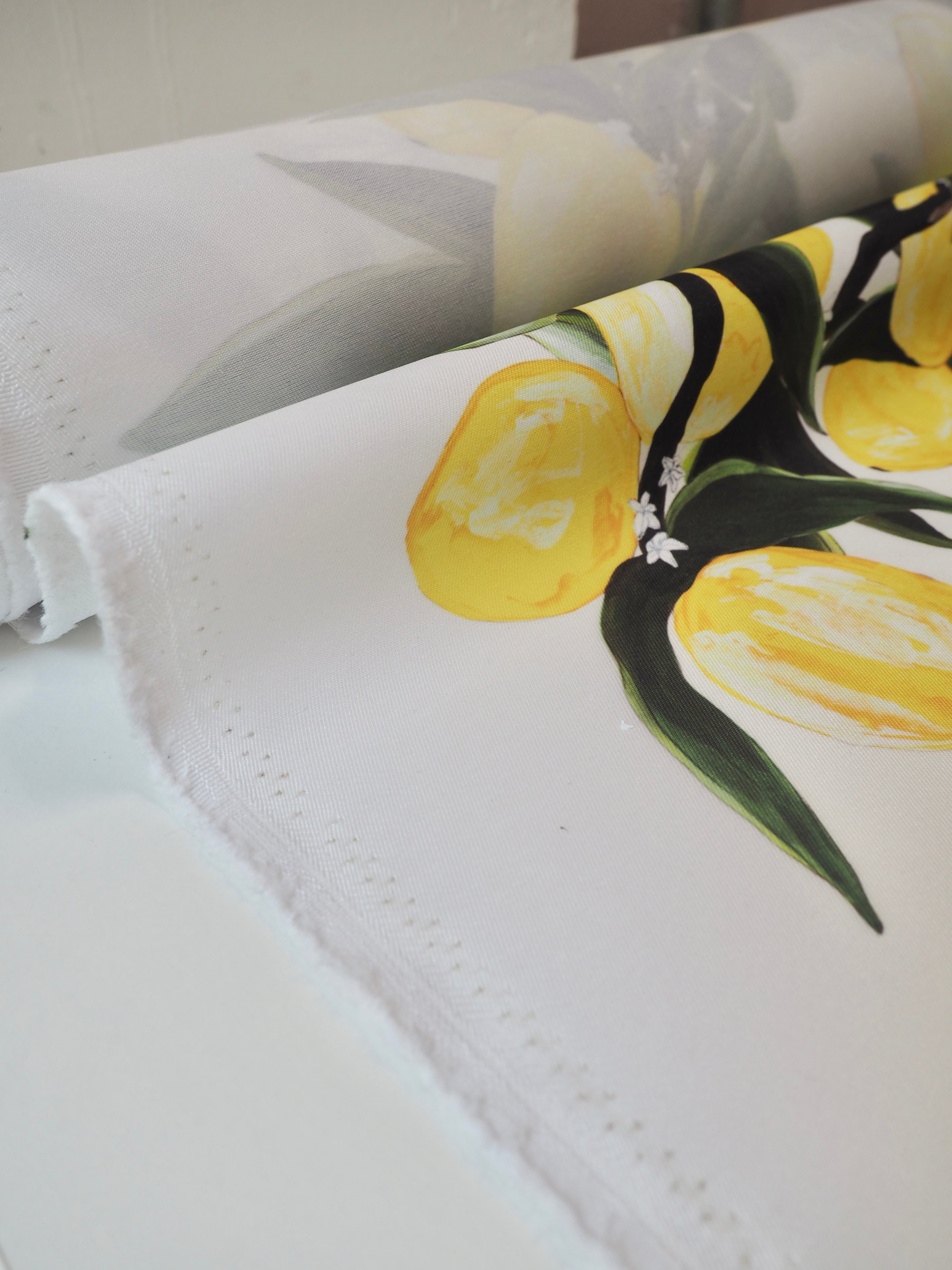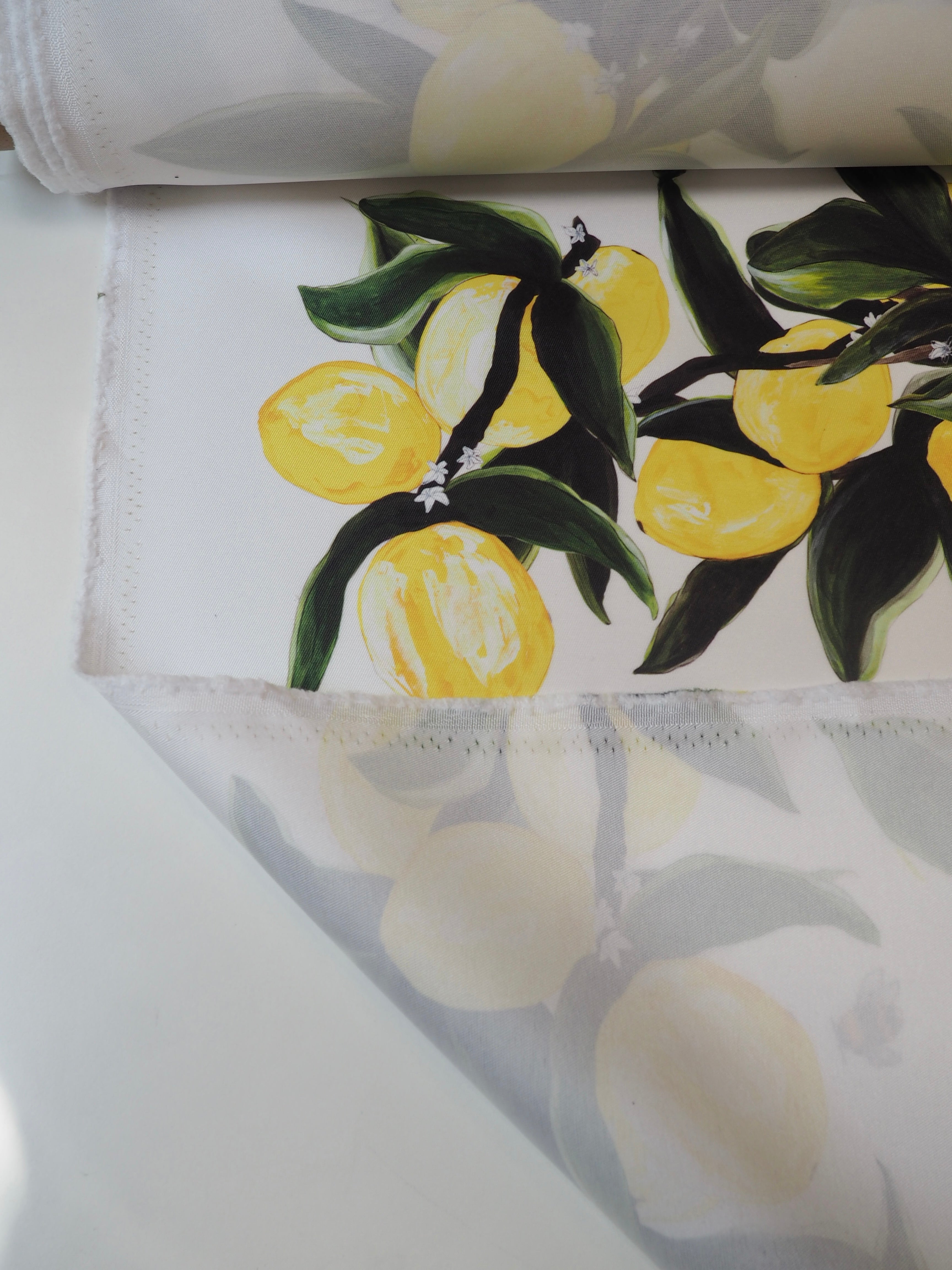 This ex-designer fabric is a satin twill. It's a bespoke print from a designer, printed with lemons that give us Mediterranean summer! It's a structured weave, with lovely colouring. It's fully opaque, with a smooth satin finish. Light to medium weight. Versatile for so many projects!