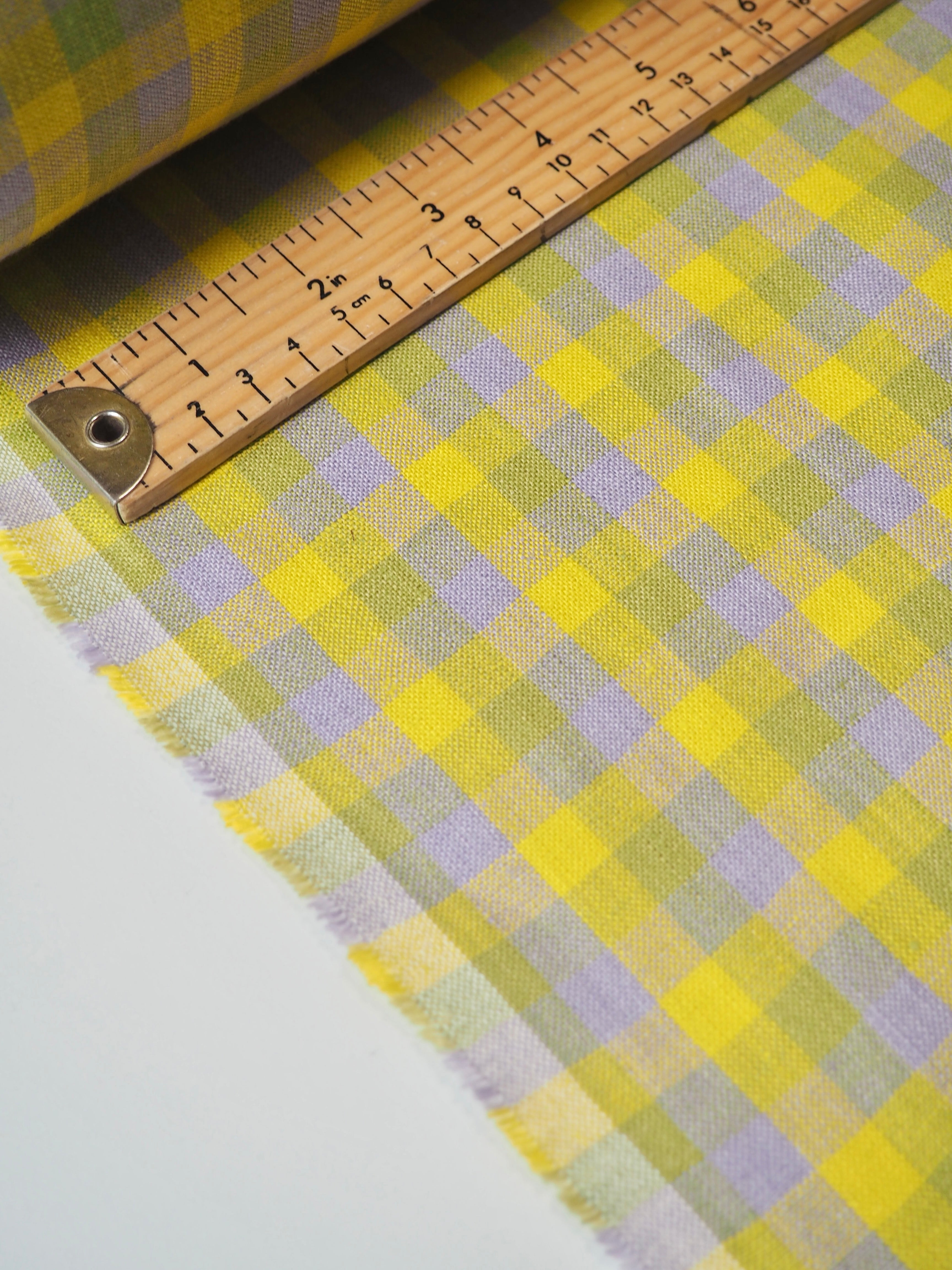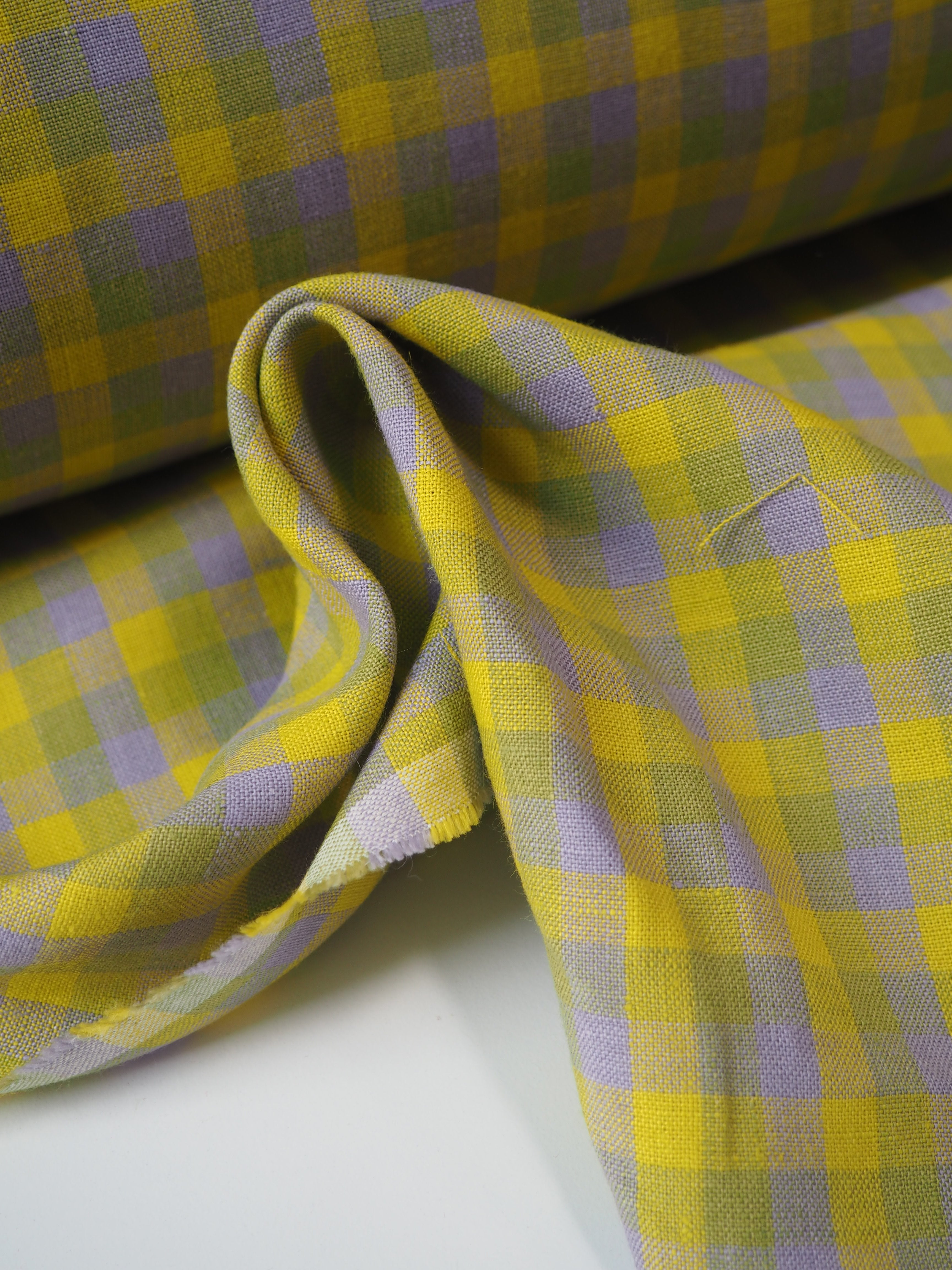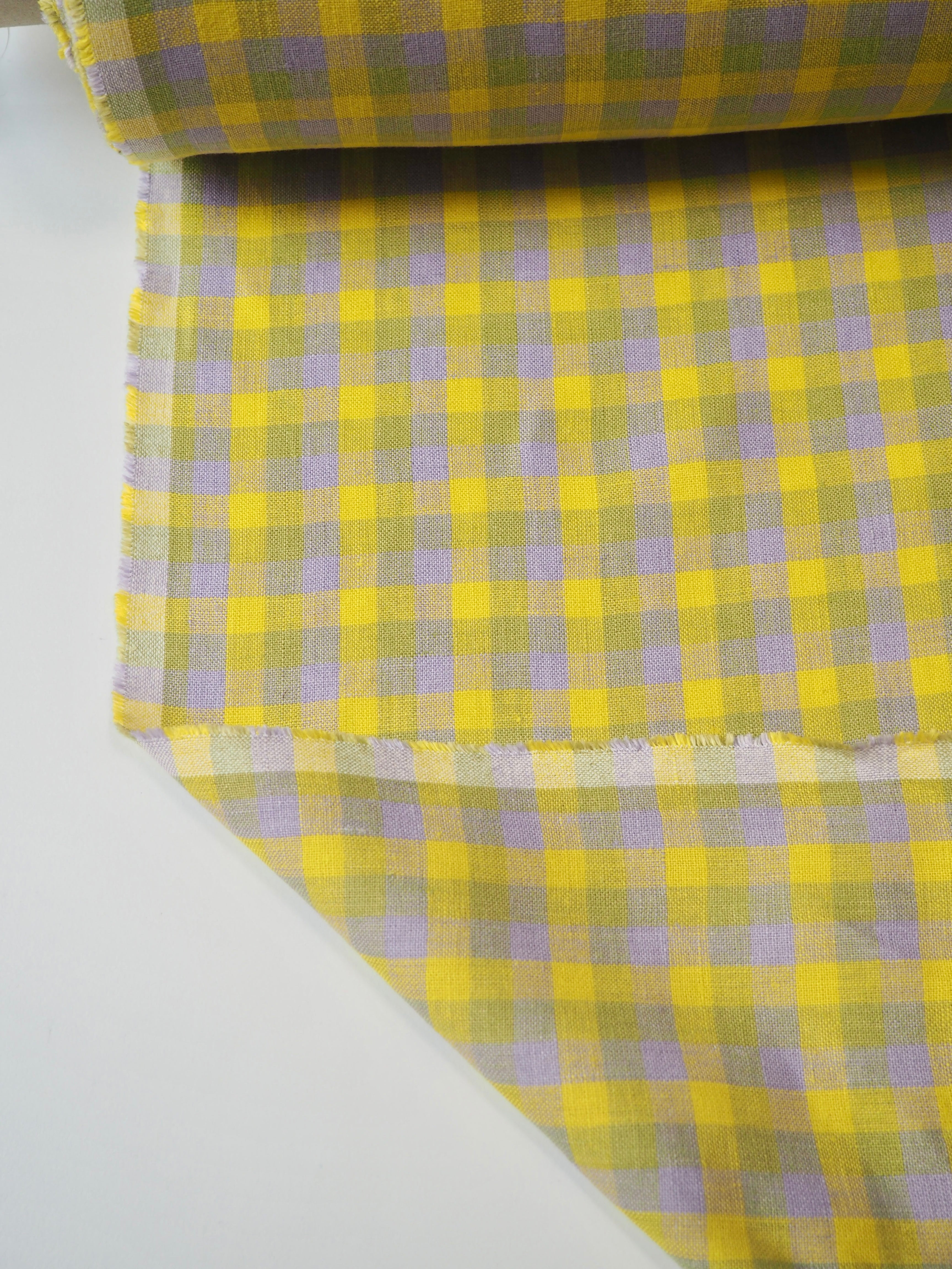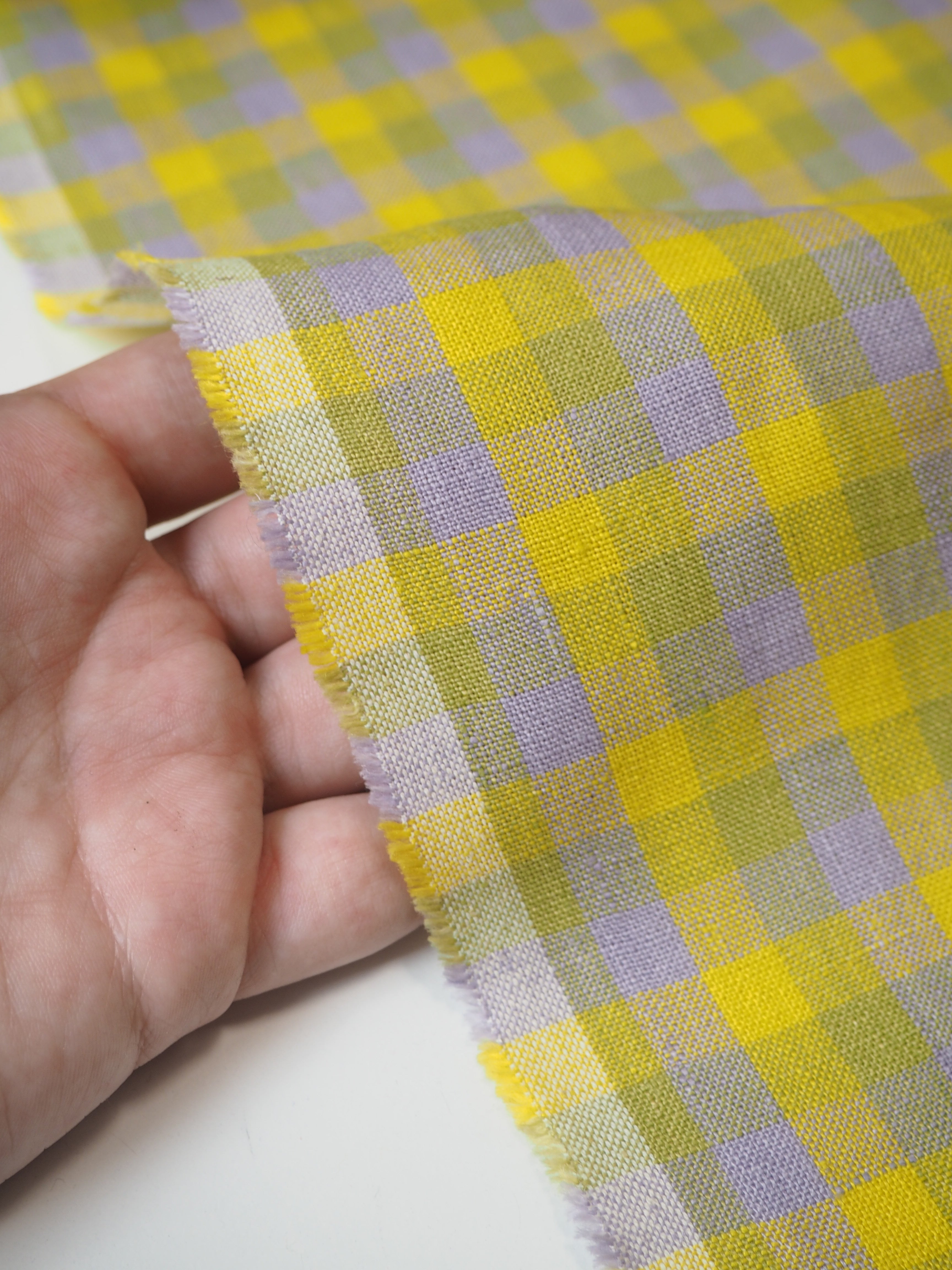 This ex-designer fabric is a zesty linen. It's a soft lemon yellow, medium light green, and light lilac purple gingham check. It's from a London-based brand called Beyond Nine. Checks are 1cm. It has a soft and gentle linen weave with a typical linen texture, and a brilliant handle that's so wearable. Lightweight with a gentle structured drape, and fully opaque. Lovely for a bias dress or skirt, summer tops or Everyday Trousers, (or even a co-ord!), or a tablecloth and napkin set! We can't wait to see what you make!