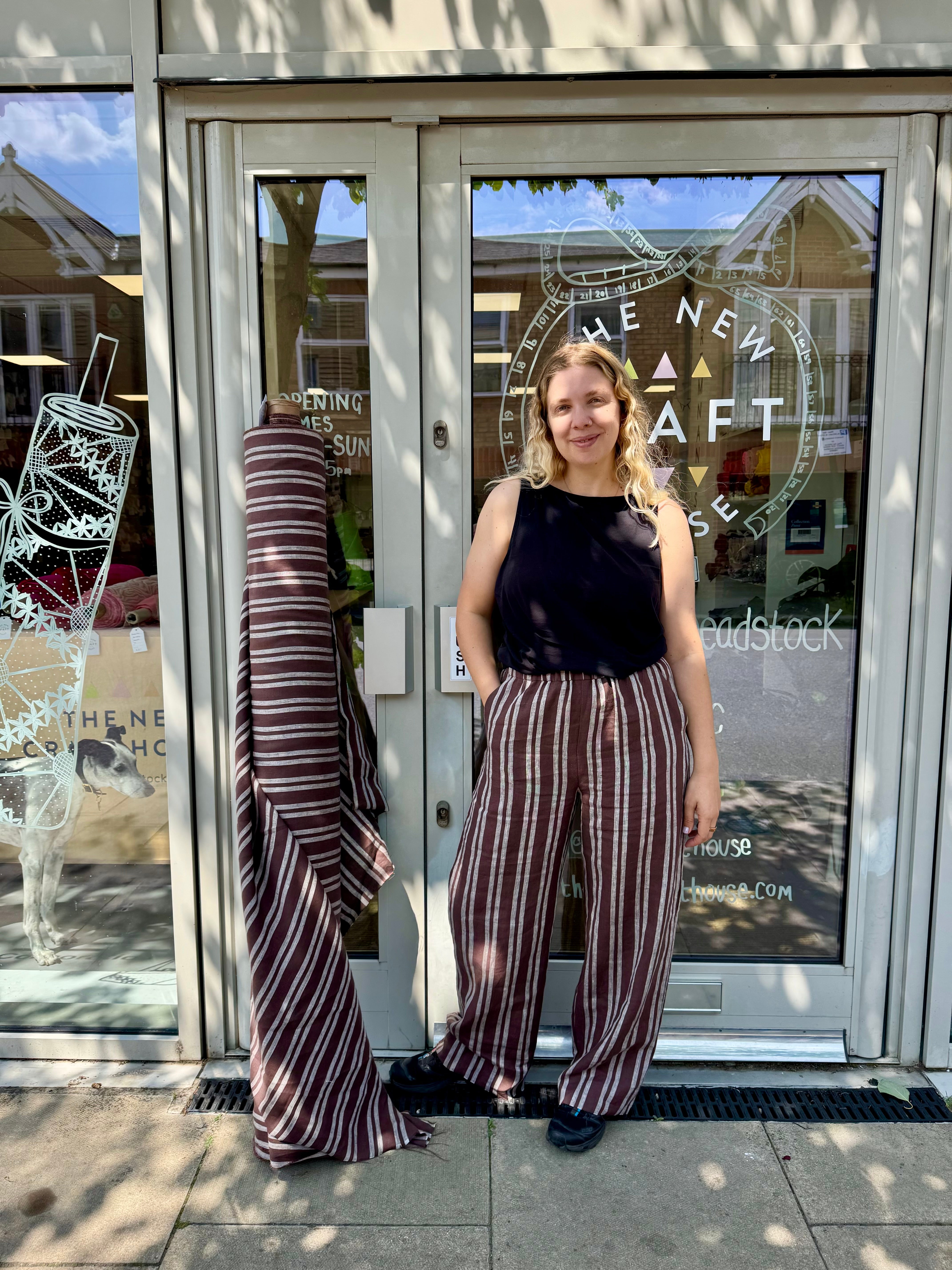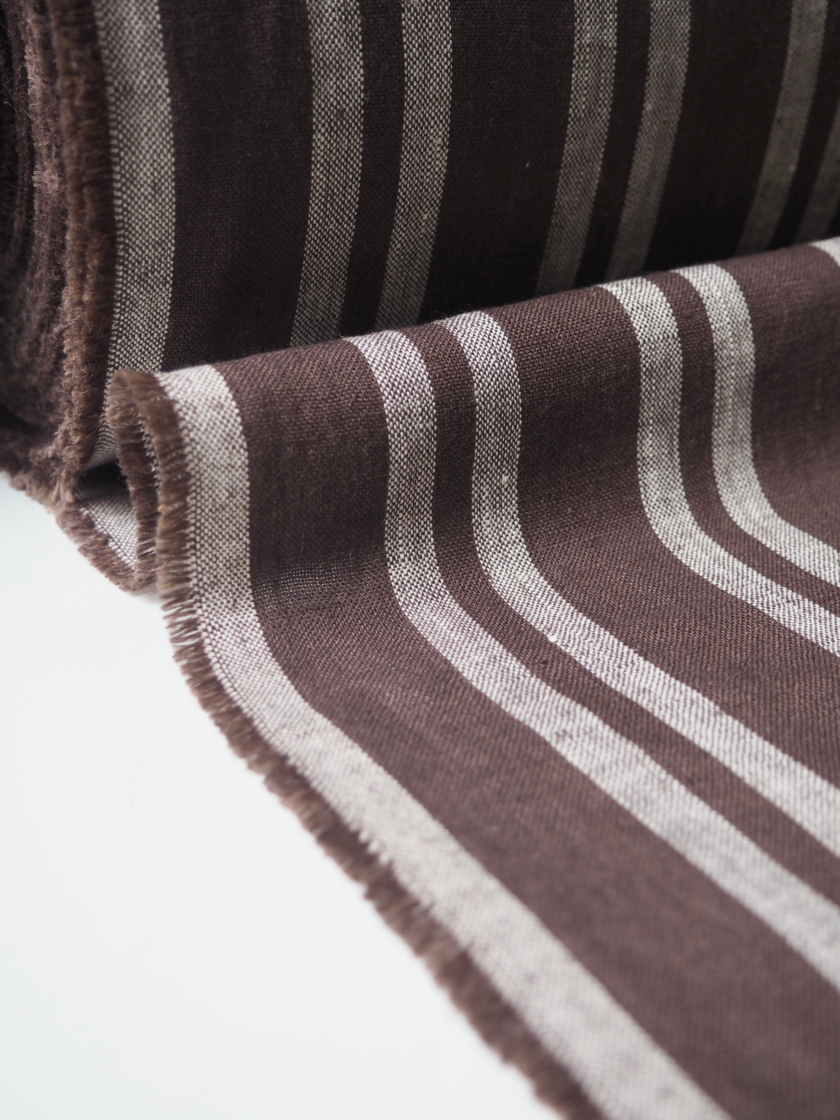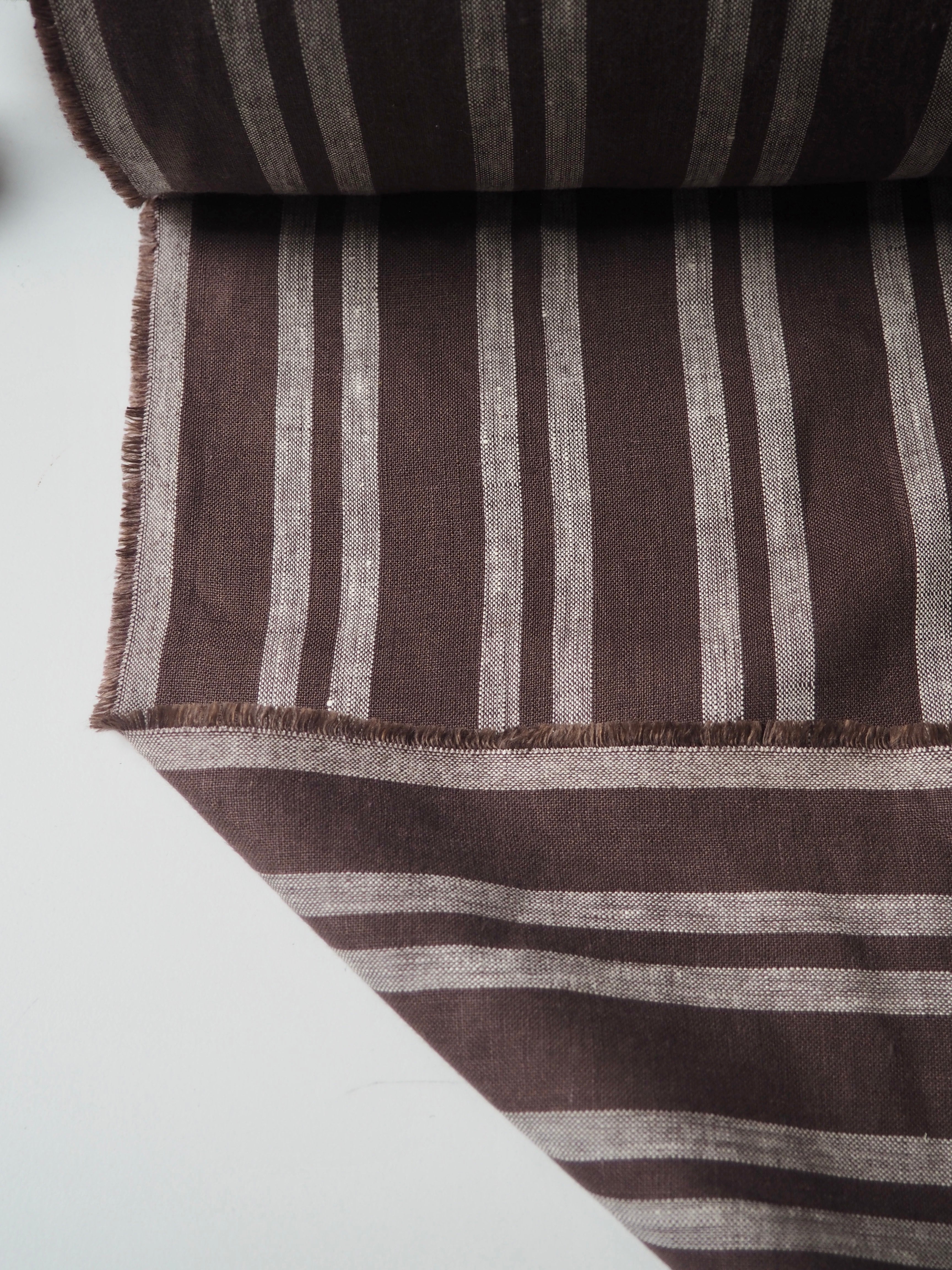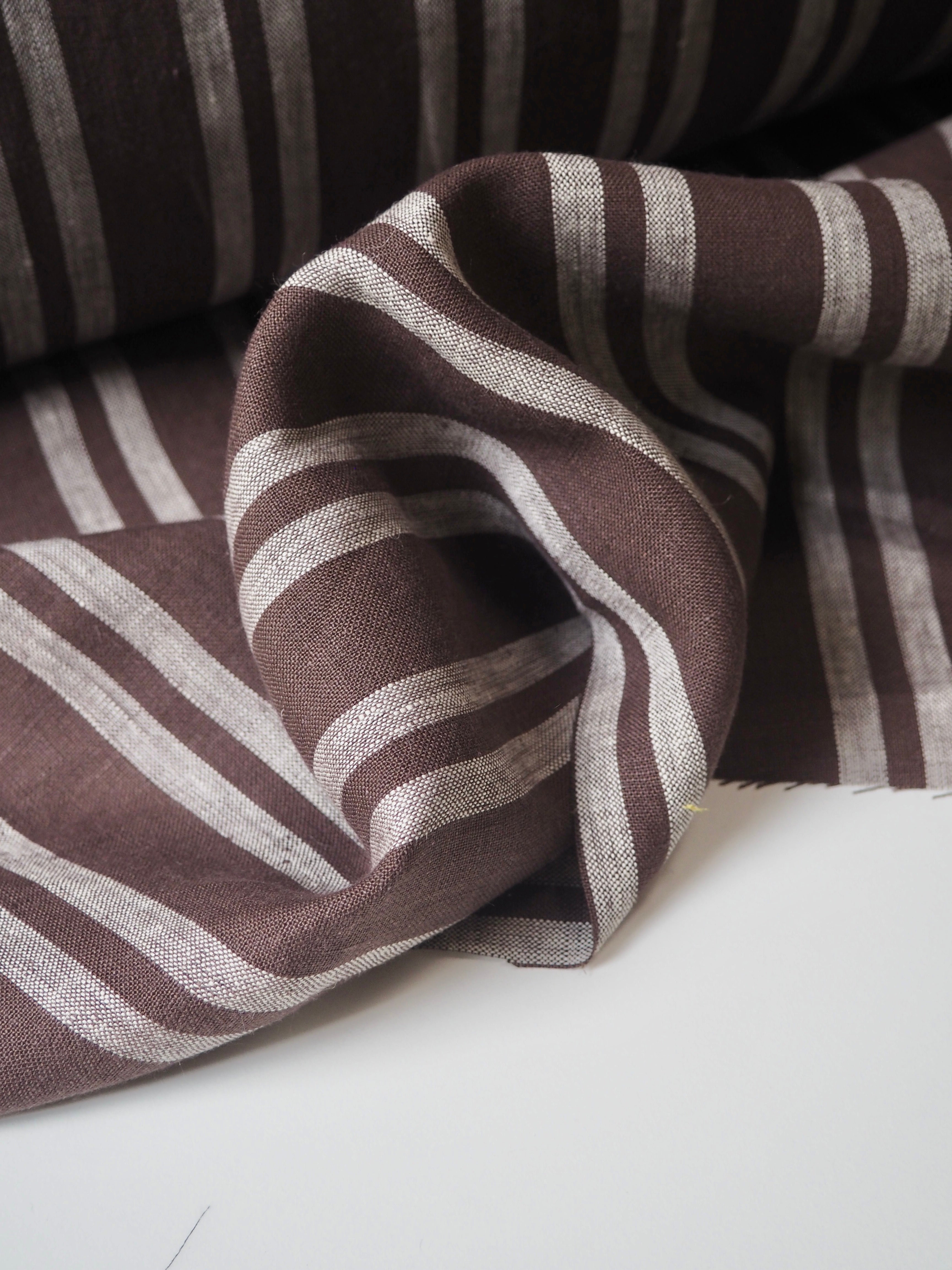 This ex-designer fabric is a beautiful linen. It's a brown and slightly off-white stripe. It has a soft and gentle linen weave with a typical linen texture. It has a brilliant handle that's so wearable. Lightweight with a gentle structured drape, and fully opaque. From popular London-based brand Beyond Nine. Lovely for a bias dress of skirt, summer tops or Everyday Trousers, or even a tablecloth and napkin set!
