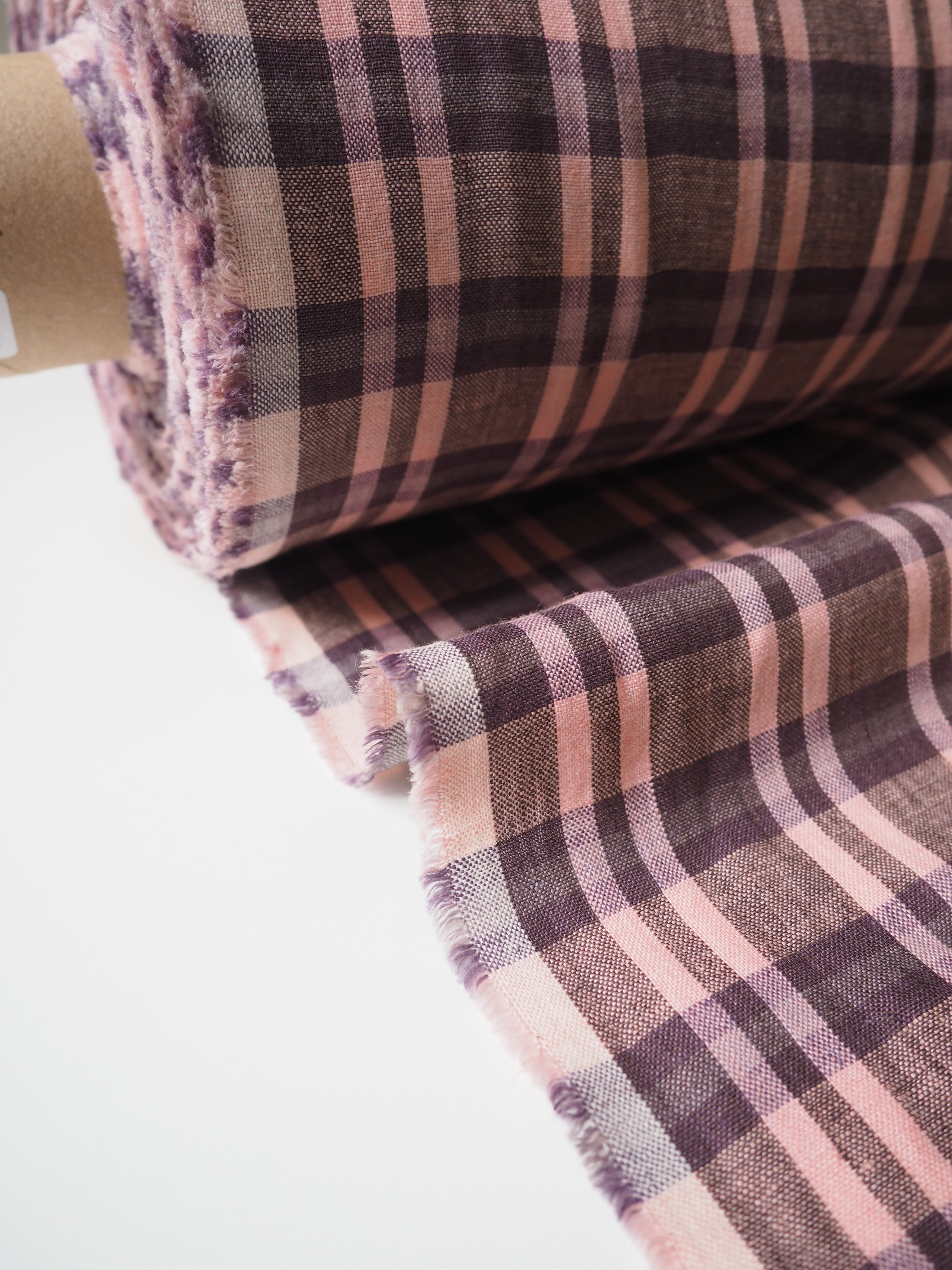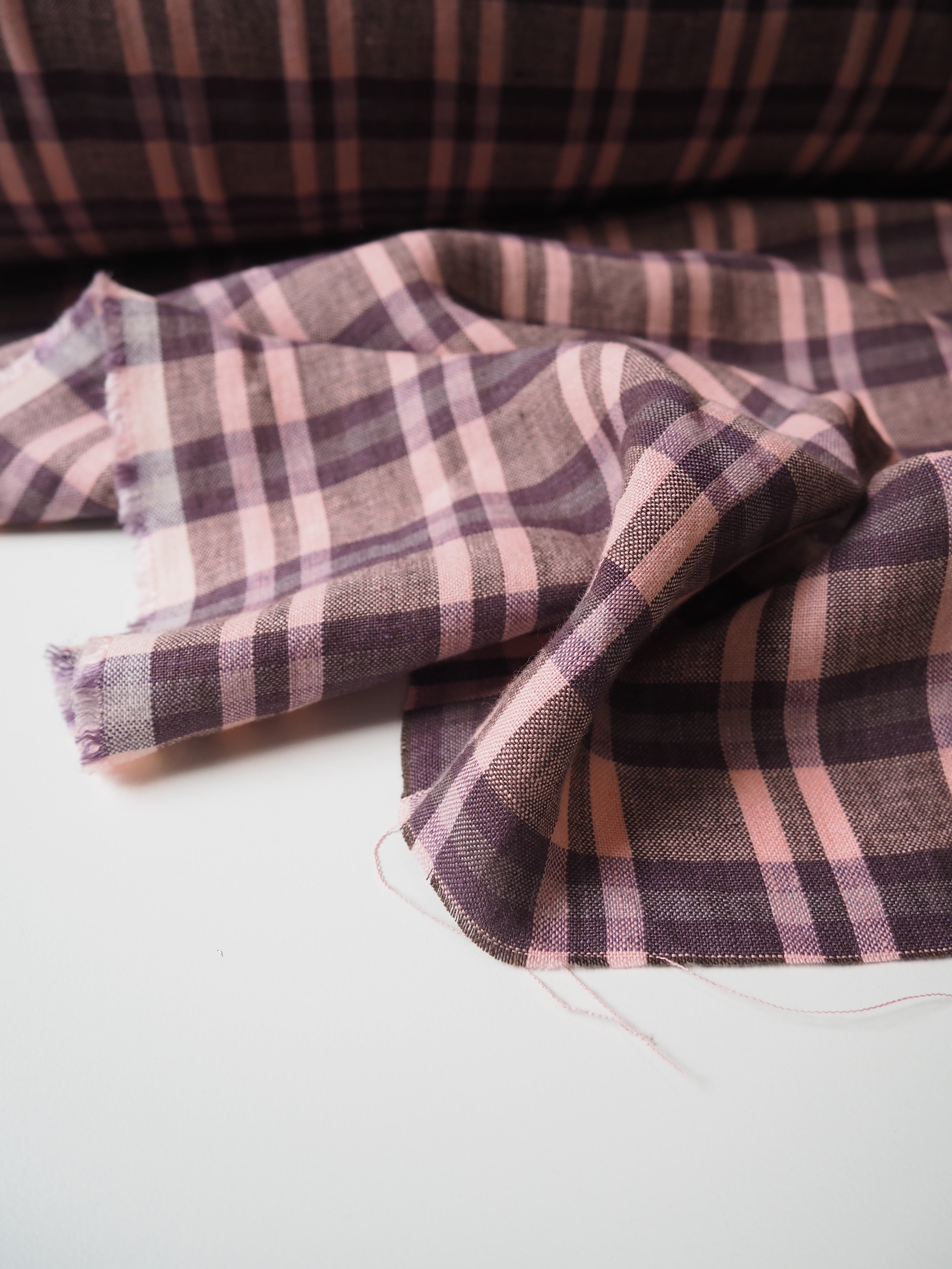 This ex-designer fabric is a lovely linen. It's a pink and dark purple colourway, in a plaid pattern. There are brown undertones in this colourway too, with brown threads running lengthways in the pattern. It has a soft and gentle linen weave with a typical linen texture, and a brilliant handle that's so wearable. Lightweight with a gentle structured drape, and fully opaque. From popular London-based brand Beyond Nine. Lovely for a bias dress of skirt, summer tops or Everyday Trousers, or even a tablecloth and napkin set!