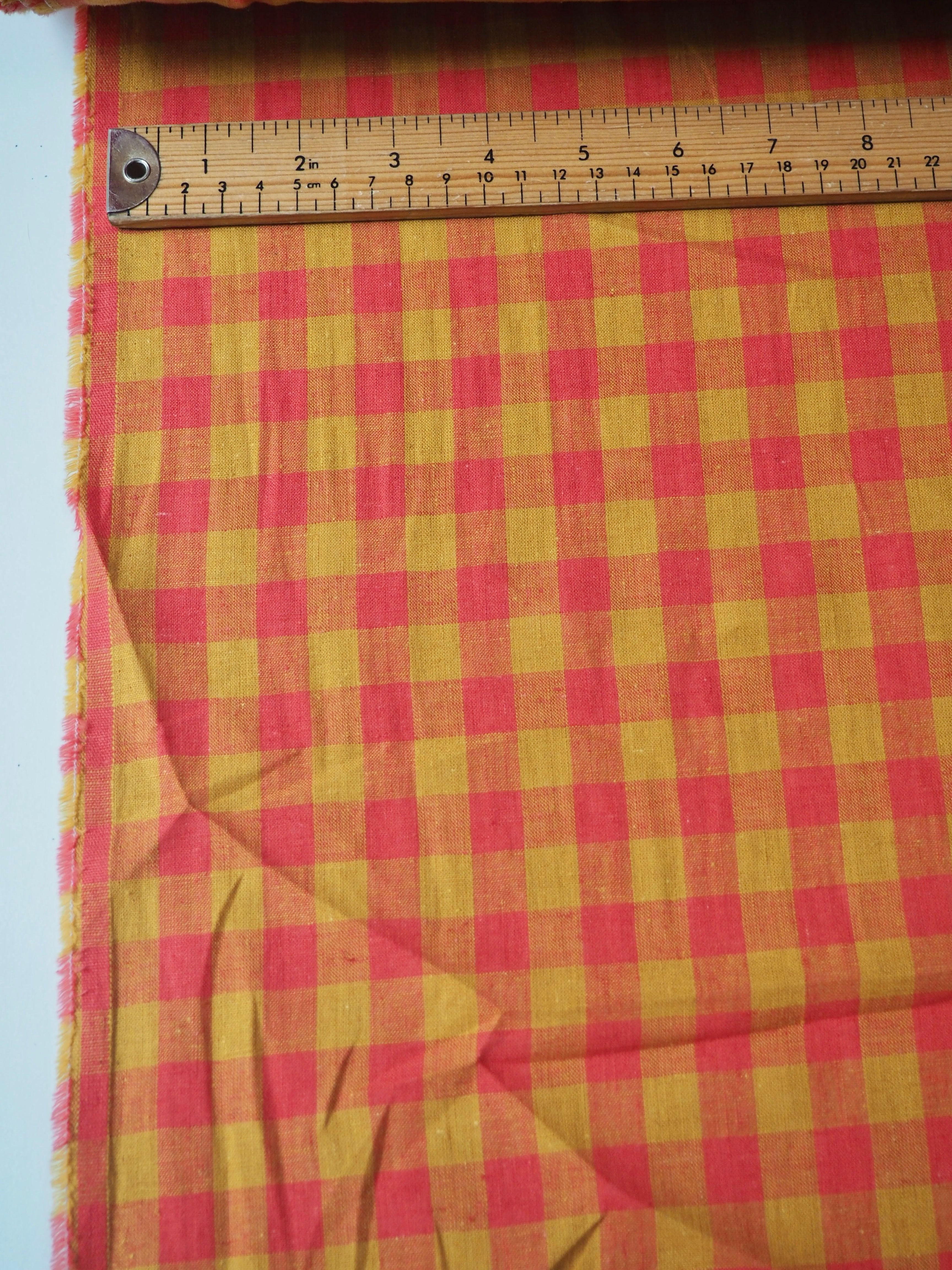 This ex-designer fabric is a bold cotton/linen. It's a warm berry pink and butterscotch yellow/orange small scale gingham check. It's from a London-based brand called Beyond Nine. Checks are about 1.25cm. It has a super soft and gentle blended weave, with an ideal cotton-y handle that's so wearable. That little bit of linen really elevates the cloth! Very lightweight with a gentle structured drape, breathable, and fully opaque. Lovely for our Everyday Dress/Top, summer tops or Everyday Trousers, (or even a co-ord!), or a tablecloth and napkin set! We can't wait to see what you make!