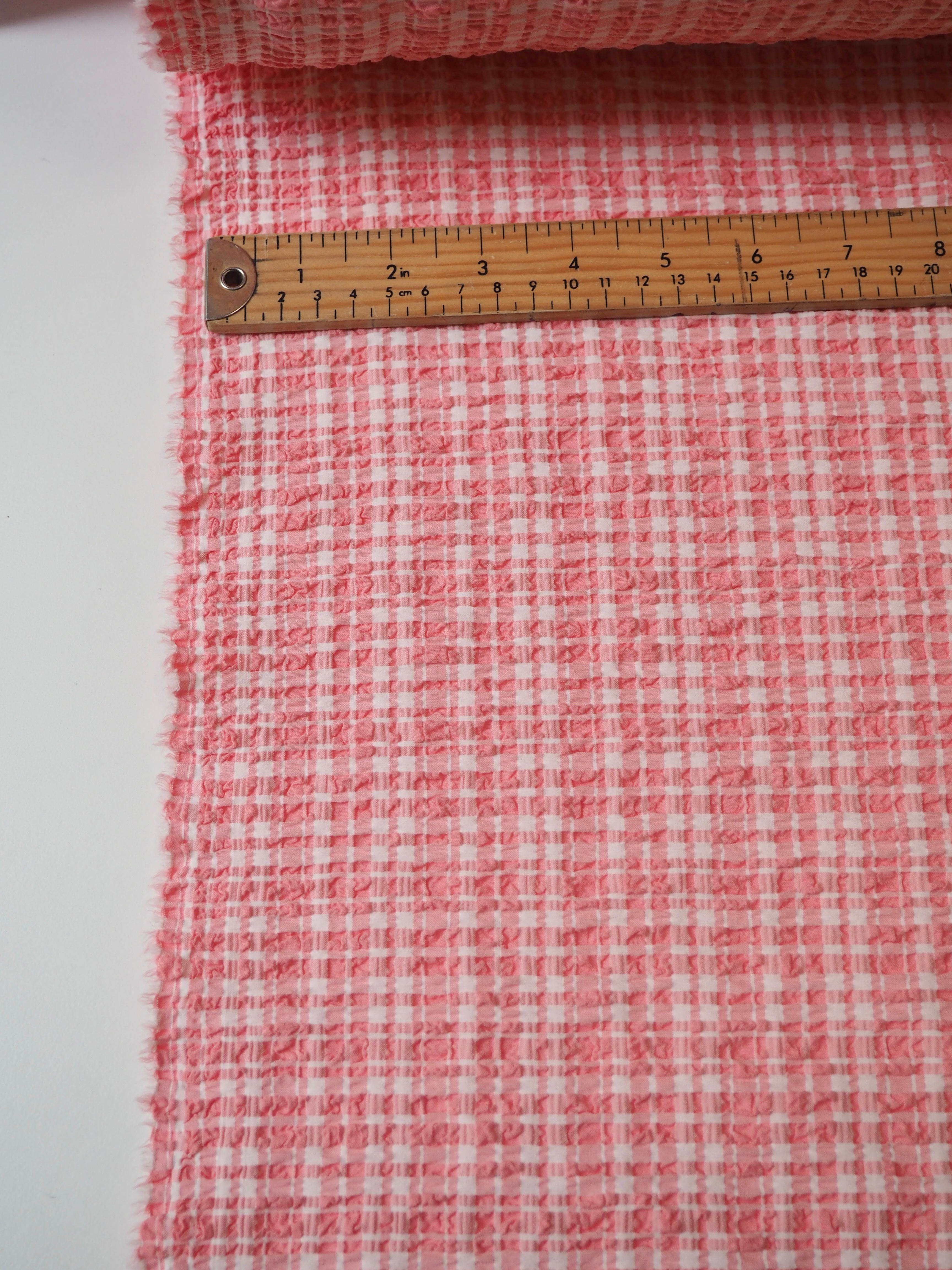 This ex-designer fabric is a seersucker. It's a medium scale pink and white check, with an extra-crinkly seersucker weave. Good stretch, about 10-15%, and comfortable, with an amazing cotton blend handle. Lightweight with a nice crispness and quirky texture! Opaque and perfect for summer dresses or tops!