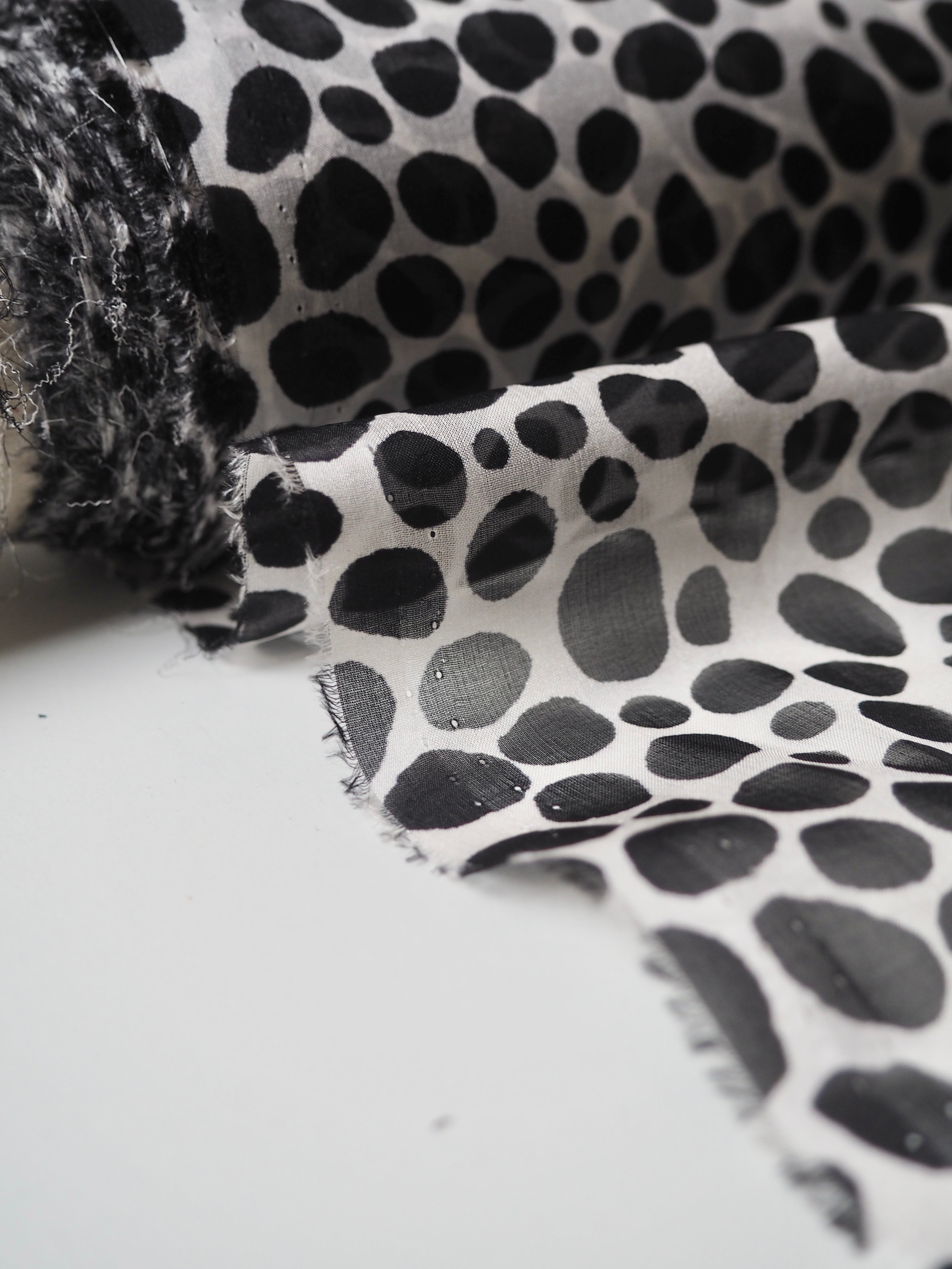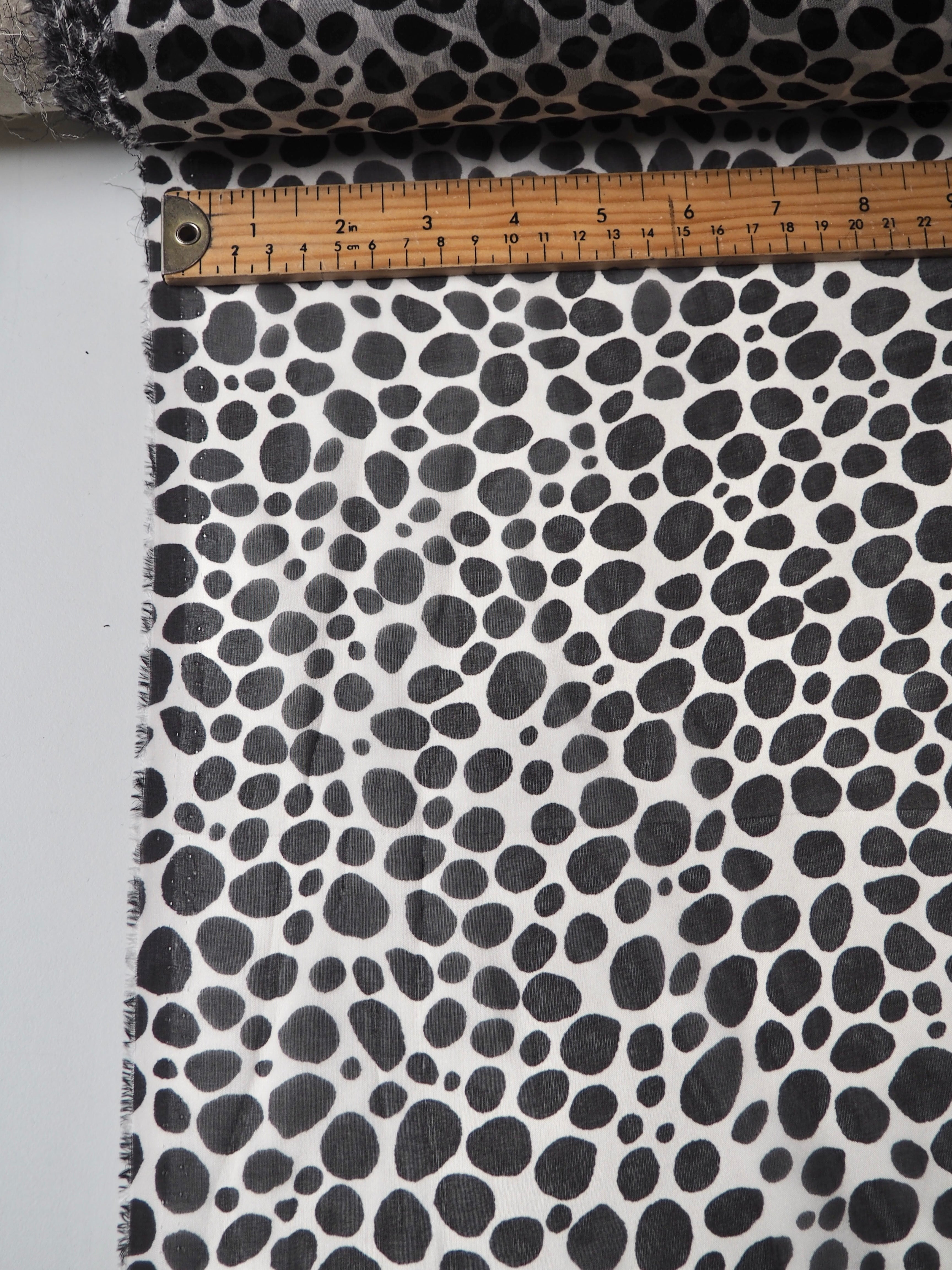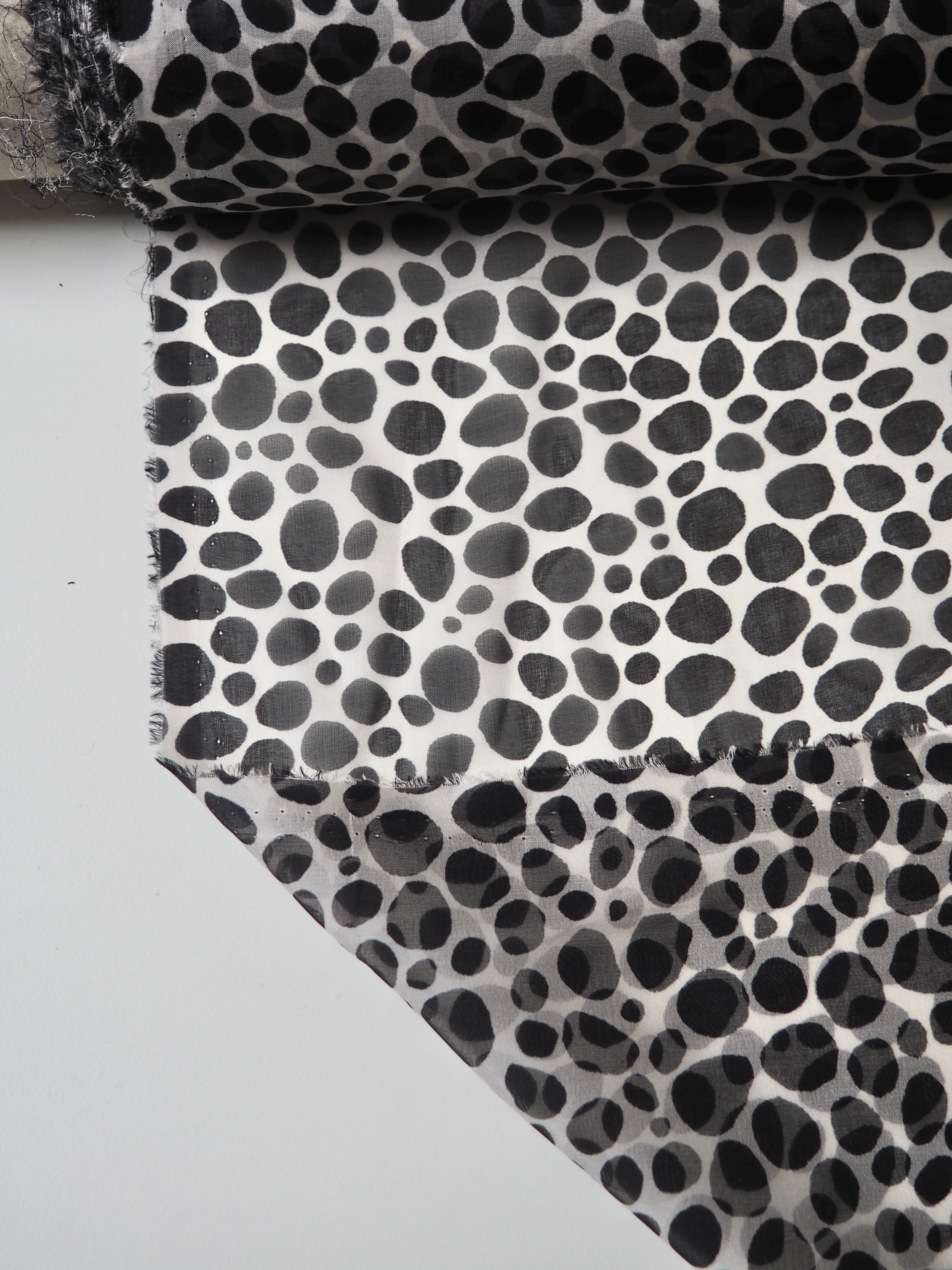 This ex-designer fabric is a lovely silk chiffon. It has a white background and a black dot, like a pebble. It is quite sheer but so drapey and very floaty! Has a great silky handle that feels really special. Super light and airy, ideal for lingerie, or using for a floaty top or dress!