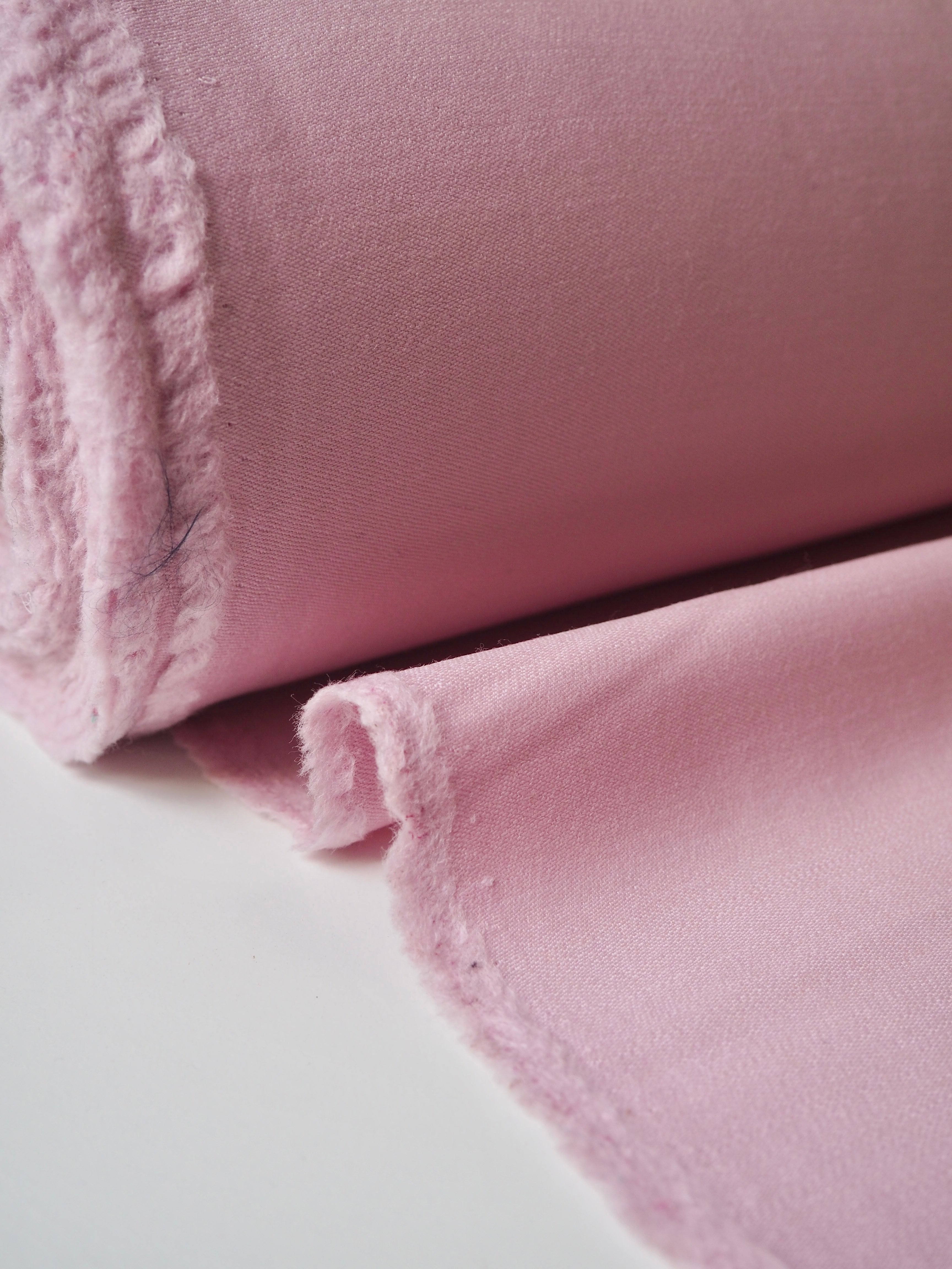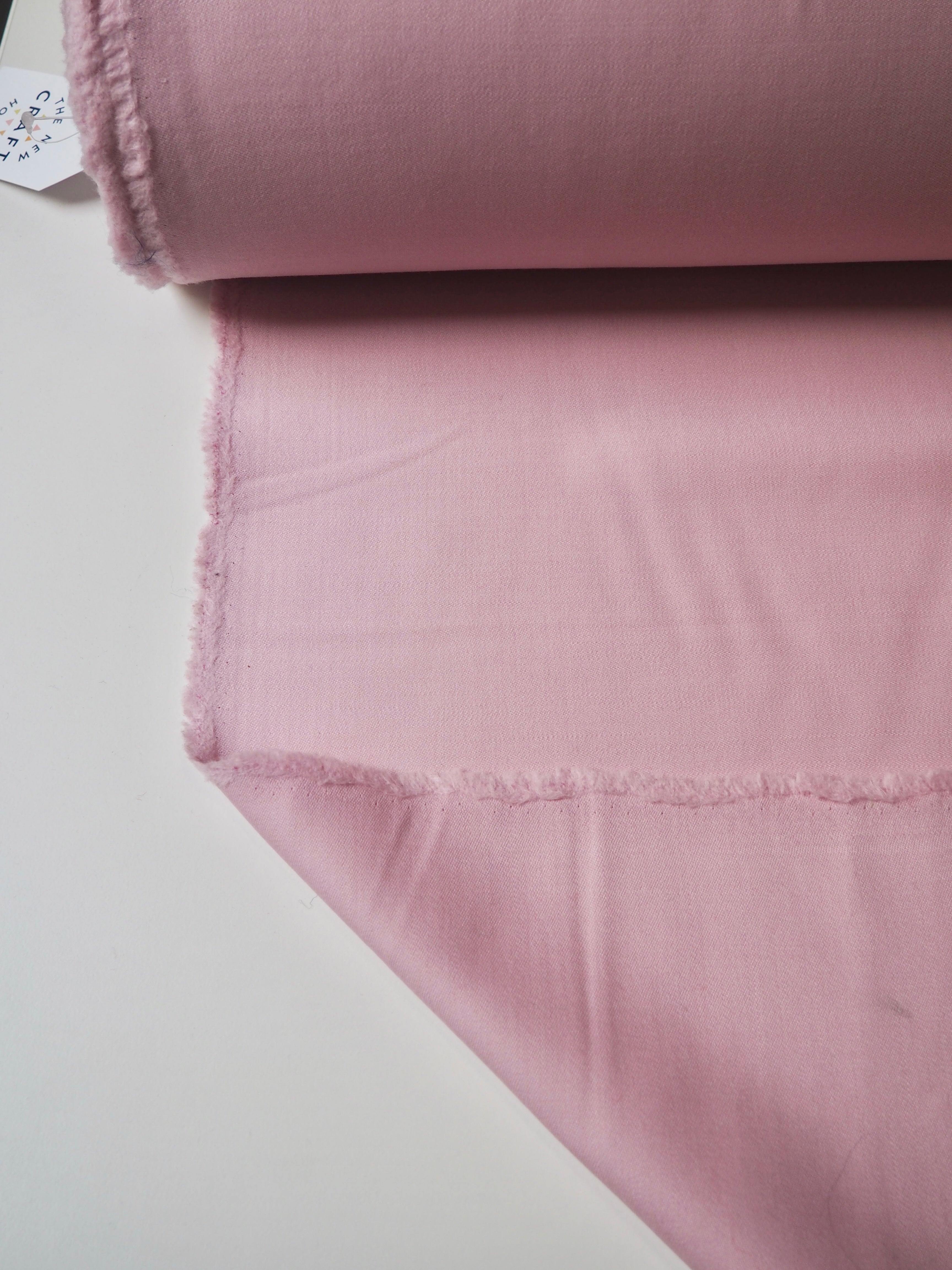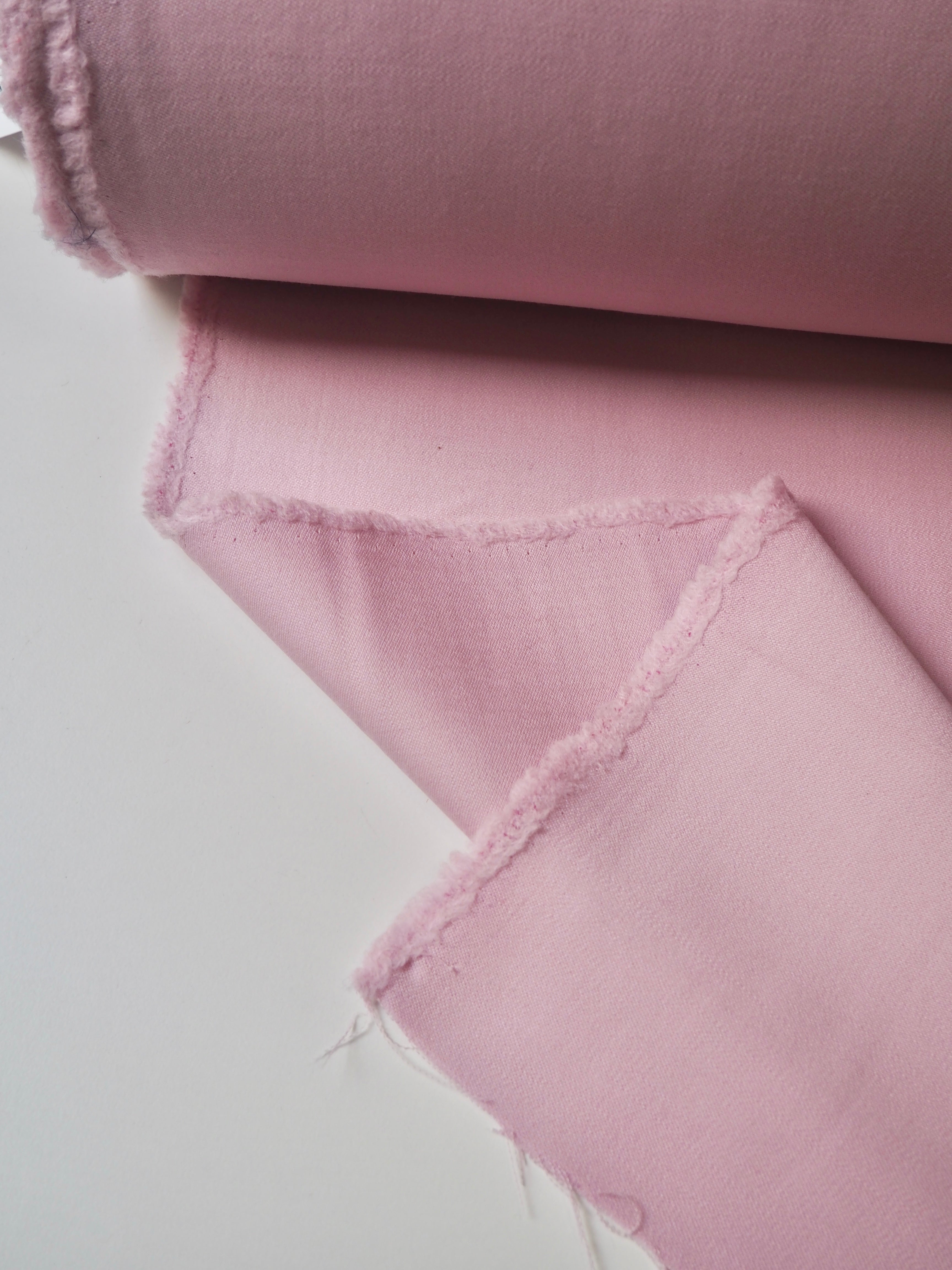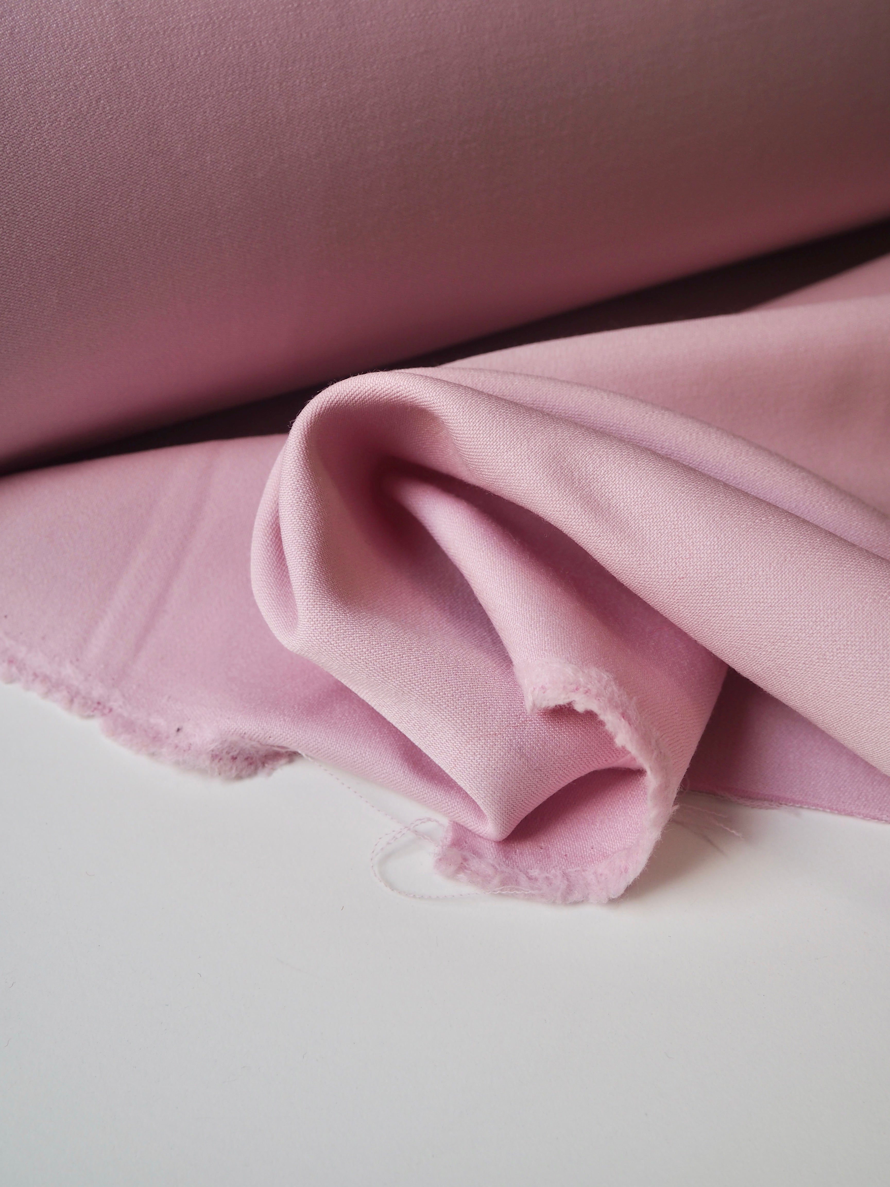 This ex-designer fabric is a wool crepe. It's two layers of wool crepe woven together, with such a lovely light structure and gentle drape. It sill has the characteristic crepe texture and its medium weight. Very soft and warm. In a lovely pale blossom pink shade. Ideal for a boxy jacket or fitted skirt!
