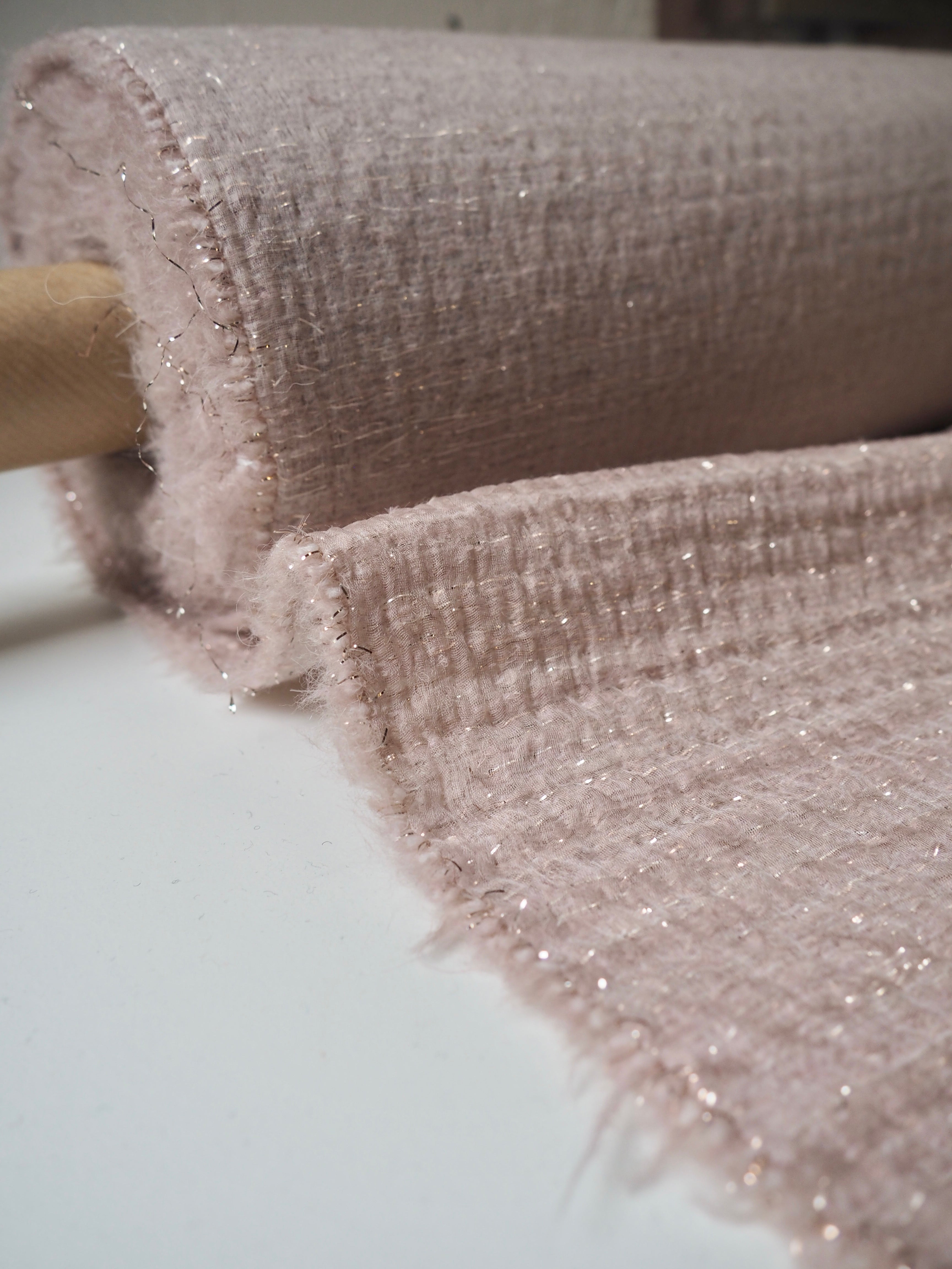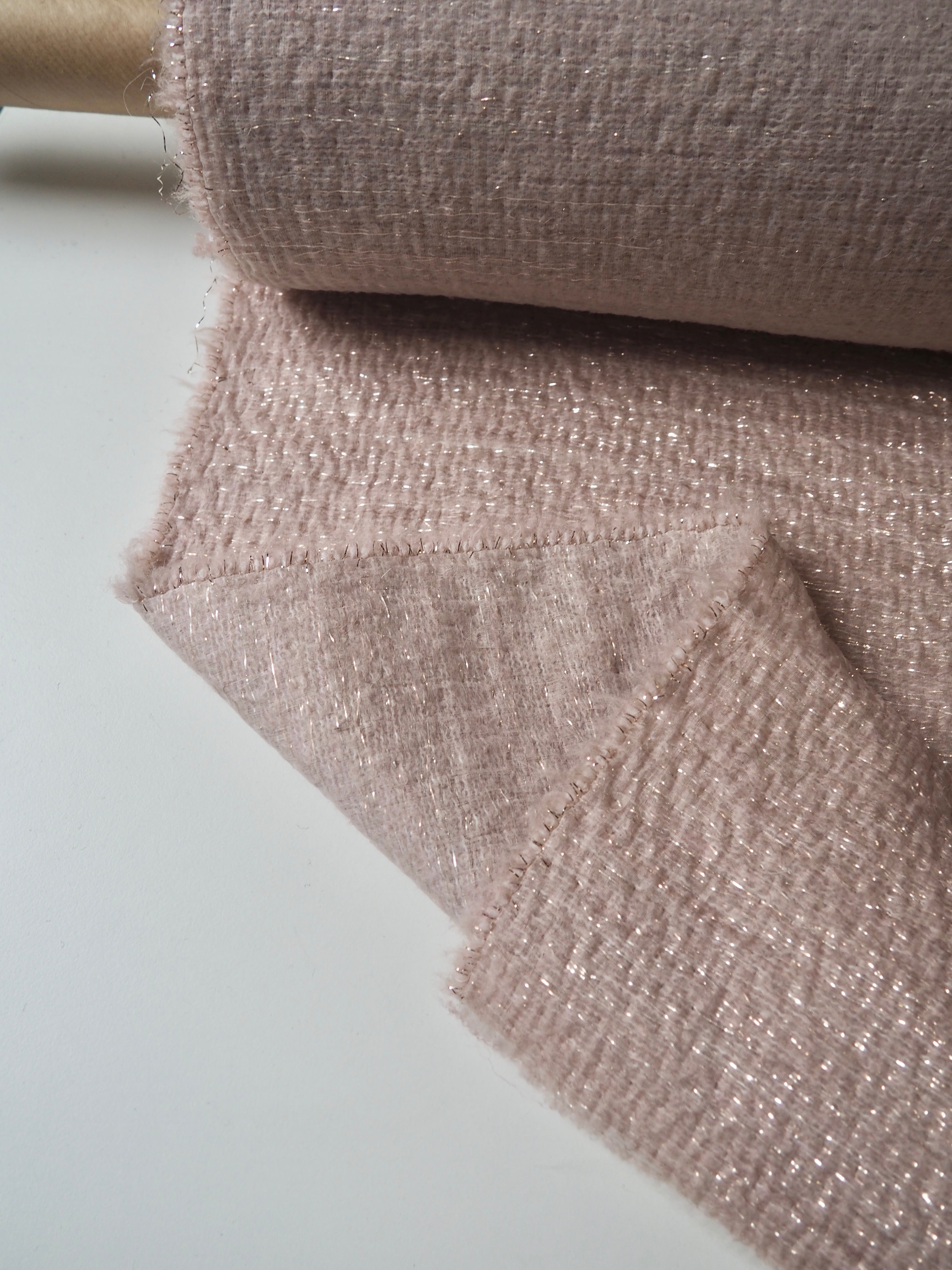 This ex-designer fabric is a unique cloth. Two silk organza's sandwich lurex and wool blend threads into this very soft and interesting coating. It's a little sheer, but still warm and catches the light beautifully. It has a very luxurious visual texture and lovely plush handle. It's quite lightweight and has a gentle structure that could create a great volume. Could make super cool unlined or lined jacket or even circle skirt!