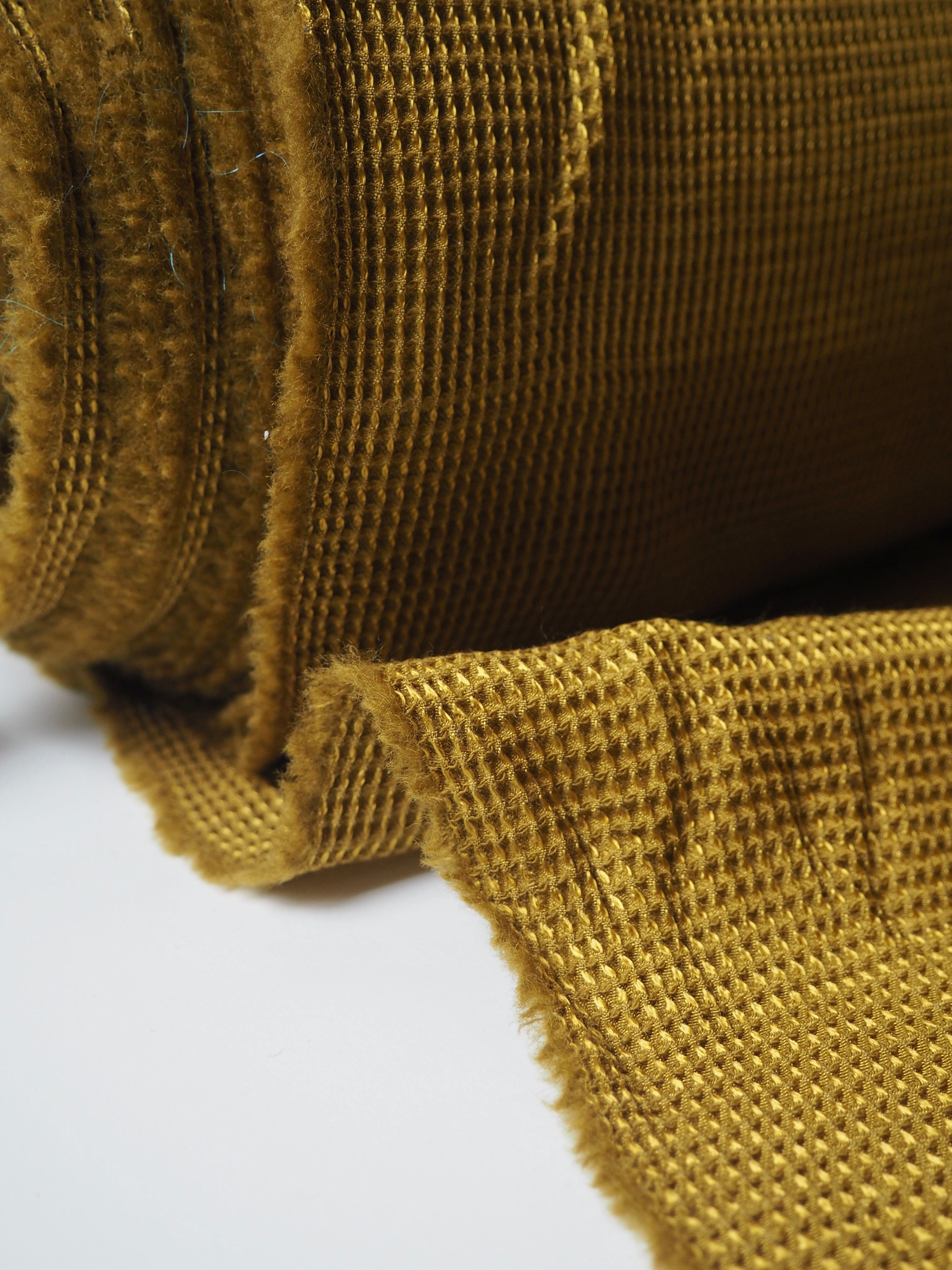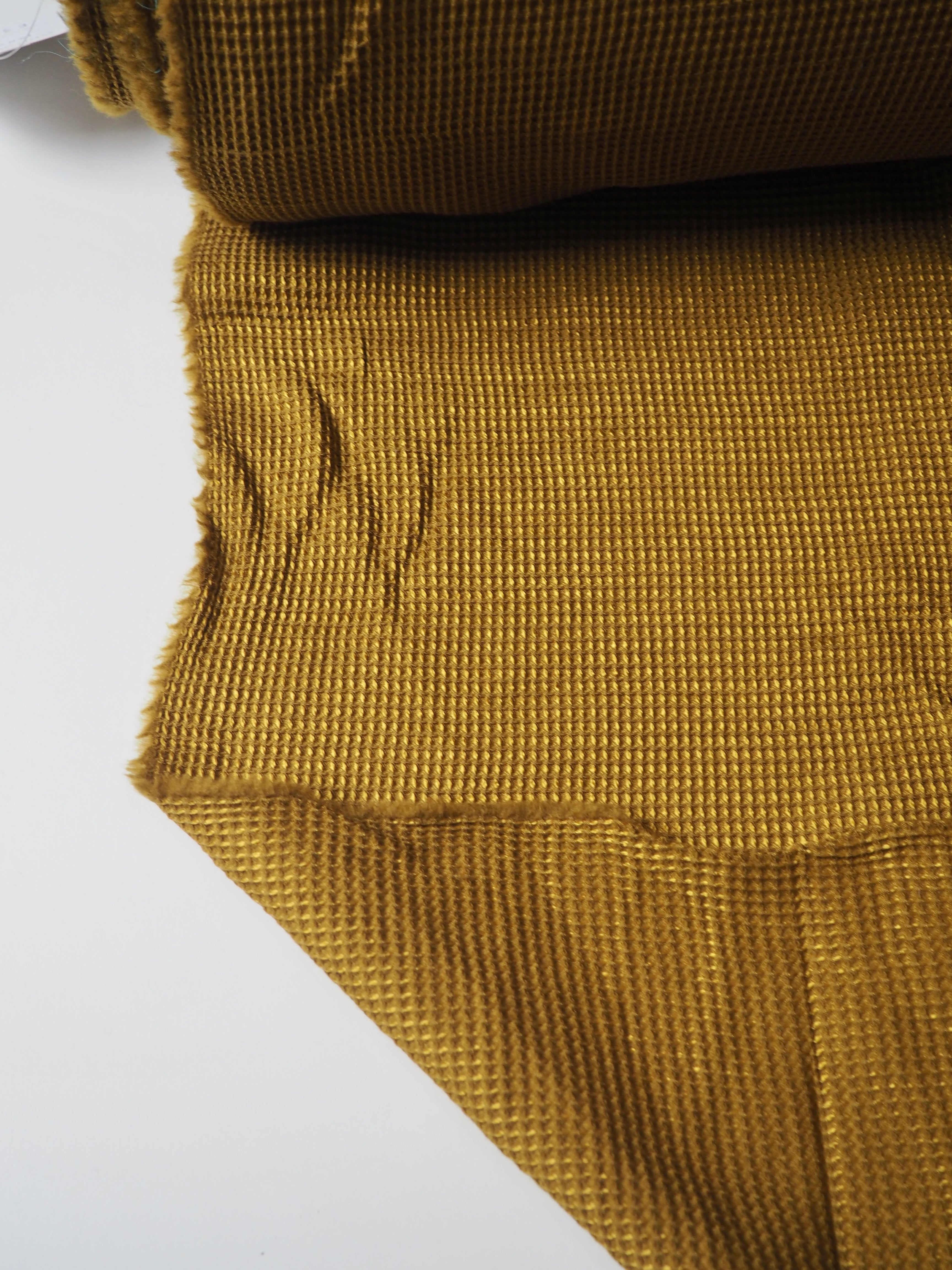 This ex-designer fabric is a jacquard. It's a unique gridded honeycomb-like weave that give it an interesting depth. It's light to medium weight and sponge-y in texture. Opaque and has a soft structure to play with. The slight silk fibre blend gives it a lovely sheen finish, and the wool blend gives it warmth and cosiness'. Would be lovely in a boxy top or light jacket!