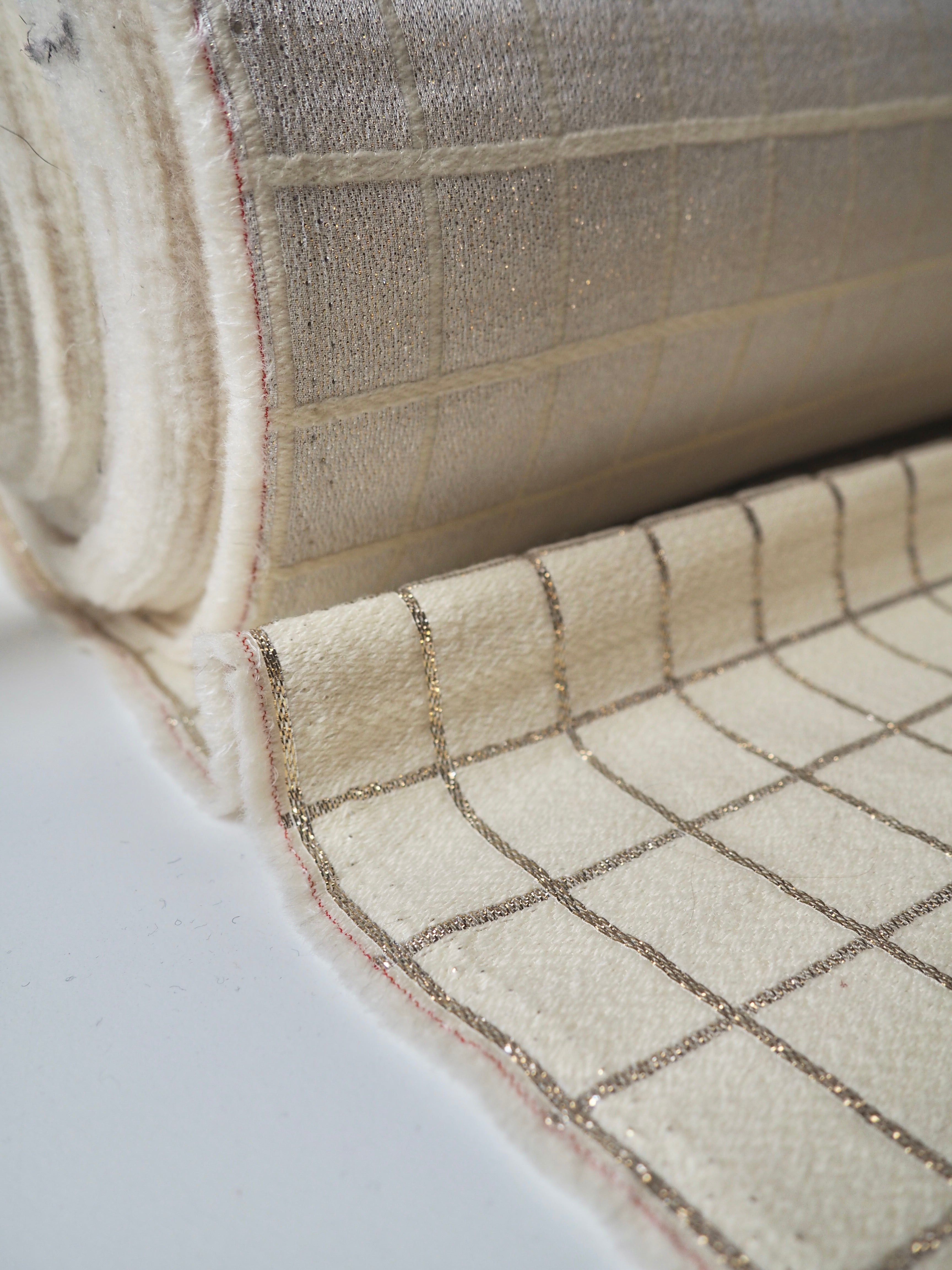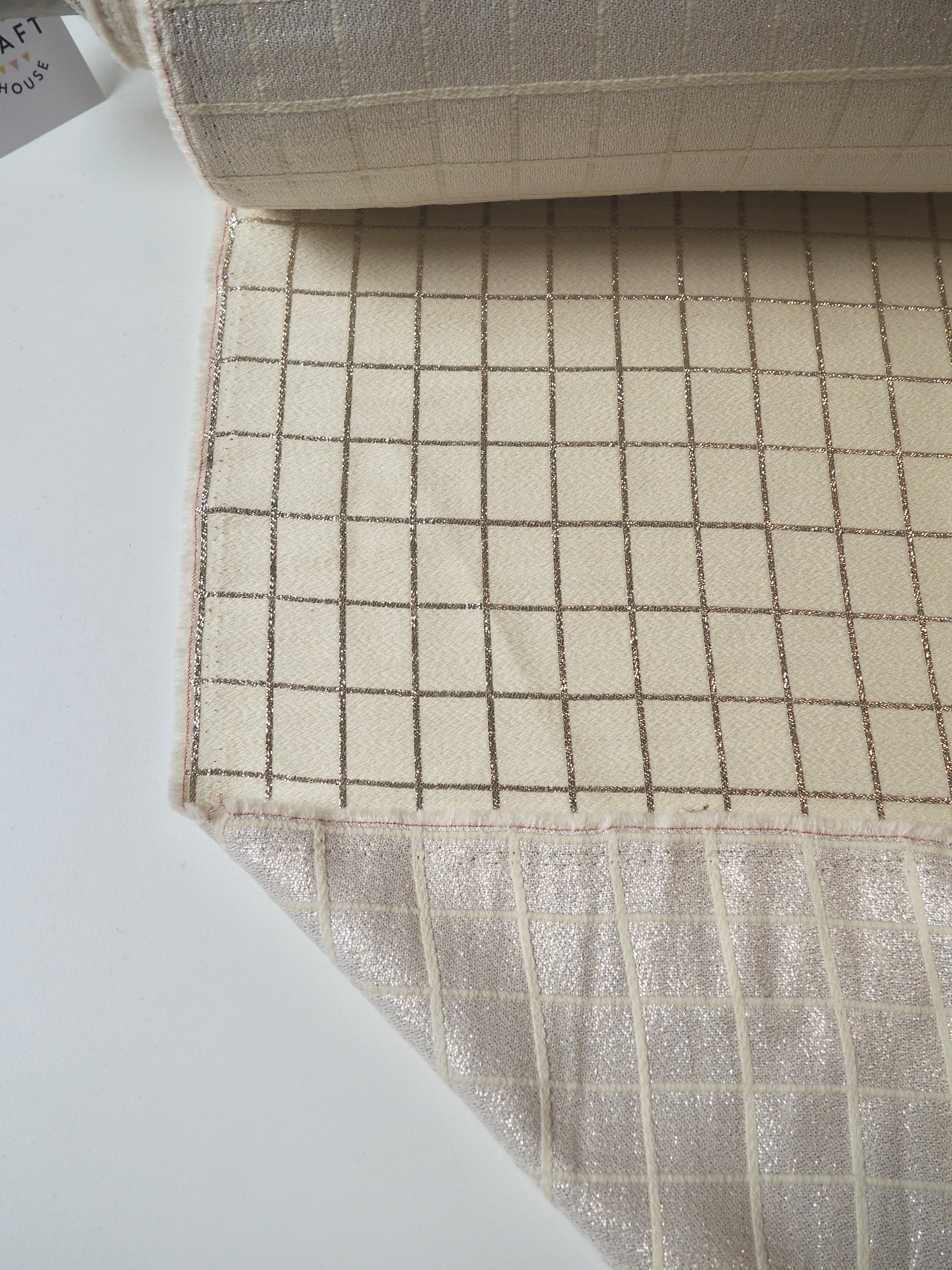 This ex-designer fabric is a jacquard. It's a gridded jacquard, with cream wool and gold lurex threads. It's quite soft, with a wool-y feel and luxurious metallic sheen that catches the light beautifully. It's light to medium weight, and has quite an easy drape for a wool. Opaque, feels so lovely and quality! Perfect for a light jacket or fancy dress!