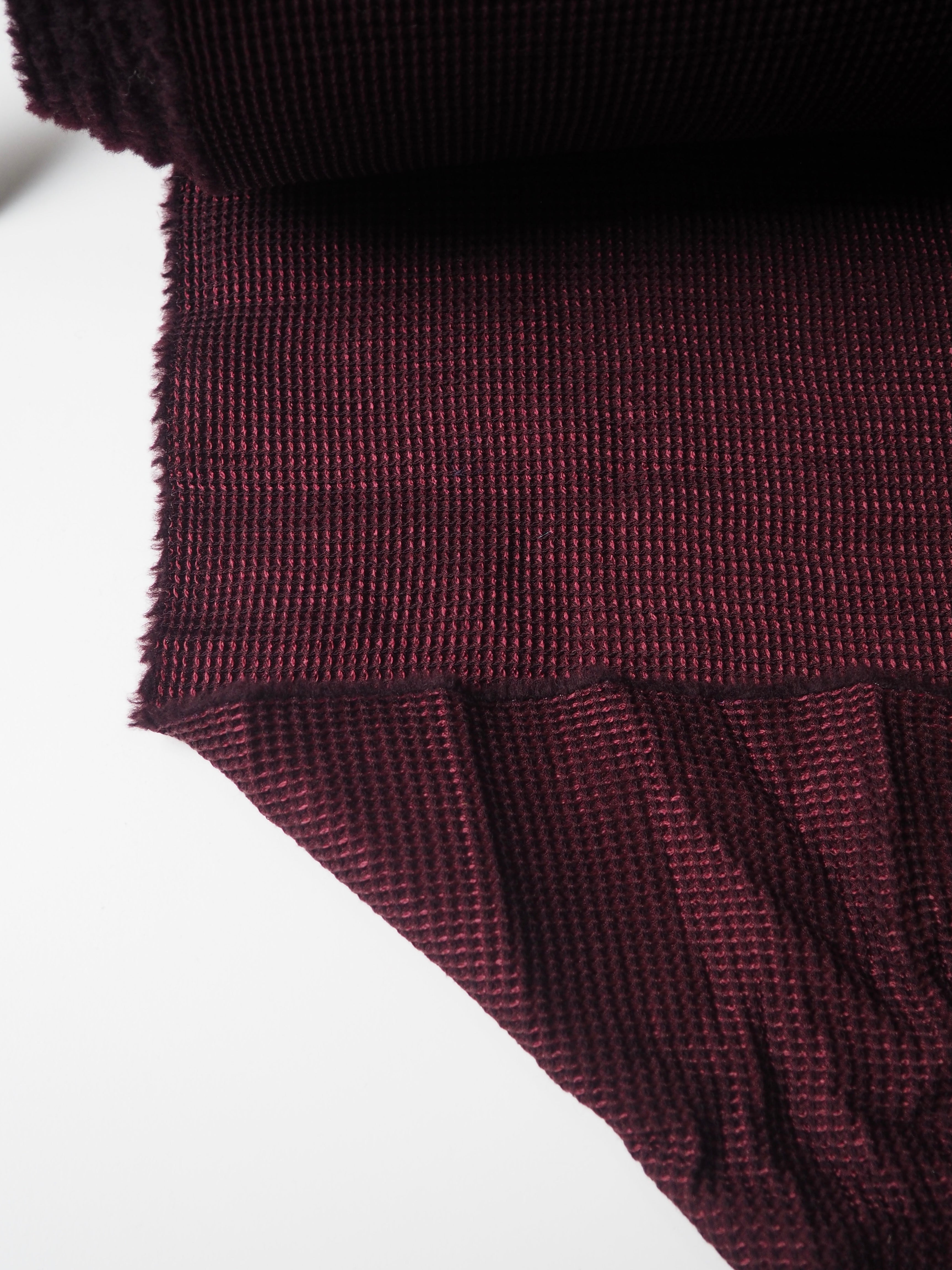 This ex-designer fabric is a jacquard. It's a unique gridded honeycomb-like weave that give it an interesting depth. It's light to medium weight and sponge-y in texture. Opaque and has a soft structure to play with. The slight silk fibre blend gives it a lovely sheen finish, and the wool blend gives it warmth and cosiness'. Would be lovely in a boxy top or light jacket!
