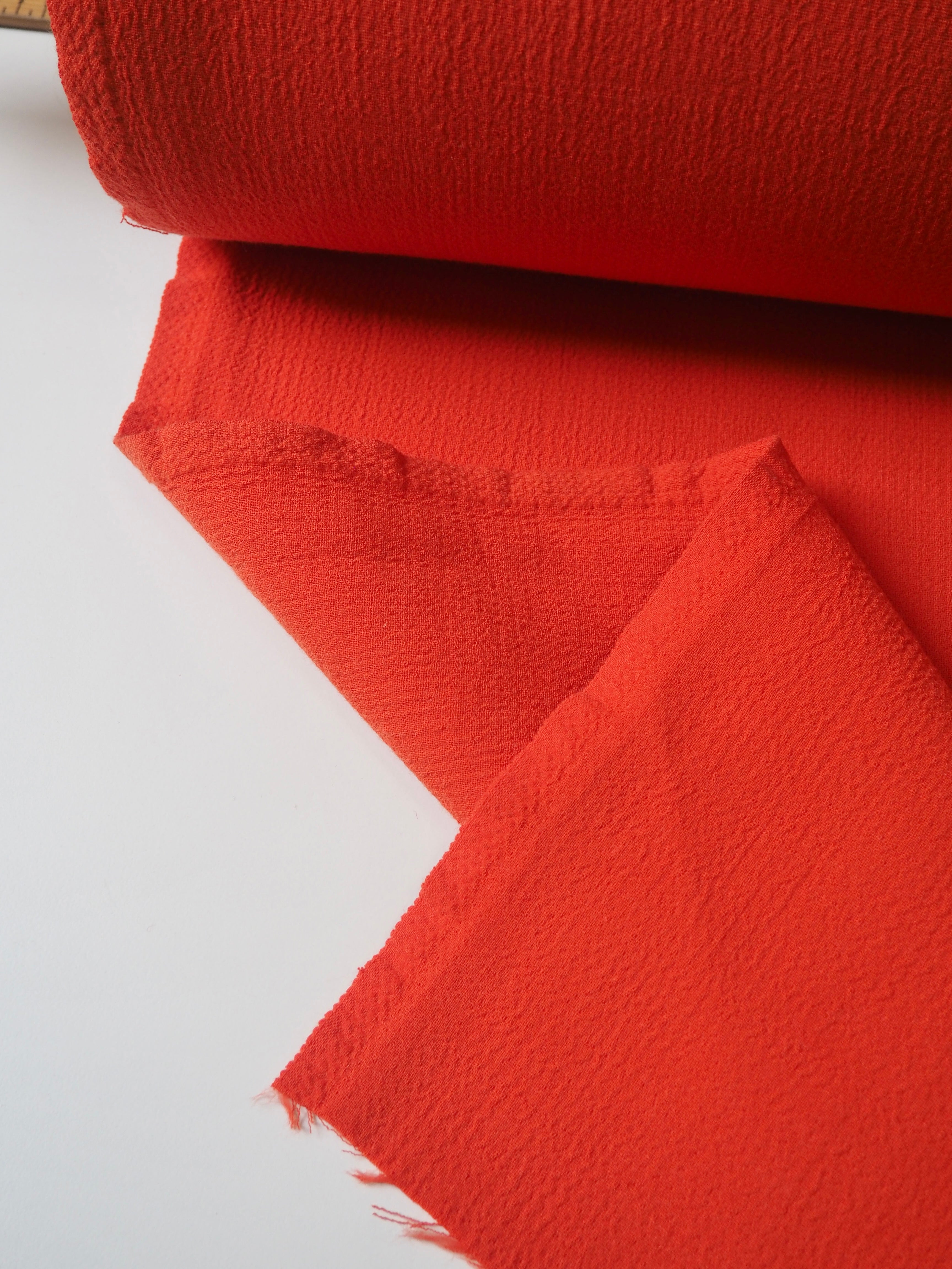 This ex-designer fabric is a wool crepe. It's two layers of wool crepe woven together with a plush inner layer, that gives it such a lovely bounce and playful structure. It sill has the characteristic crepe texture and its medium weight. Very soft and warm. In a lovely orange shade. Ideal for a boxy jacket or fitted skirt!