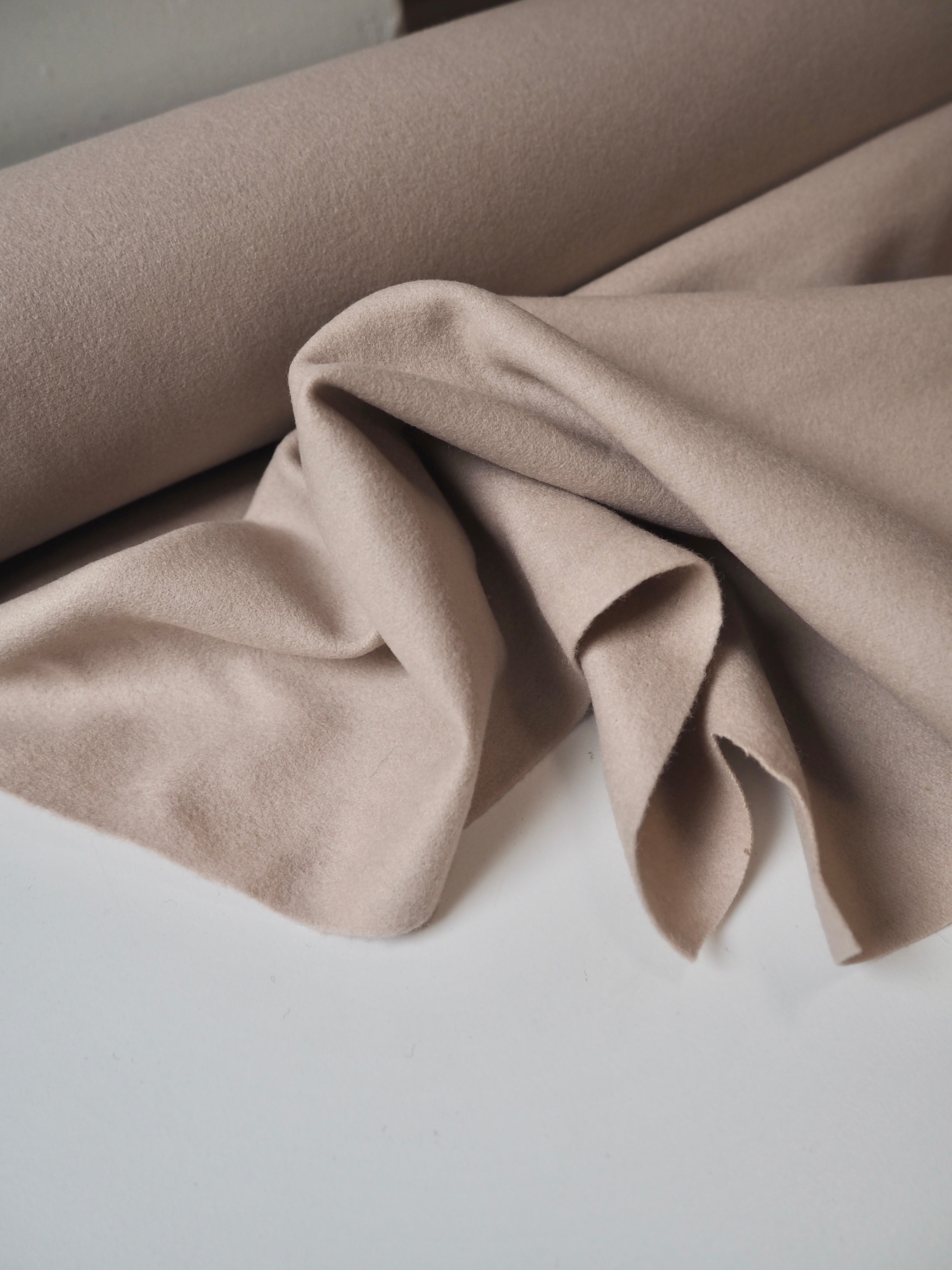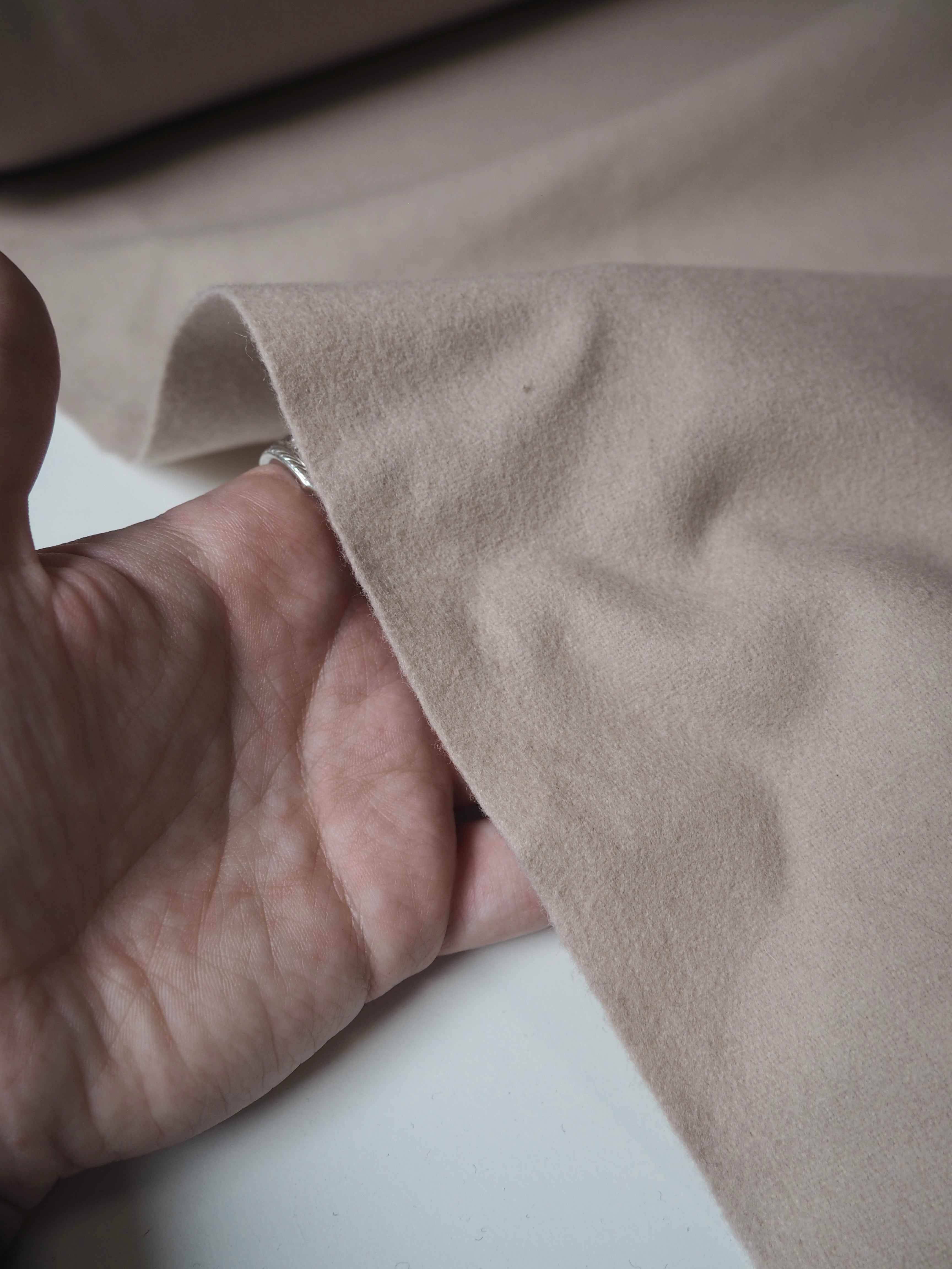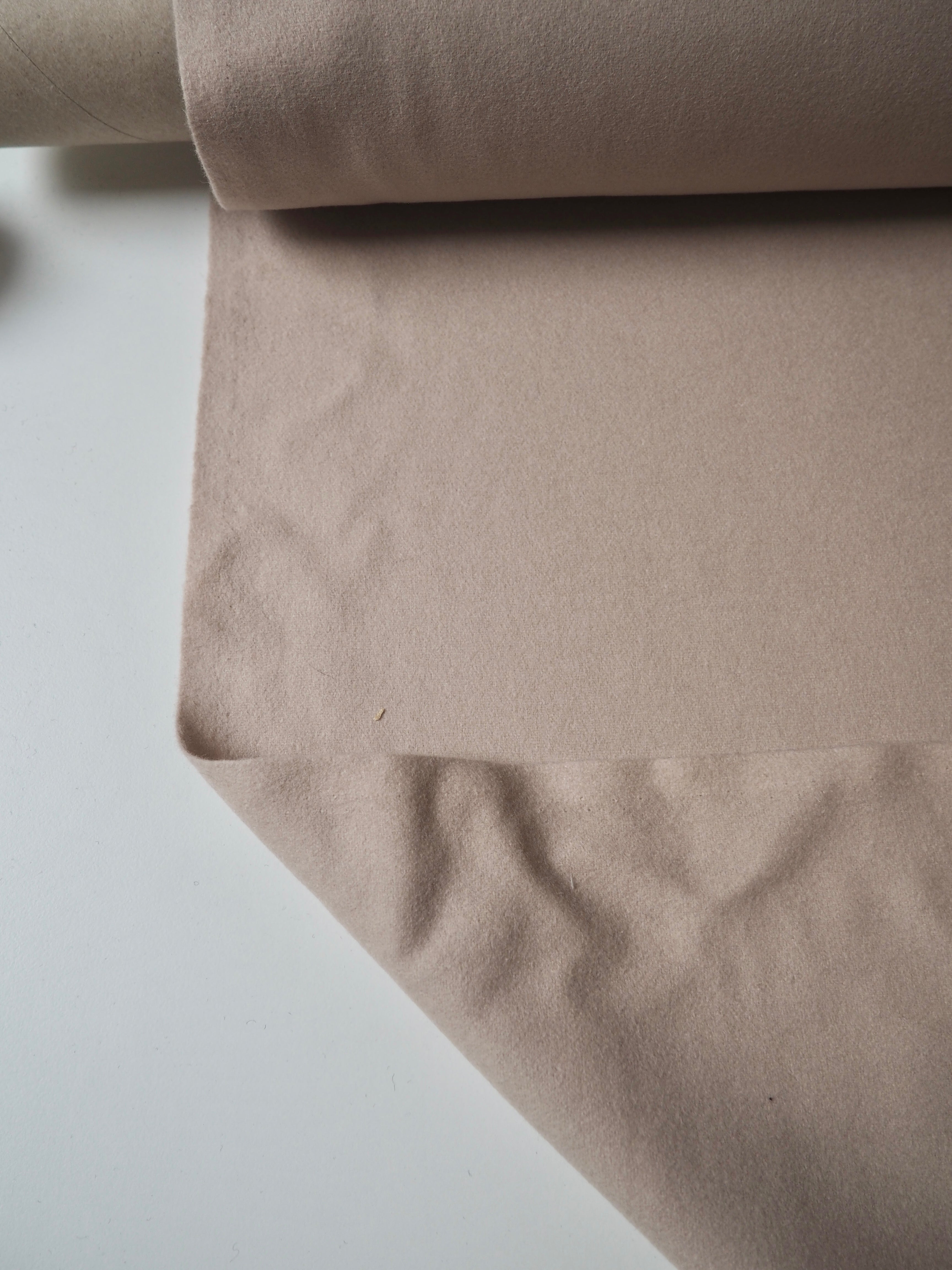 This ex-designer fabric is a wool coating. It's from top-quality British mill A.W. Hainsworth, in a 100% Wool. In a pale blush pink, this wool has a felted finish, woolly handle, and structured drape. It's medium weight. It's designed for outerwear and wind proofing garments due to its thickness and durability. It's a dreamy cloth to make tailored garments, we'd love to see a jacket or even a cape!