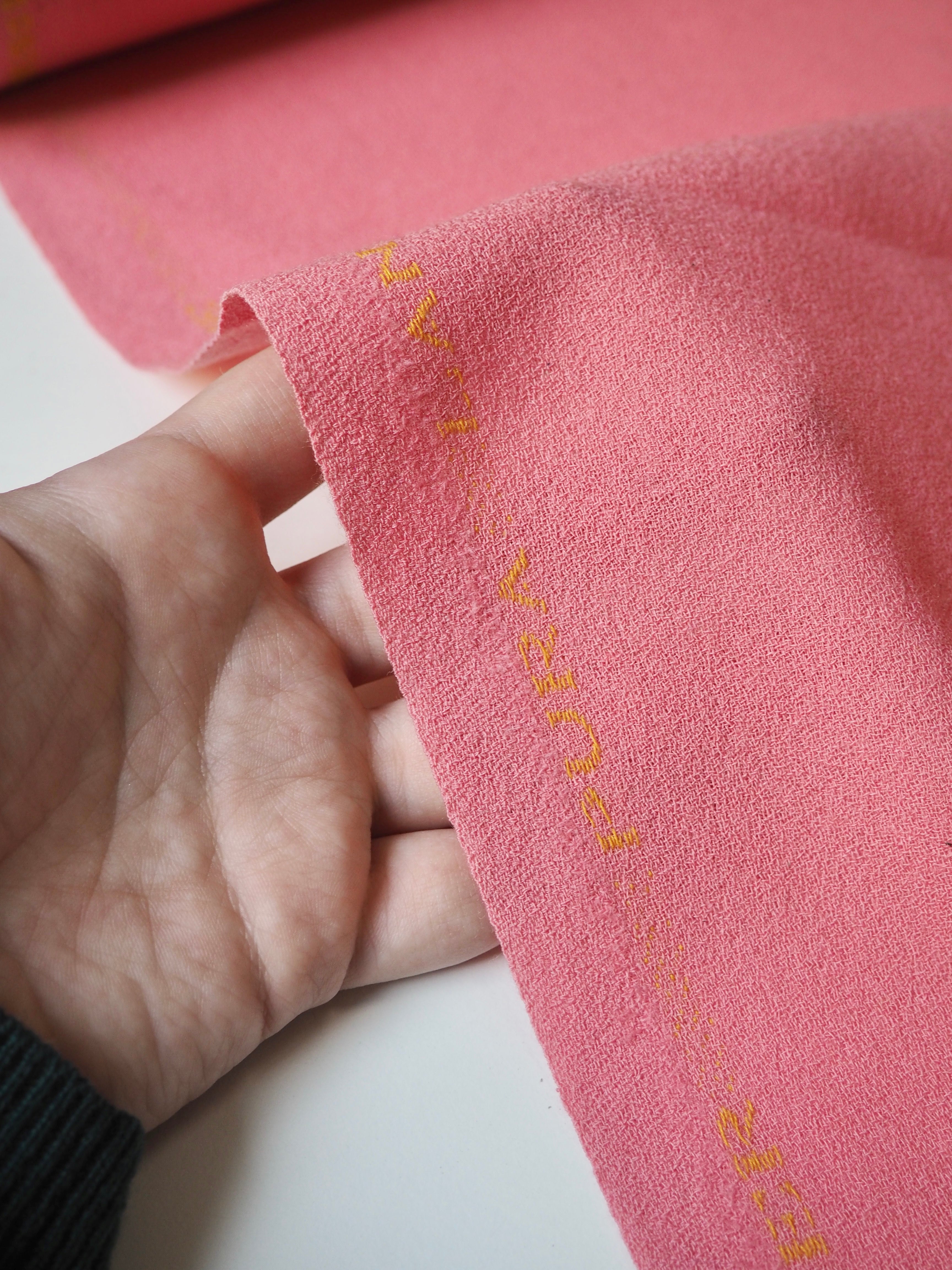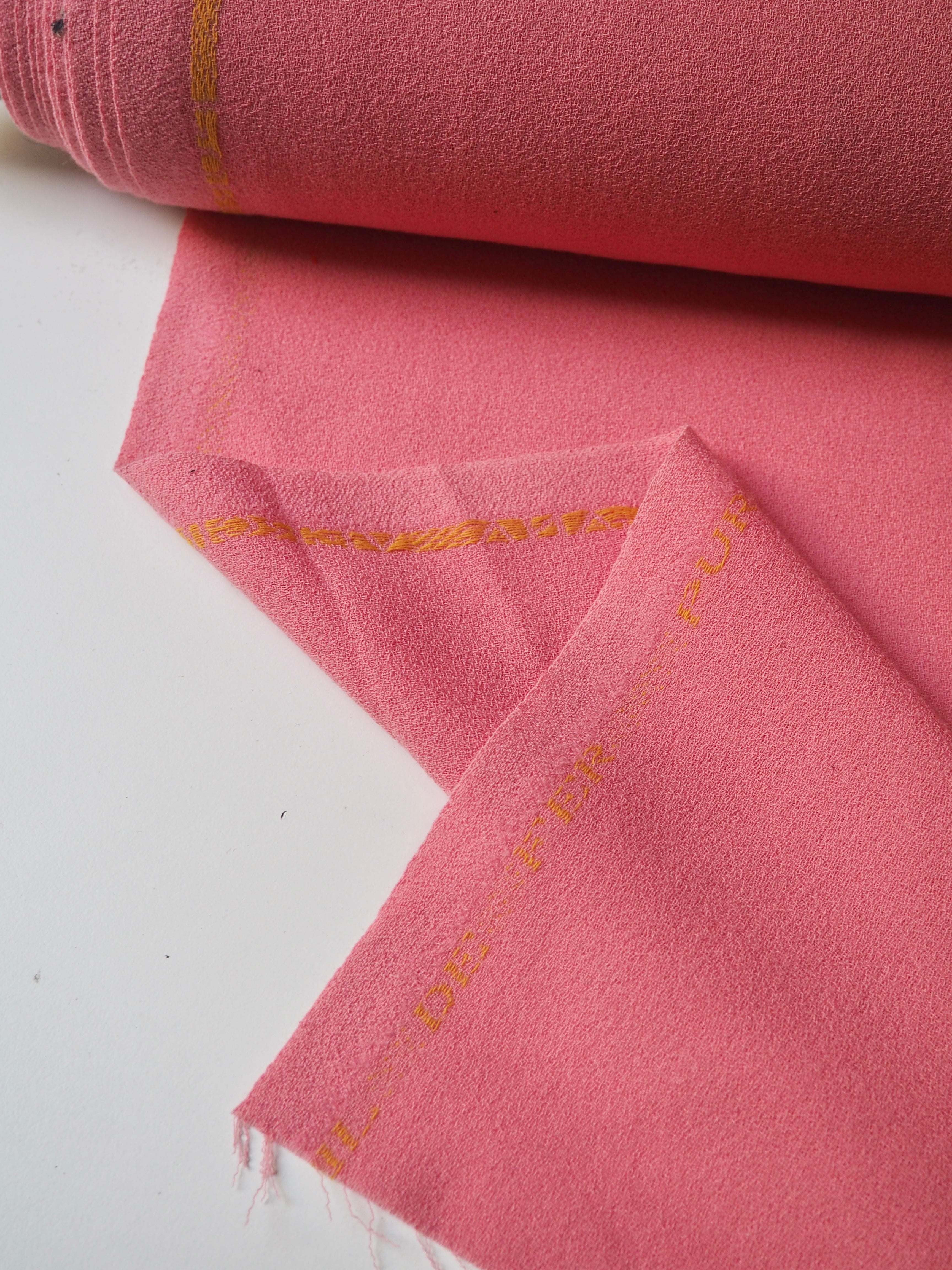 This ex-designer fabric is a wool crepe. It's a beautiful cloth with a sturdy but comfortable weave. It's made of pure wool and feels and looks so luxurious! It has a soft structure and really lovely soft crepe handle. Lightweight, and perfect for tailoring projects. Flexible and has a wonderful drape that makes it so easy to work with! The perfect cloth for a lifetime pair of wide leg trousers!
