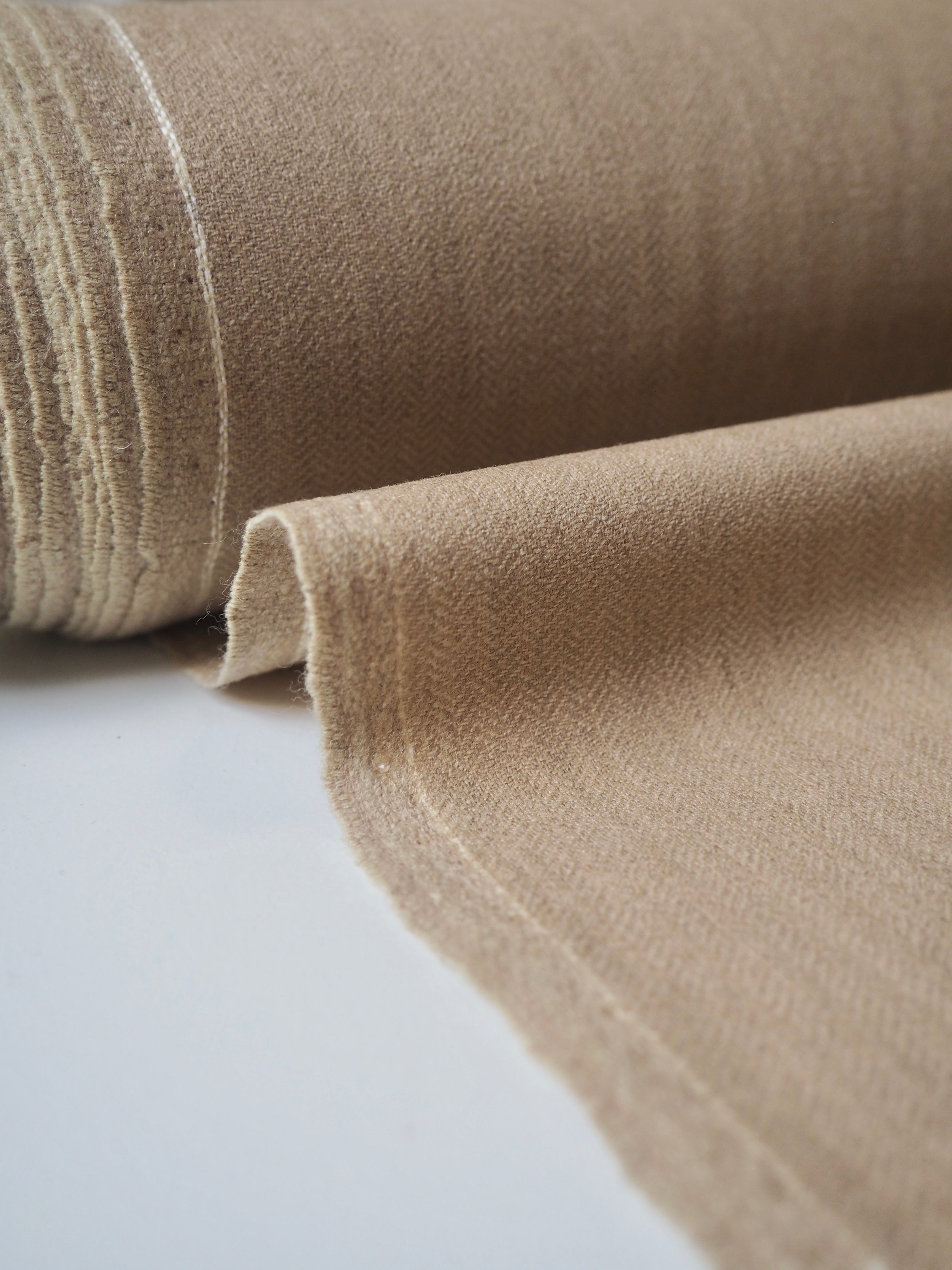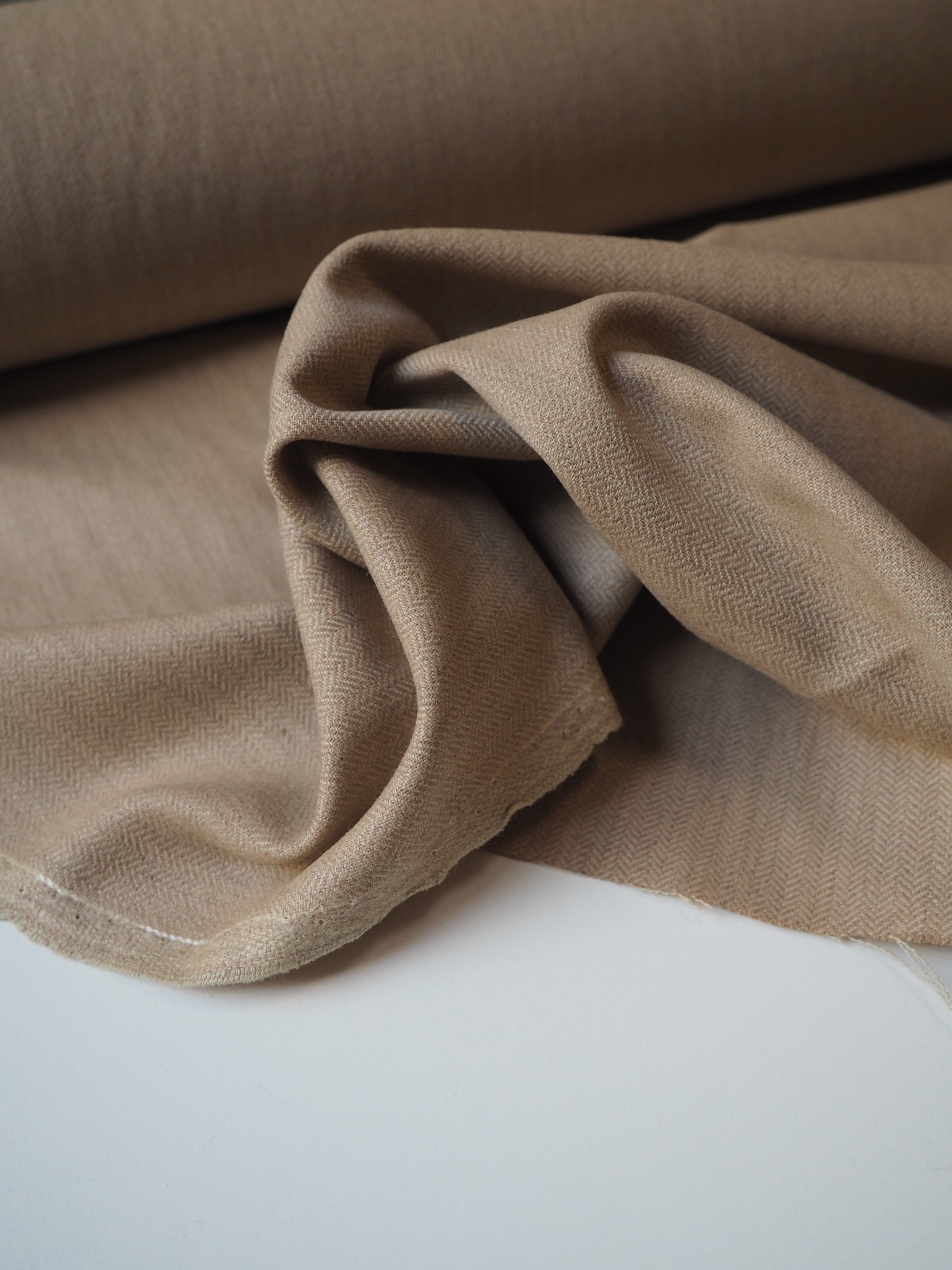 This ex-designer fabric is a wool suiting. It's in a sand colourway, with a herringbone weave. It's blended with polyester, which gives it a nice sheen and extra strength. Light to medium weight, quite warm, with a nice drape and lovely handle. Perfect for a blazer or trousers!