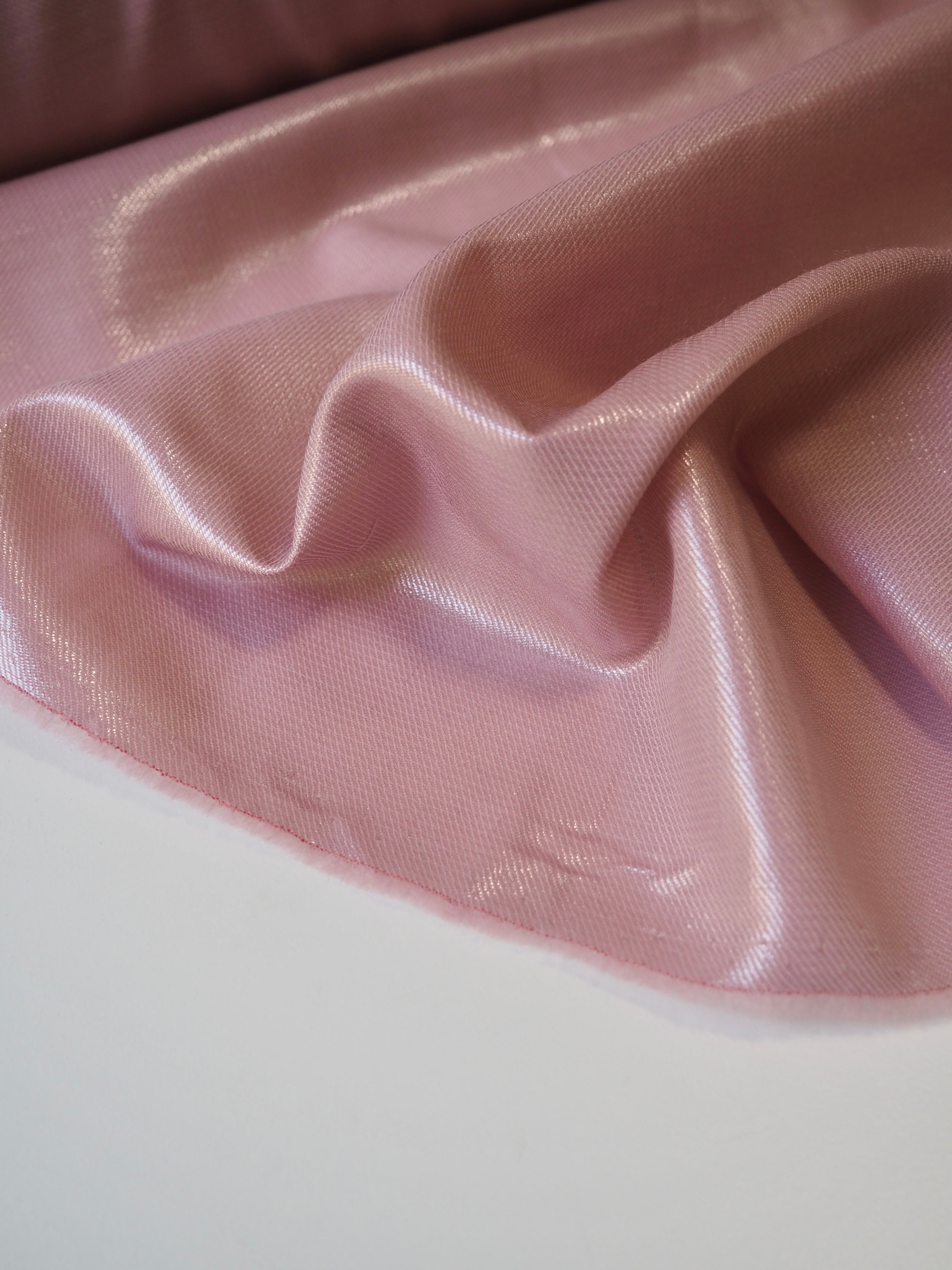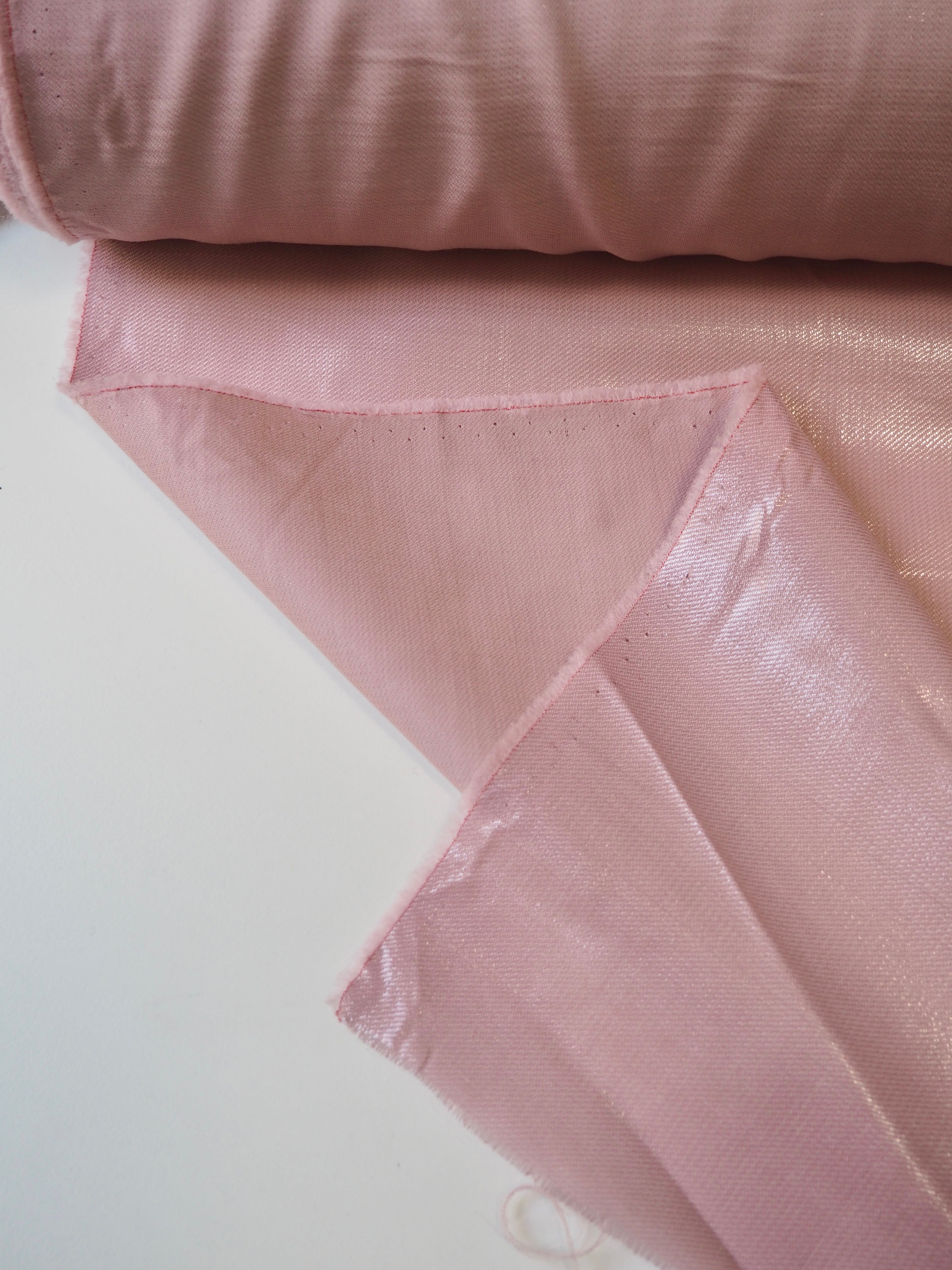 This ex-designer fabric is a unique wool. It's a very soft and lightweight twill, with a glossed, clear finish on the topside. The finish gives it a fluid movement that's beautiful in the light! It's almost fully opaque and has a smooth, almost silky topside, and a gentle wool handle on the reverse. It has such a lovely drape in a lovely pink shade. Perfect for some trousers or an Everyday Top!