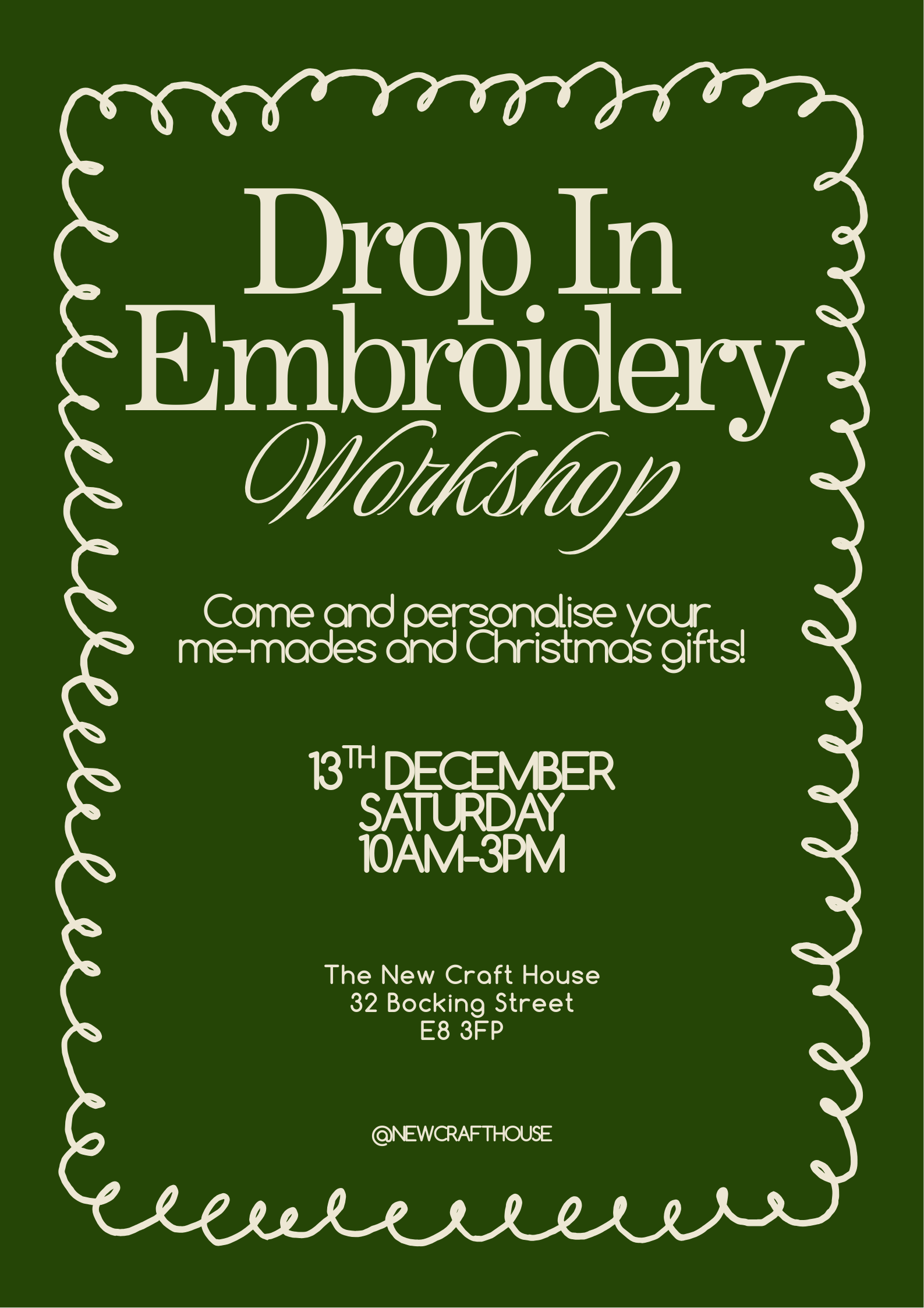 We're holding a festive special Personalised Embroidery Drop In day! We've got an incredible embroidery machine in the studio and for one day only we'll be setting it up and adding monograms and words onto garments and other items for you. Think initials on PJs and bags, words on sweatshirts, short sayings on napkins and more. Perfect for adding a special touch to Christmas gifts or just treating yourself.