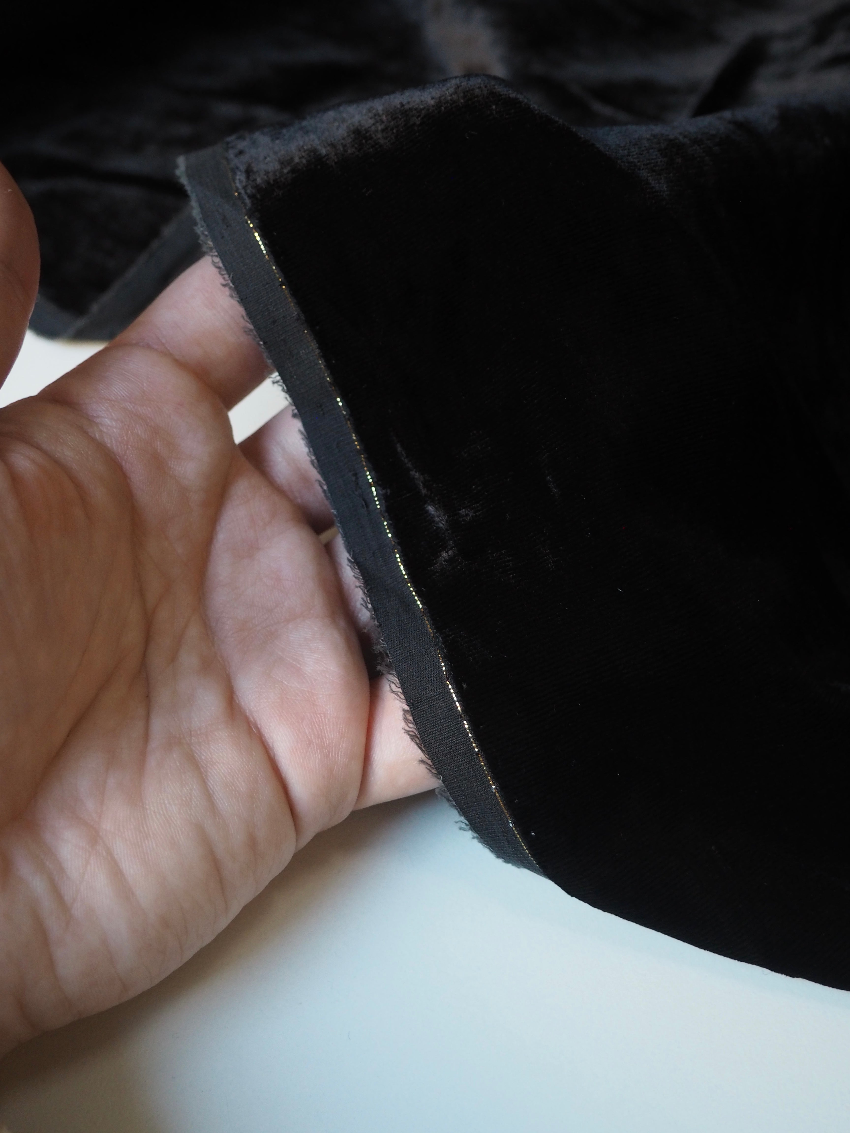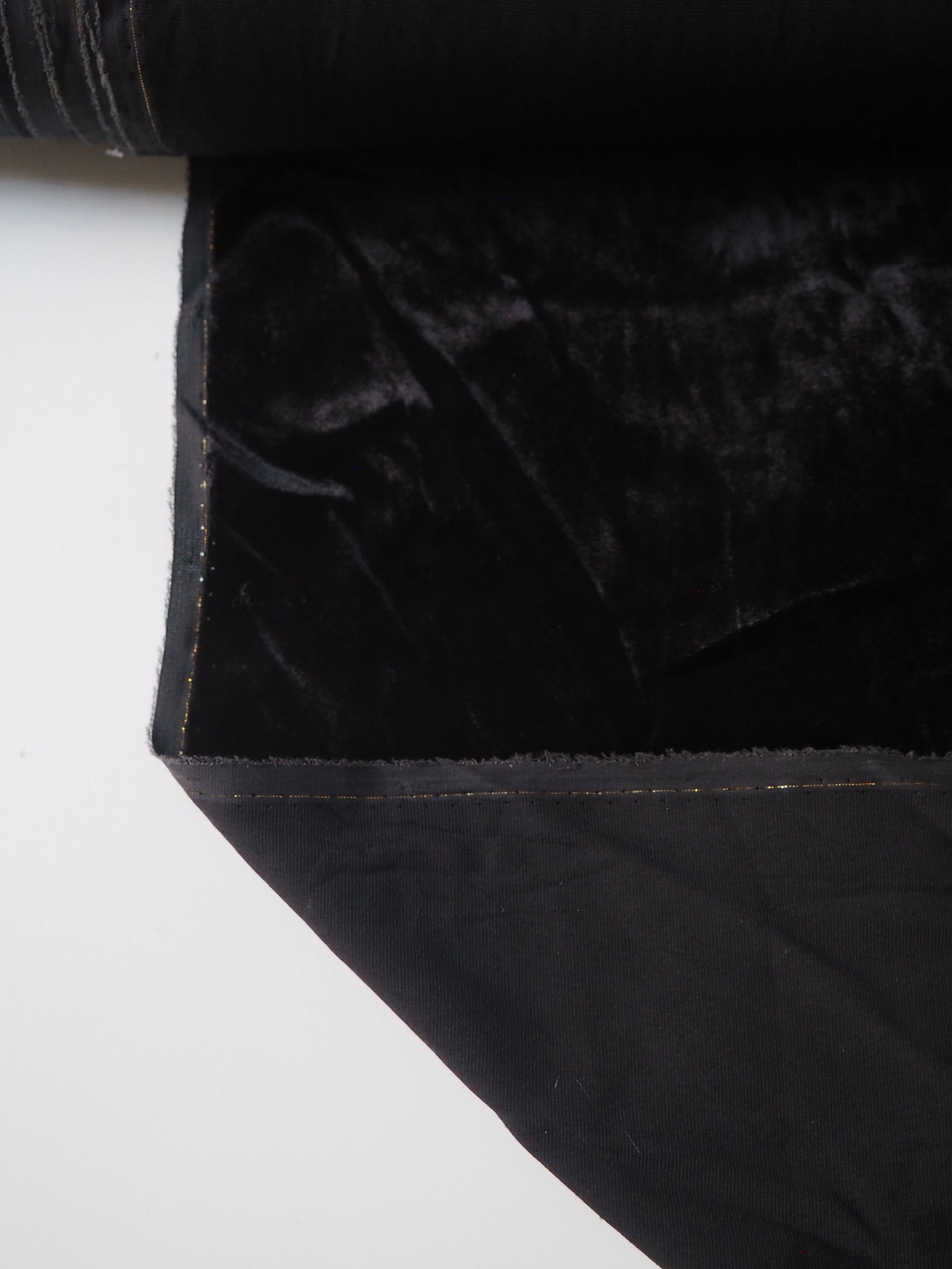 This ex-designer fabric is a sumptuous velvet. It's a fibre blend of viscose and silk, which makes it incredibly soft and luxurious. Has a 5% stretch for ease, width-ways. Has a slightly crushed looking finish from delivery, but steam and brushing can revive the pile if desired. It's opaque, with such a beautiful sheen as well. Has a light to medium pile that is wonderful to handle. Lightweight and with a beautiful drape and lovely movement. Perfect for a dress or even a blouse!