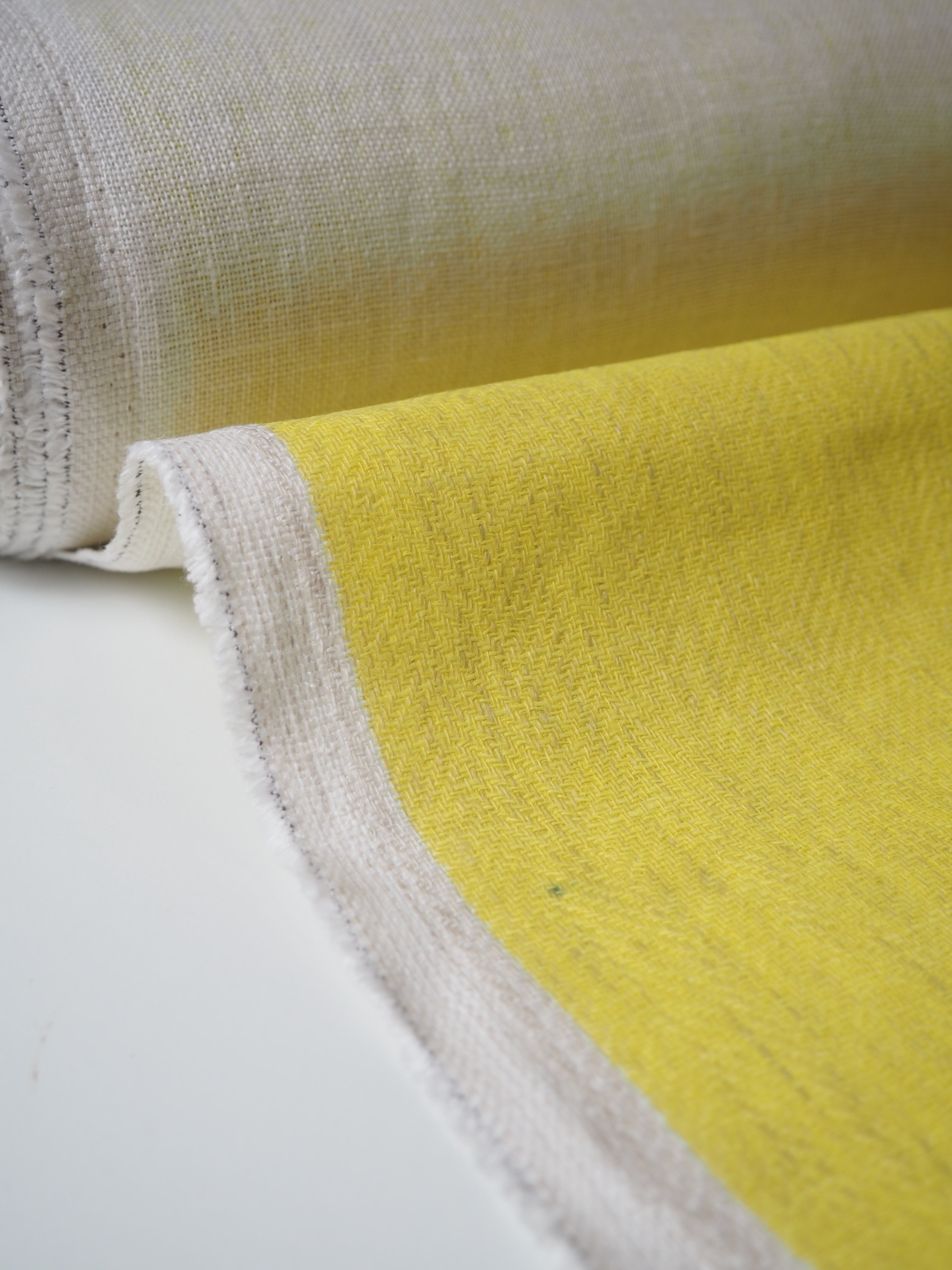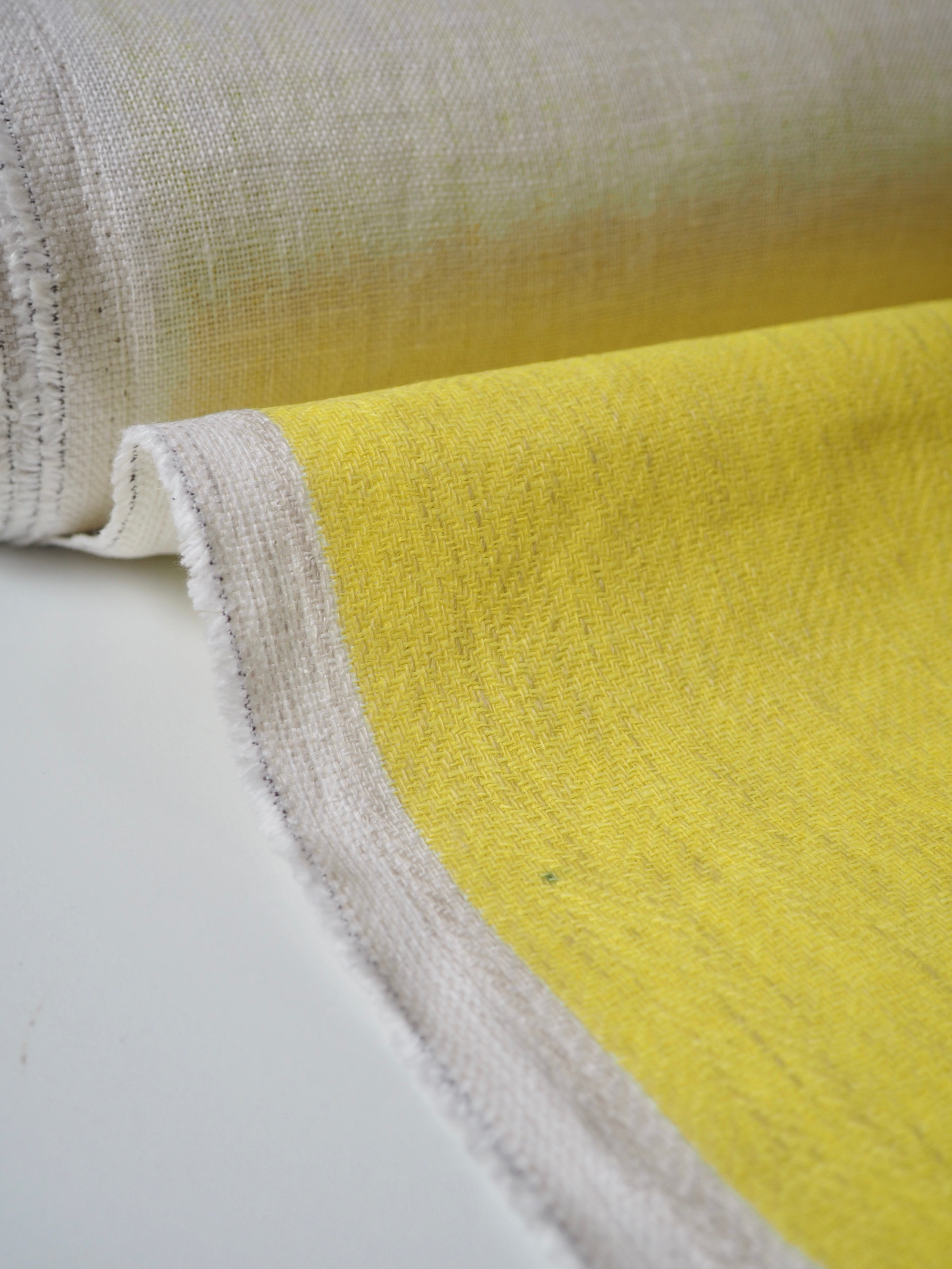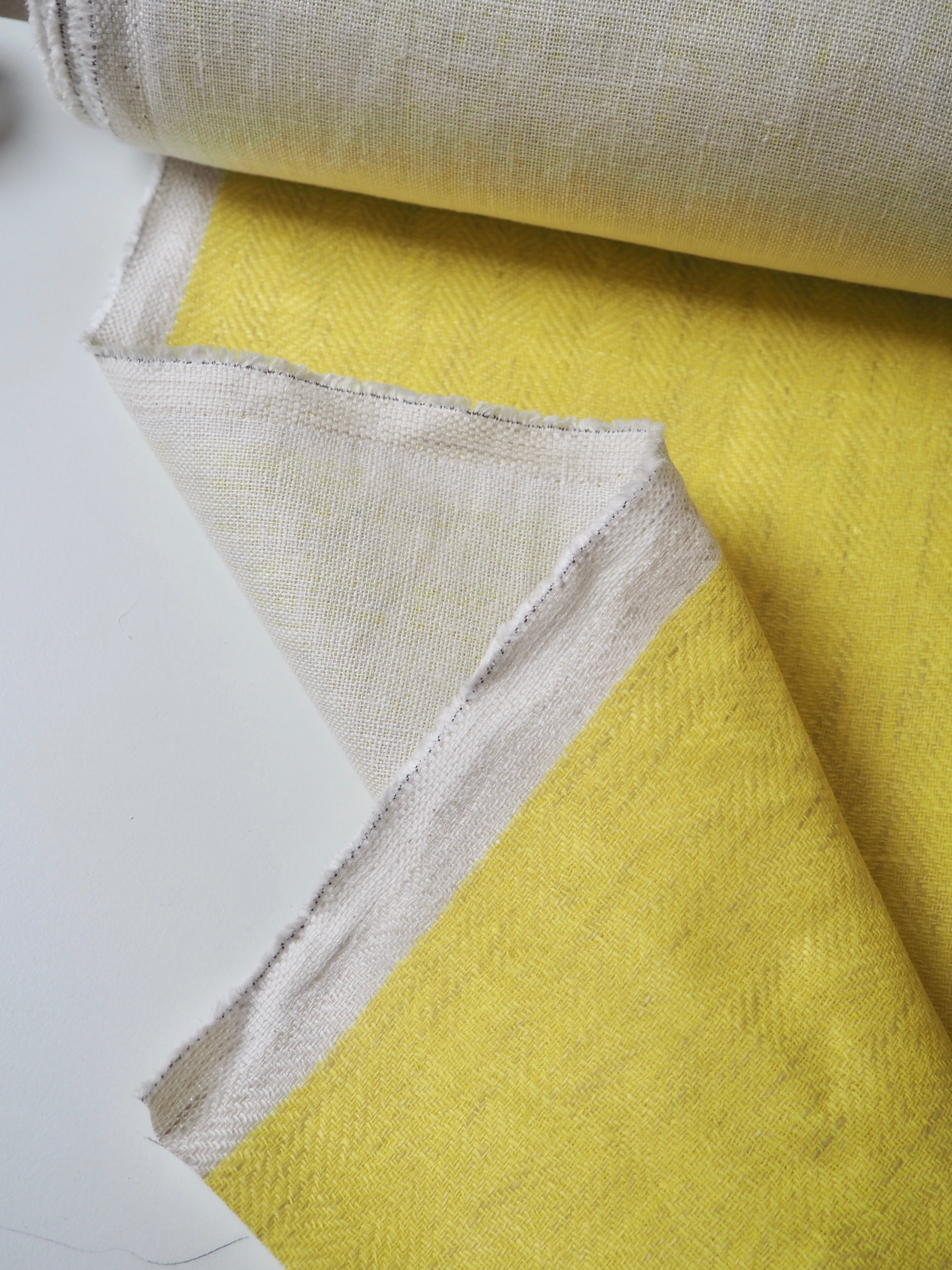 This ex-designer fabric is a heavy linen. It's in a bright, electric yellow shade that's almost been coated on the topside, with a white reverse. It has a sturdier linen weave with a typical linen texture, and is double faced. It has a slight sheen and smooth handle. Medium to heavy weight with a great structure to play with, and fully opaque. Great for bags, home wares, or even a structured jacket!