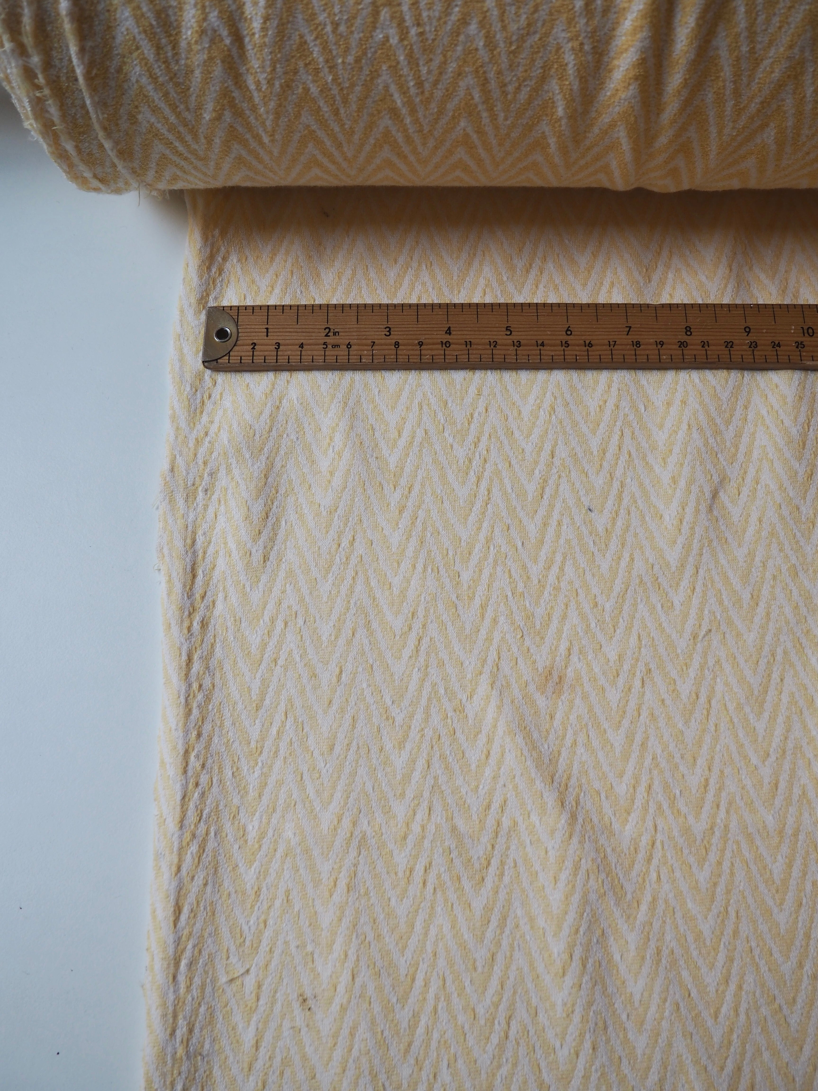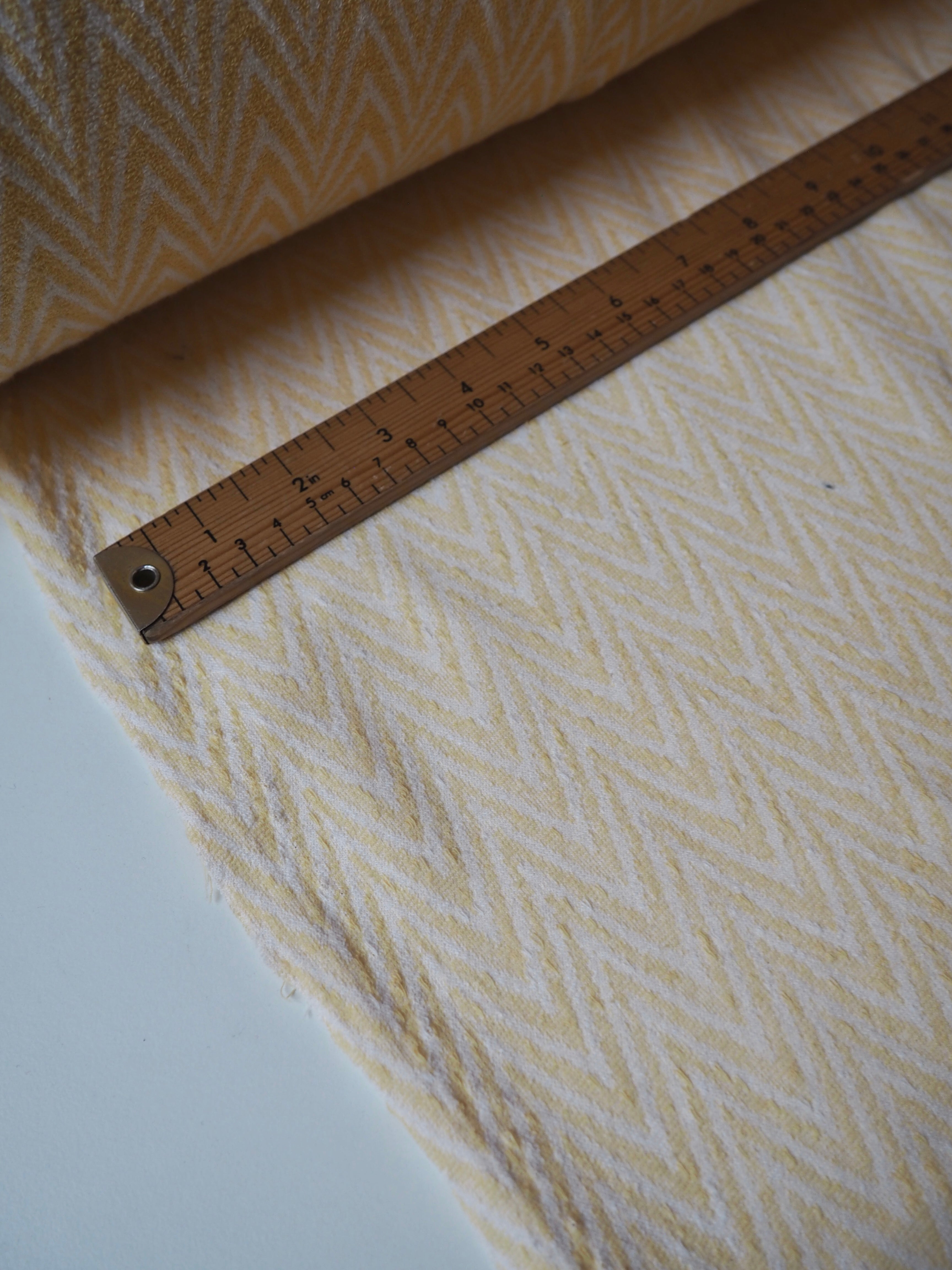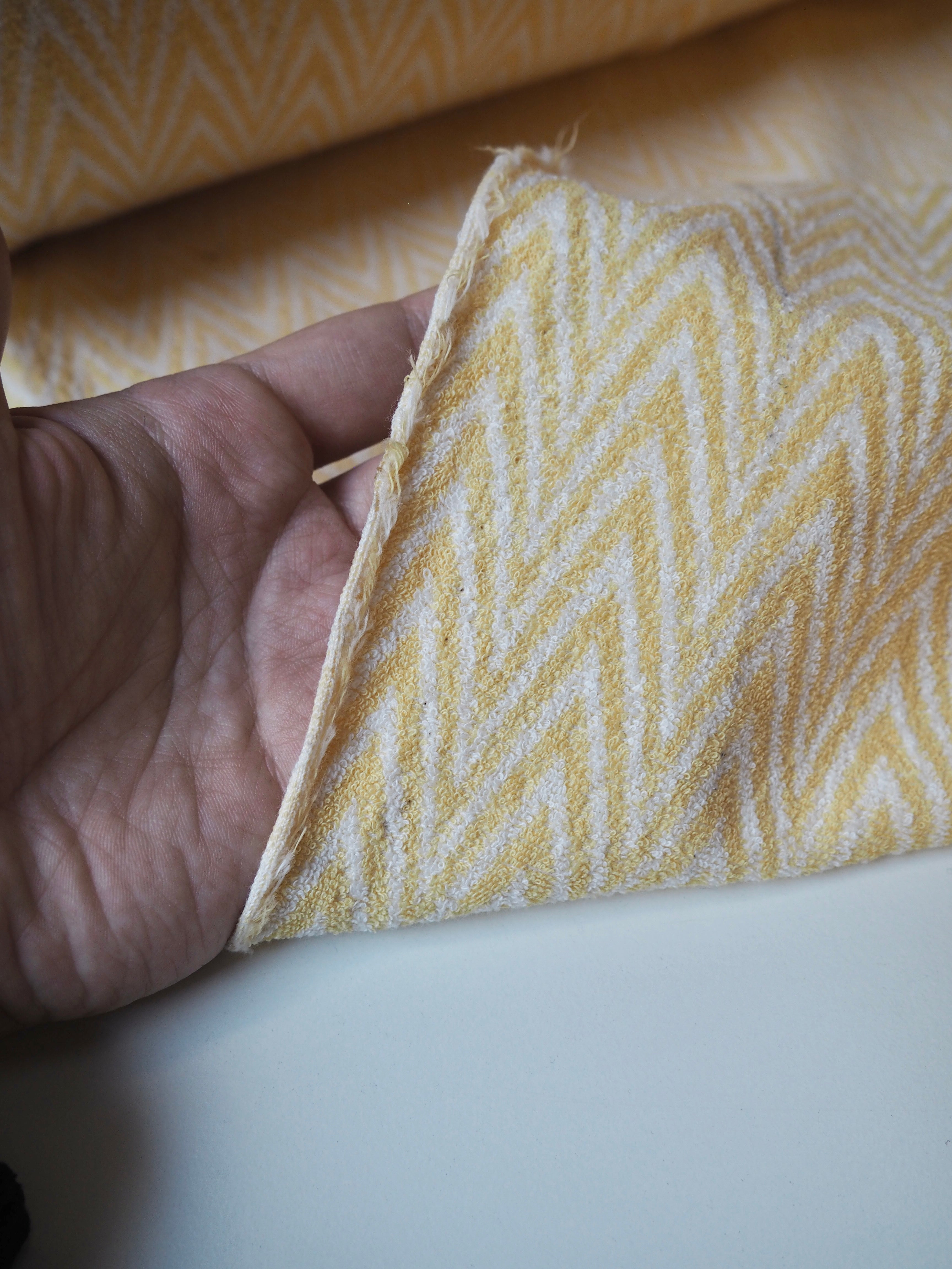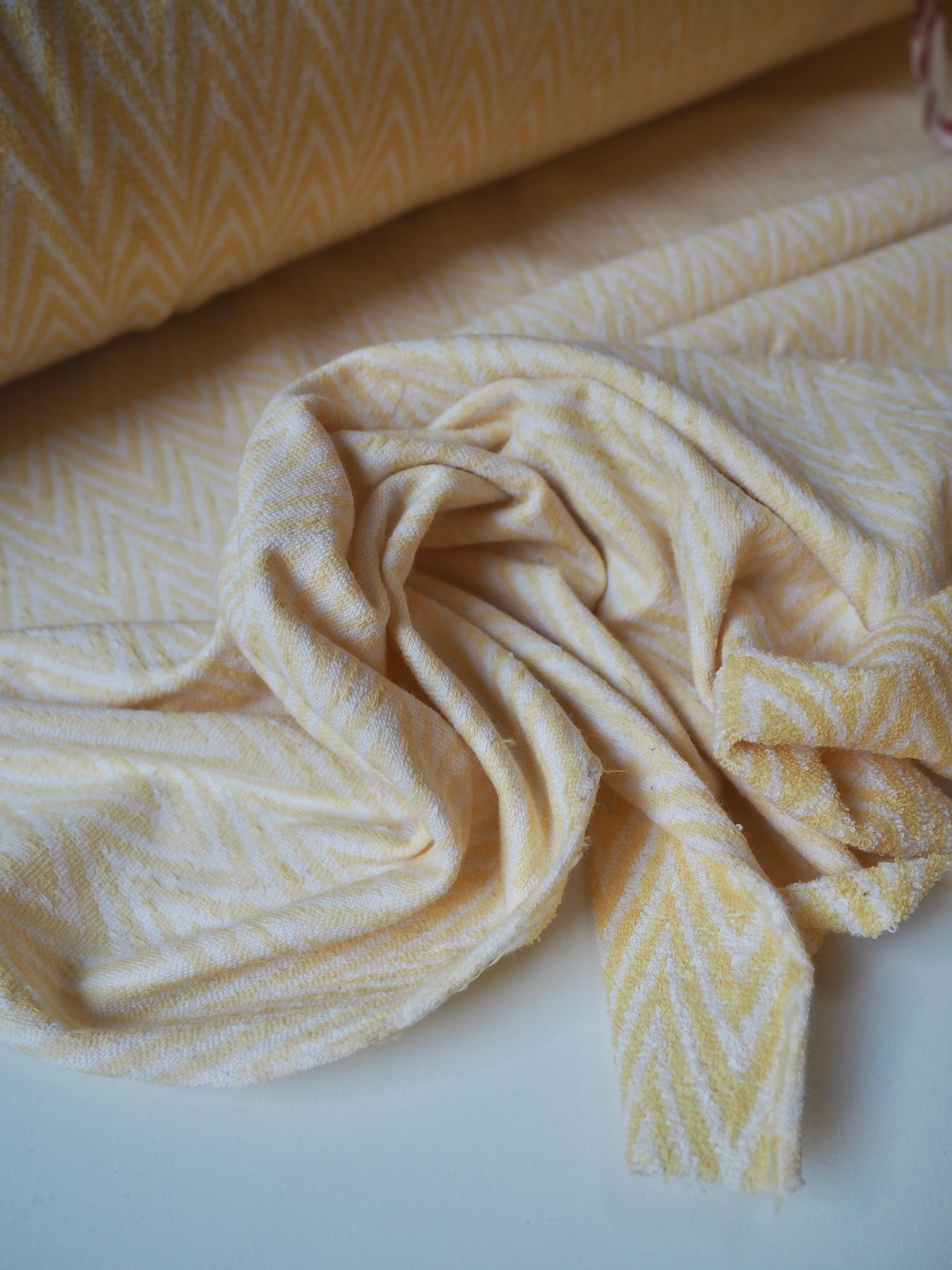 This ex-designer fabric is a soft organic loopback jersey. It has a loopback, or French Terry, weave, with a yellow chevron pattern. Medium weight, opaque, and super soft! Has a gentle structure and about 20-30% stretch. Perfect for a sweatshirt or kids clothes!