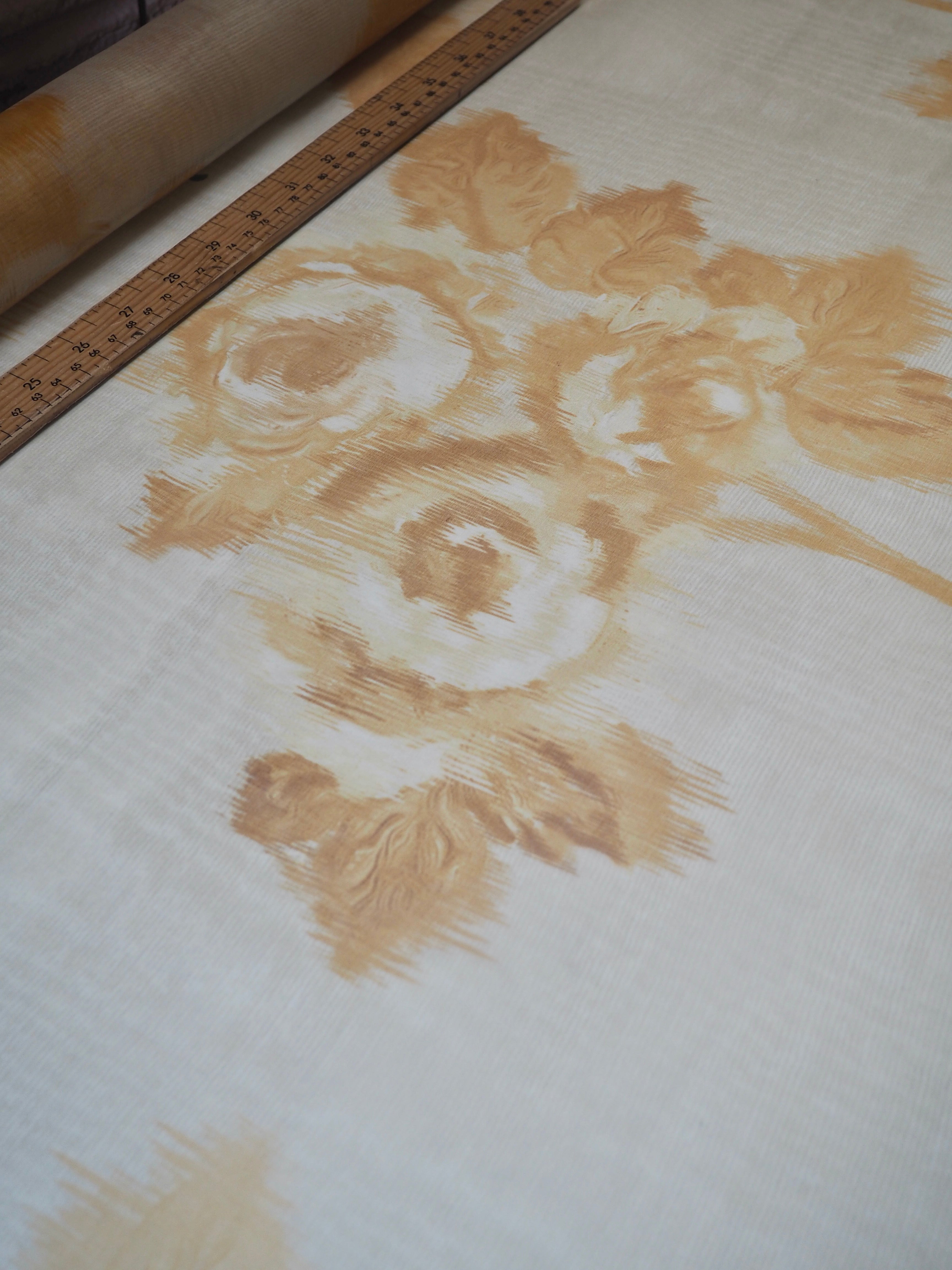 This ex-designer fabric is a silk organza. Yellow roses are moiré warp printed on this organza. It was a bespoke print for the London-based designer. It has a beautiful sheen finish that catches the light as it moves. Sheer, with a luxurious handle and lovely structure. Perfect for use in occasion wear, and it stands away from the body really well. Also great for simple tops, sheer scrunchies, and overlays!