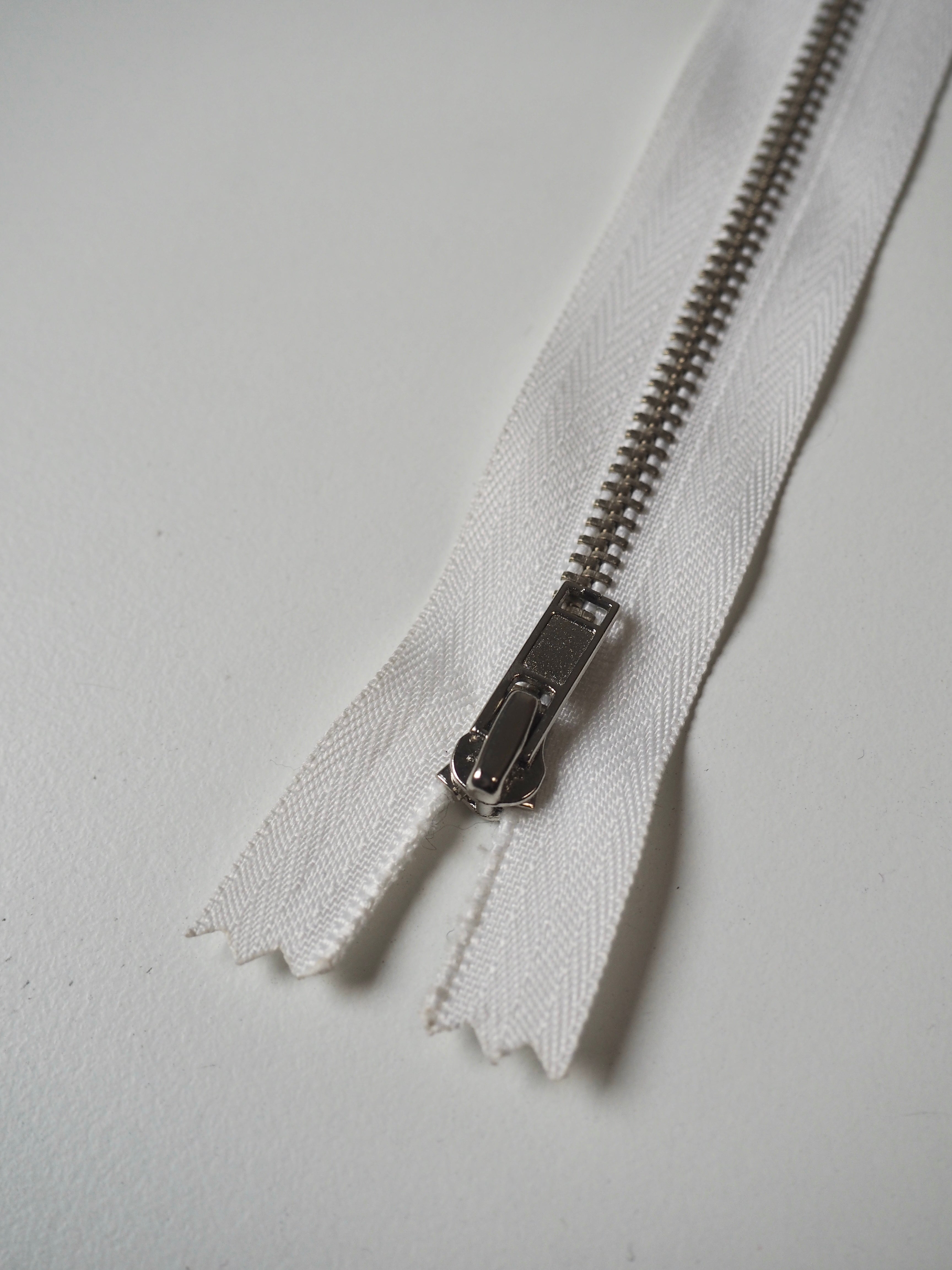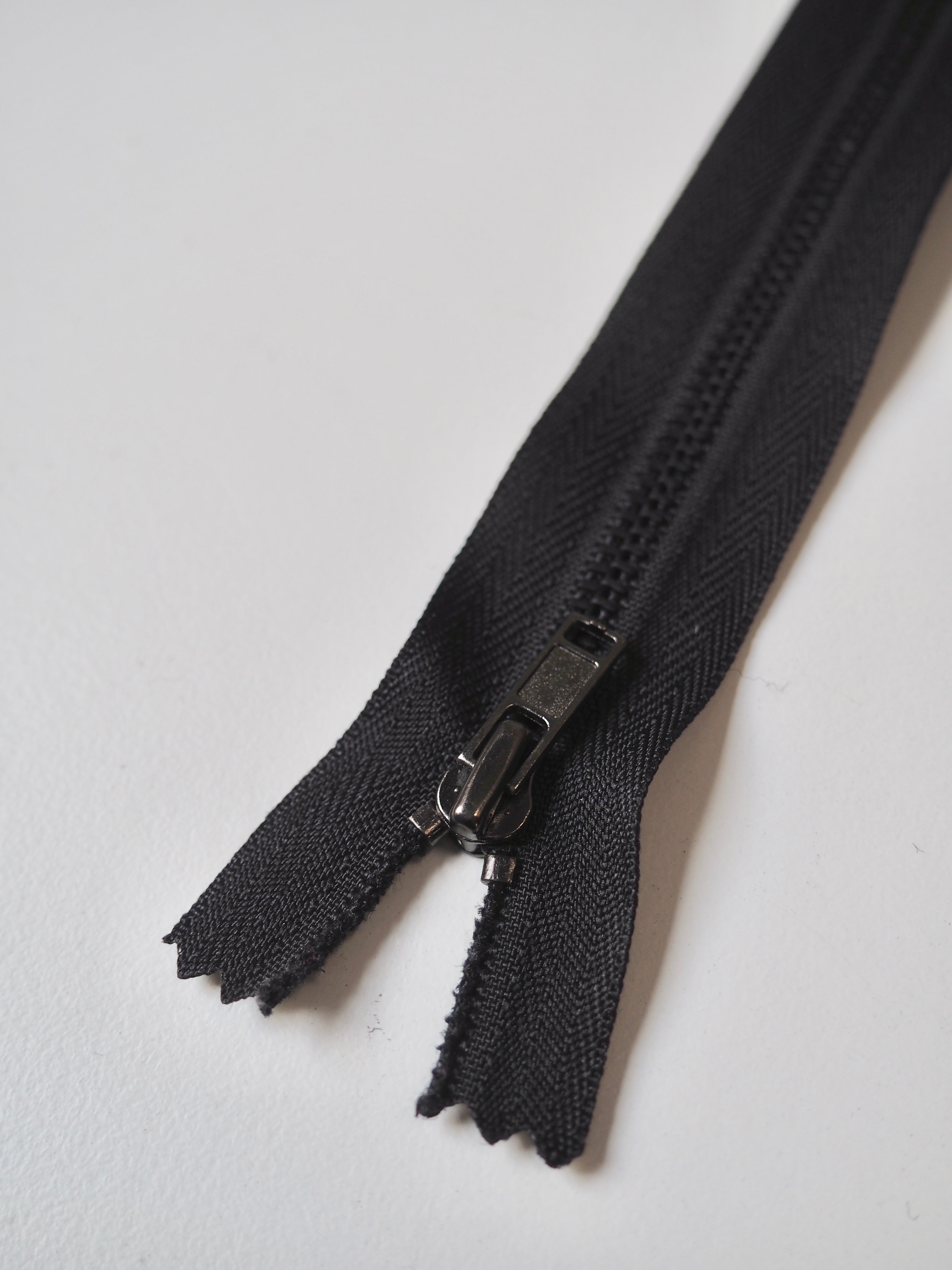 These ex-designer close-ended zips have narrow metal 4mm teeth and a metal zipper pull.