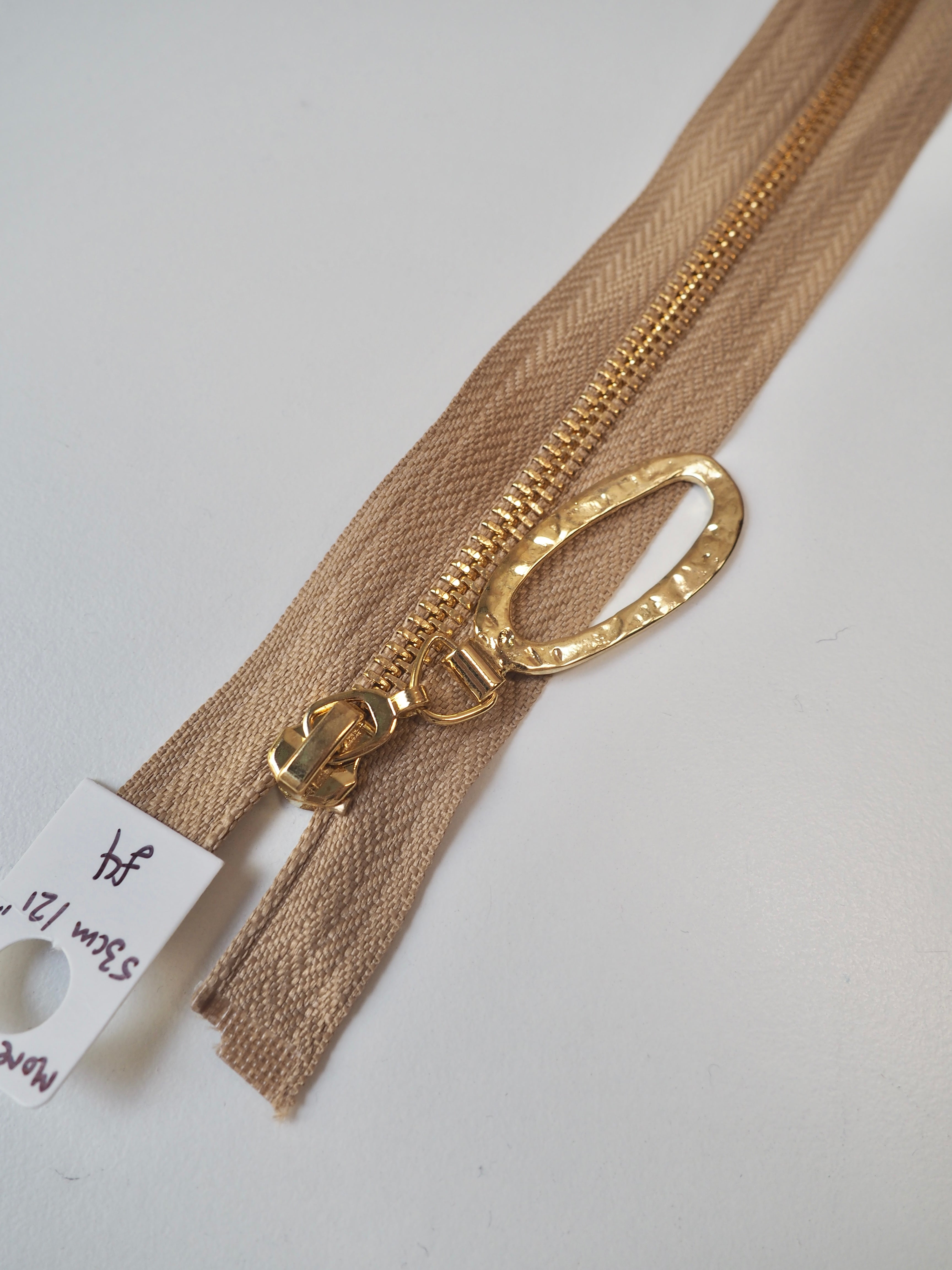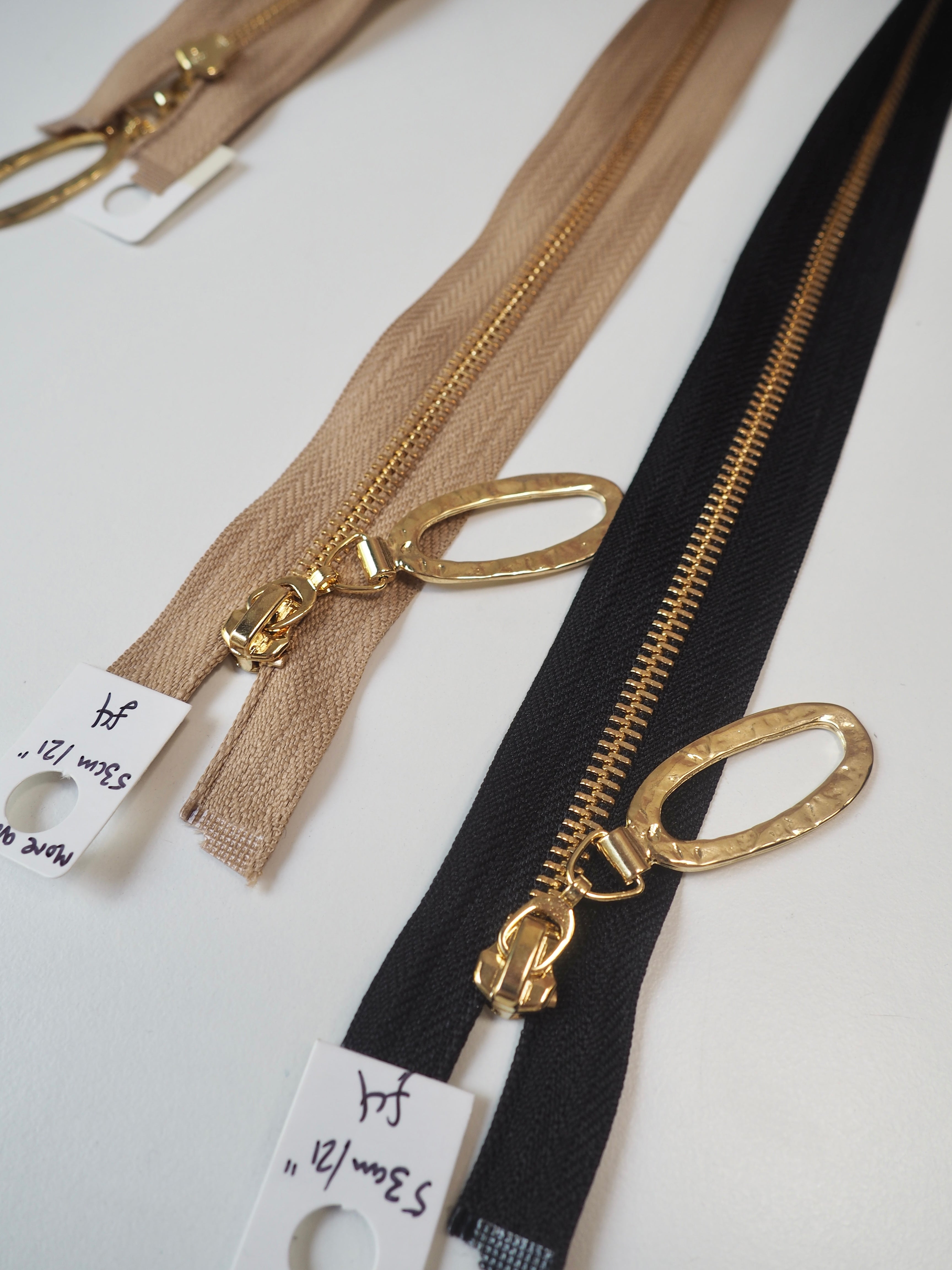 This ex-designer trim is a deadstock zip. Amazing quality and sturdy. Open-ended, coloured zip tape with gold metal teeth and a gold hammered oval metal zipper pull. 6mm teeth.