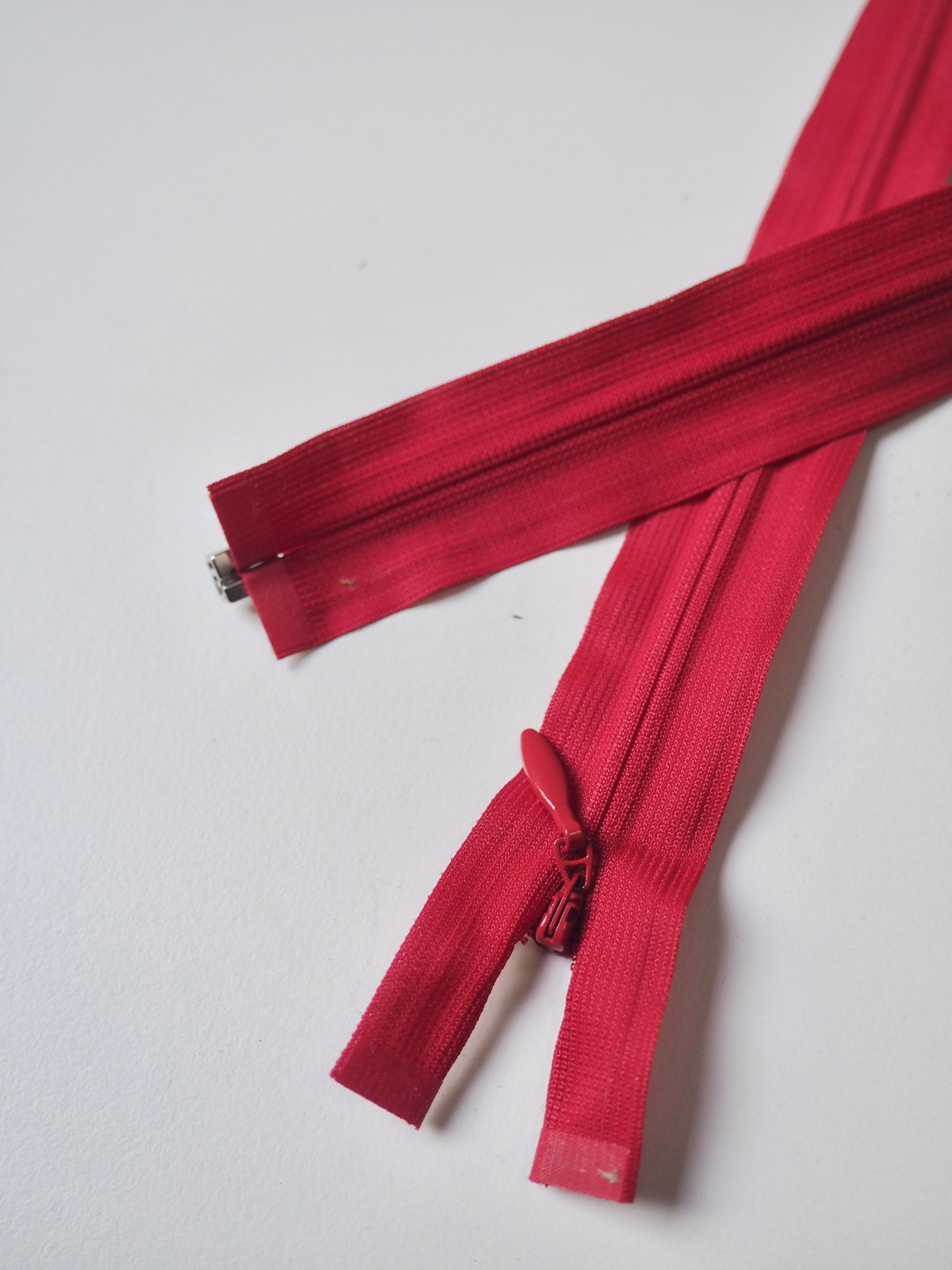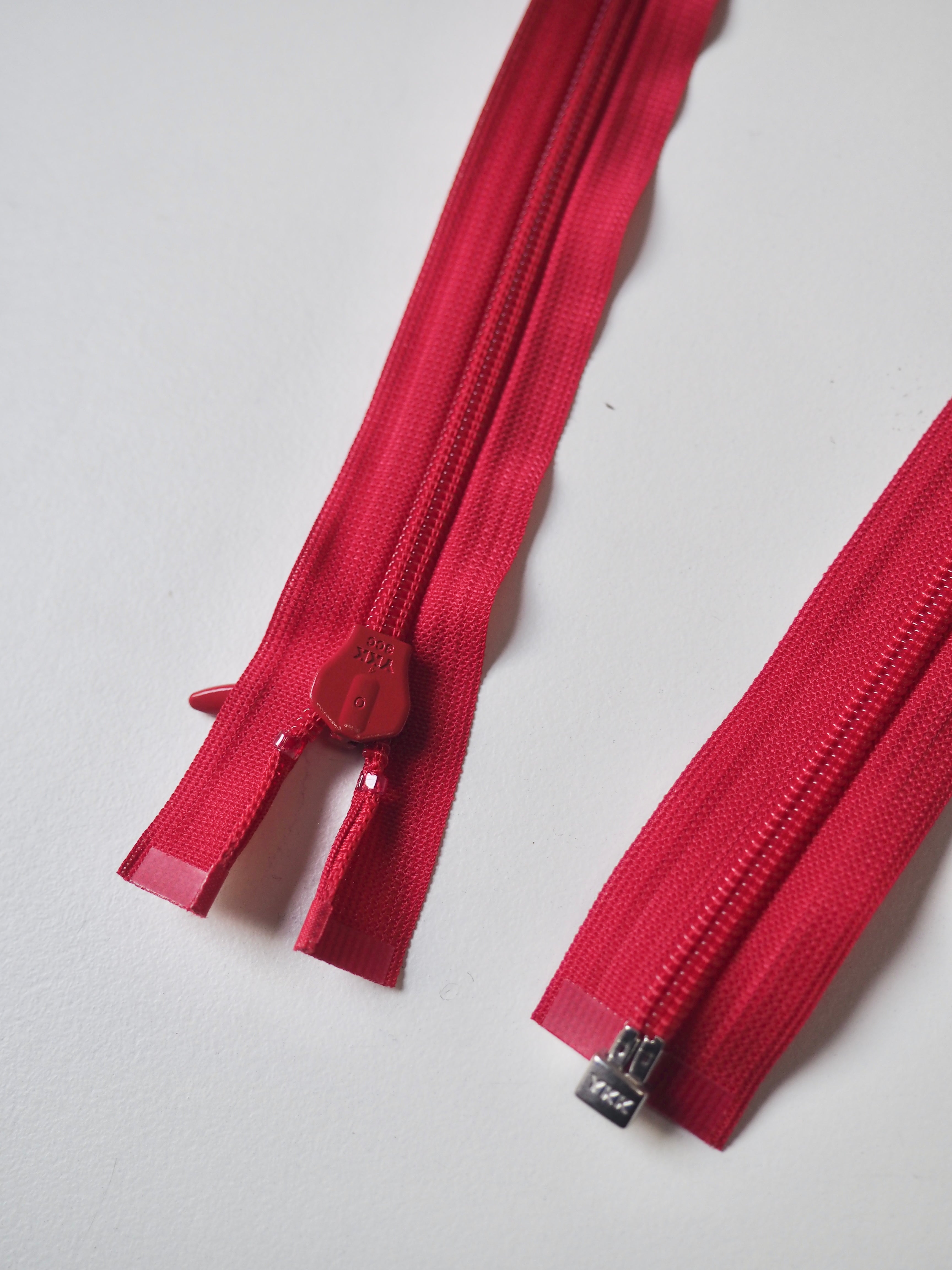 Ex-designer deadstock YKK open ended invisible zips with tonal plastic teeth and metal pull. Perfect for using as a hidden closure!