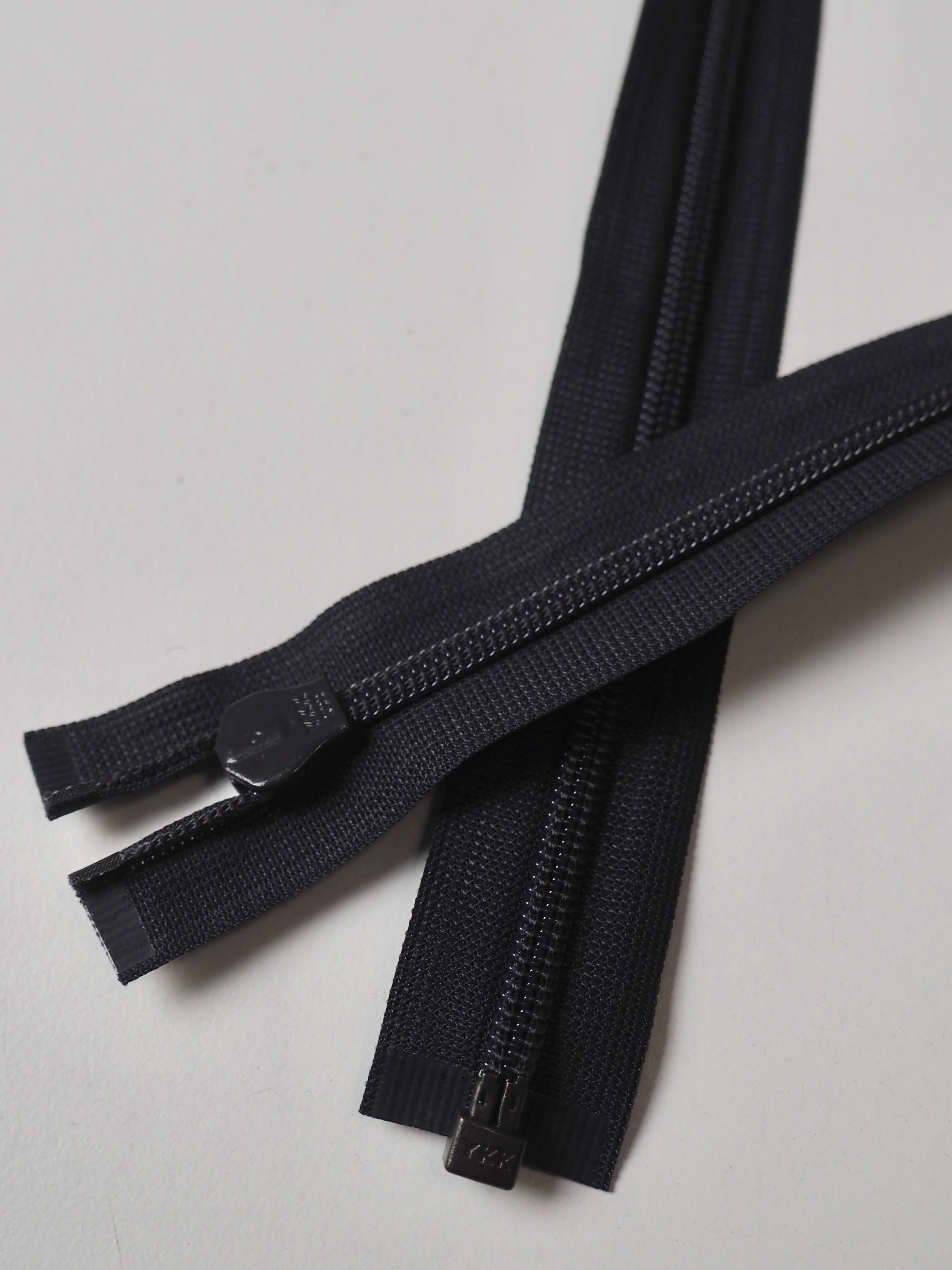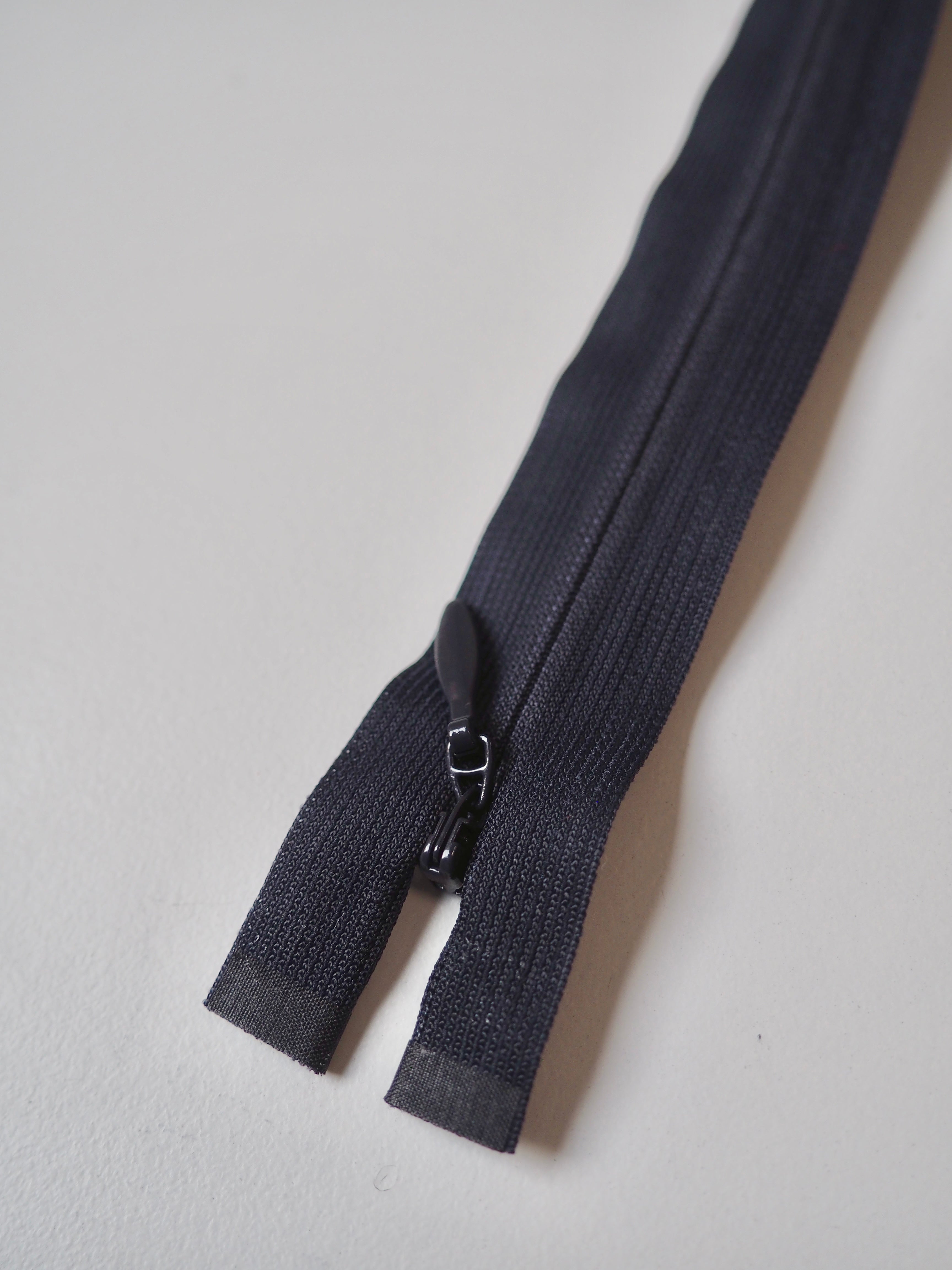 Ex-designer deadstock YKK open ended invisible zips with tonal plastic teeth and metal pull. Perfect for using as a hidden closure!