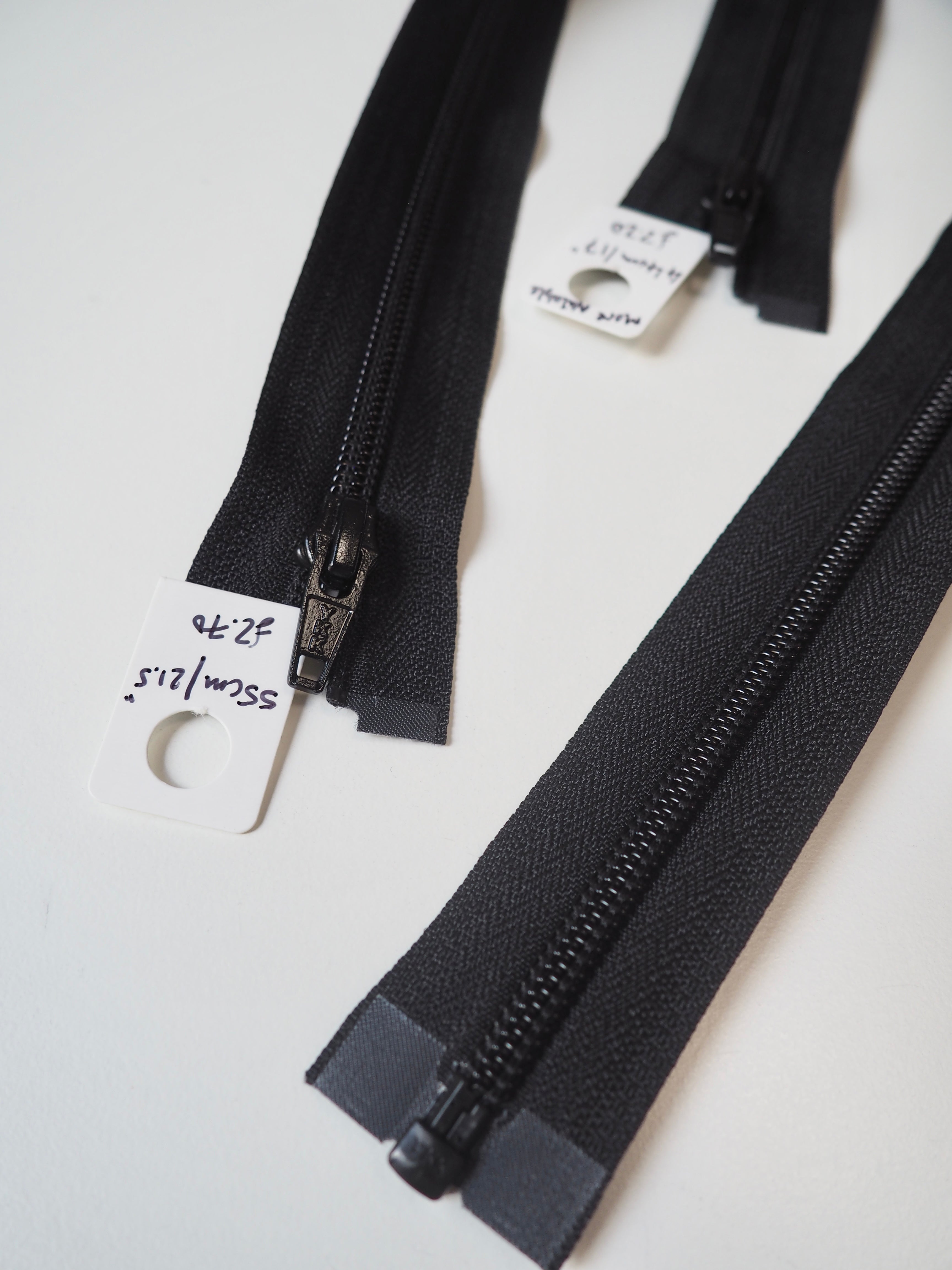 These ex-designer zips are separating zips with 6mm plastic teeth. Black tape and metal pull. Sturdy textured tape.