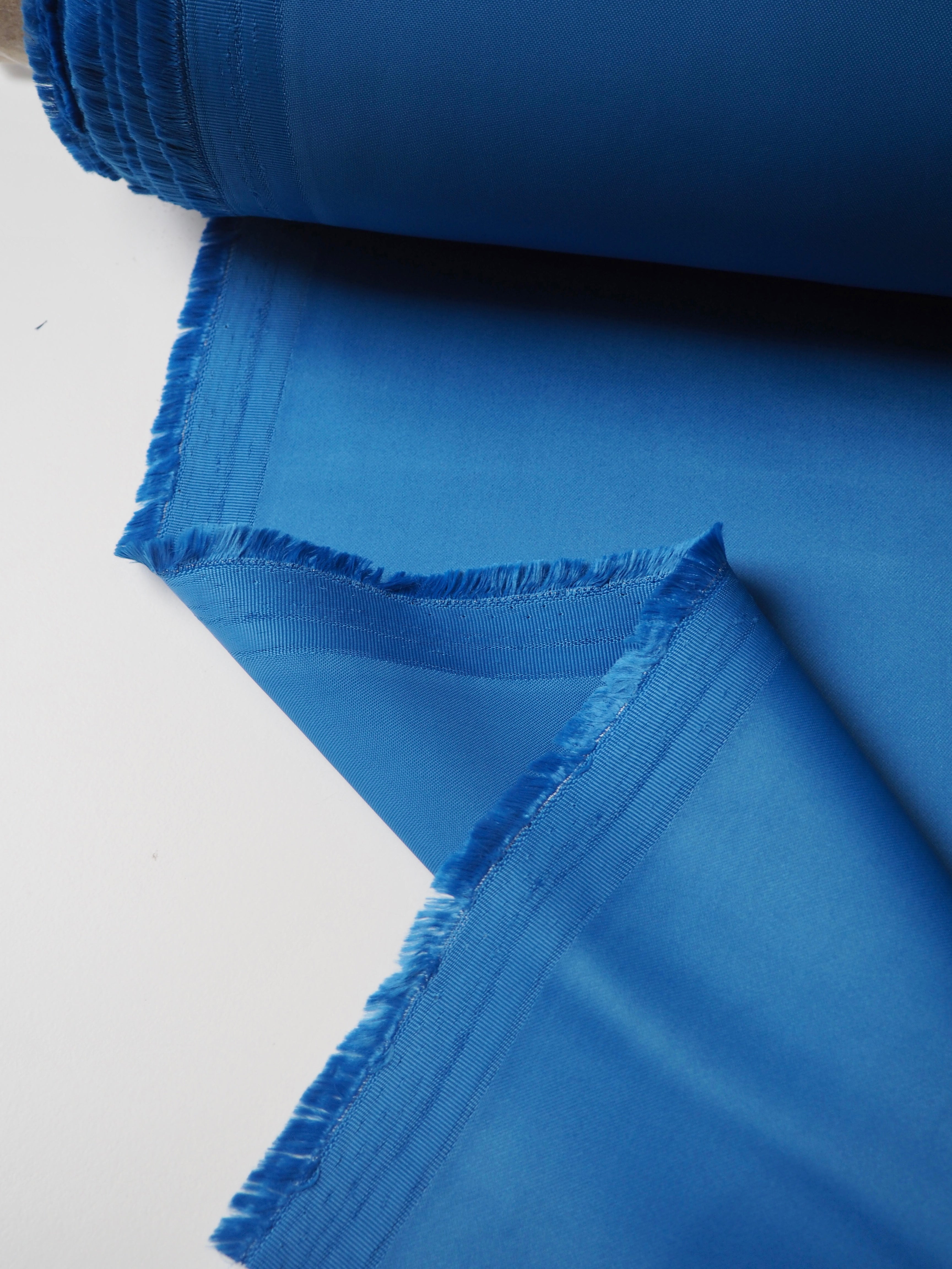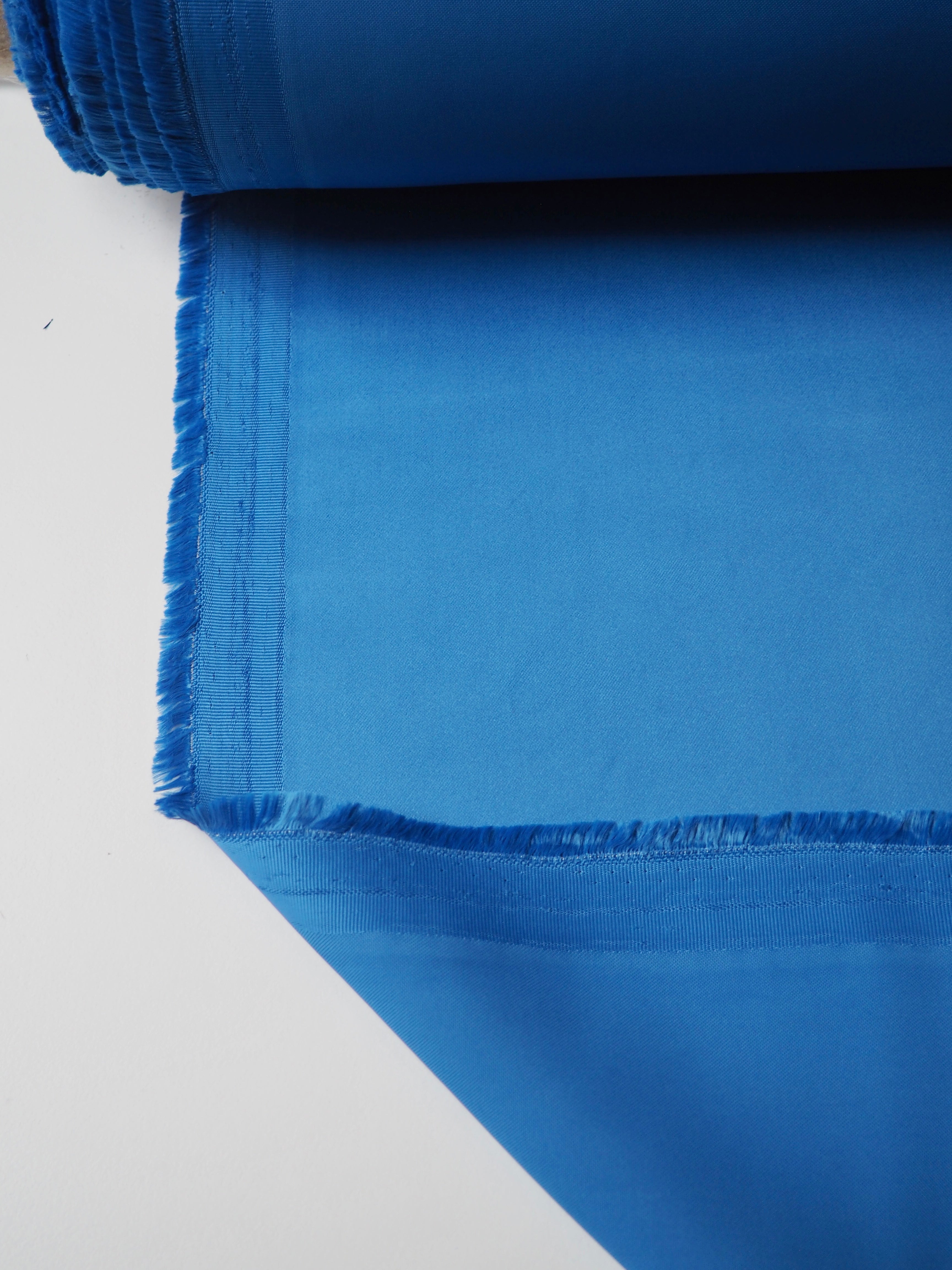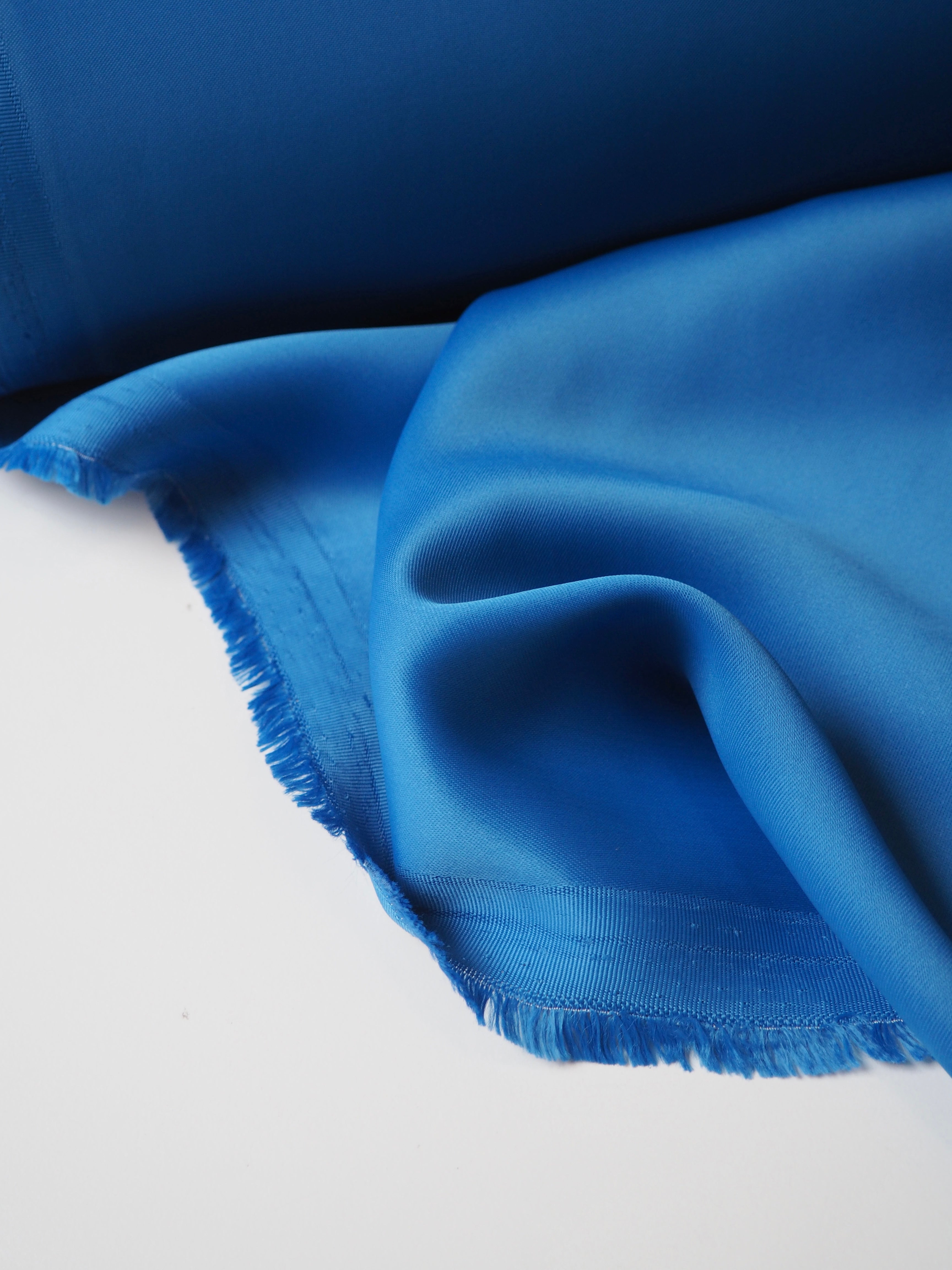 This ex-designer fabric is a heavy satin. It's in a rich azure blue shade, with a heavy, denser weight. It has a smooth satin topside, and a slightly more textured, almost twill-like reverse. Has a heavy drape and good movement, and a lovely satin sheen on the topside. It's a more technical weight that suits tailored projects or home projects!