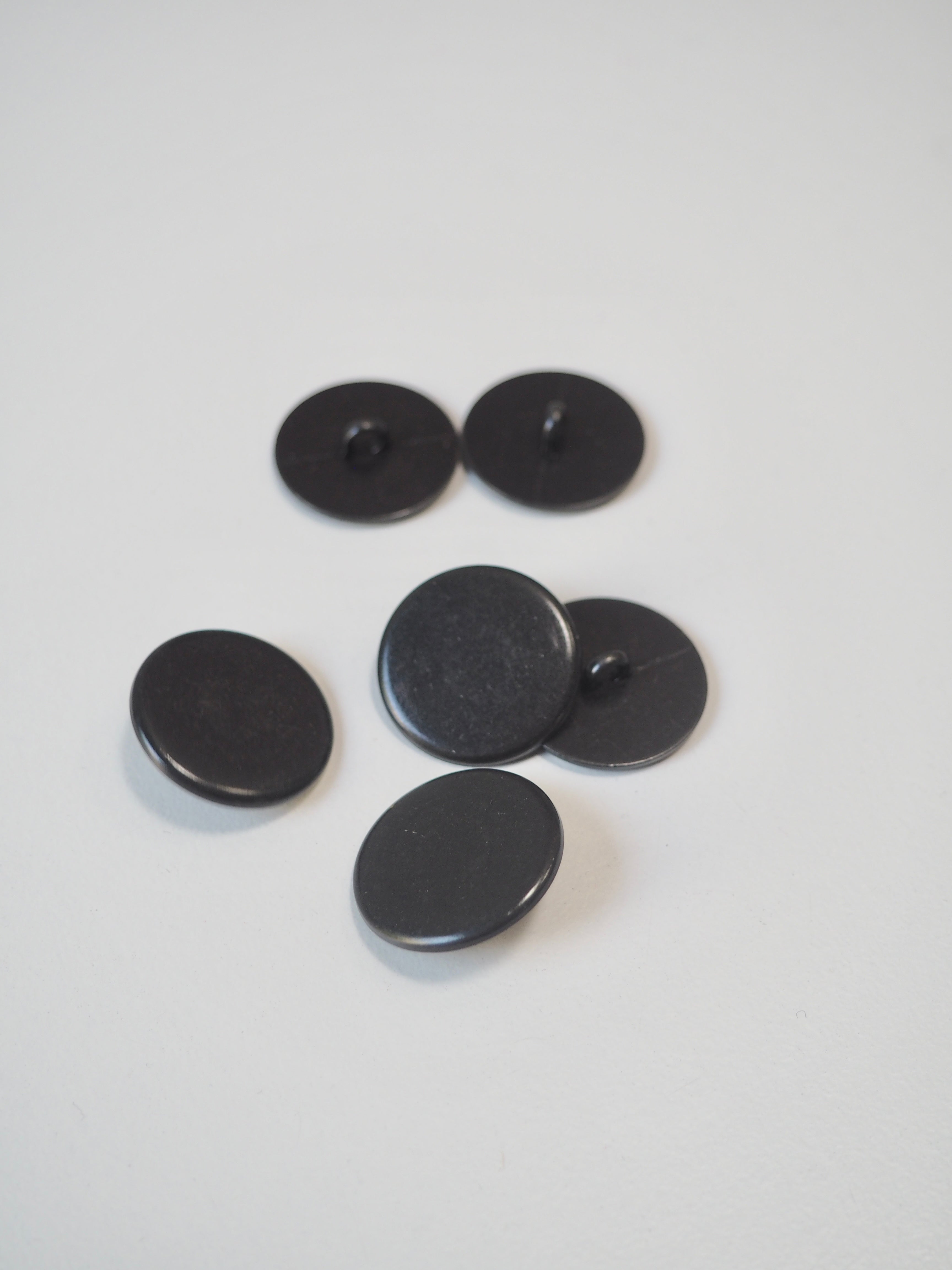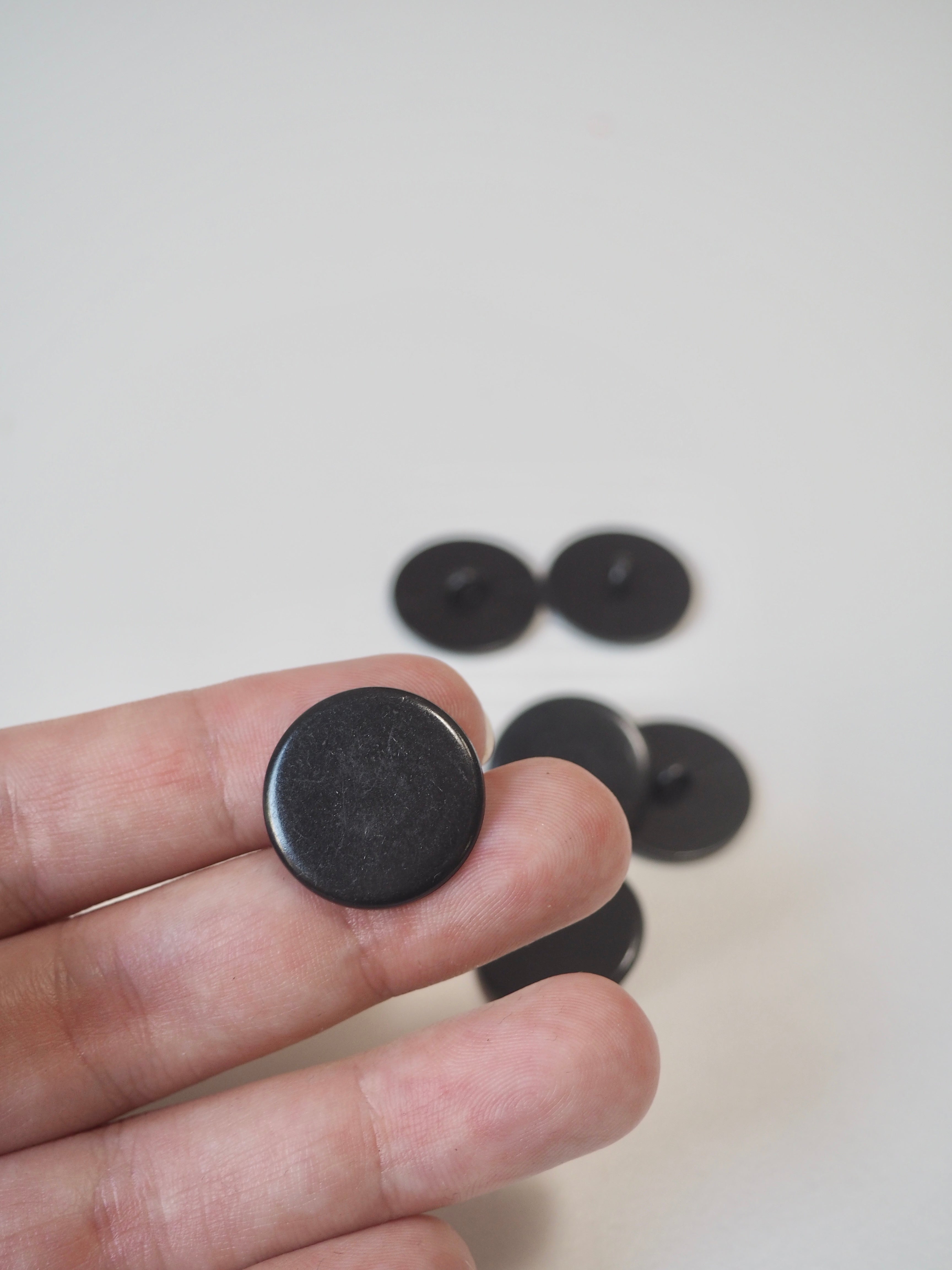 This ex-designer hardware is a shank button. Matte black finish with a flat top and a shank attachment.