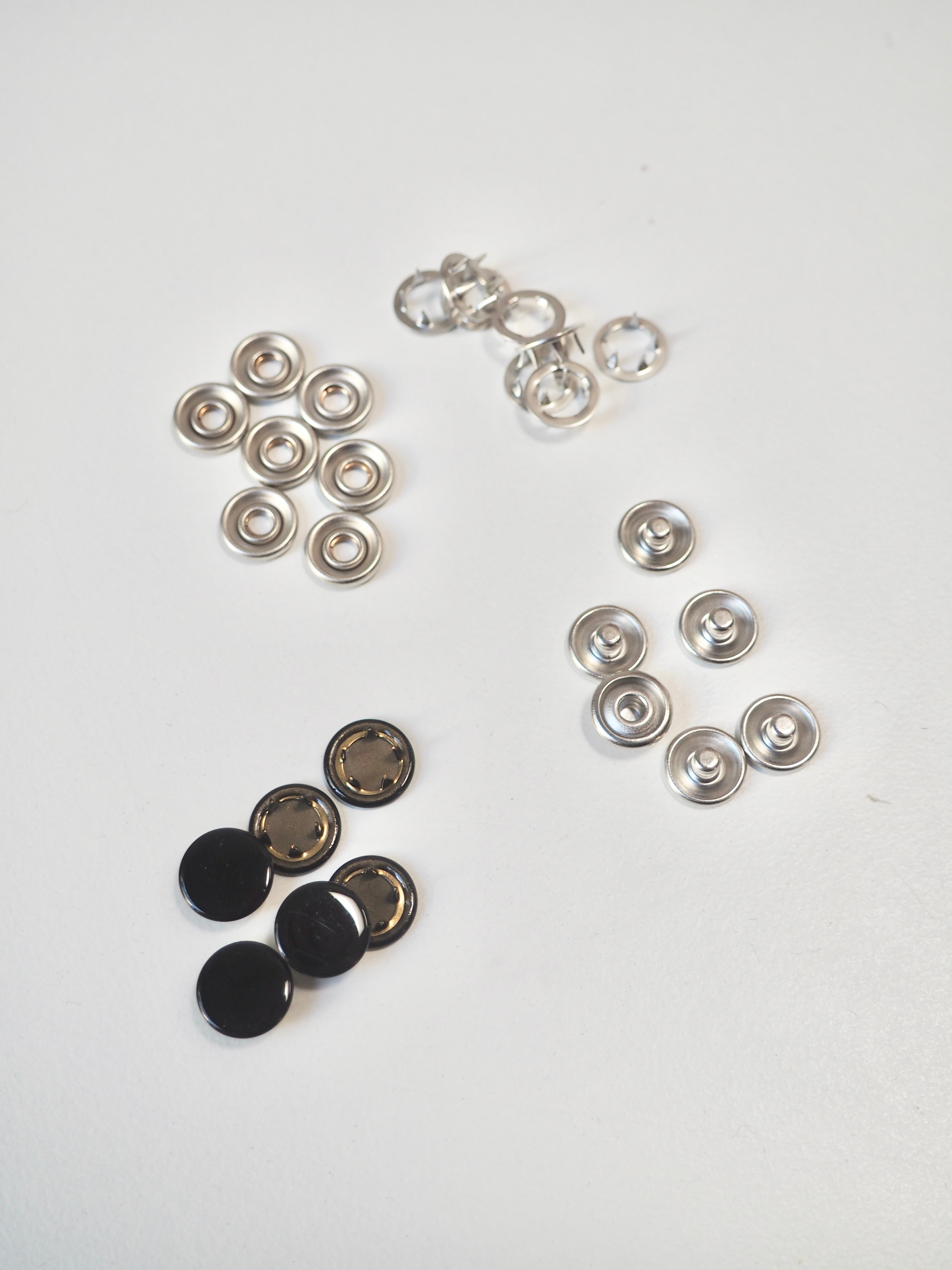 This ex-designer hardware is a press stud set. These press studs, also known as poppers or snaps, are all silver components, with a shiny black top piece. They usually require a die set/machine for the right size, but these kind with prongs can usually be attached with a hammer. Ideal for jackets and shirts, but could also be used in bag making!