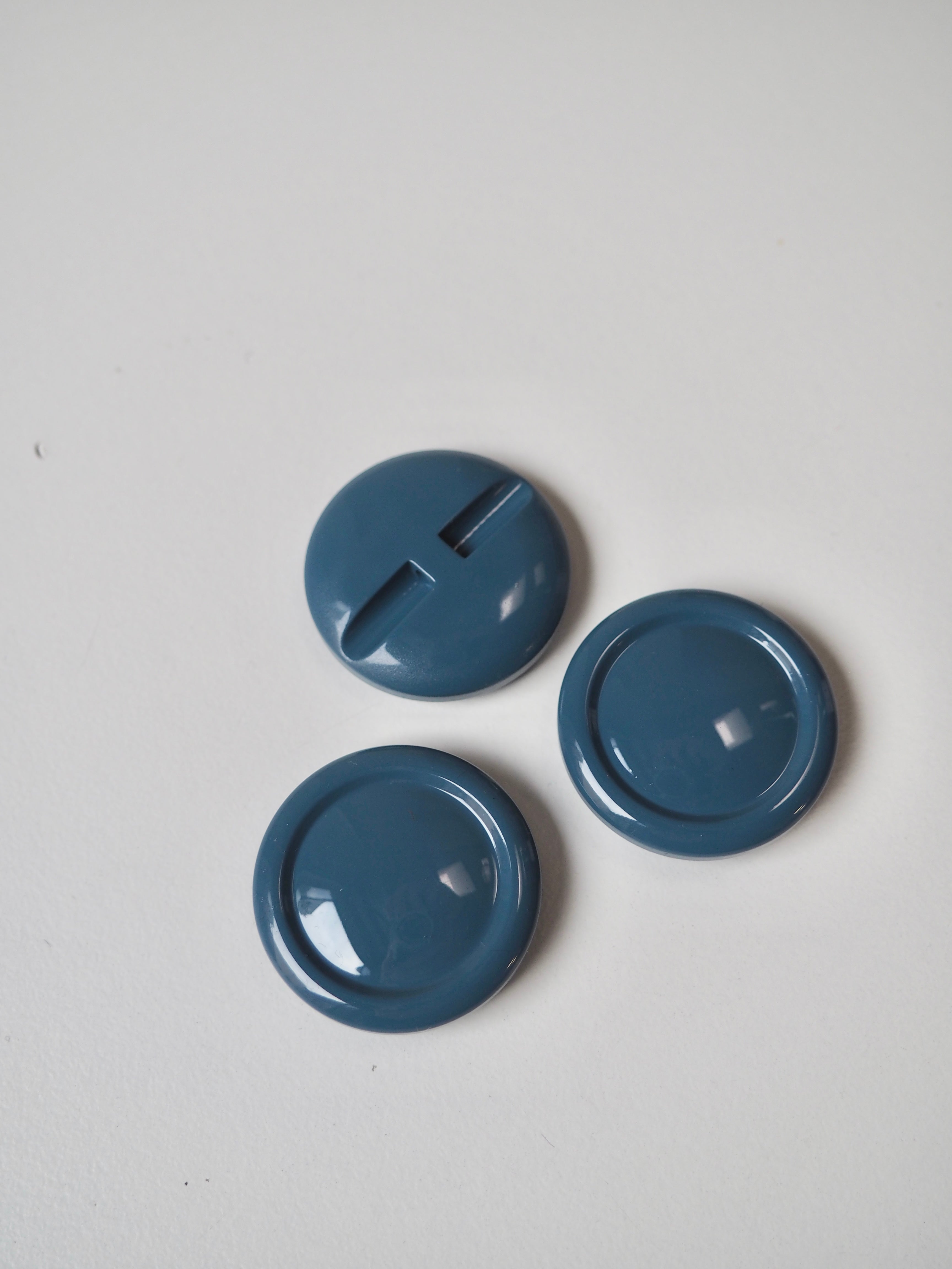 This ex-designer trim is a channel hole plastic button. They are shiny and a dark vintage cornflower faded blue colour. Perfect size for coats and jackets.