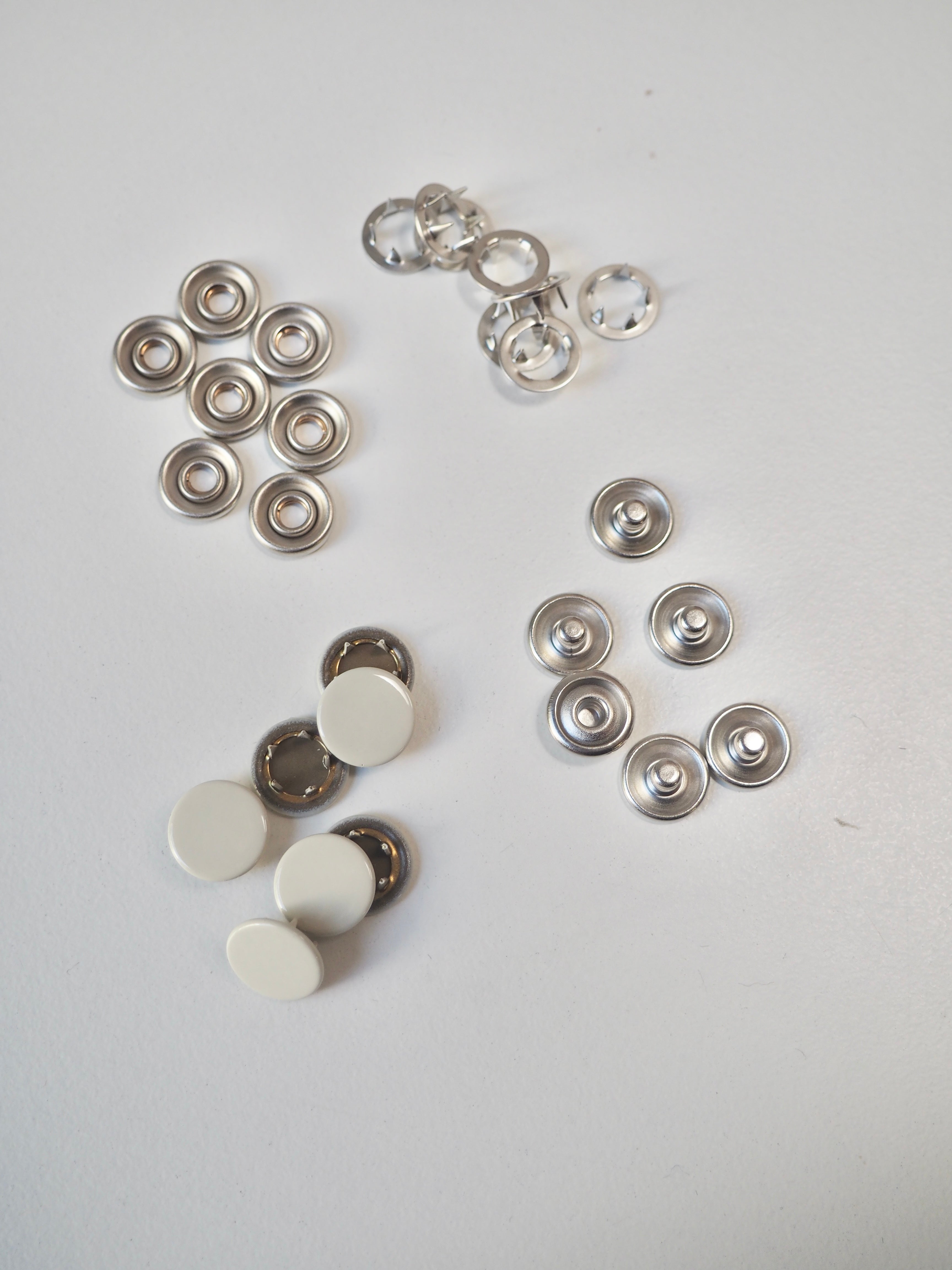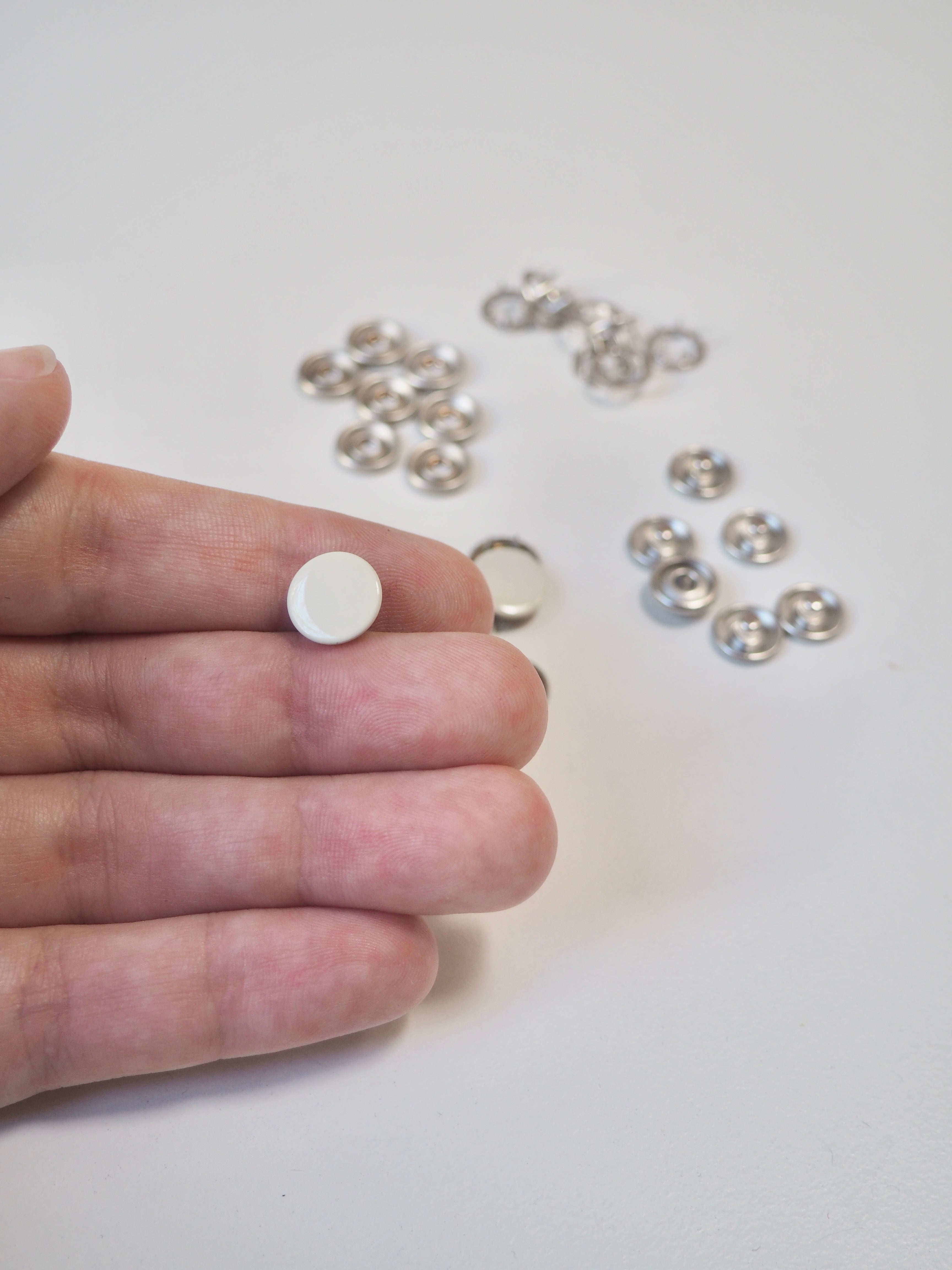 This ex-designer hardware is a press stud set. These press studs, also known as poppers or snaps, are all silver components, with a shiny cream top piece. They usually require a die set/machine for the right size, but these kind with prongs can usually be attached with a hammer. Ideal for jackets and shirts, but could also be used in bag making!