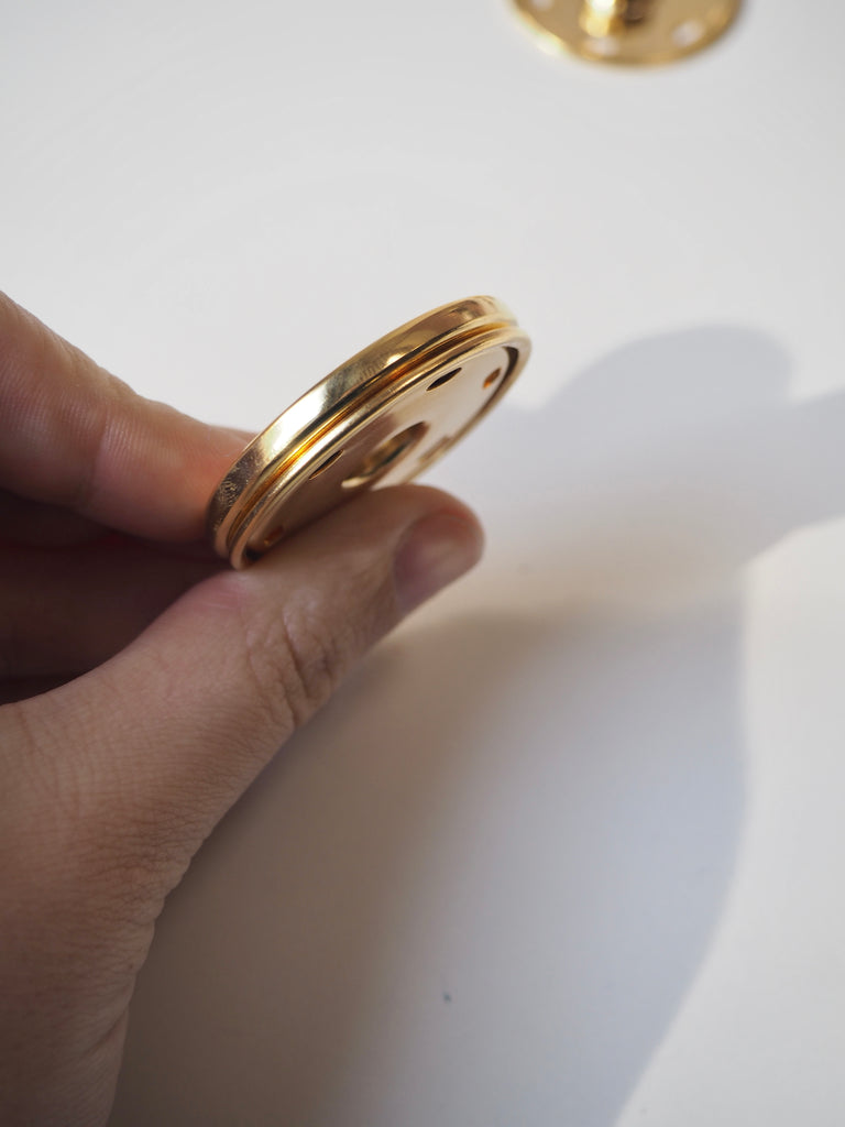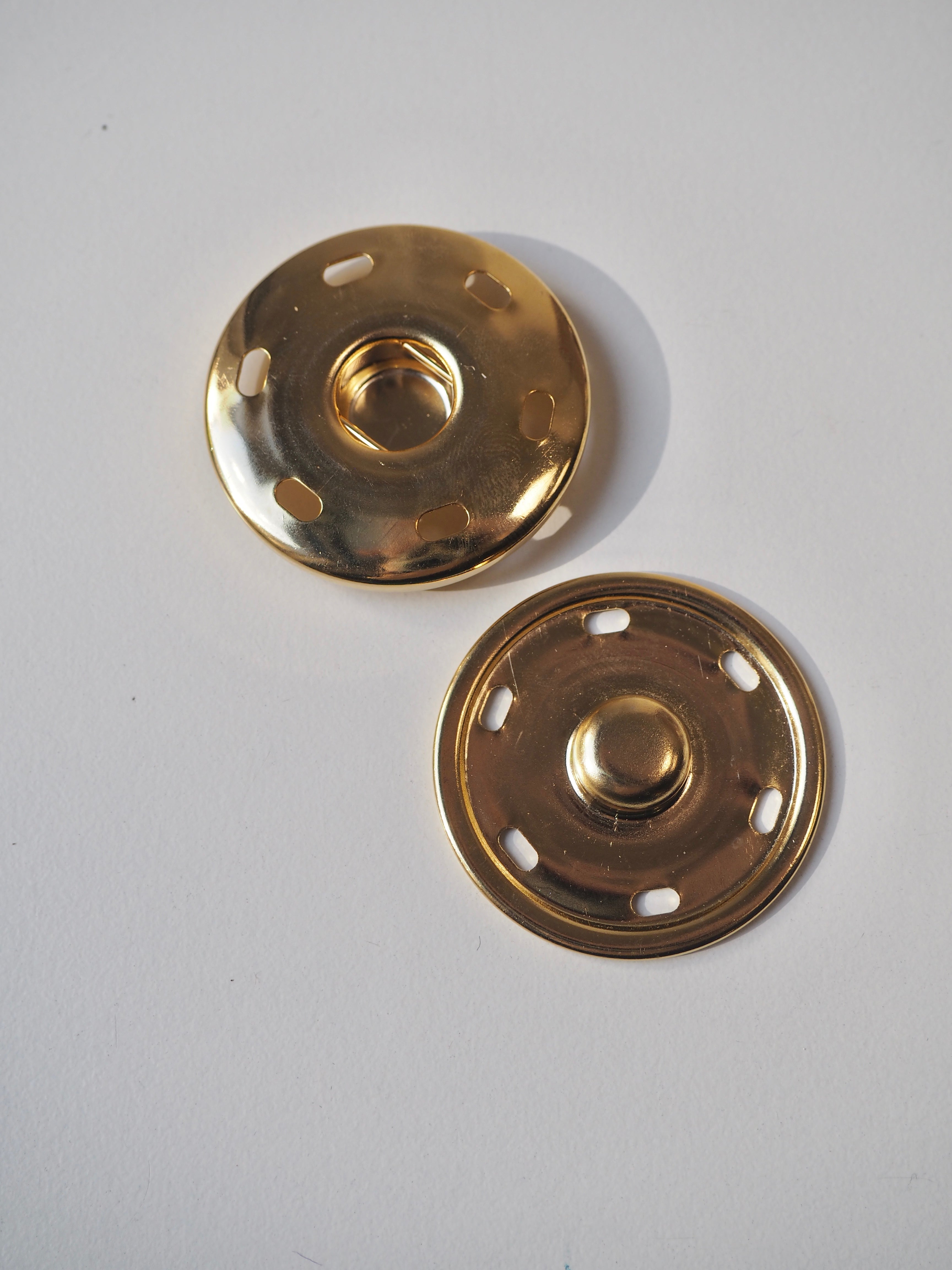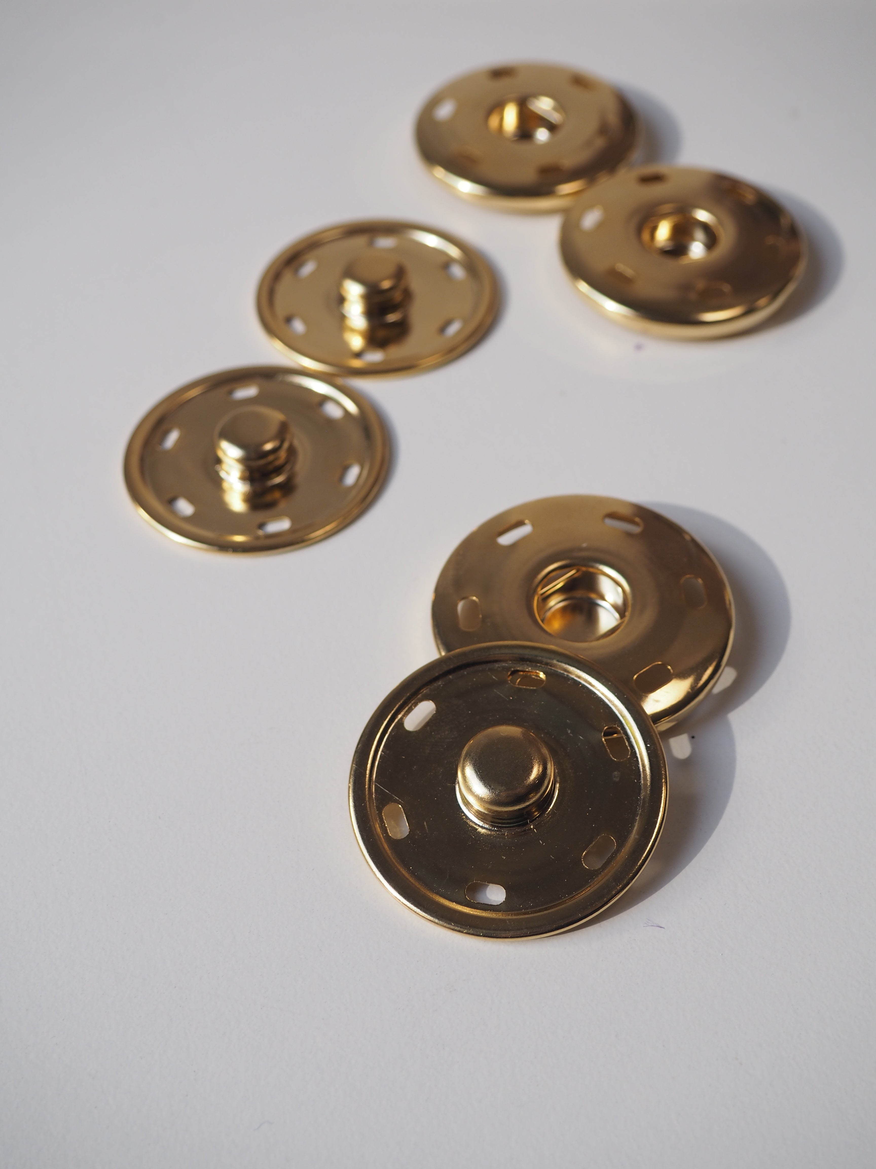 This are ex-designer sew-on poppers/snaps. In a bright gold finish. Sturdy but lightweight, perfect for jackets, coats and accessories!