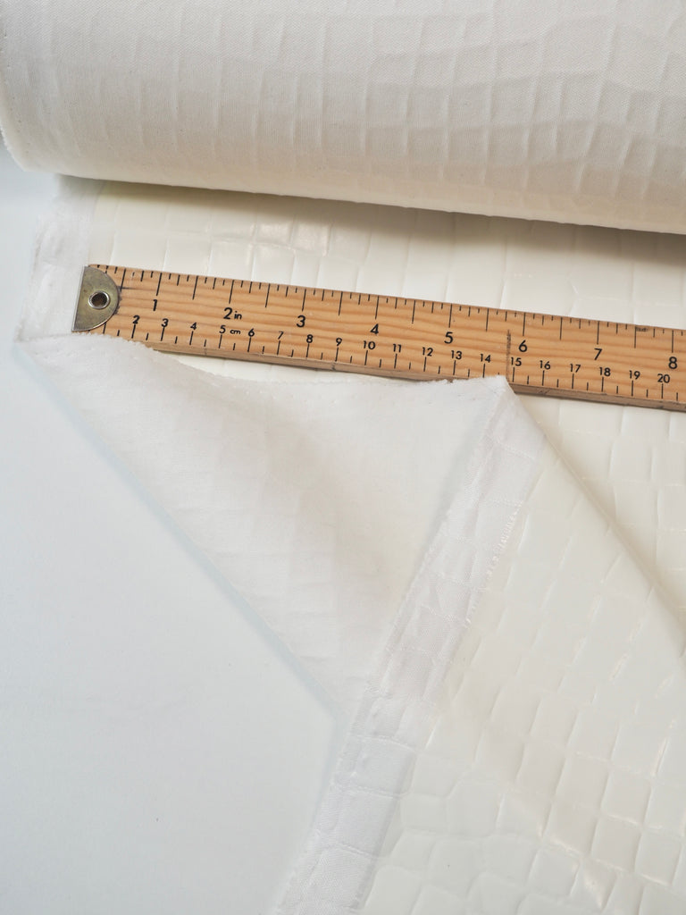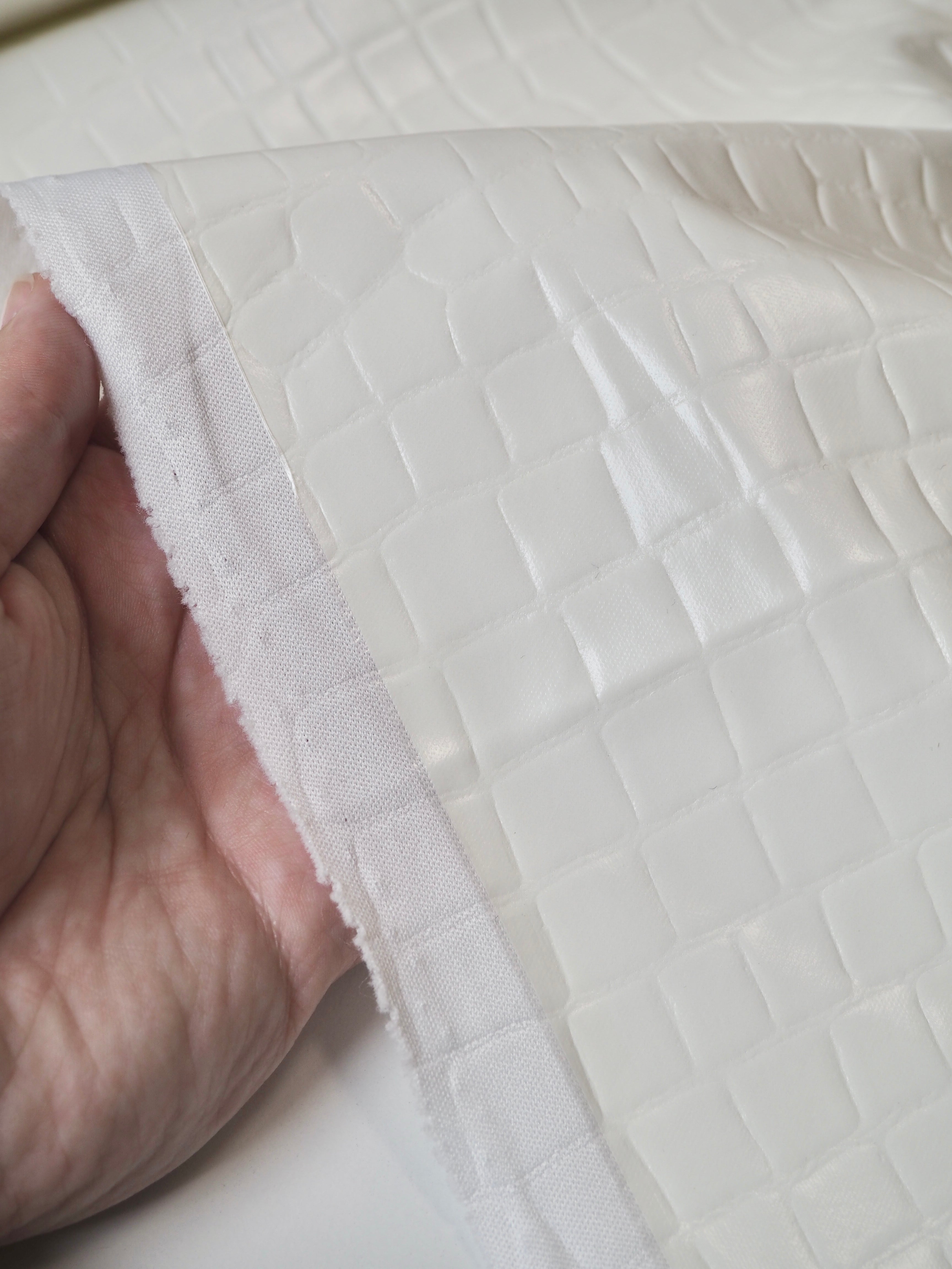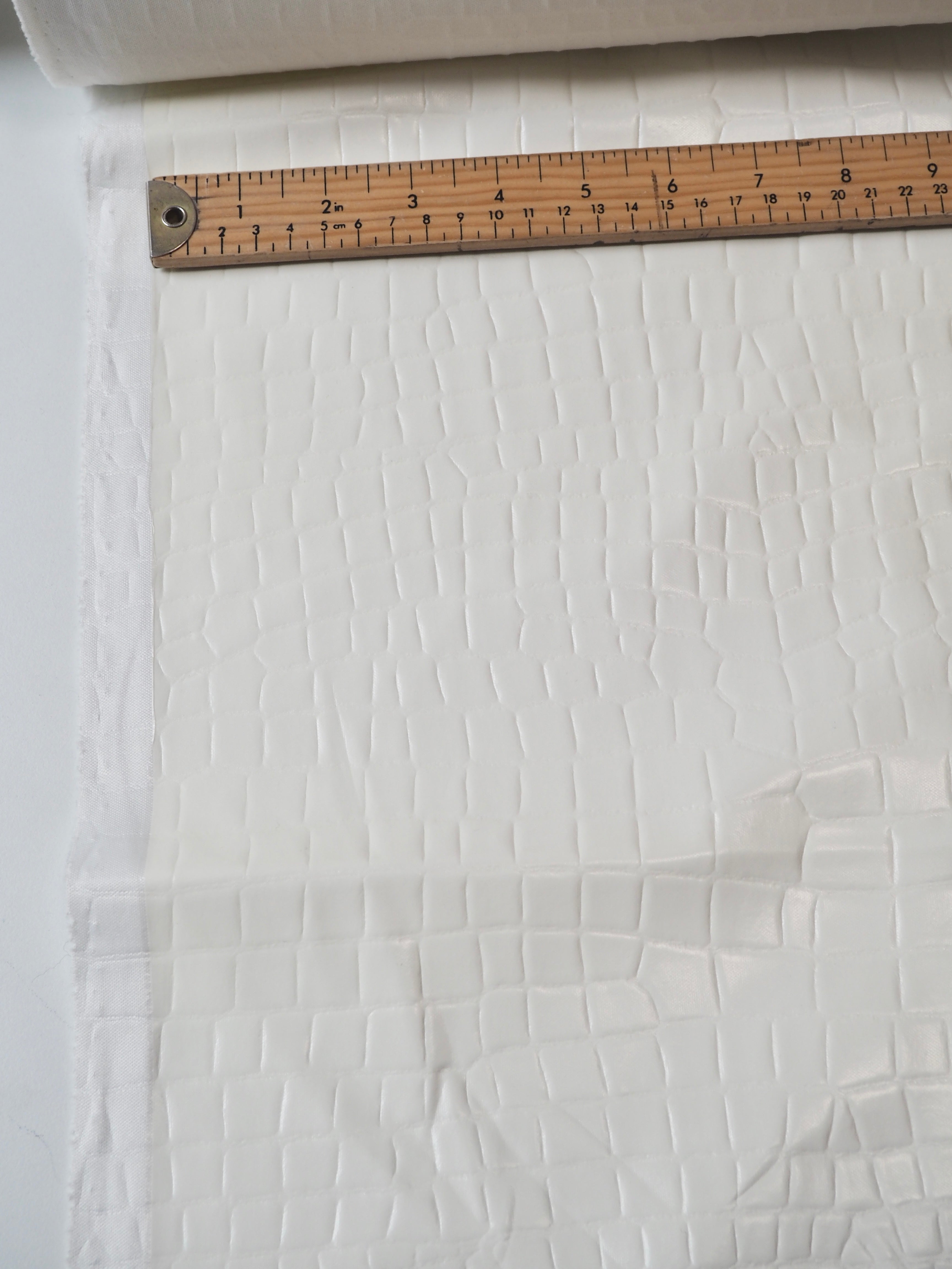 This ex-designer fabric is a stretch pleather. Lightweight and smooth, it is made from a thin ivory polyurethane coating on a white jersey backing. Has an embossed crocodile finish. Approximately 20% width way stretch and great recovery. Would be perfect for form fitting garments as the stretch means you can move with ease. We would love this in a little mini skirt or even a light trench! This cloth has some discolouration at the edges, we have reduced the width to accommodate this.