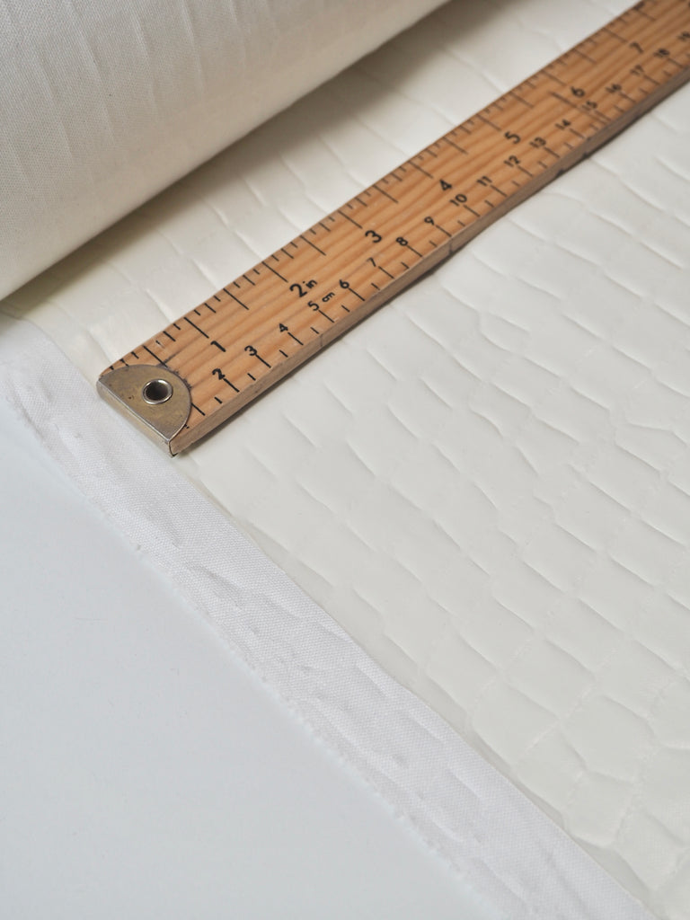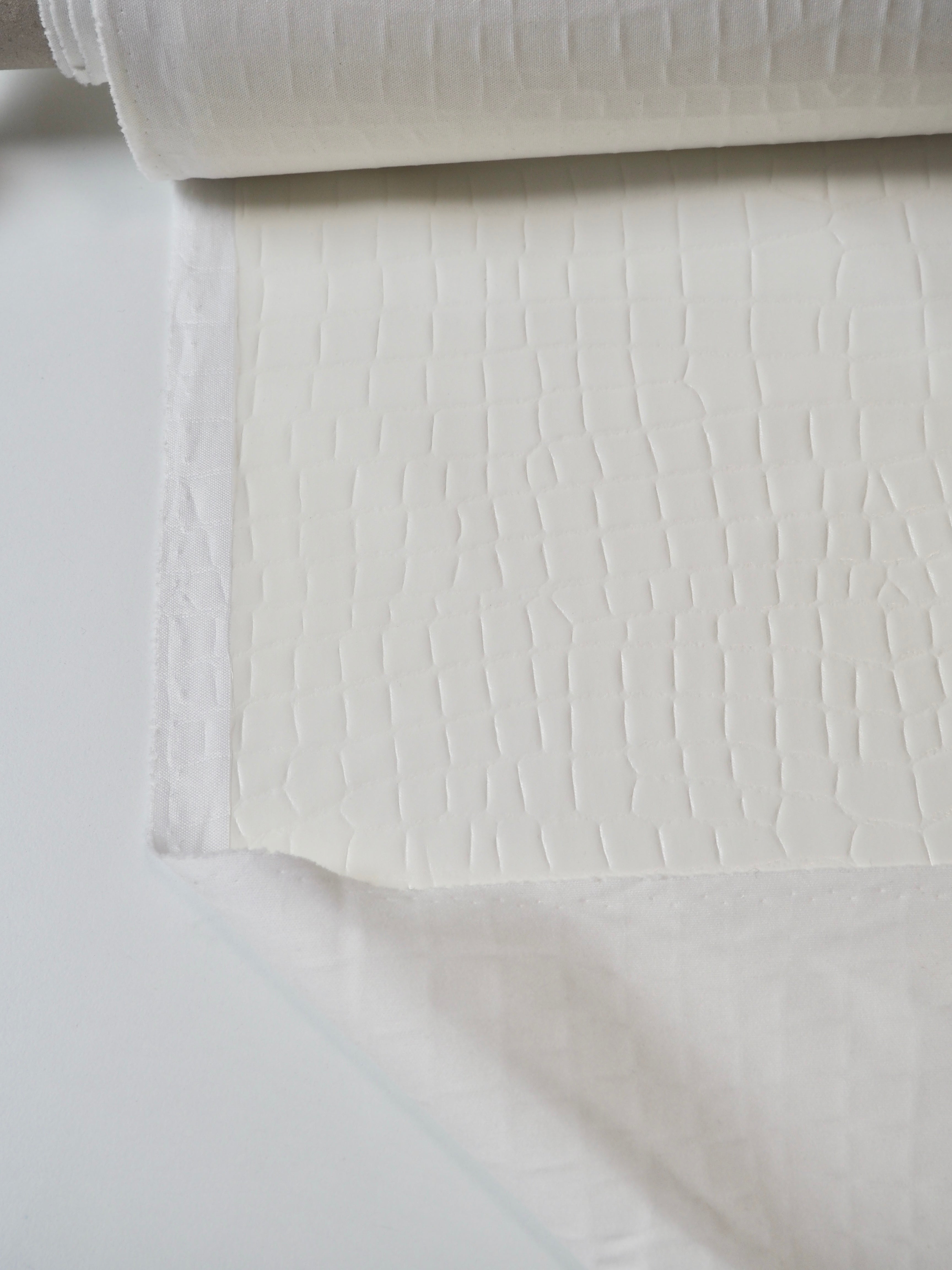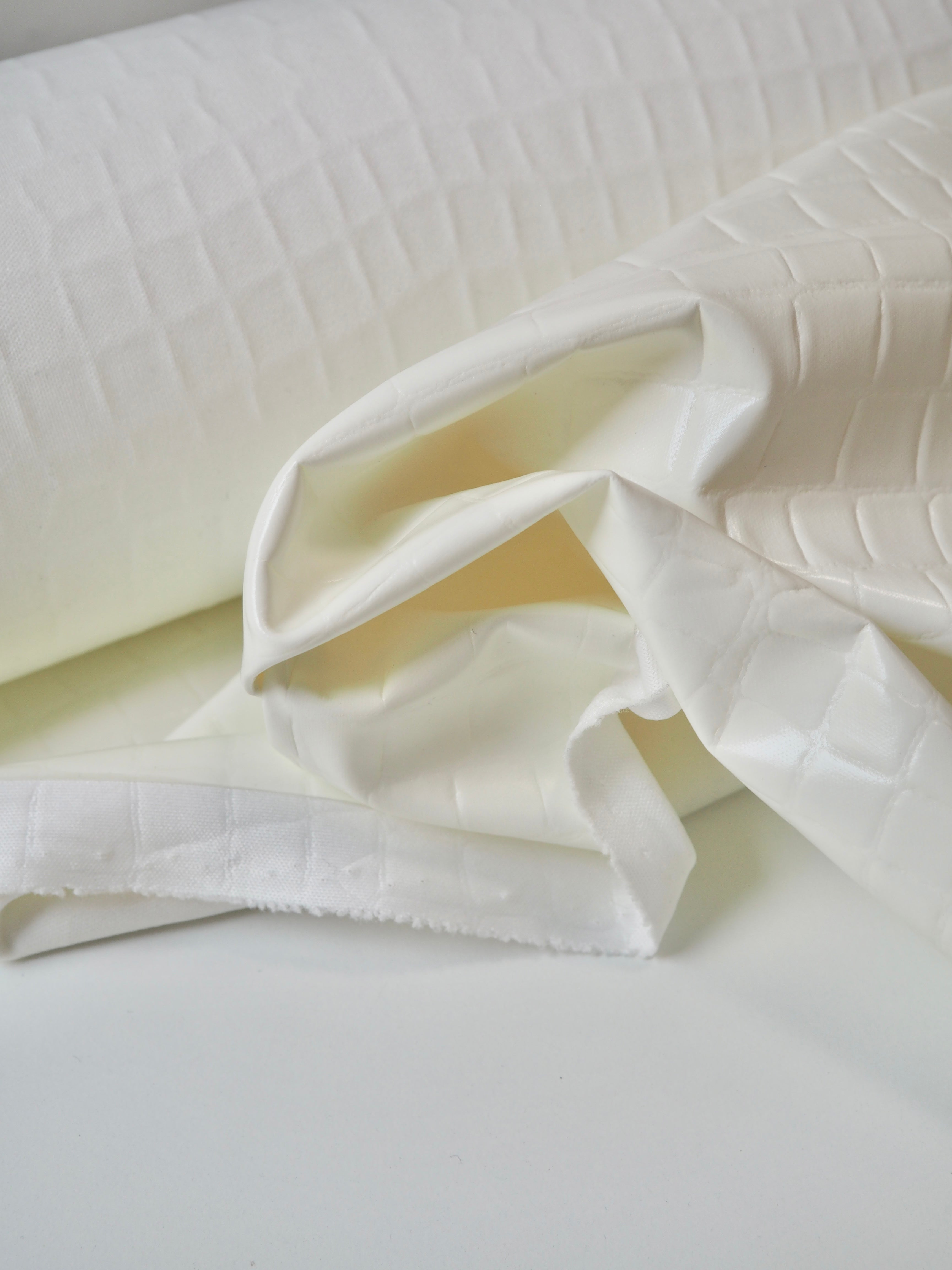 This ex-designer fabric is a stretch pleather. Lightweight and smooth, it is made from a thin ivory polyurethane coating on a white jersey backing. Has an embossed crocodile finish. Approximately 20% width way stretch and great recovery. Would be perfect for form fitting garments as the stretch means you can move with ease. We would love this in a little mini skirt or even a light trench! This cloth has some discolouration at the edges, we have reduced the width to accommodate this.
