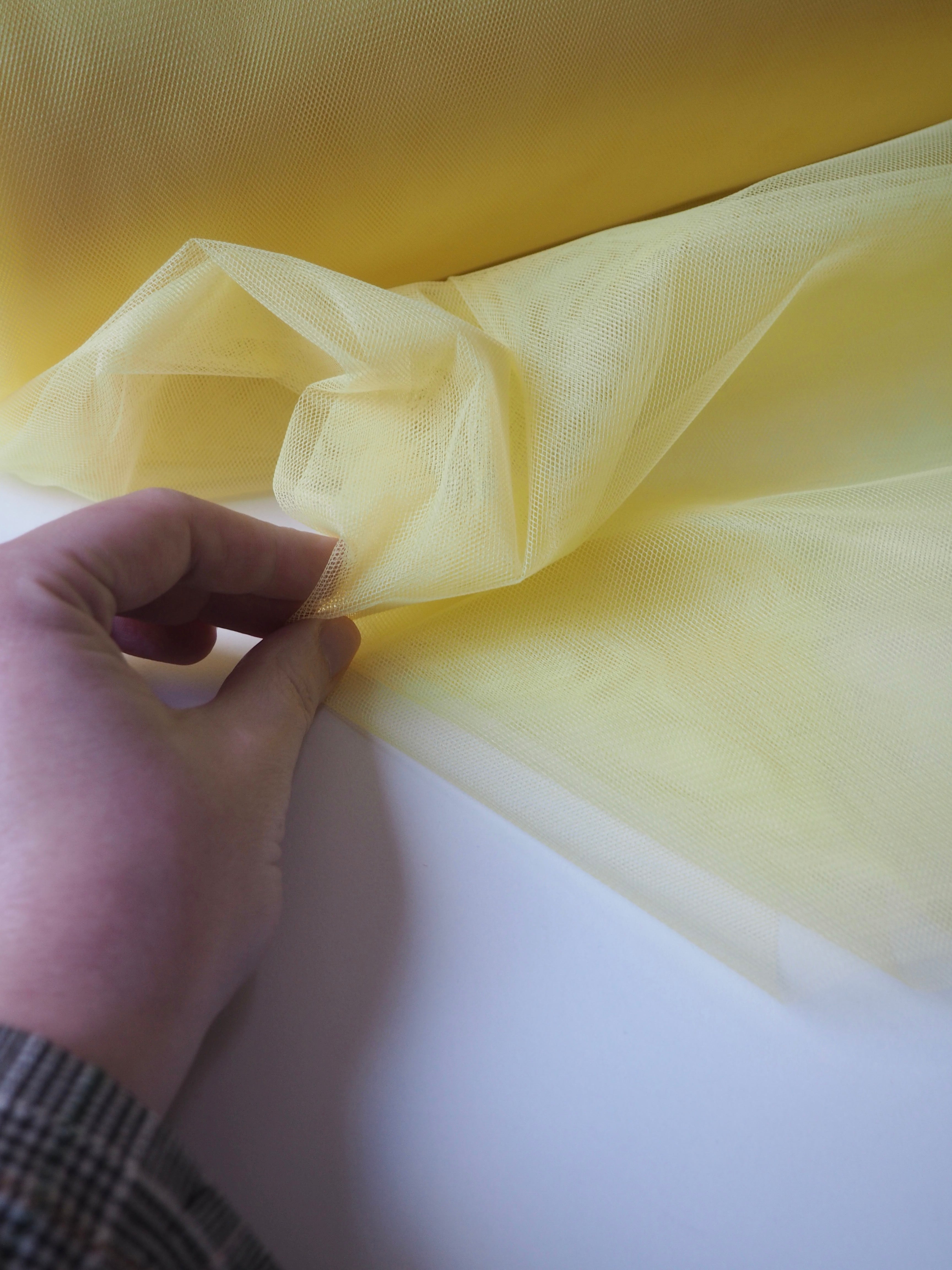 This ex-designer fabric is an extra wide tulle. It has a medium rigidity, with a dense but soft, structured handle. Woven from a network of tiny interconnecting hexagons which gives it the characteristic net like appearance. Lightweight with a crisp drape. Perfect for underskirts, crafting, and technical projects!