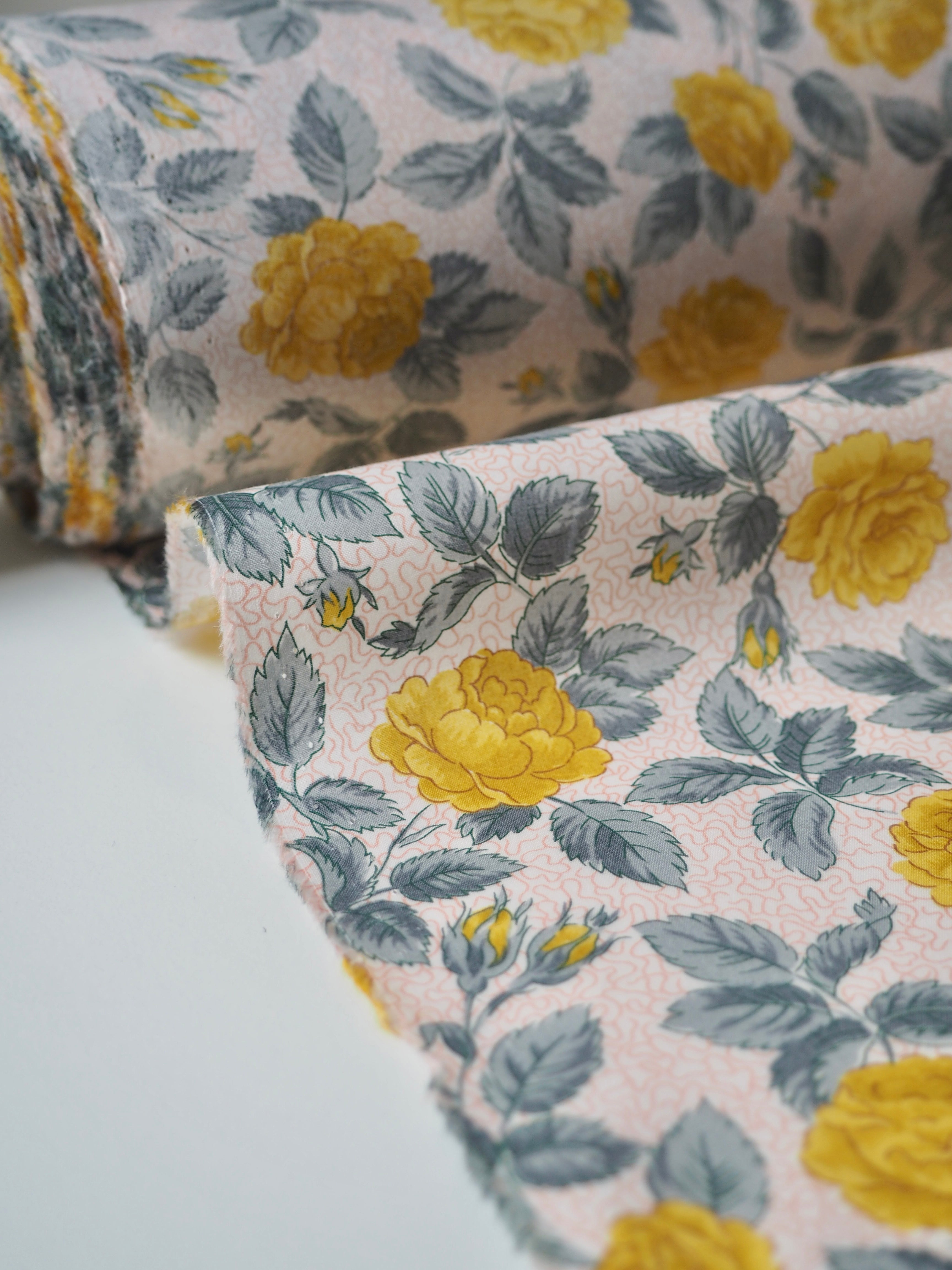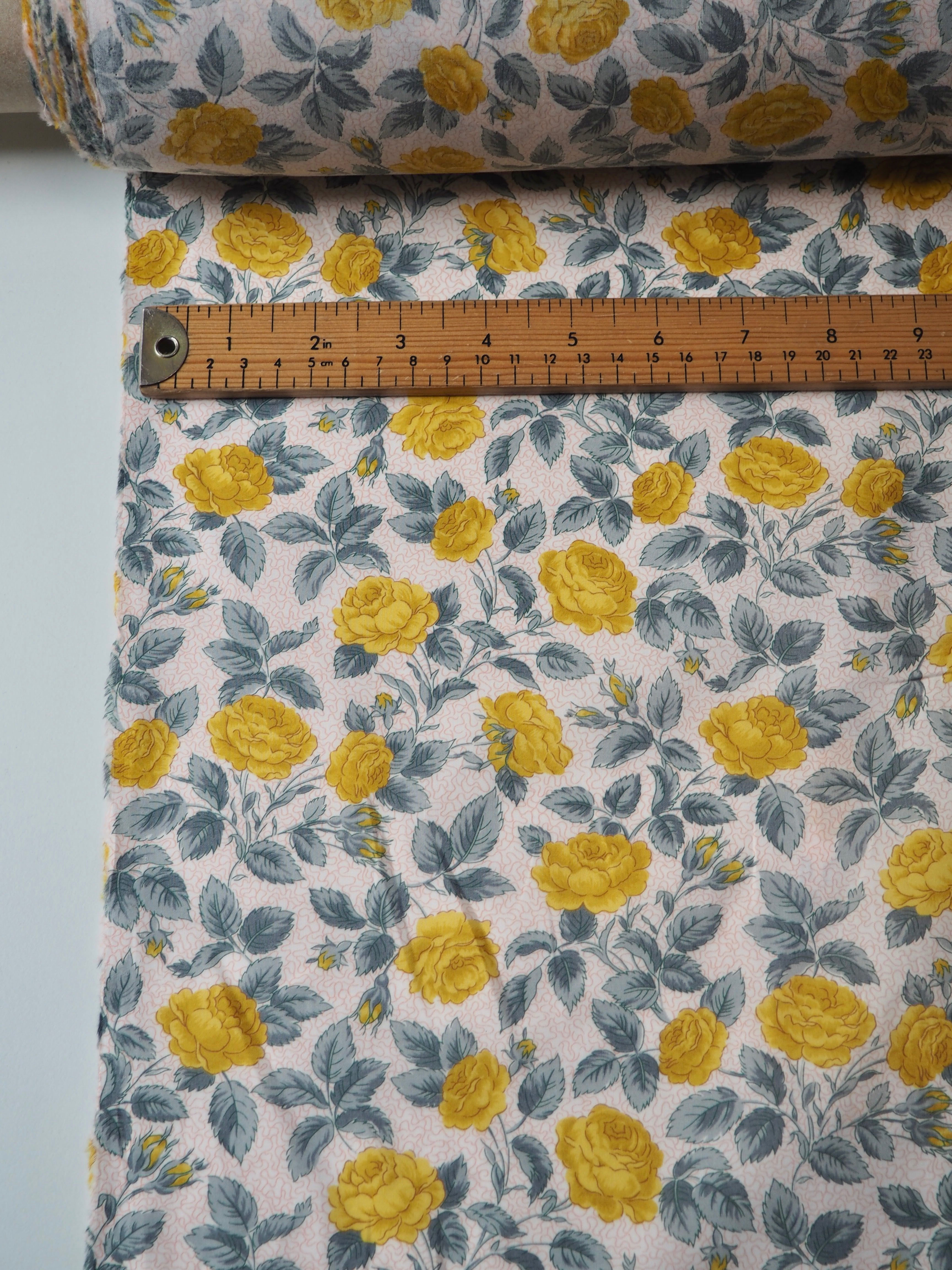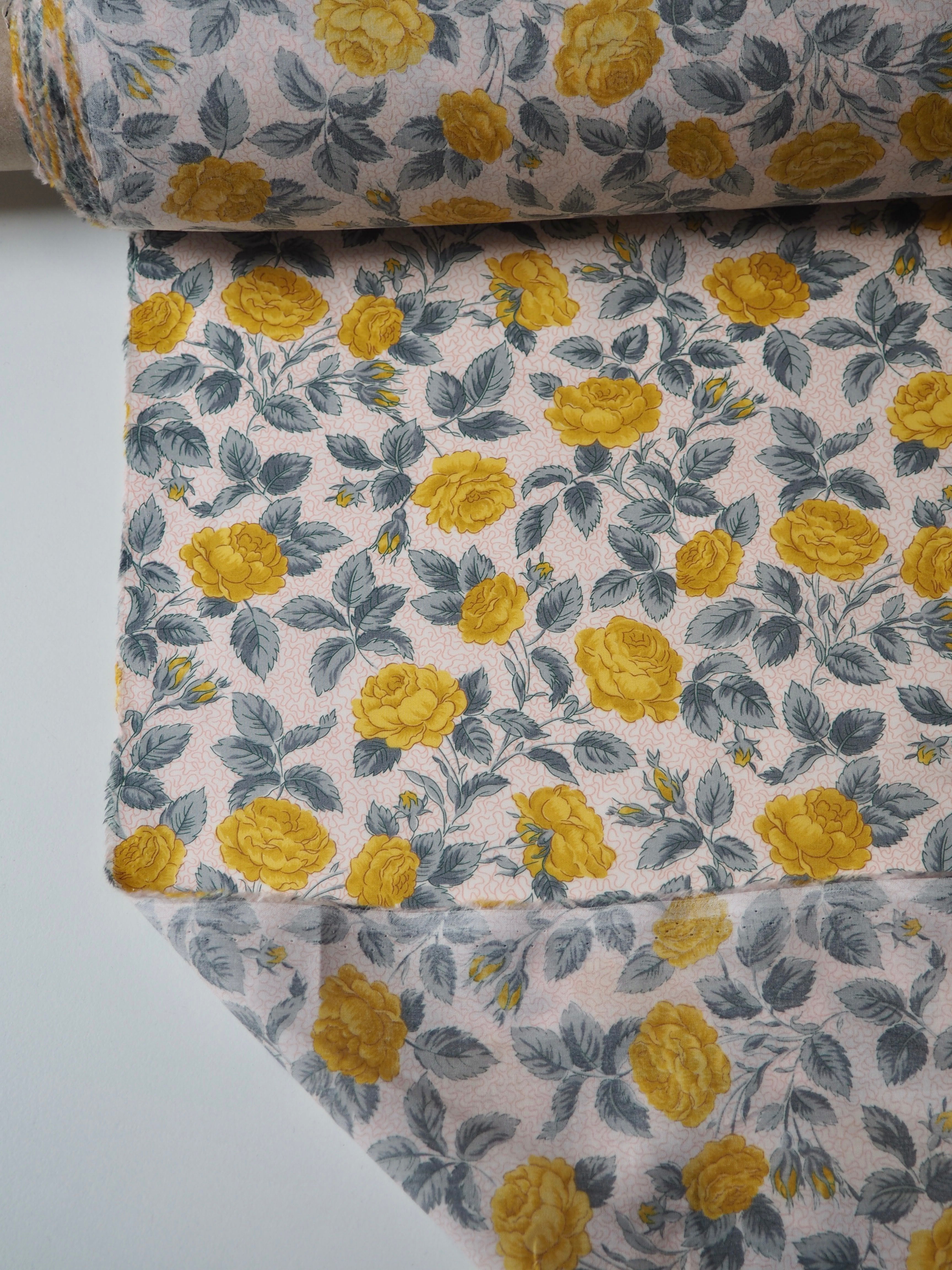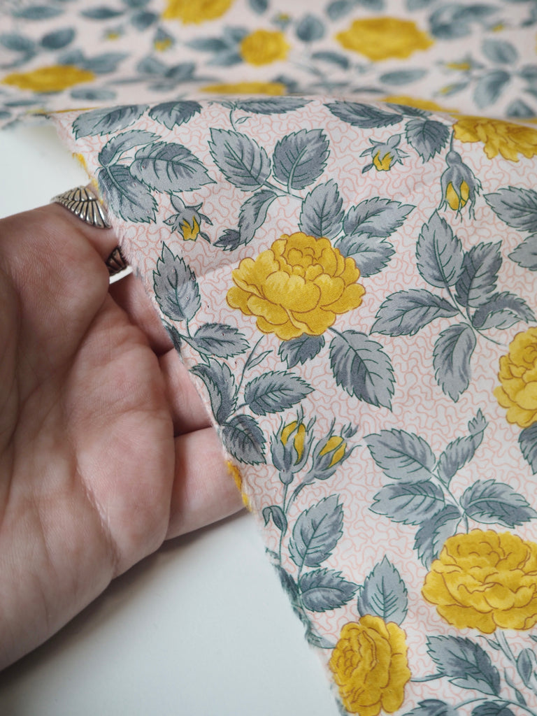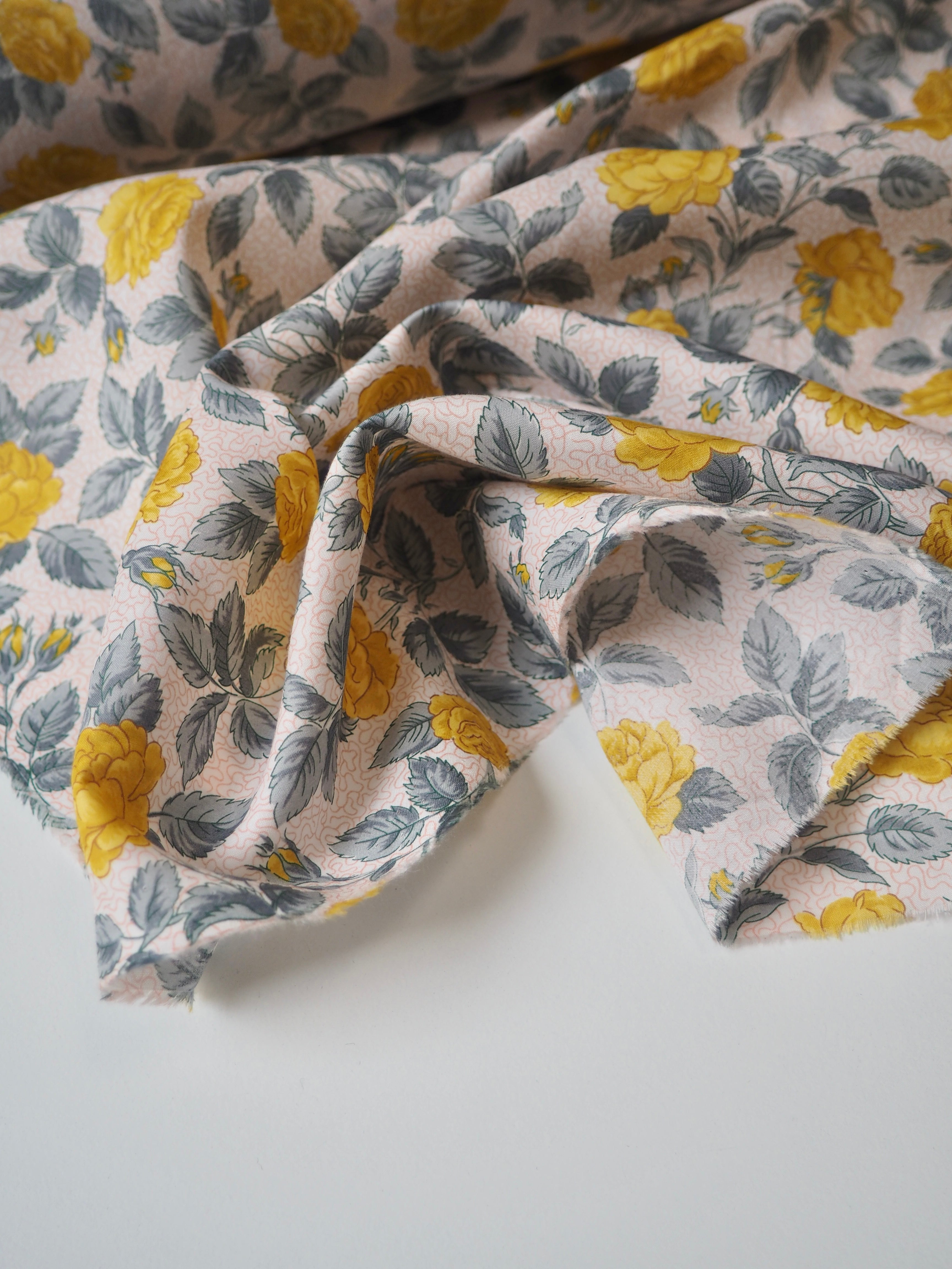 This ex-designer fabric is a classic Liberty Tana Lawn. It's in an exclusive print of yellow roses and grey leaves on a light background. A top quality Liberty cotton, and super lightweight! Soft with a lovely drape and slight crispness. Has a wonderful cotton handle. Mostly opaque but lets a little light in. We would love to see it in a blouse or even for quilting!