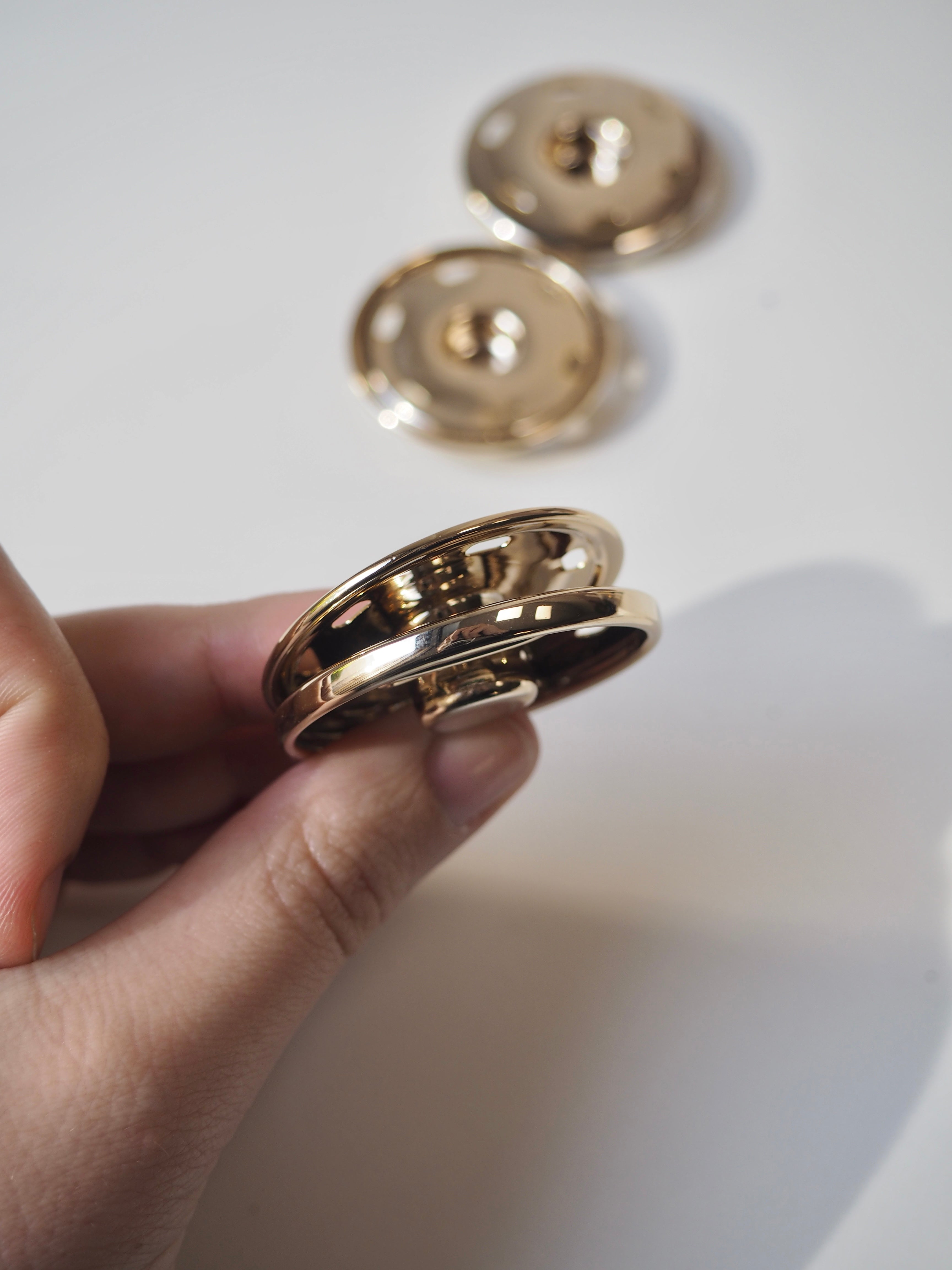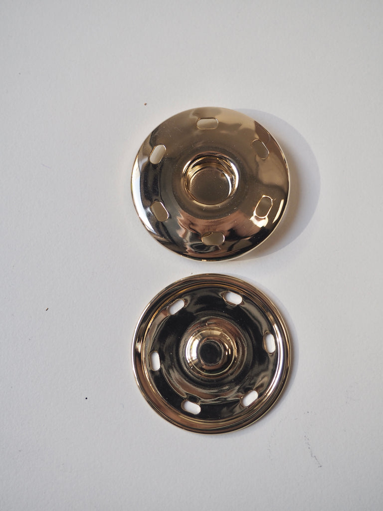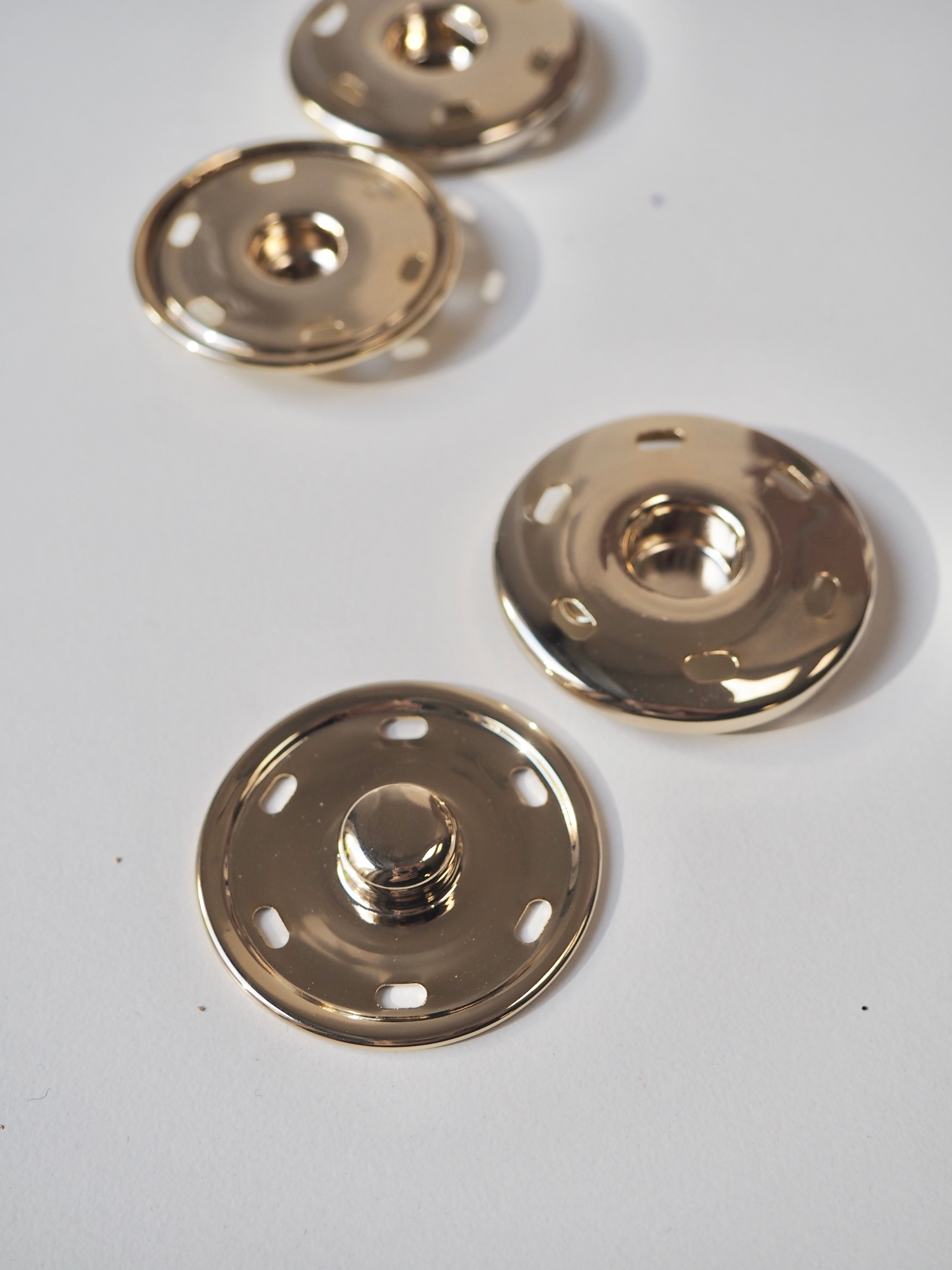 This are ex-designer sew-on poppers/snaps. In a light gold finish. Sturdy but lightweight, perfect for jackets, coats and accessories!