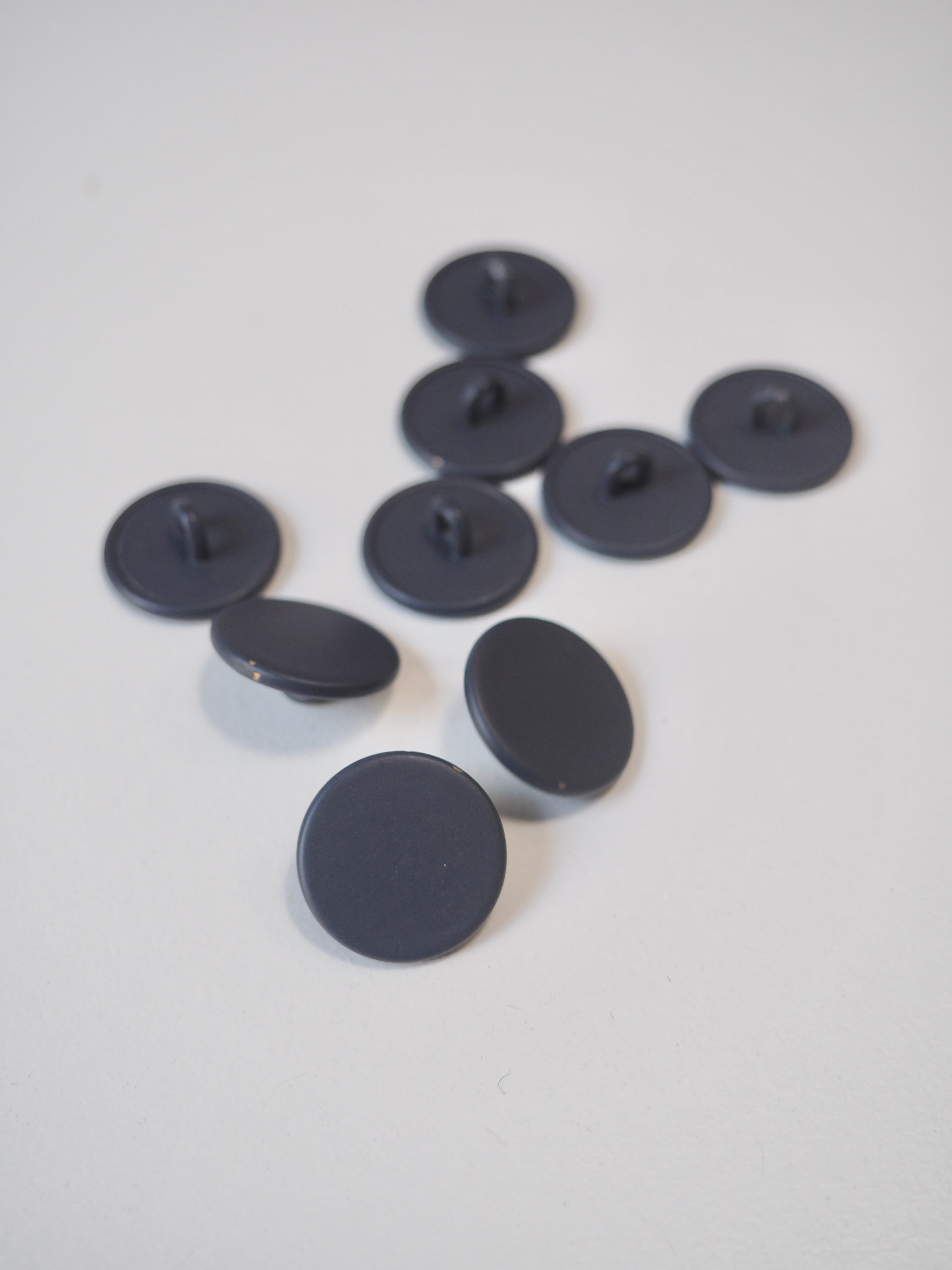 This ex-designer hardware is a shank button. Matte navy finish with a flat top and a shank attachment.