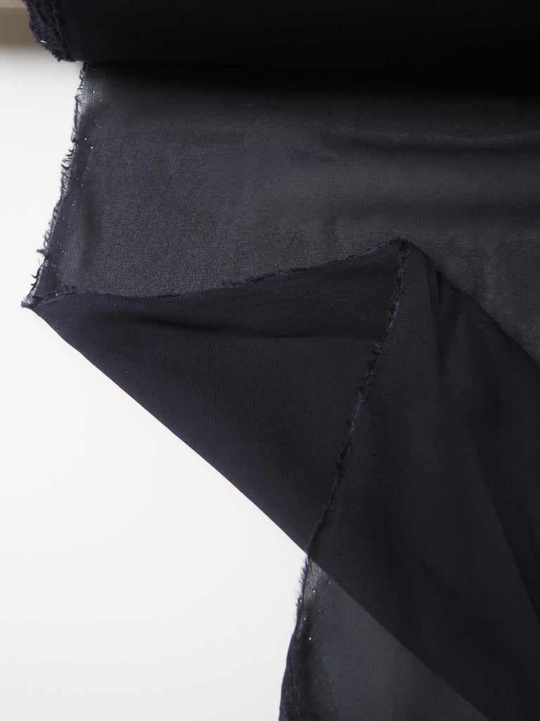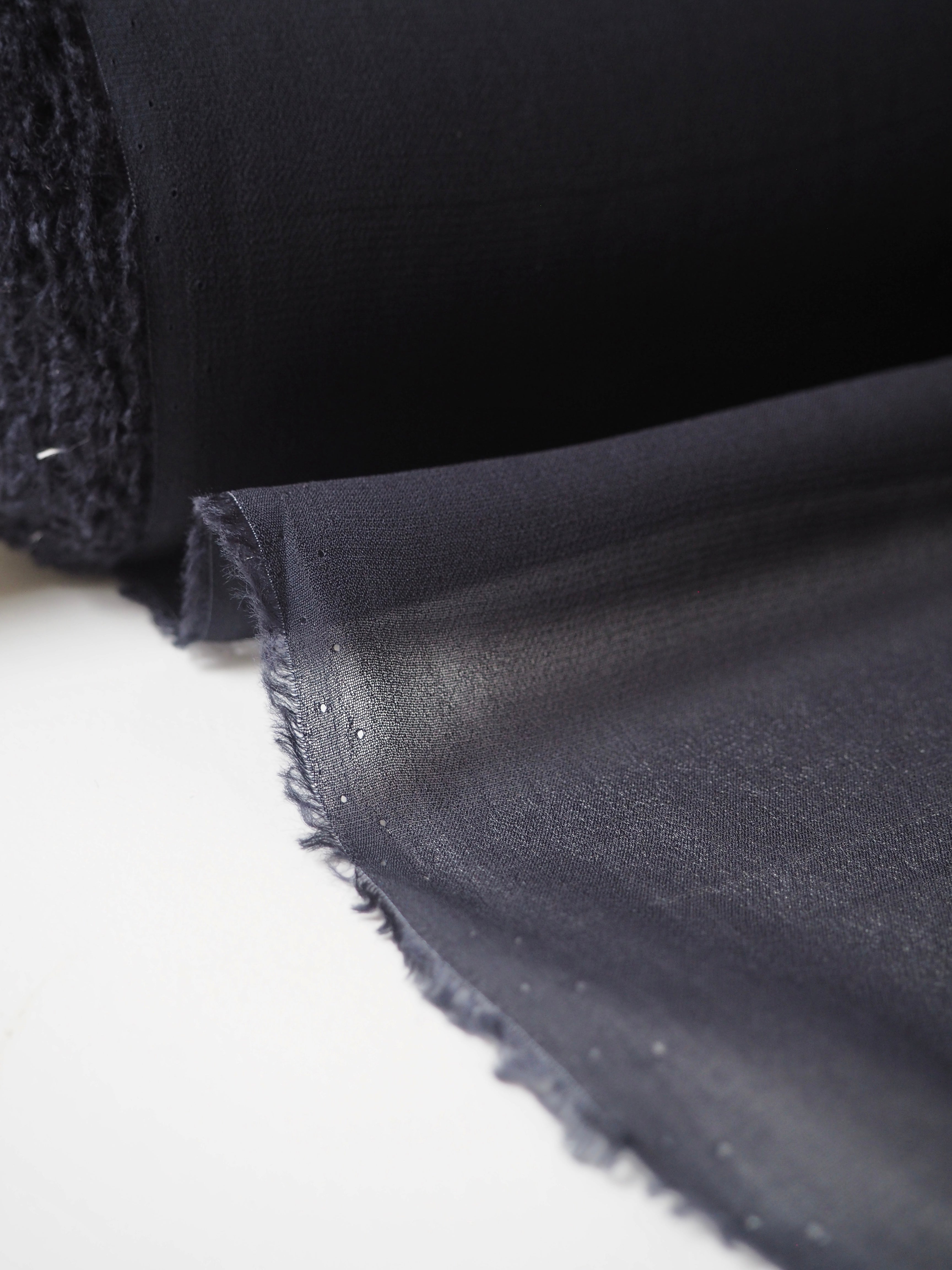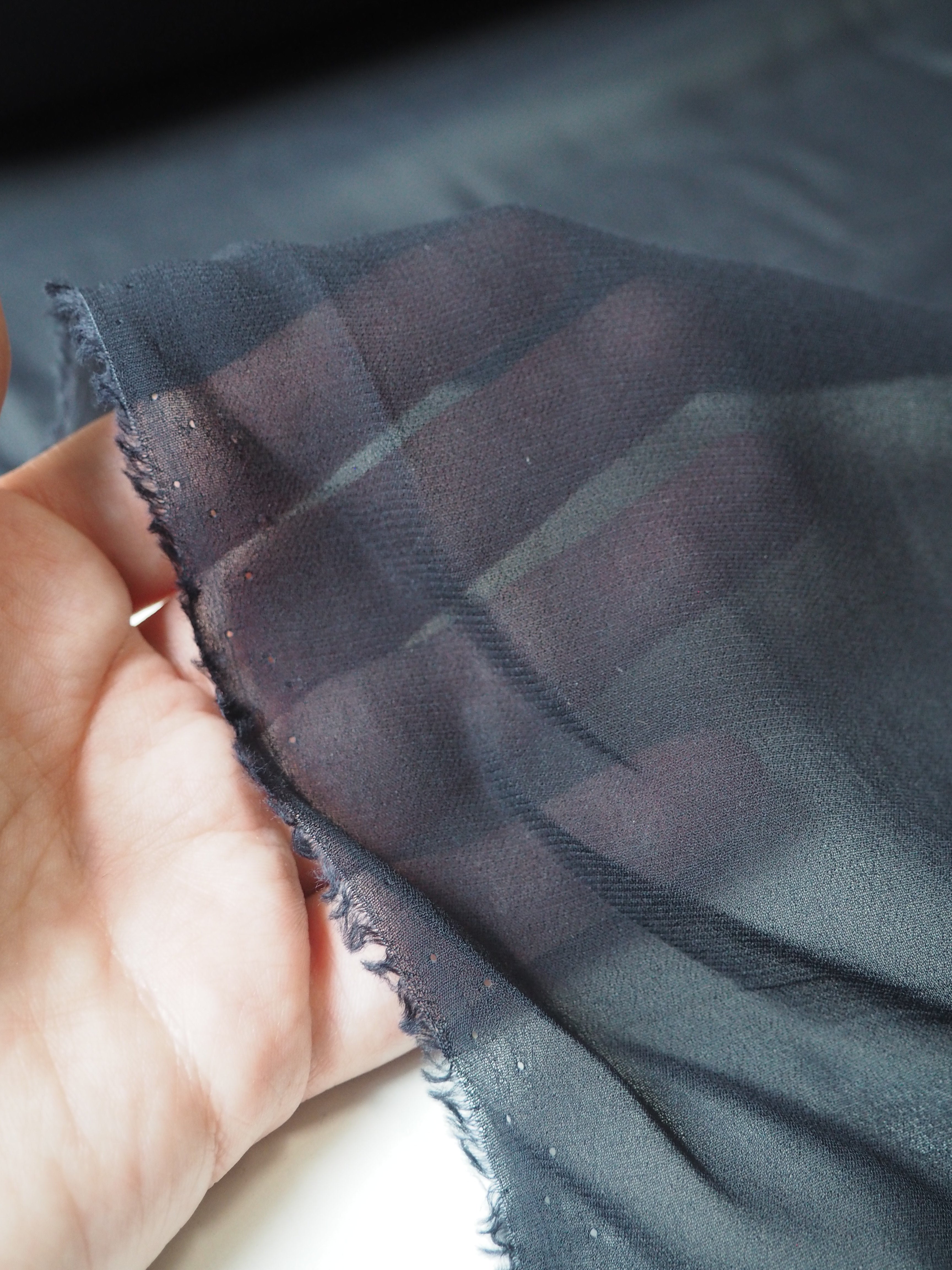 This ex-designer fabric is a chiffon. In a classic navy colour, and semi-sheer. Has a great handle with a slightly crepe-like texture. Super light and airy, and has great movement. Ideal for a floaty top or for an overlay on a skirt!