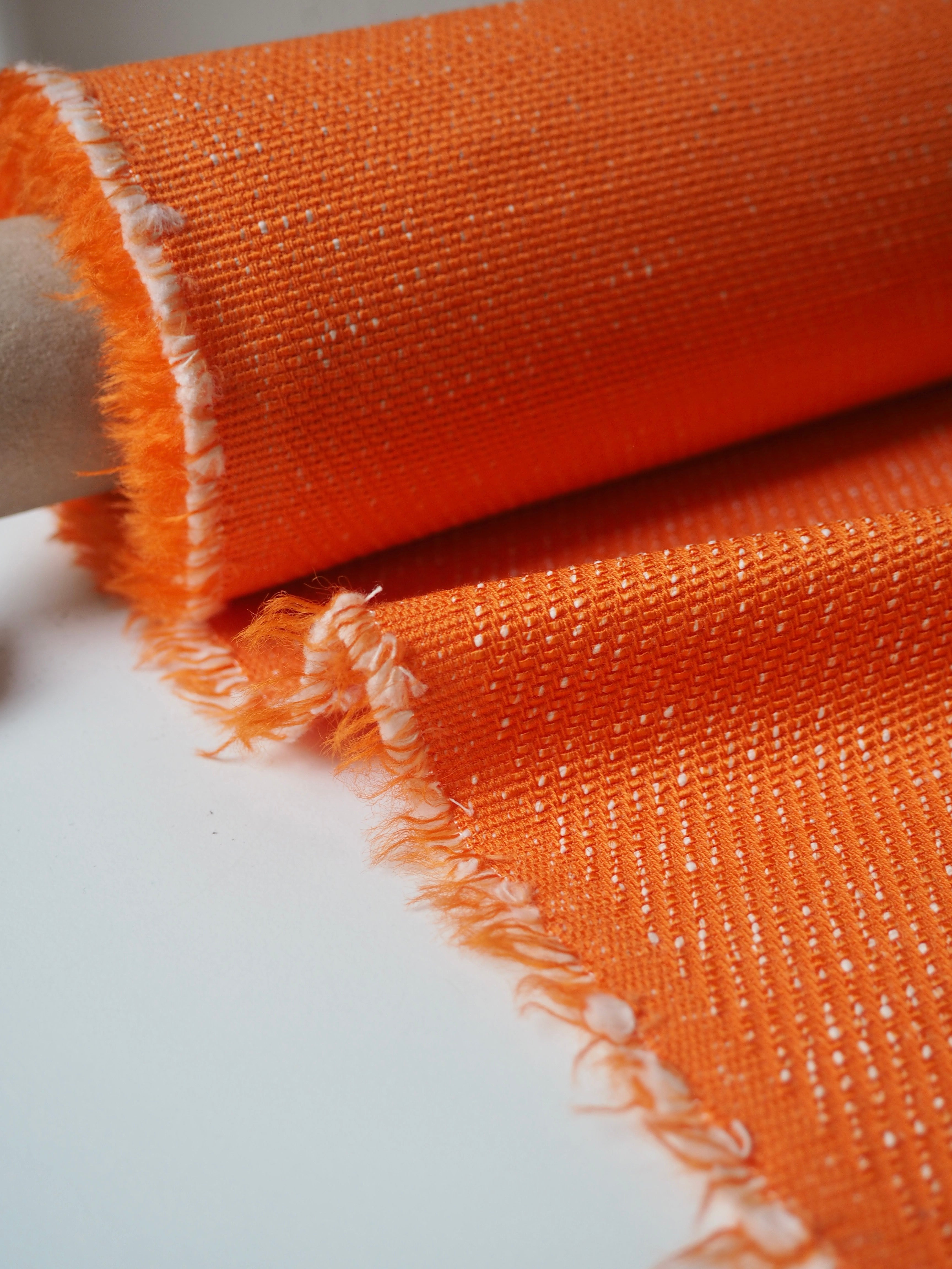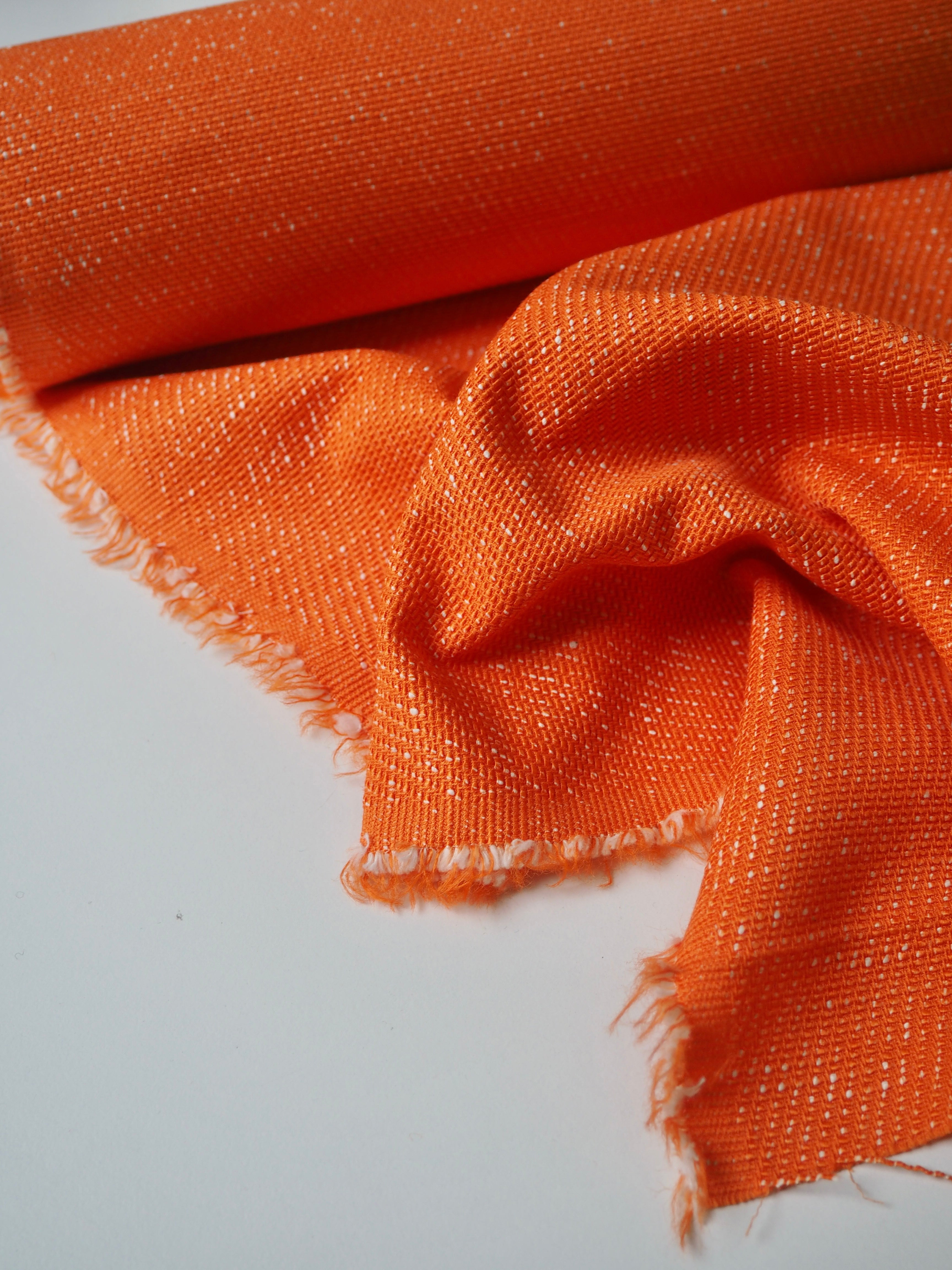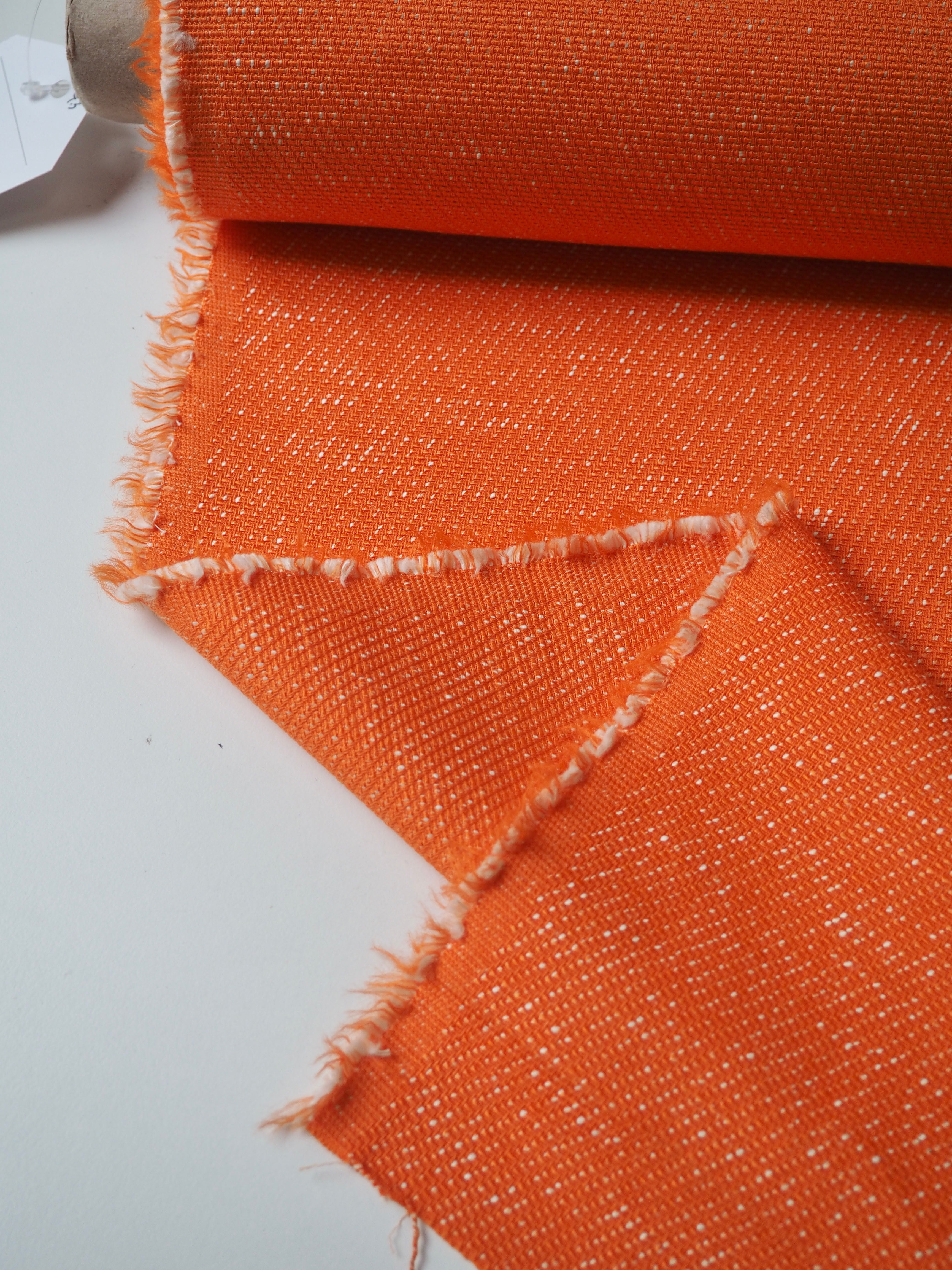 This ex-designer fabric is a cotton tweed. It has a tweed-like weave, which is sturdy and beautifully finished. Has a lovely risen texture that pairs wonderfully with the cotton/viscose blend. Very comfortable and breathable, with a gentle structure. Opaque and medium weight. In a rich orange colour. The perfect cloth for a lightweight jacket, blazer, or even home furnishings!