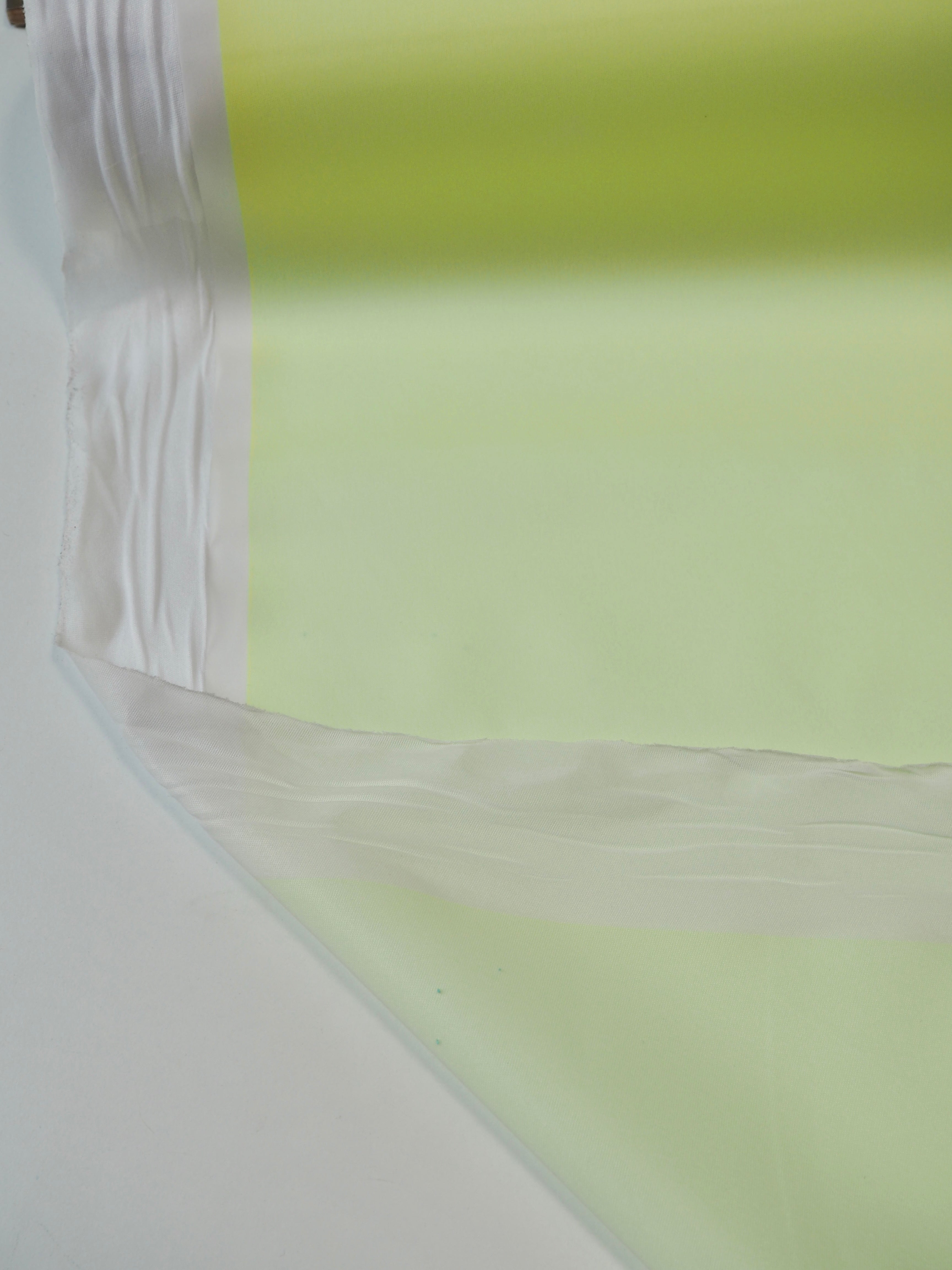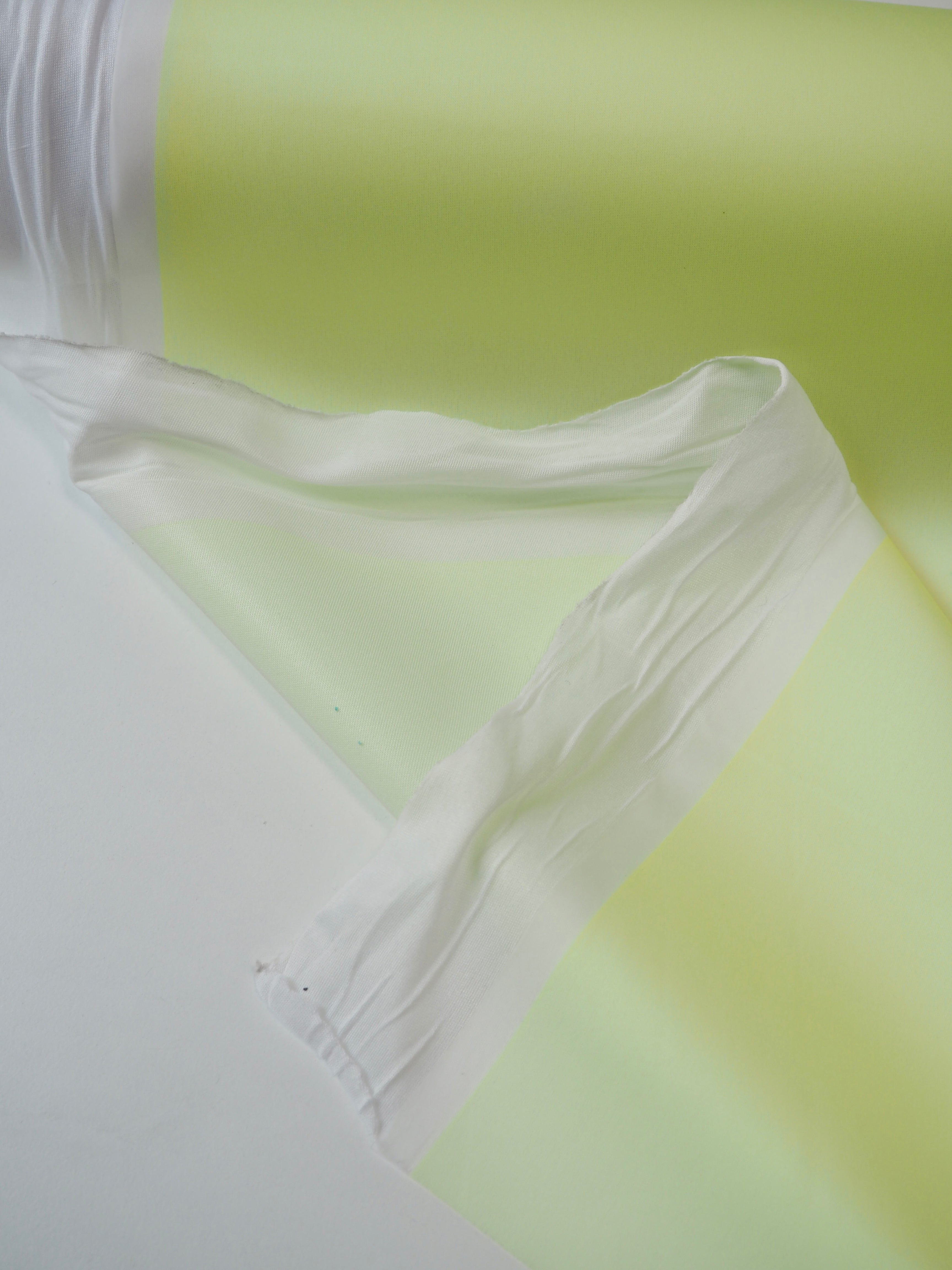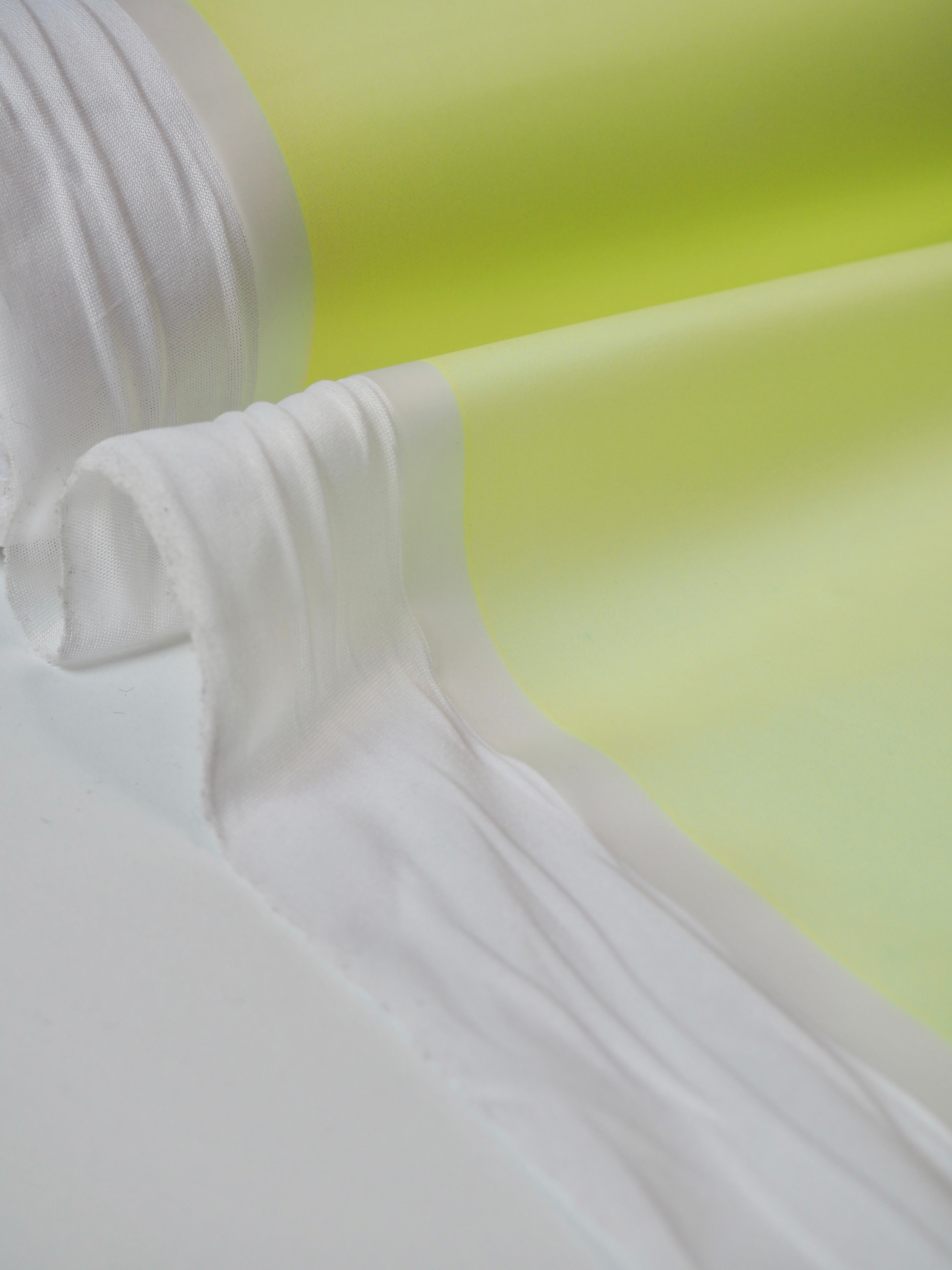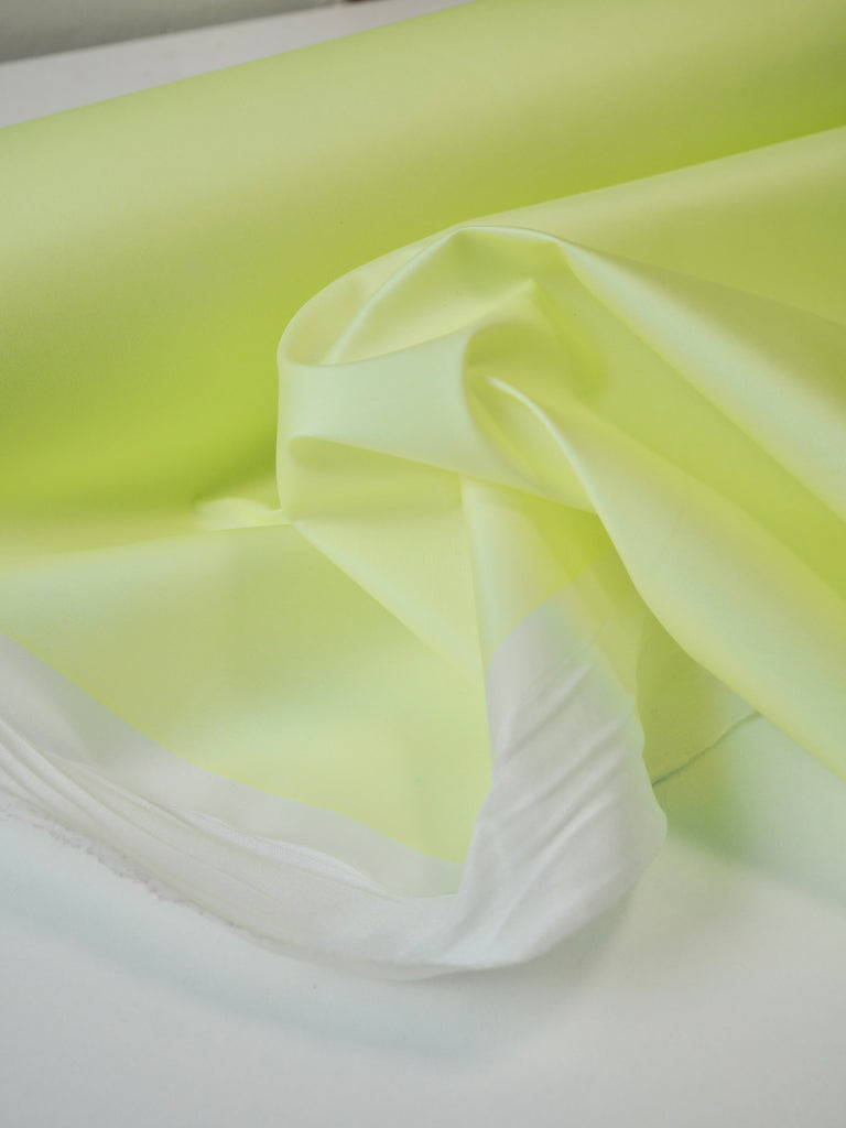This ex-designer fabric is a coated jersey. Light to medium weight, sturdy, and made from a polyurethane coating backed to a lightweight white jersey. It doesn't have any stretch with the coating added on. It's structured, with a smooth finish. Slightly opaque. Perfect for special projects and bags!