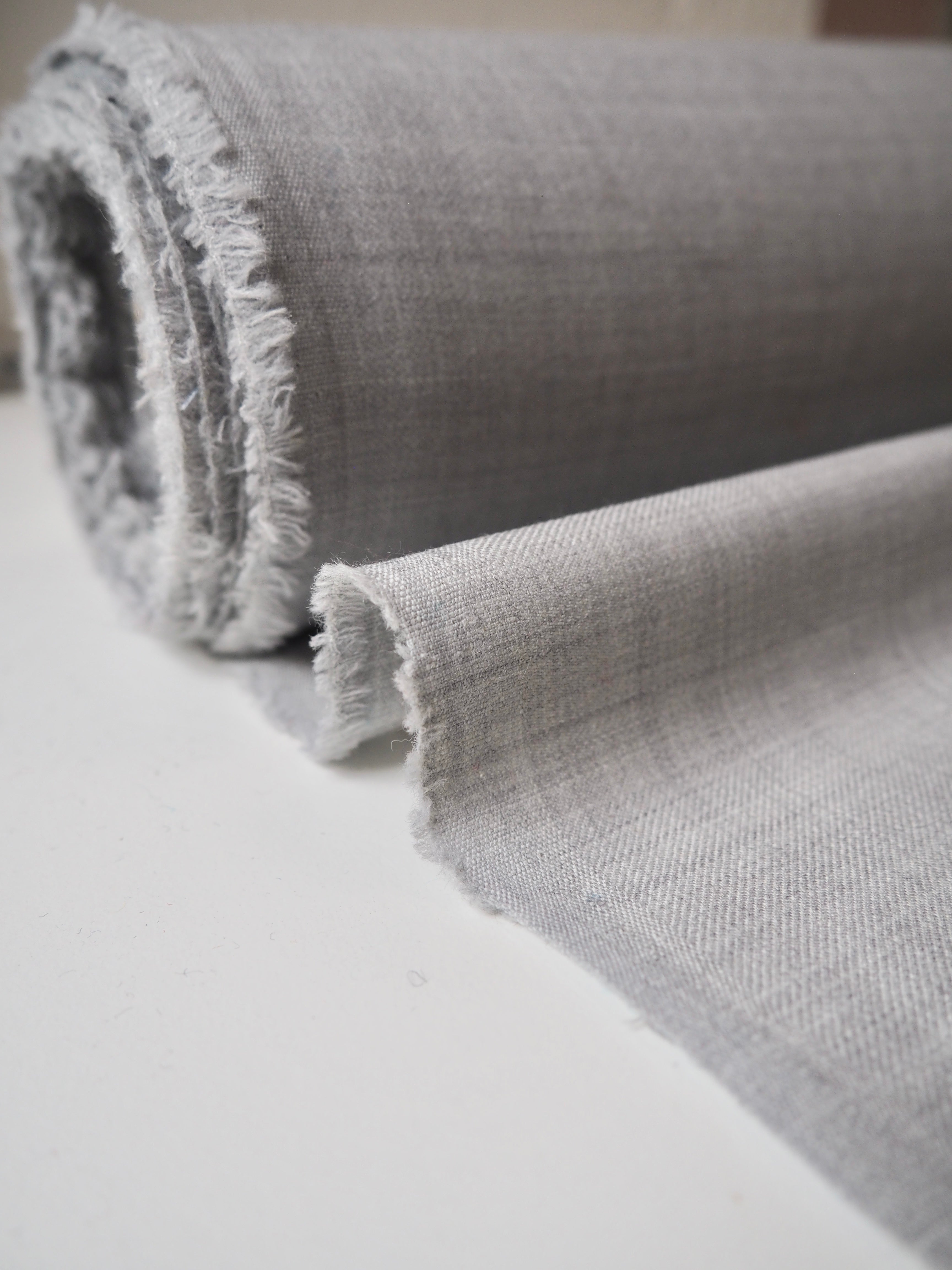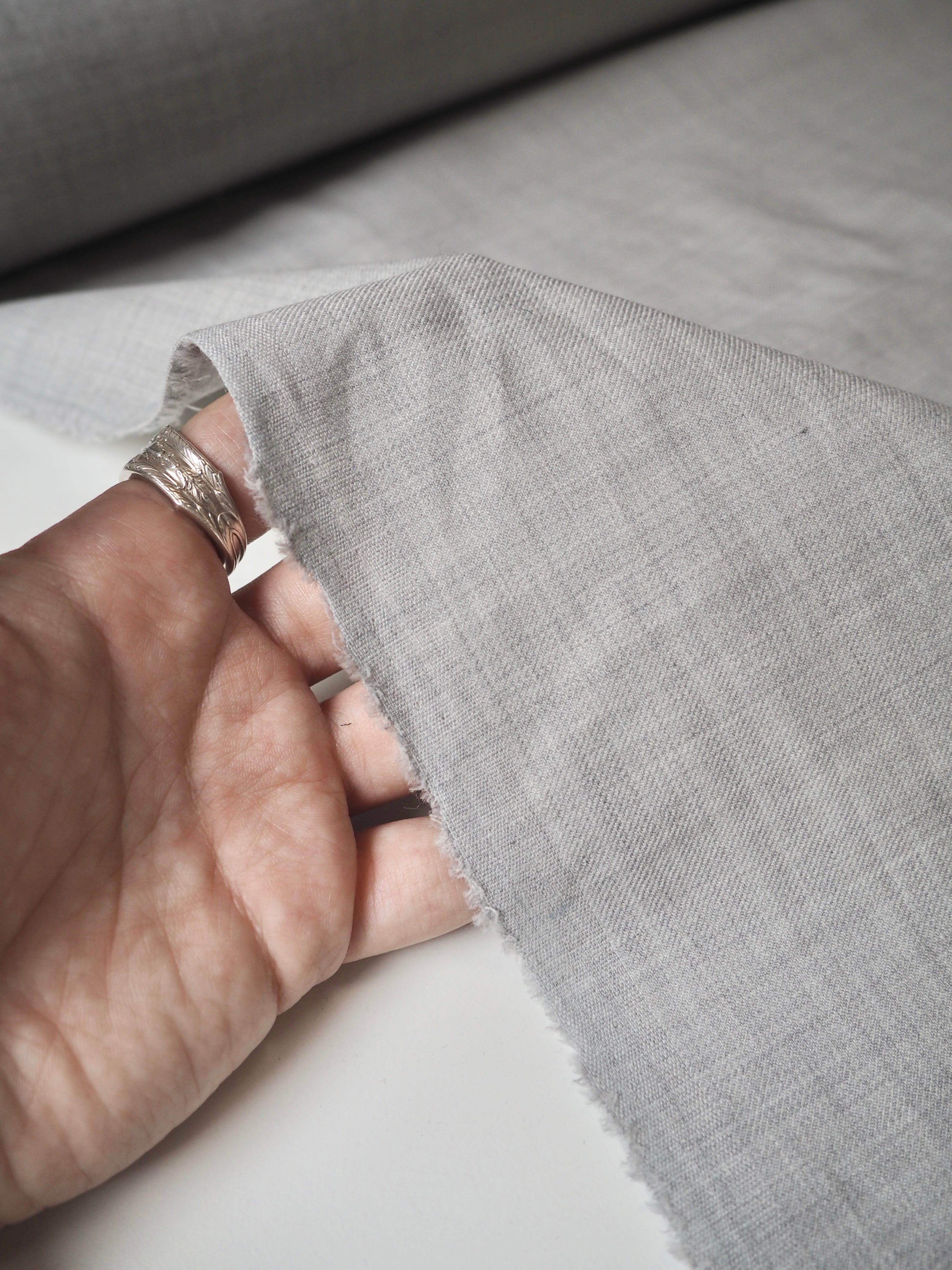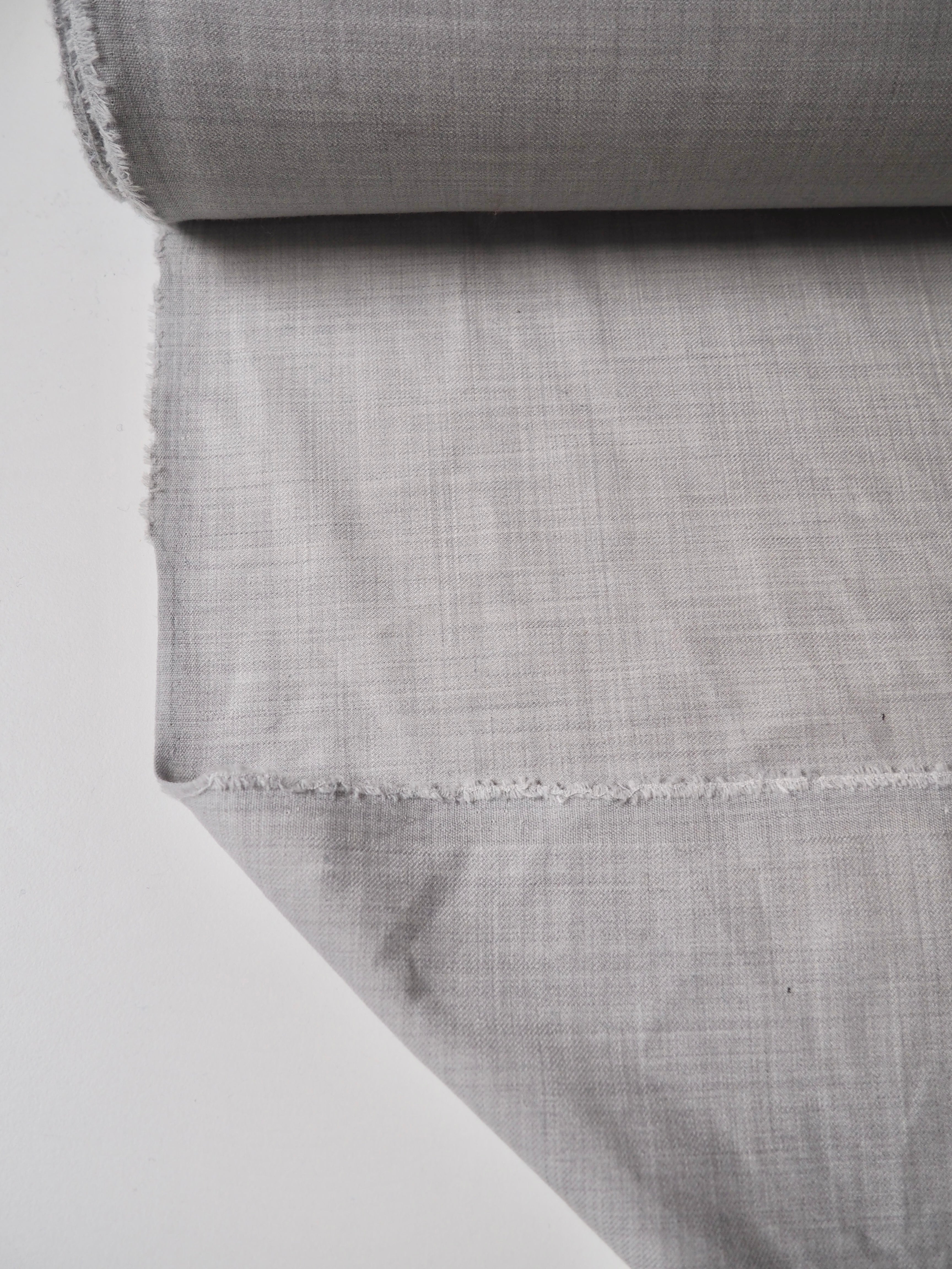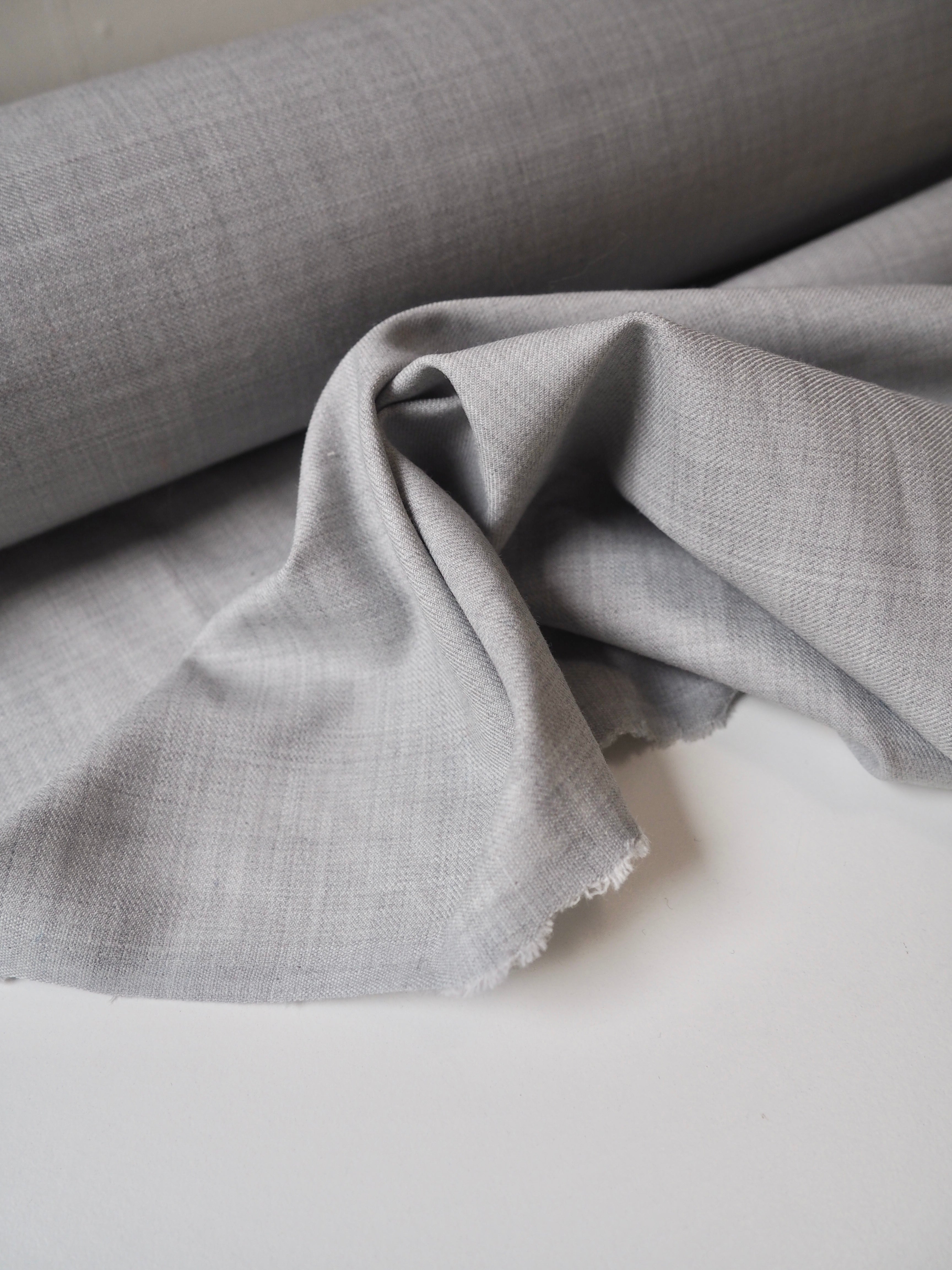 This ex-designer fabric is a wool twill. It's in a pale grey shade with a twill weave. It's blended with polyester, which gives it extra strength. Has a slight stretch, about 10%. Lightweight, quite warm, with a nice drape and lovely handle. Perfect for trousers!