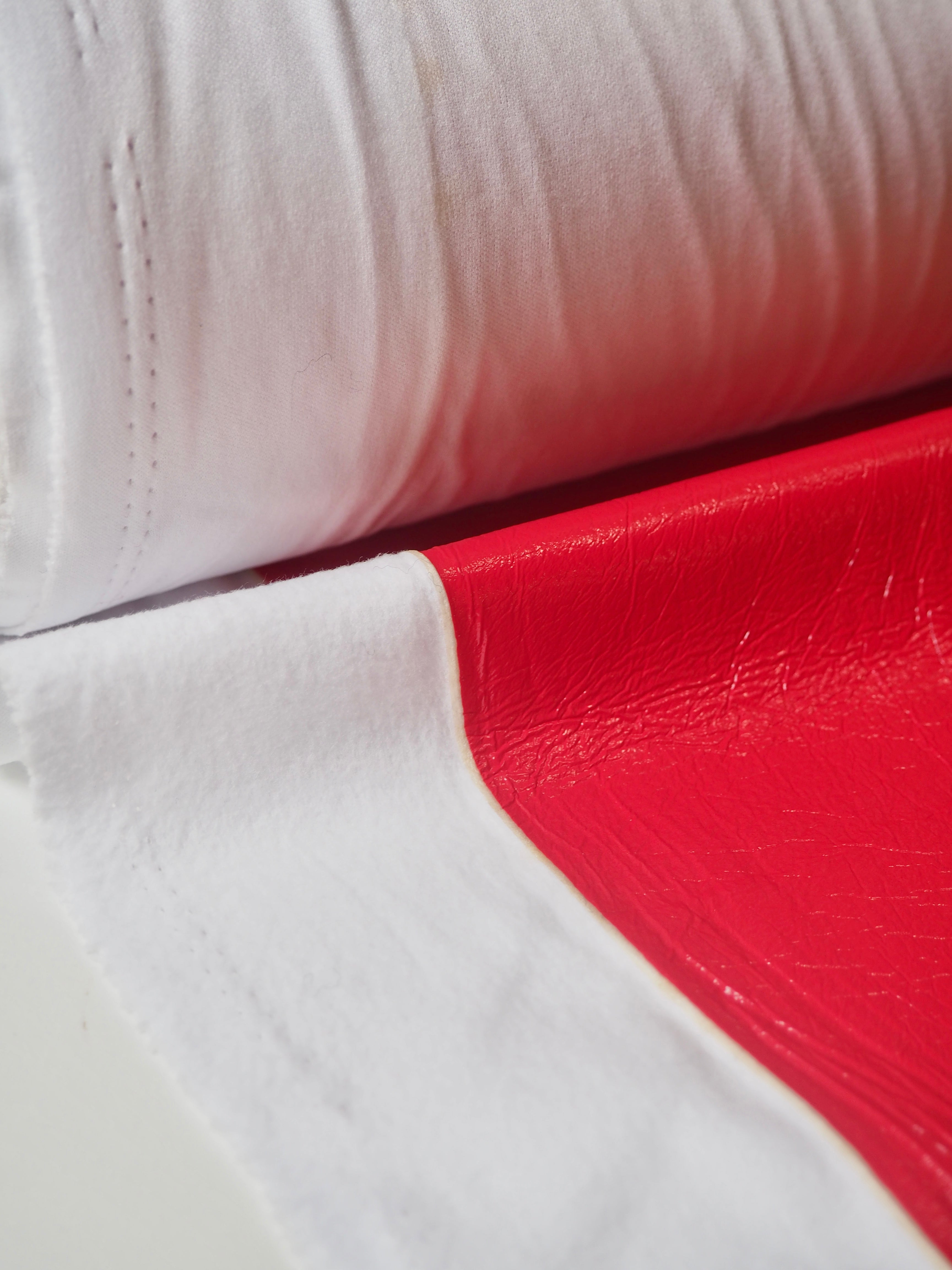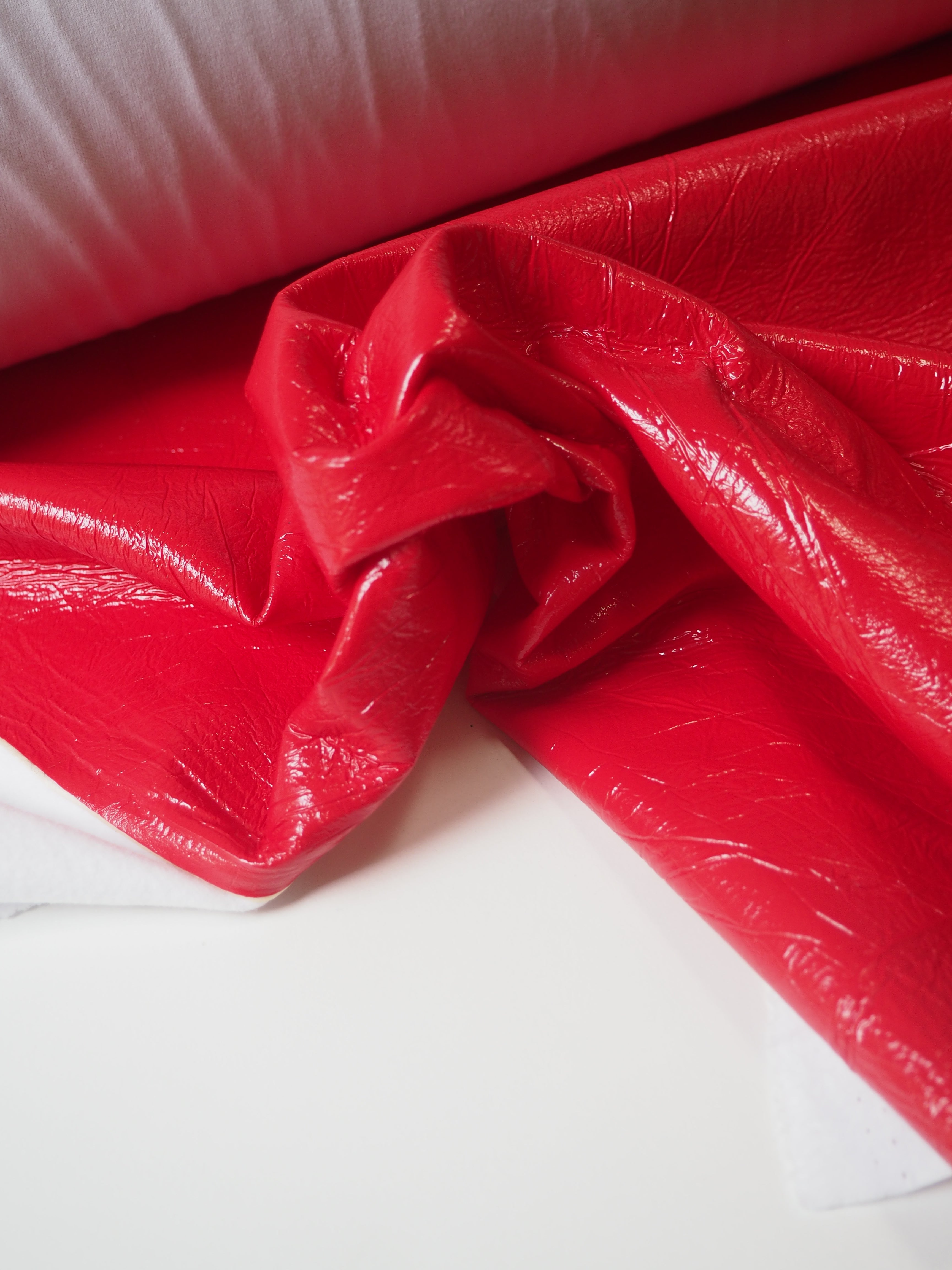 This ex-designer fabric is a stretch pleather. Lightweight and super smooth, it is made from a thin red polyurethane coating on a white fleeced jersey backing. Has a bright patent sheen that looks slightly distressed. Approximately 20% width way stretch and great recovery. Would be perfect for form fitting garments as the stretch means you can move with ease. We would love this in a little mini skirt or even a light trench! This cloth does have some dotting on the reverse, the price is reflected in this.