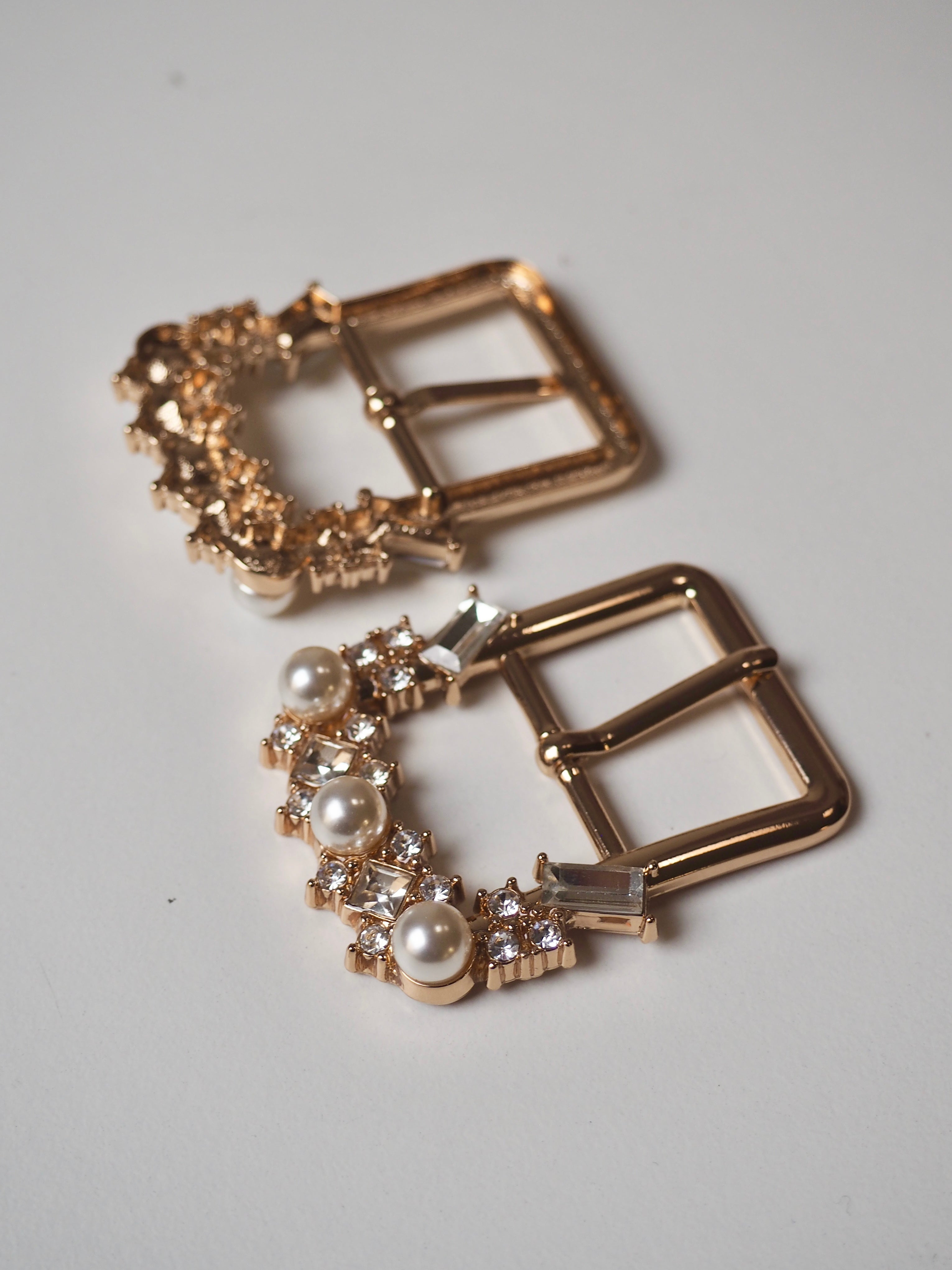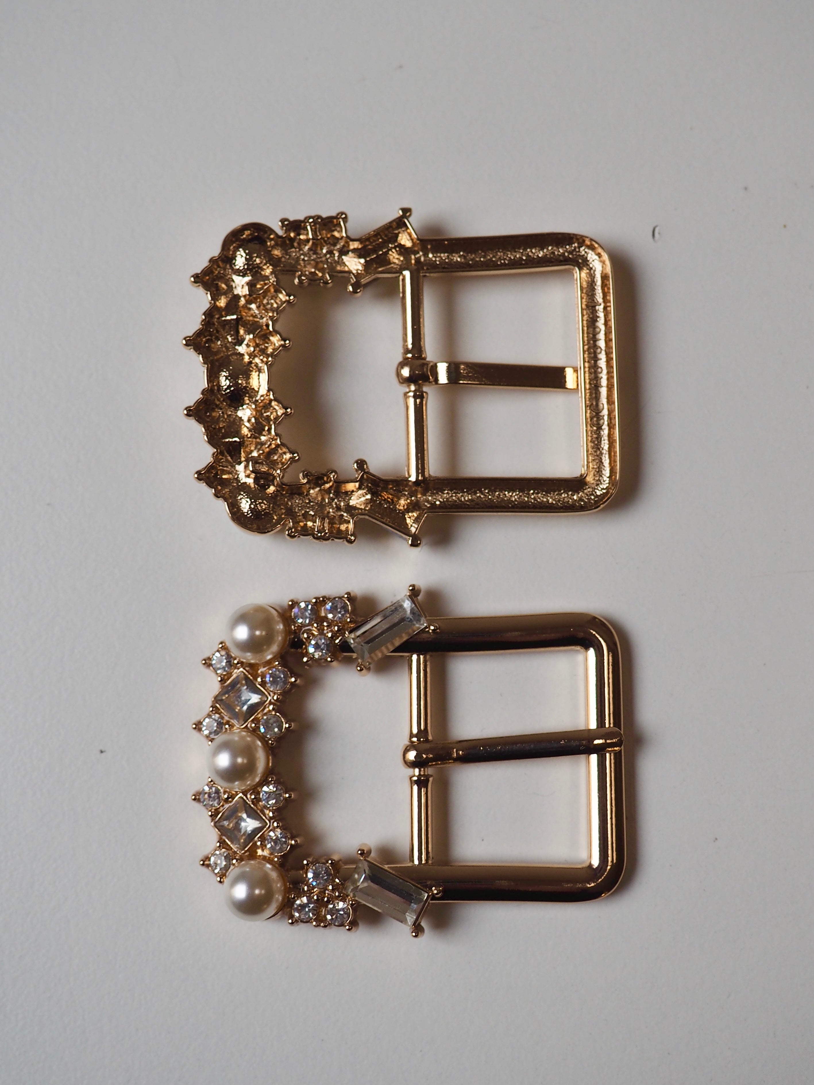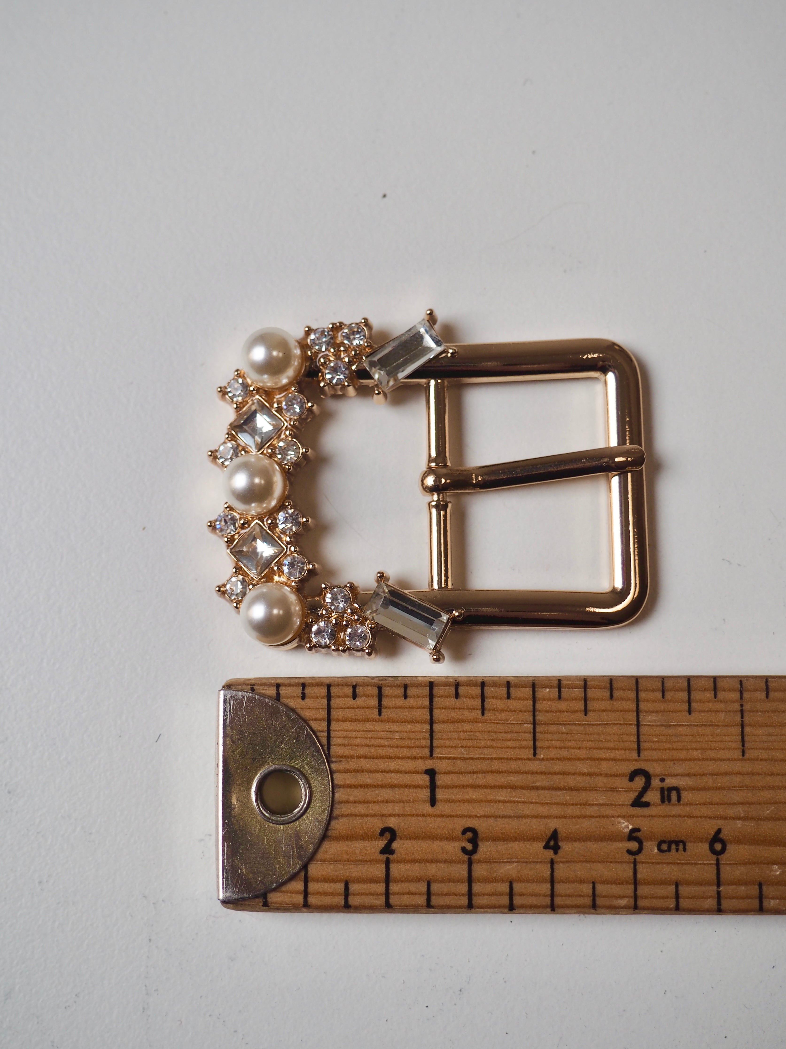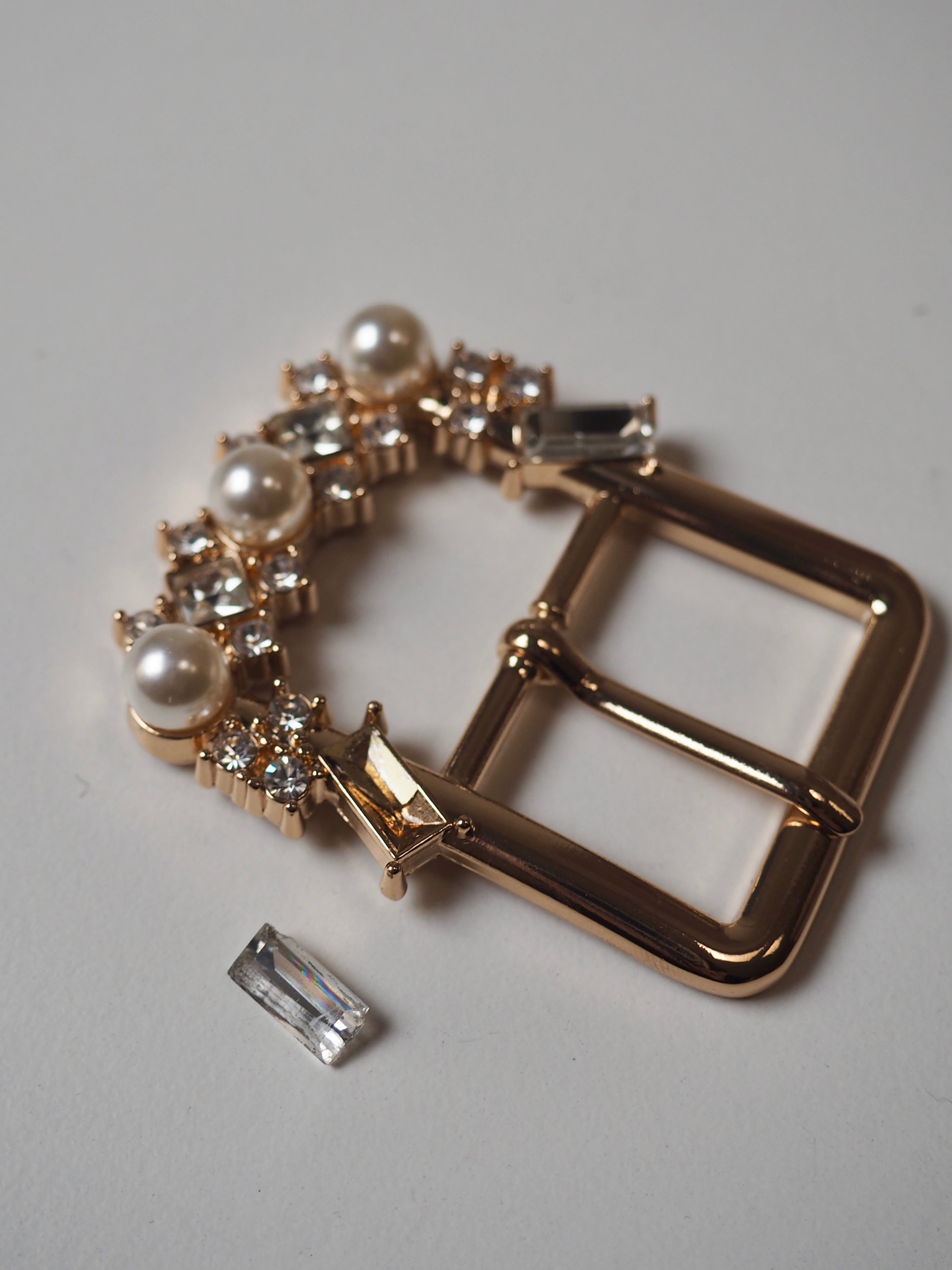 This ex-designer hardware is a buckle. These rose gold buckles are perfect for adding to garments or accessories. They are medium weight and have a shiny finish. DAMAGED the pearl and crystal details have come loose on some of the buckles, but we have the pieces they just need to be glued back into their bezels.